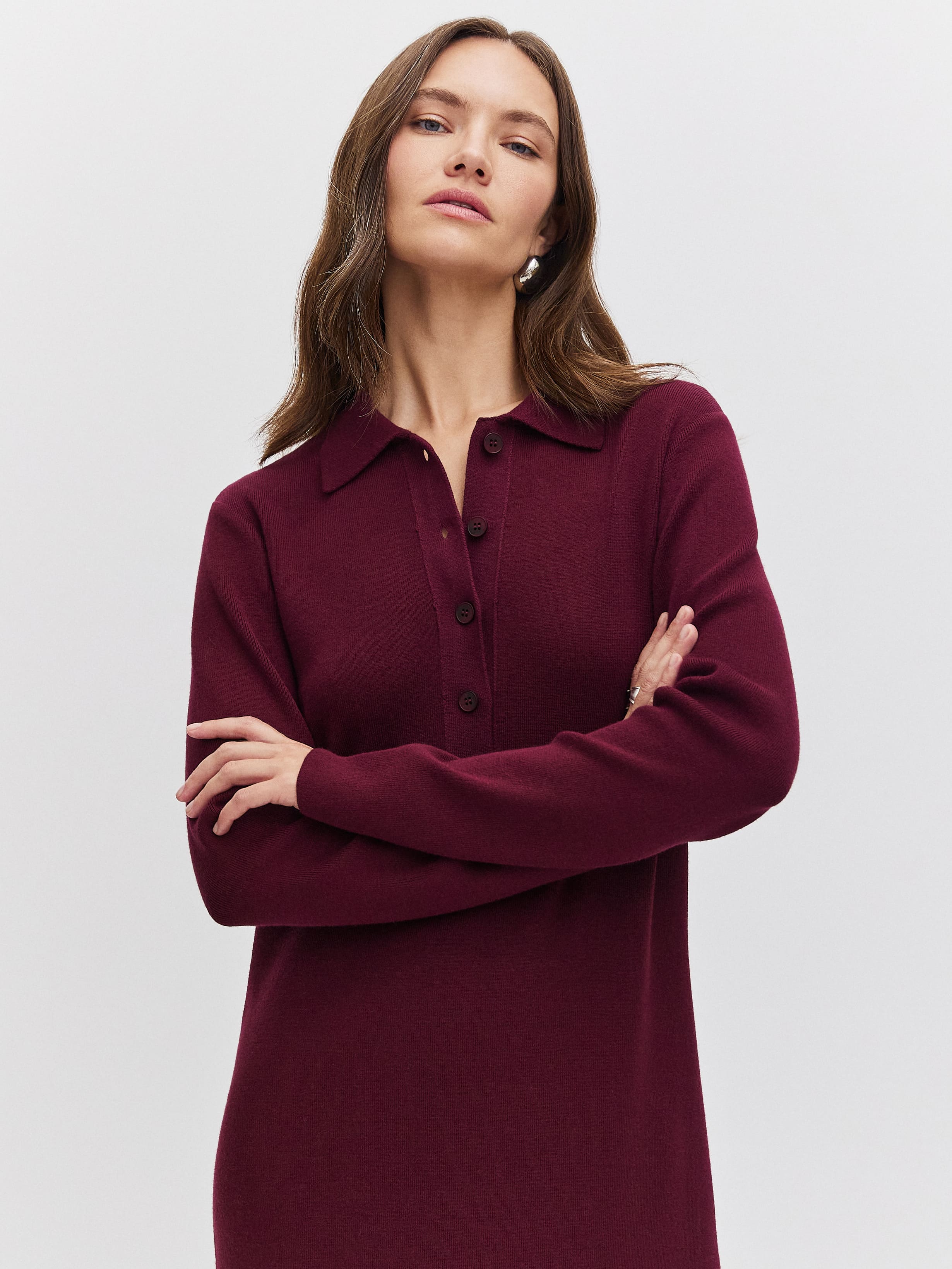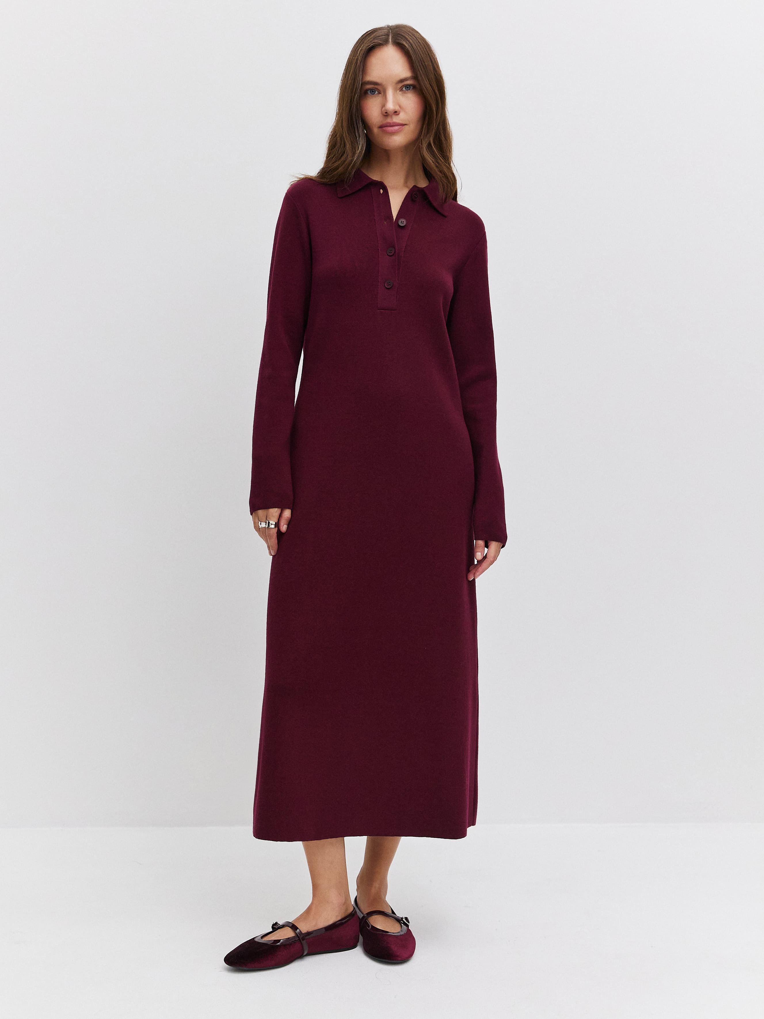 Лаконичное платье из хлопкового трикотажа, для усиления прочности и эстетики сбалансированного вискозой. Сочетает в себе сразу два модных тренда сезона – макси-длину и строгий воротничок поло. Модель базового кроя, с длинным рукавом и способностью корректировать силуэт в сторону стройности. Трикотаж оптимальной плотности – тяжелый, слегка пружинящий, отлично удерживающий форму. Более женственный образ легко достигается ремнем на талии, обувью на каблуке и крупными украшениями.