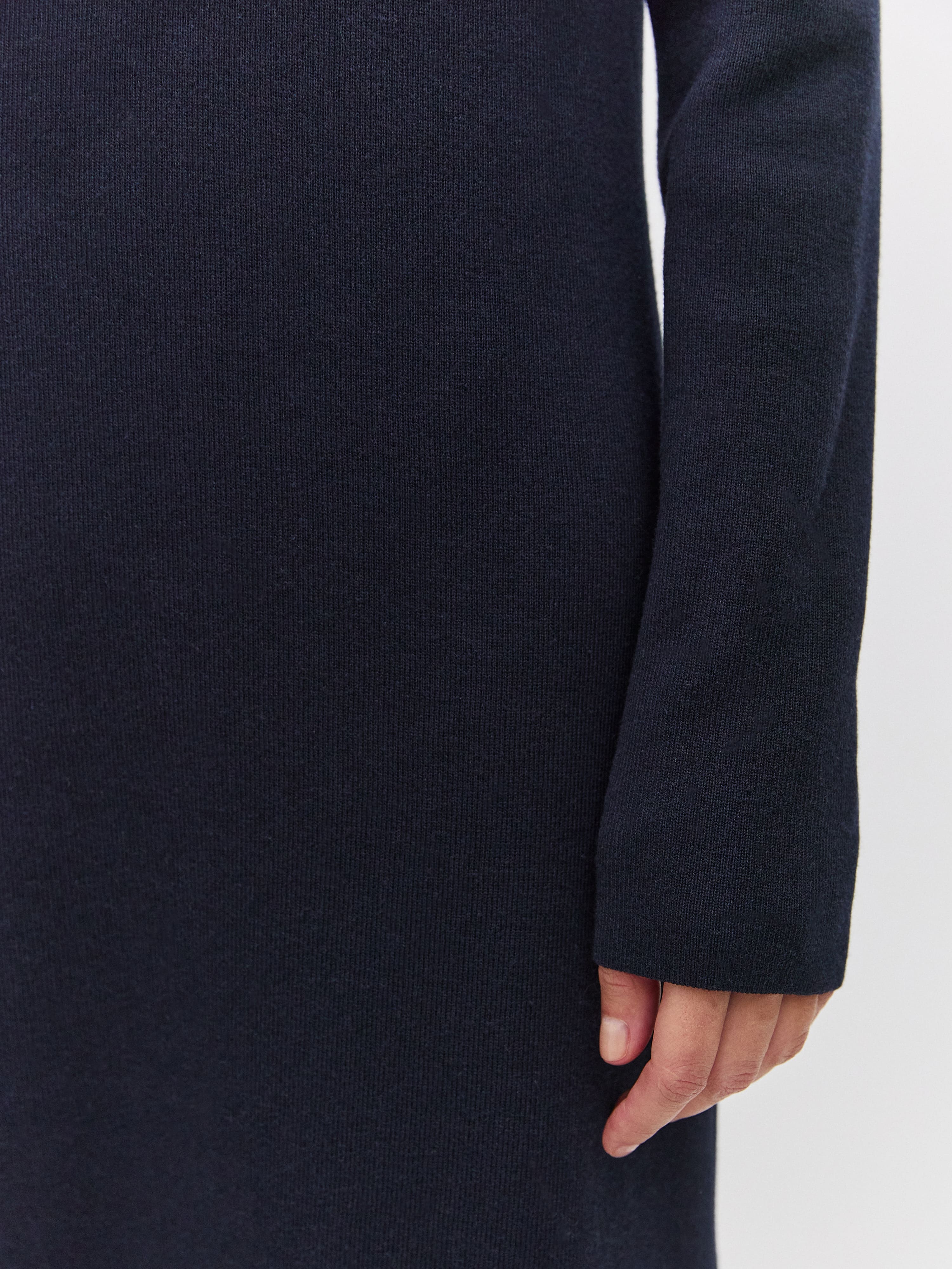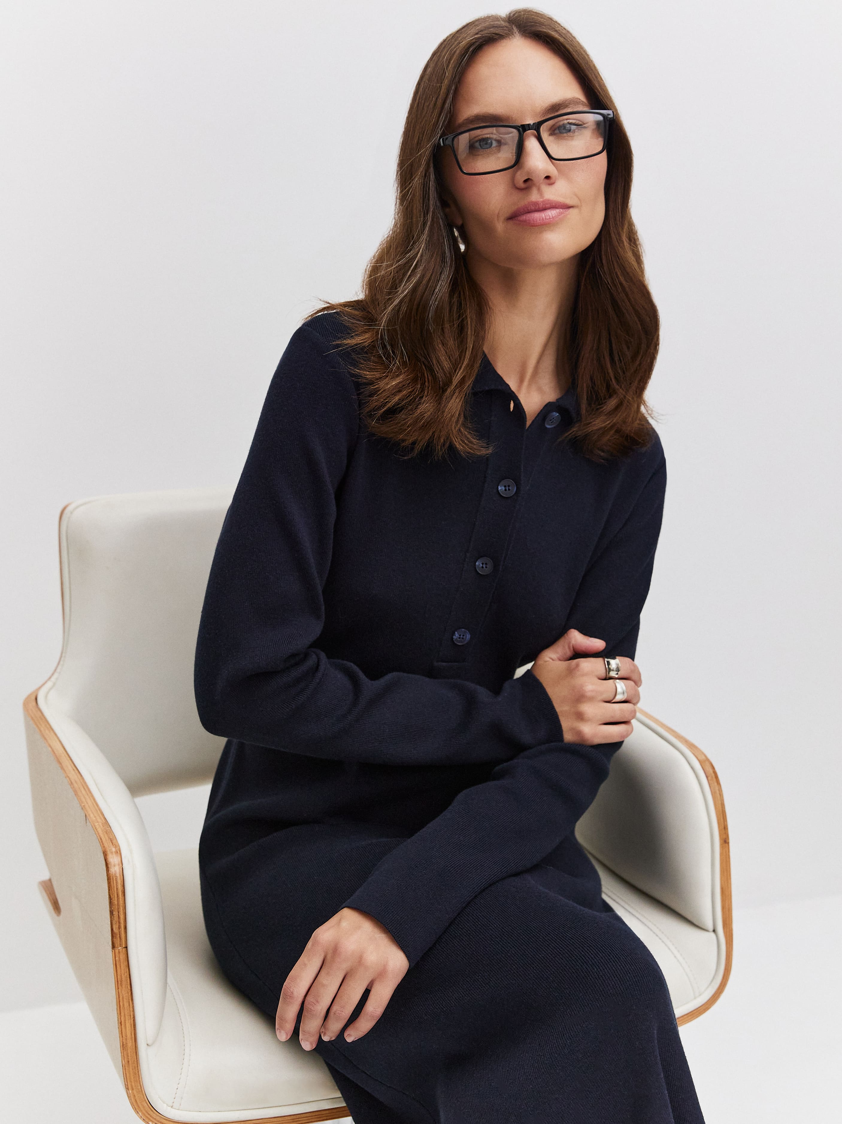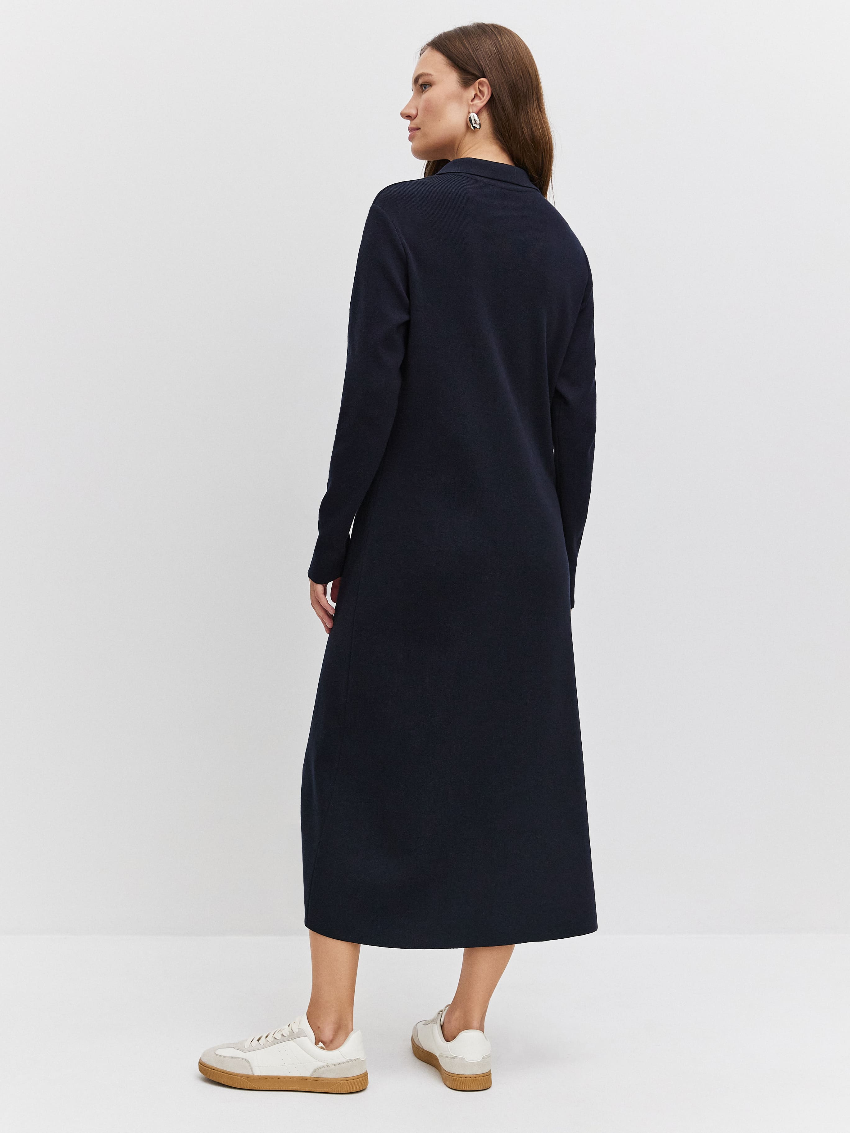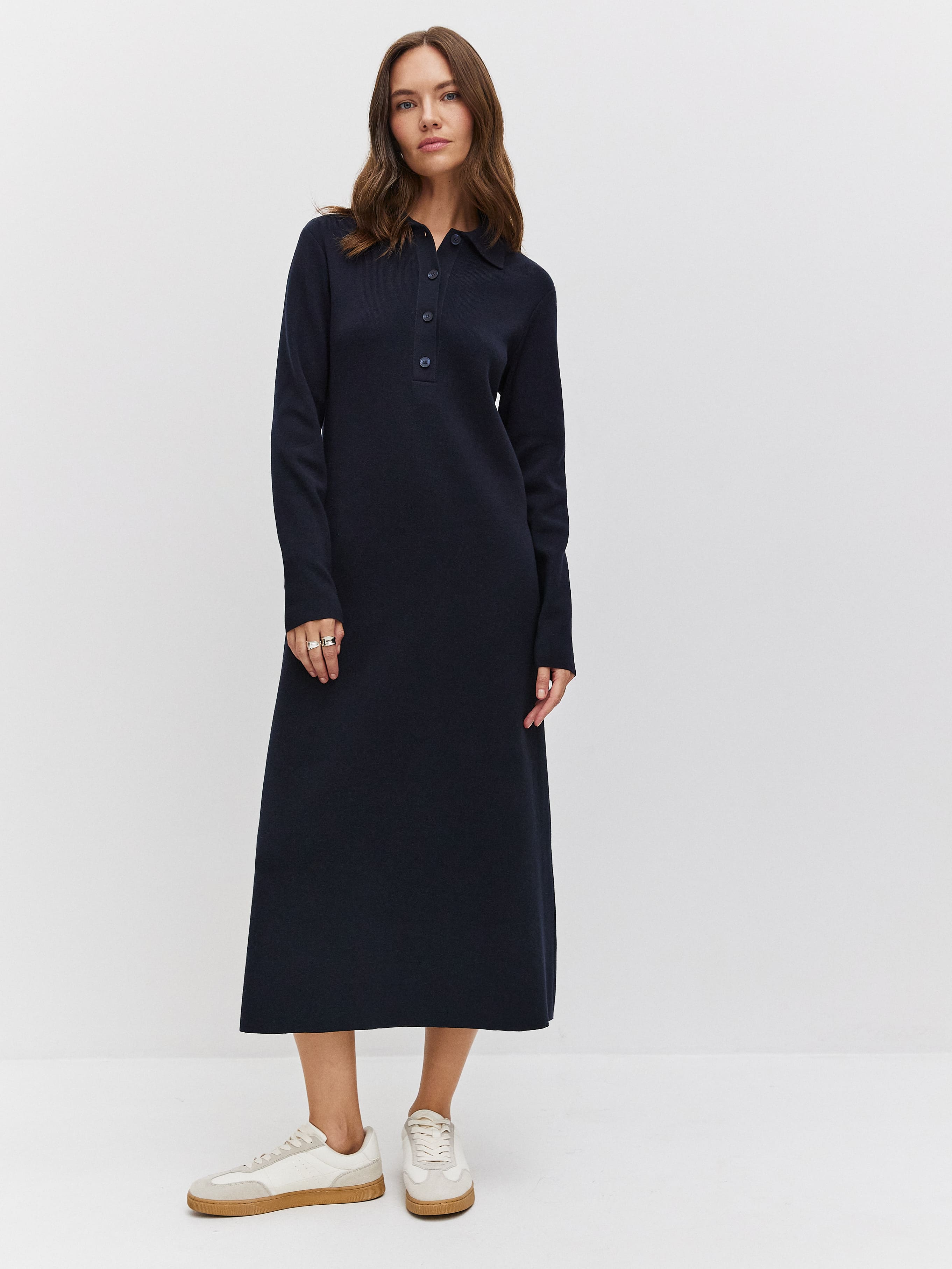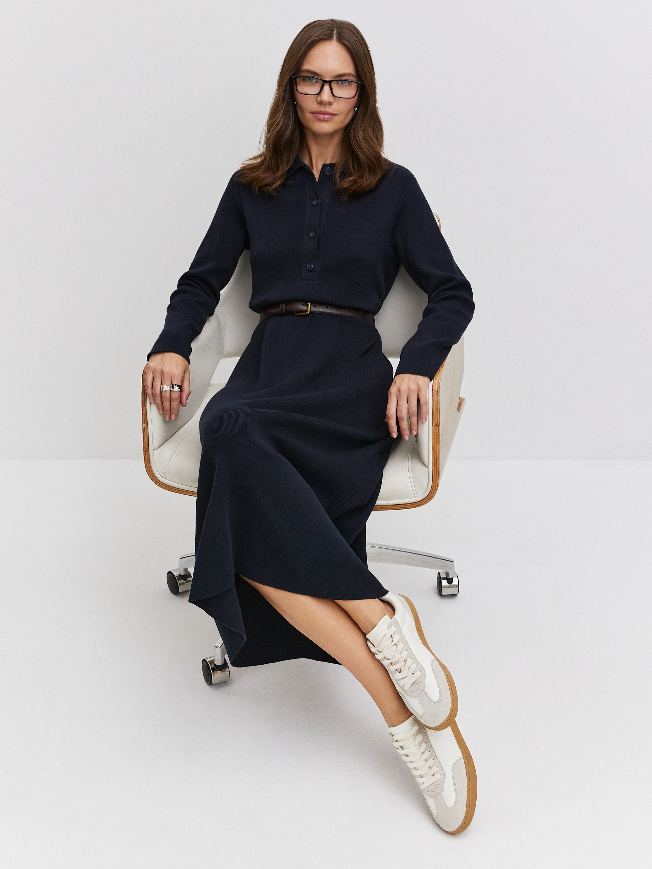 Лаконичное платье из хлопкового трикотажа, для усиления прочности и эстетики сбалансированного вискозой. Сочетает в себе сразу два модных тренда сезона – макси-длину и строгий воротничок поло. Модель базового кроя, с длинным рукавом и способностью корректировать силуэт в сторону стройности. Трикотаж оптимальной плотности – тяжелый, слегка пружинящий, отлично удерживающий форму. Более женственный образ легко достигается ремнем на талии, обувью на каблуке и крупными украшениями.