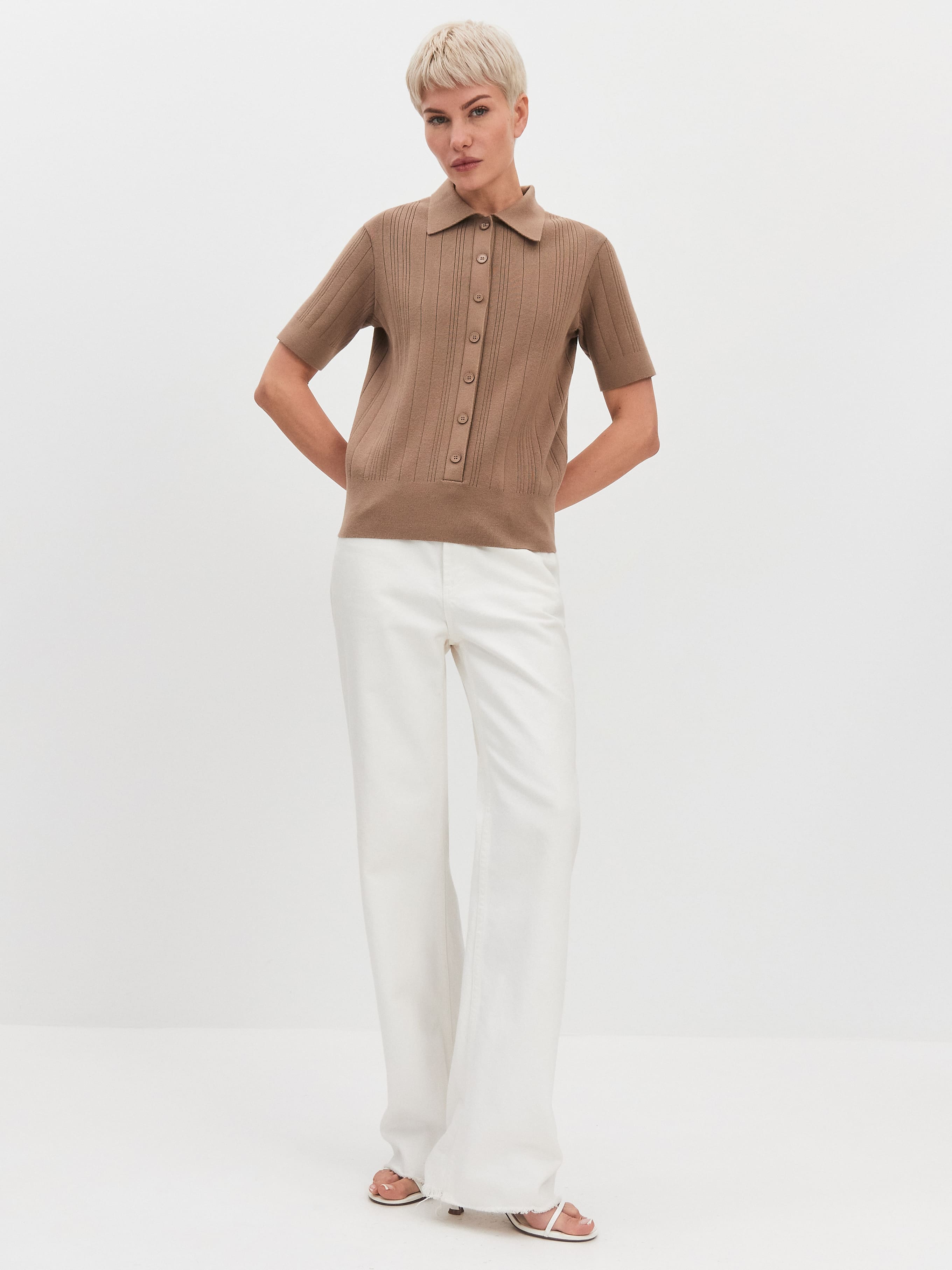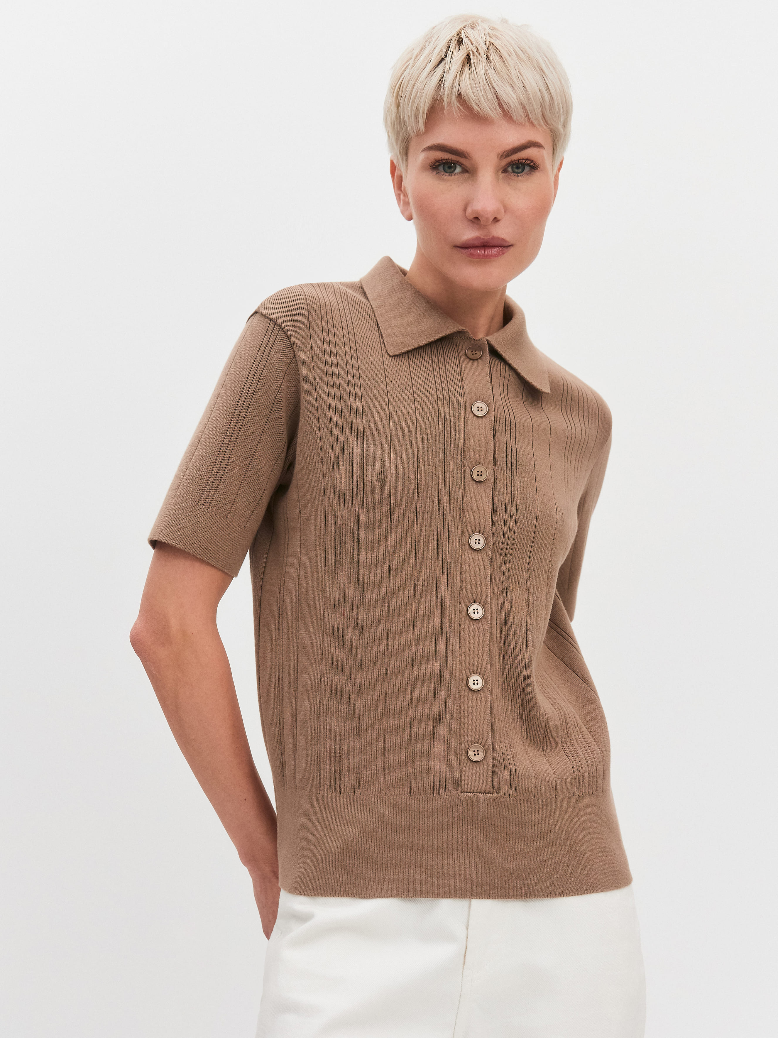 Авторская вариация летнего джемпера с укороченным рукавом – для тех, кому классический фасон поло кажется скучноватым. В этой модели мы удлинили планку с пуговицами, добавили в отделку низа экстремально широкую резинку, а в трикотажное полотно – вертикальные строчки. Хлопок в составе поло разбавлен плотной вискозой и поэтому обладает более гладкой текстурой. Джемпер радует легкостью прикосновений, дышит вместе с телом, отводит избыточное тепло в жару. Трикотаж содержит небольшой процент полиамида. Он позволяет изделию подстраиваться под особенности вашей фигуры и лучше переносить стирки.