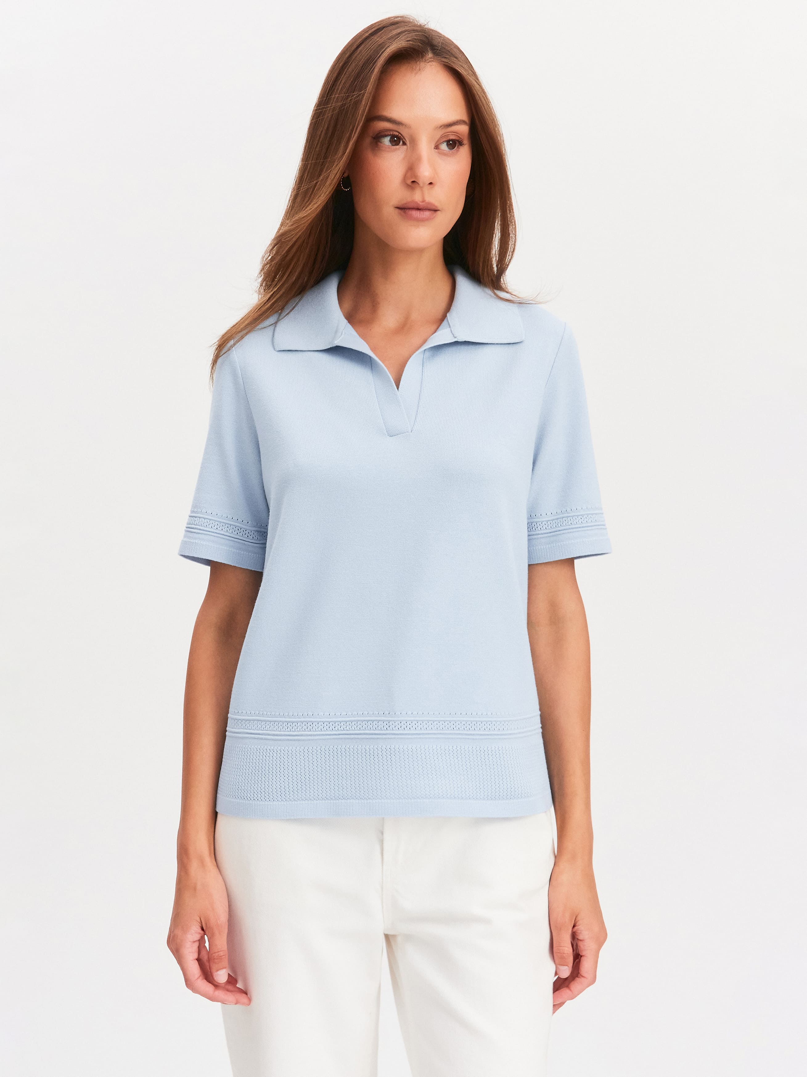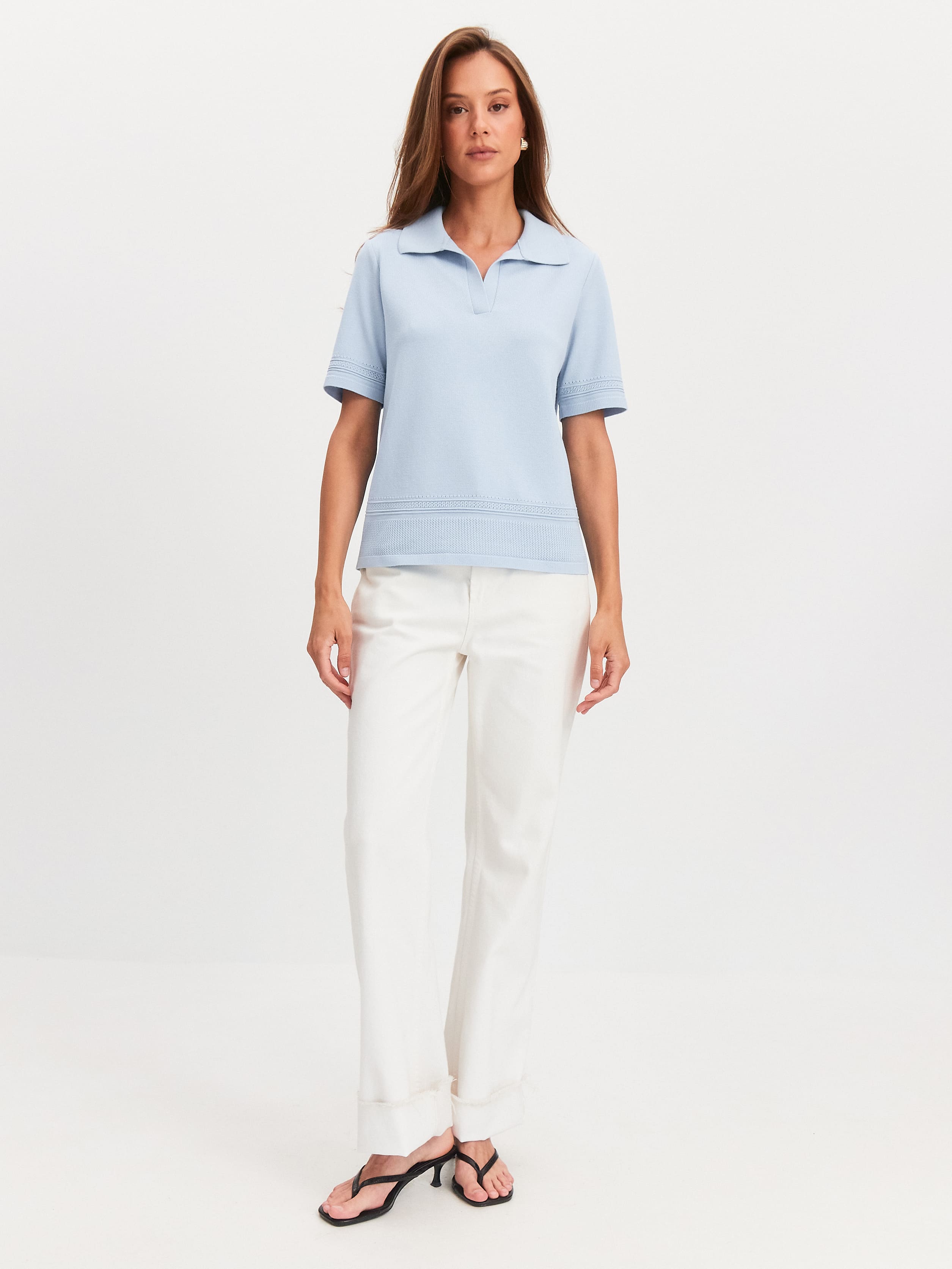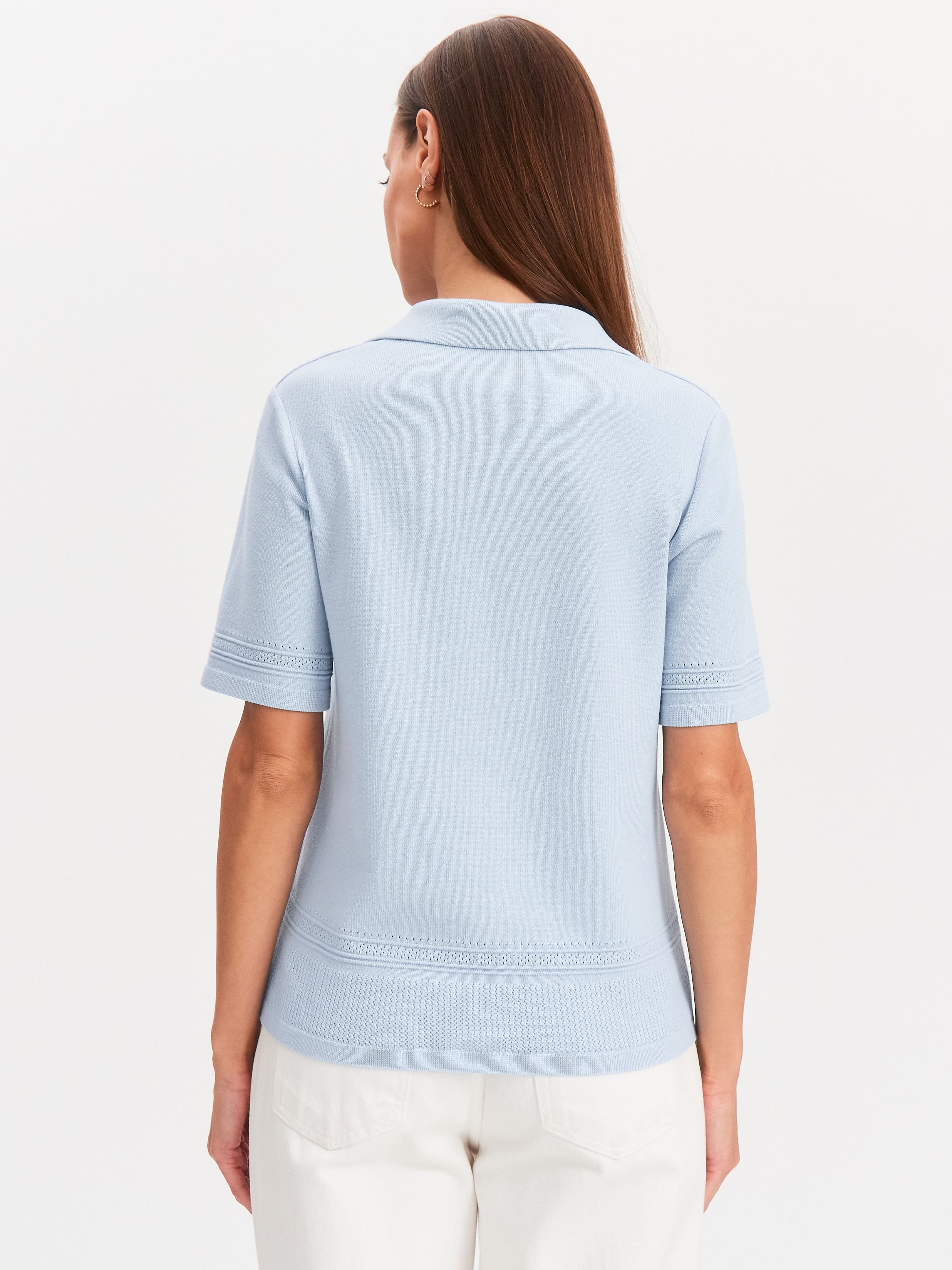 Авторская модель джемпера с воротником поло и сложным ажурным декором. Лицевая сторона изделия с шелковистым финишем, дающим на солнце легкий глянцевый блеск. Базовый крой создает комфортную посадку с полуприлеганием. Поло пластичное, вывязанное из тонкой хлопковой пряжи, с эффектом деликатных прикосновений. Нежная отделка краев напоминает вязаное кружево, добавляющее в образ ненавязчивые романтические штрихи.