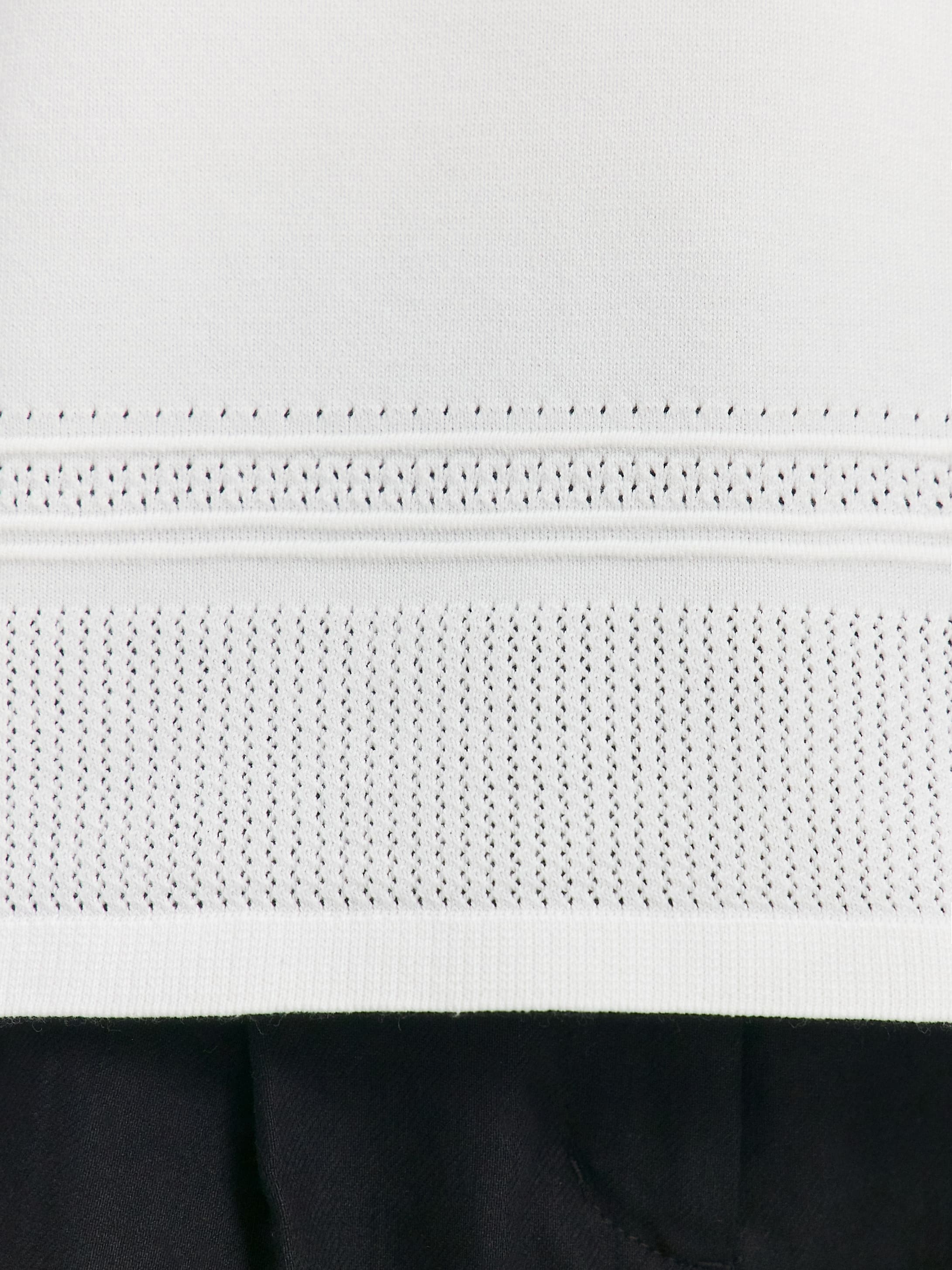 Авторская модель джемпера с воротником поло и сложным ажурным декором. Лицевая сторона изделия с шелковистым финишем, дающим на солнце легкий глянцевый блеск. Базовый крой создает комфортную посадку с полуприлеганием. Поло пластичное, вывязанное из тонкой хлопковой пряжи, с эффектом деликатных прикосновений. Нежная отделка краев напоминает вязаное кружево, добавляющее в образ ненавязчивые романтические штрихи.