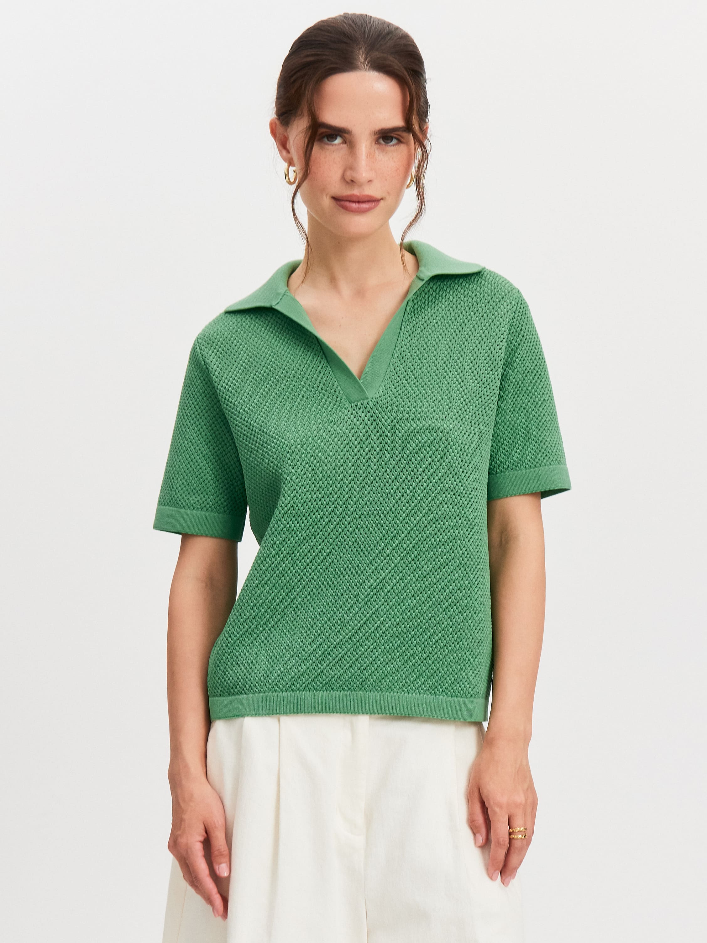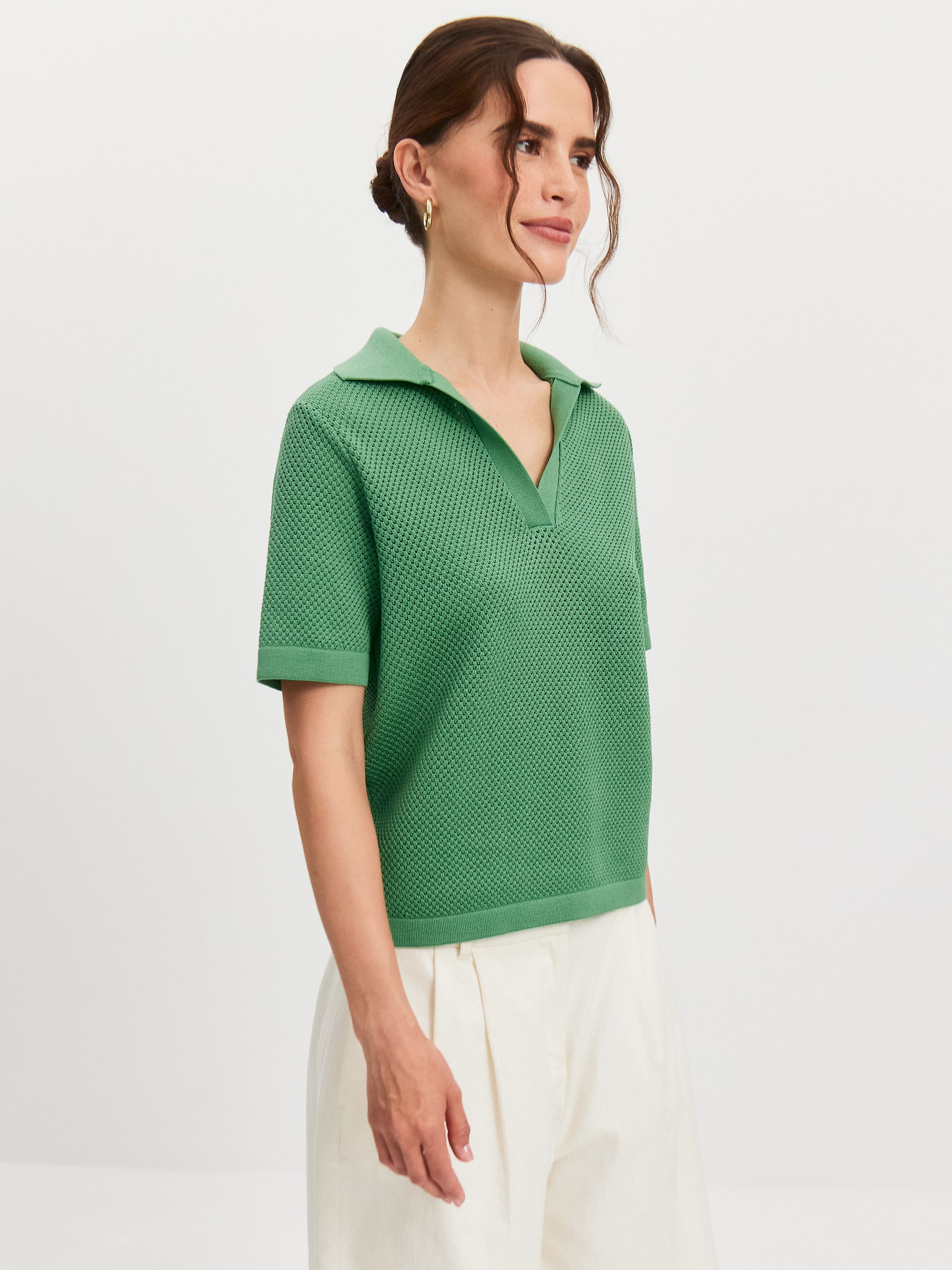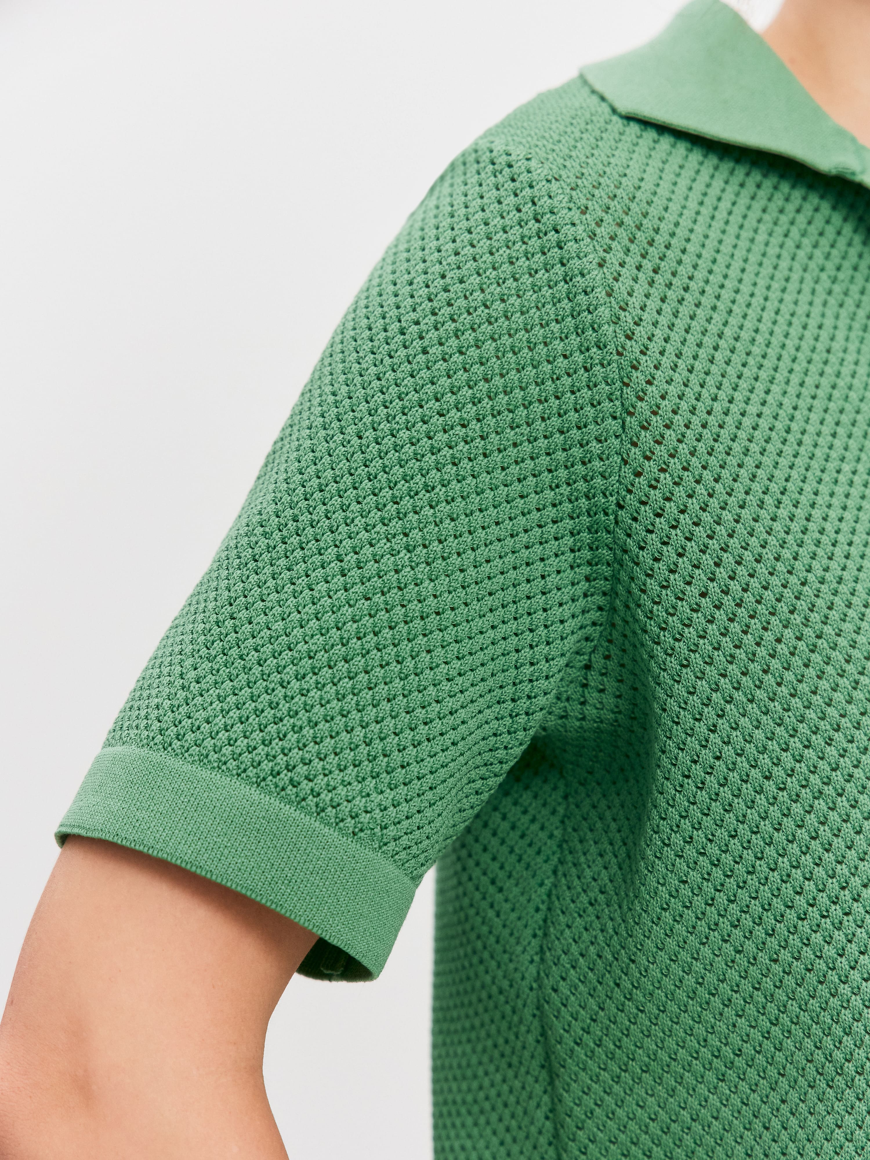Ажурная футболка с воротничком поло без пуговиц. Облегченная летняя модель, созданная угадывать желания тела в жару. Основная часть изделия – шелковистое полотно с текстурой суфле, состоящее из вязаных микроячеек. Такое плетение делает поло невесомо-воздушным и максимально неощутимым на себе. Прямой крой подчеркивает естественный контур силуэта. Плотный воротник красиво распахивается вдоль шеи и акцентирует внимание на ключичной зоне. Низ и рукава укреплены полосками из плотно переплетенного трикотажа