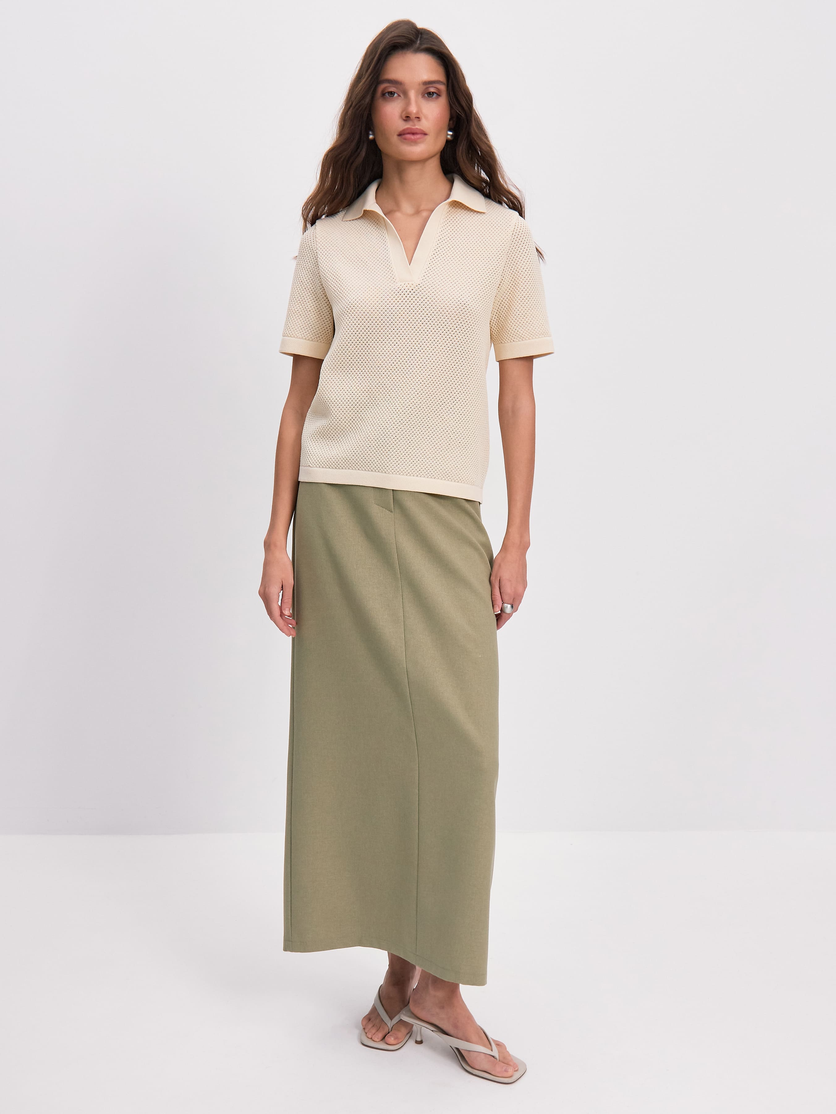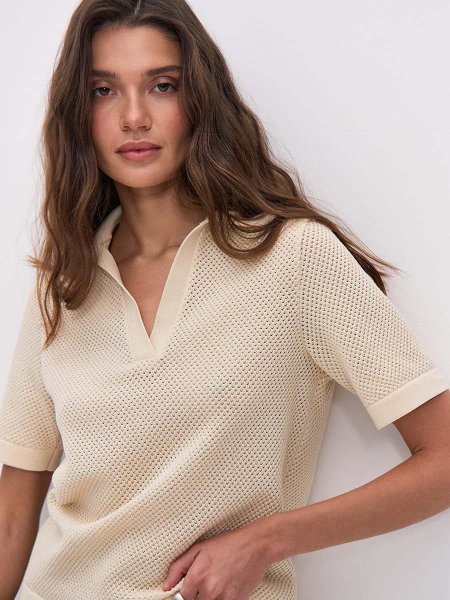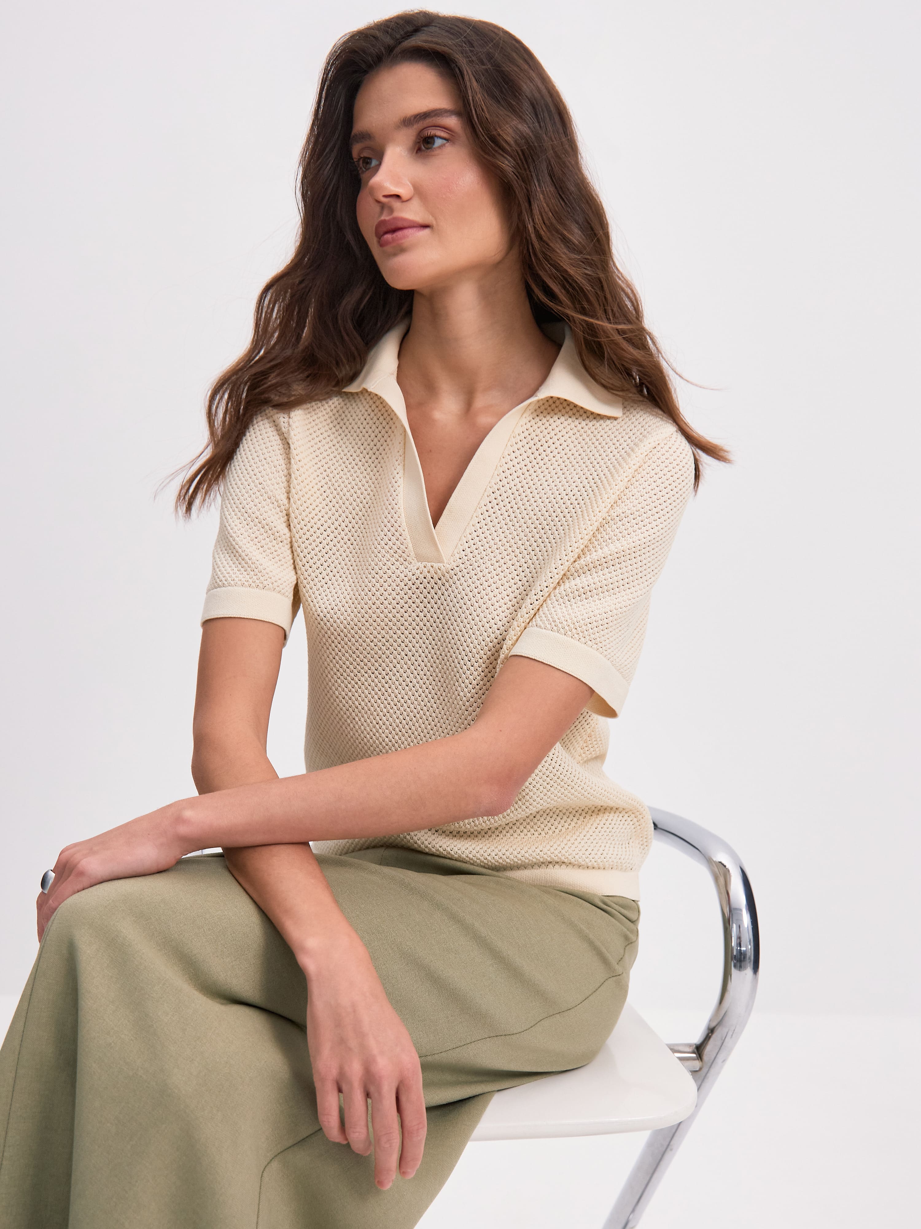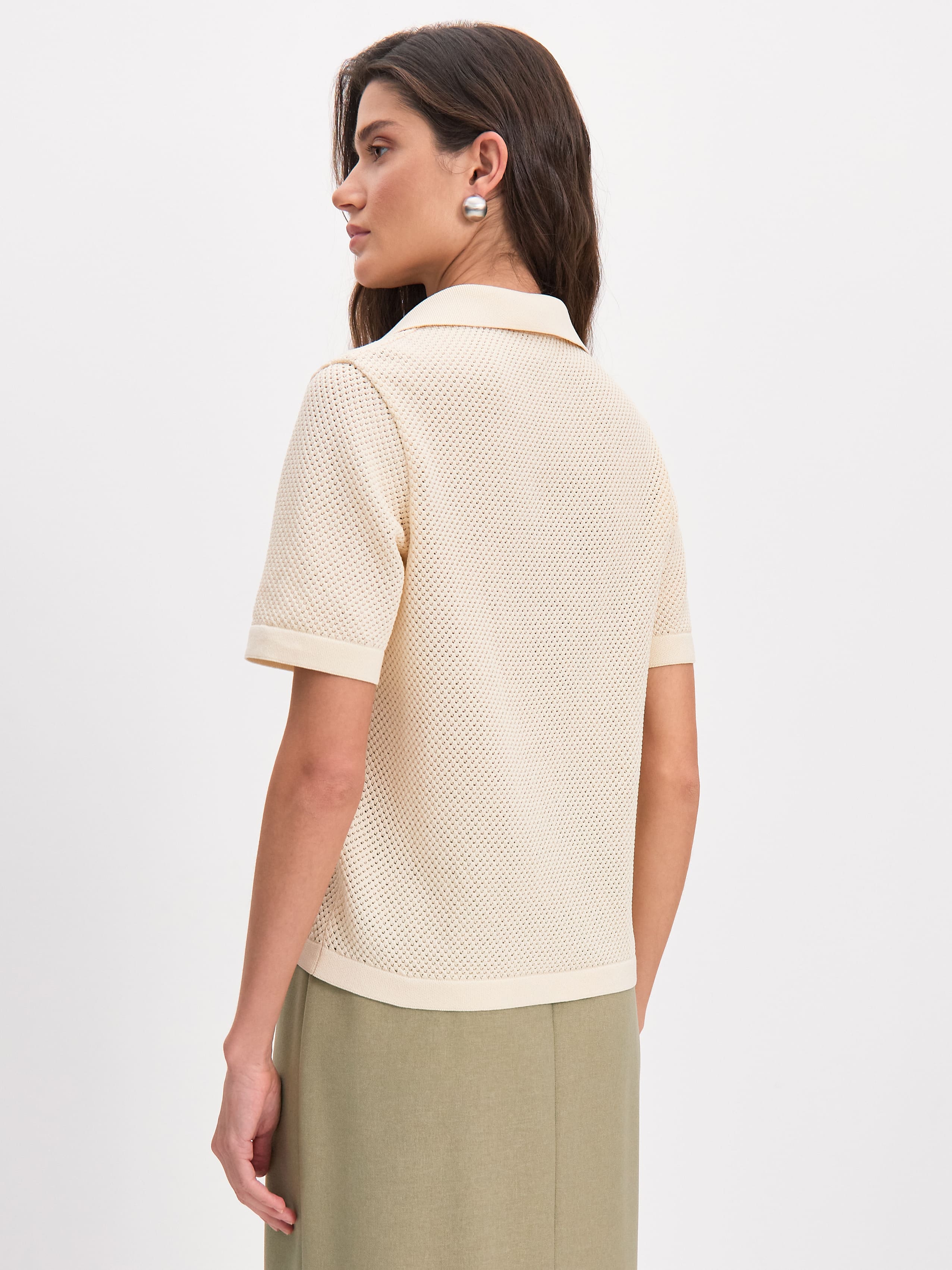 Ажурная футболка с воротничком поло без пуговиц. Облегченная летняя модель, созданная угадывать желания тела в жару. Основная часть изделия – шелковистое полотно с текстурой суфле, состоящее из вязаных микроячеек. Такое плетение делает поло невесомо-воздушным и максимально неощутимым на себе. Прямой крой подчеркивает естественный контур силуэта. Плотный воротник красиво распахивается вдоль шеи и акцентирует внимание на ключичной зоне. Низ и рукава укреплены полосками из плотно переплетенного трикотажа