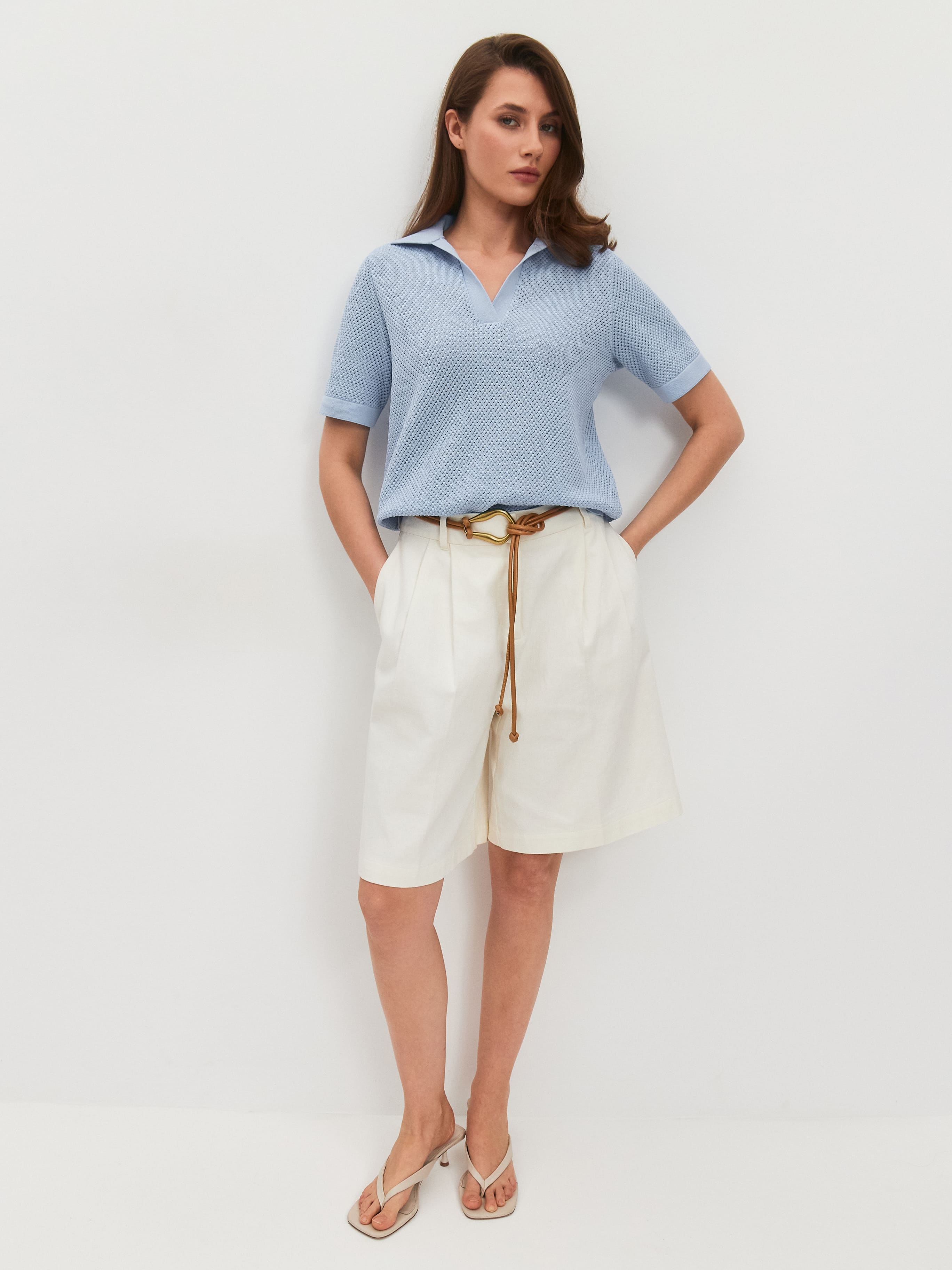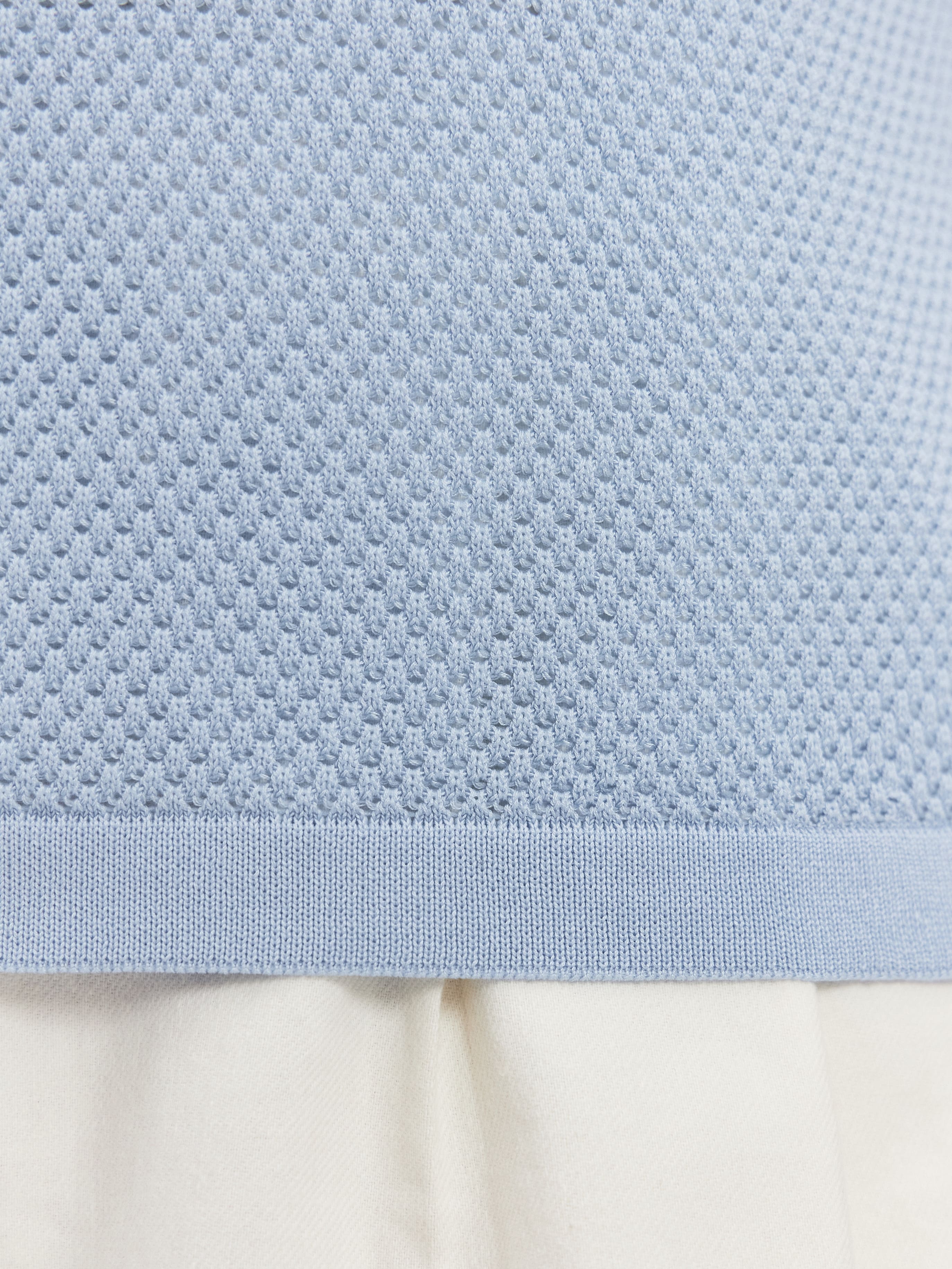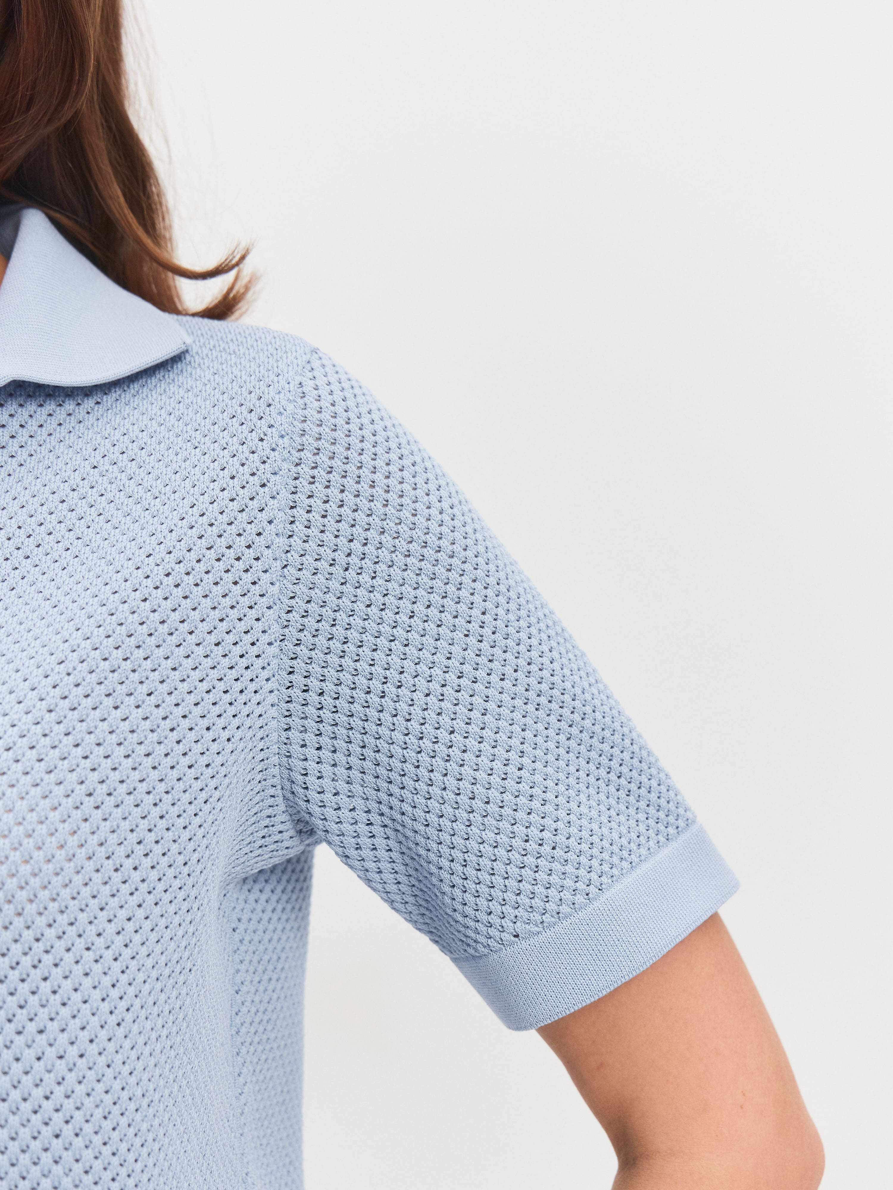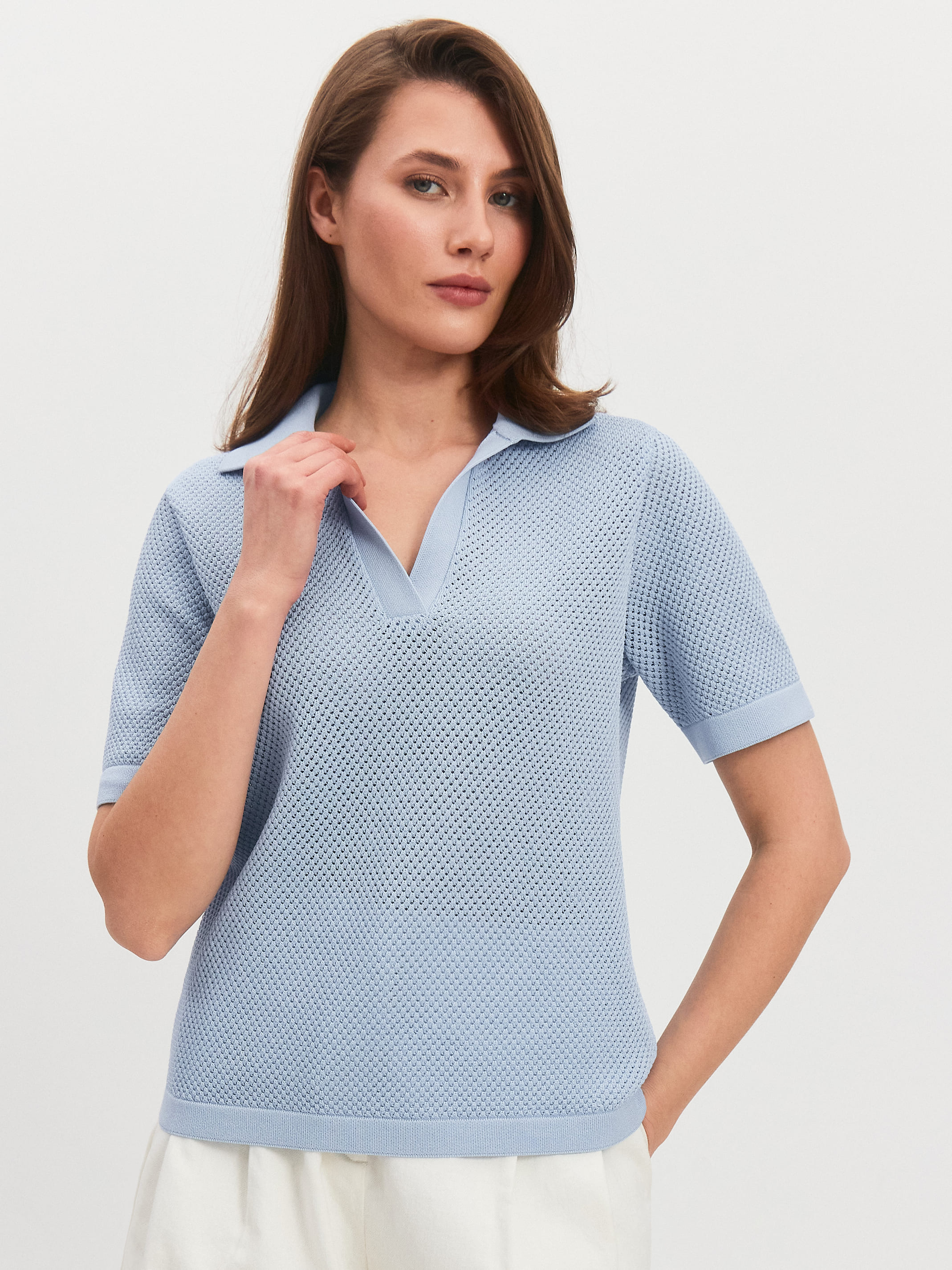 Ажурная футболка с воротничком поло без пуговиц. Облегченная летняя модель, созданная угадывать желания тела в жару. Основная часть изделия – шелковистое полотно с текстурой суфле, состоящее из вязаных микроячеек. Такое плетение делает поло невесомо-воздушным и максимально неощутимым на себе. Прямой крой подчеркивает естественный контур силуэта. Плотный воротник красиво распахивается вдоль шеи и акцентирует внимание на ключичной зоне. Низ и рукава укреплены полосками из плотно переплетенного трикотажа