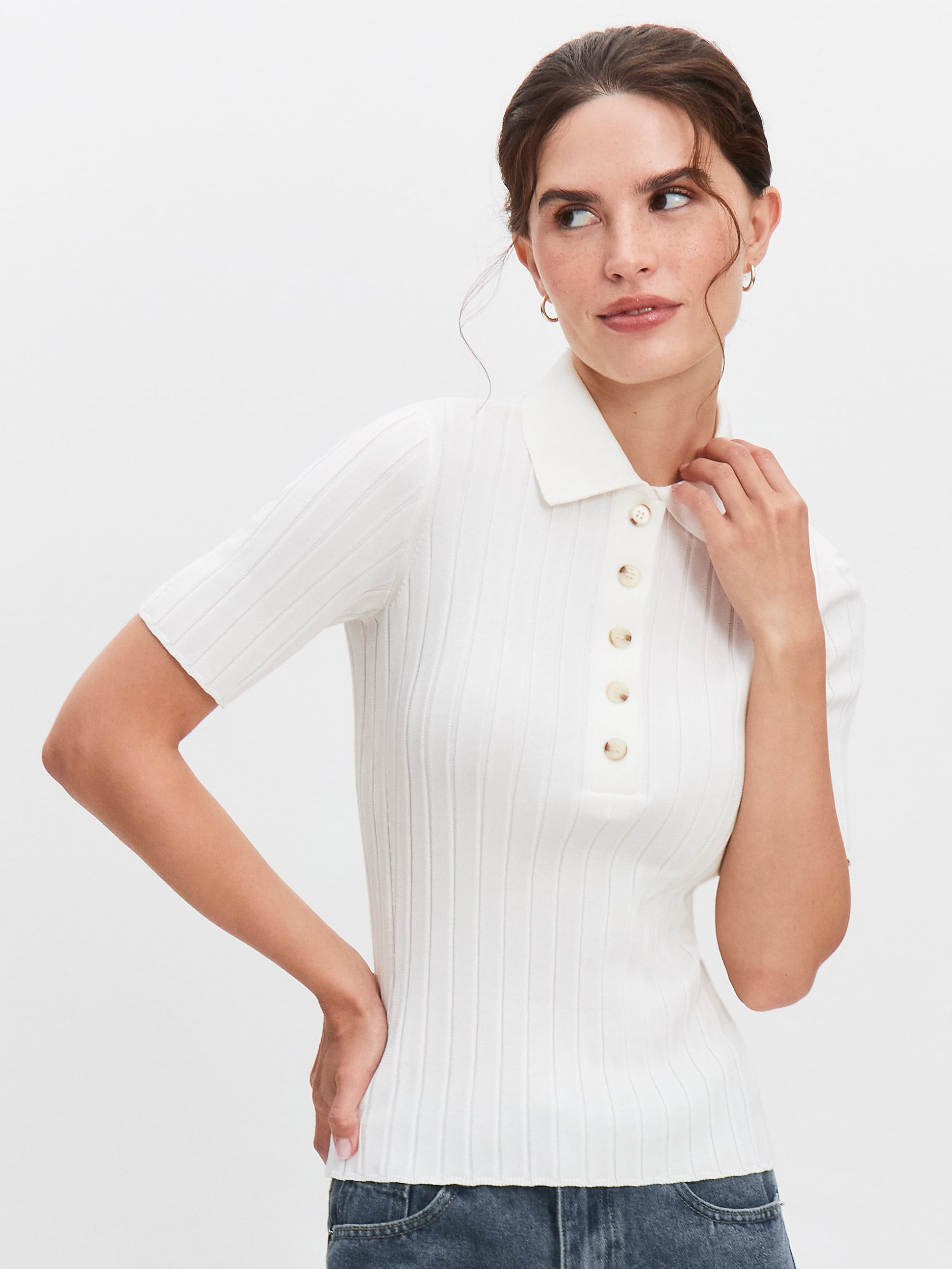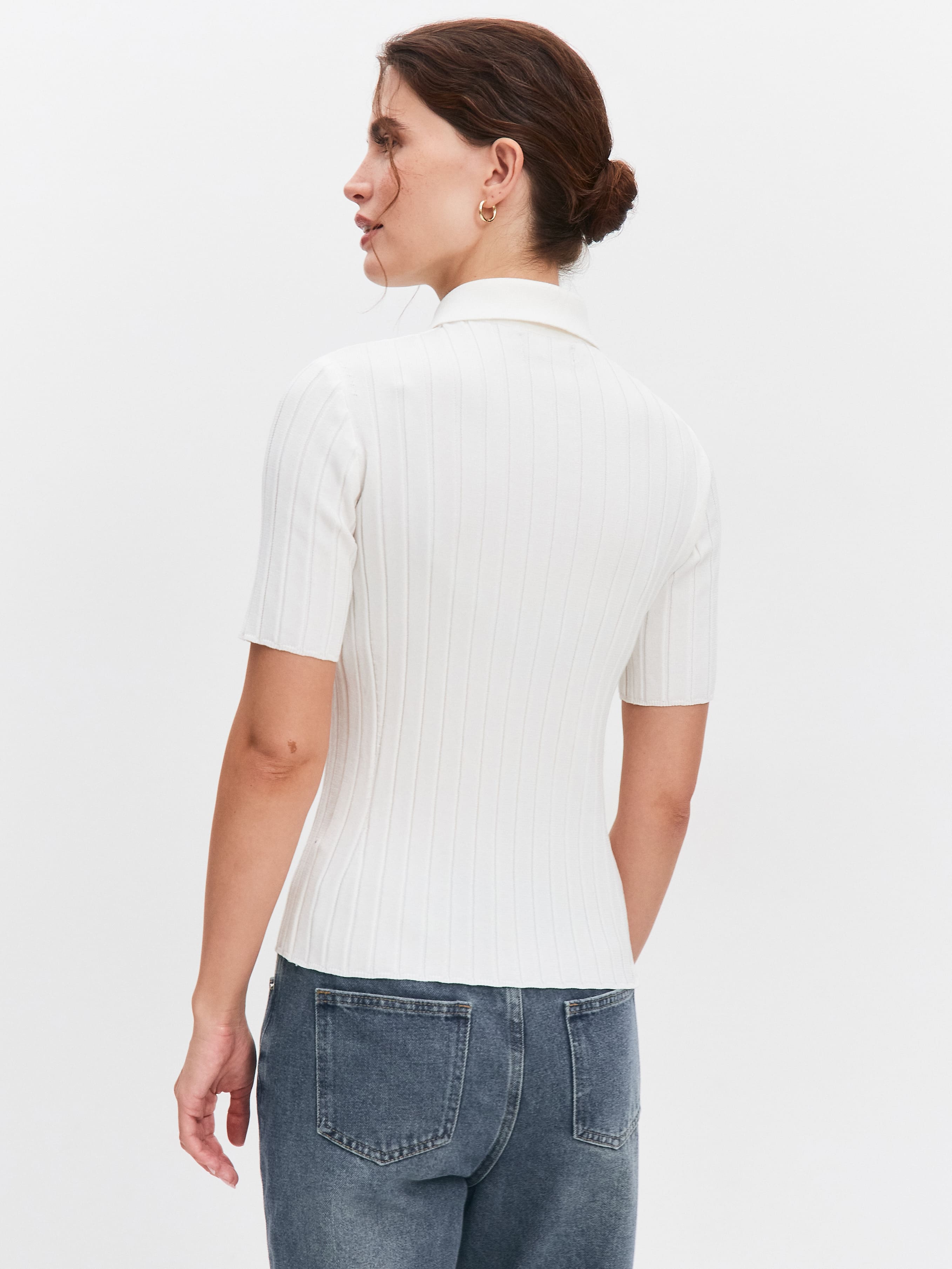 В каталоге нашего интернет-магазина представлена обширная линейка женской одежды собственного бренда. В том числе предлагаем сделать онлайн-заказ на стильные модели из премиального трикотажа с воротником поло: