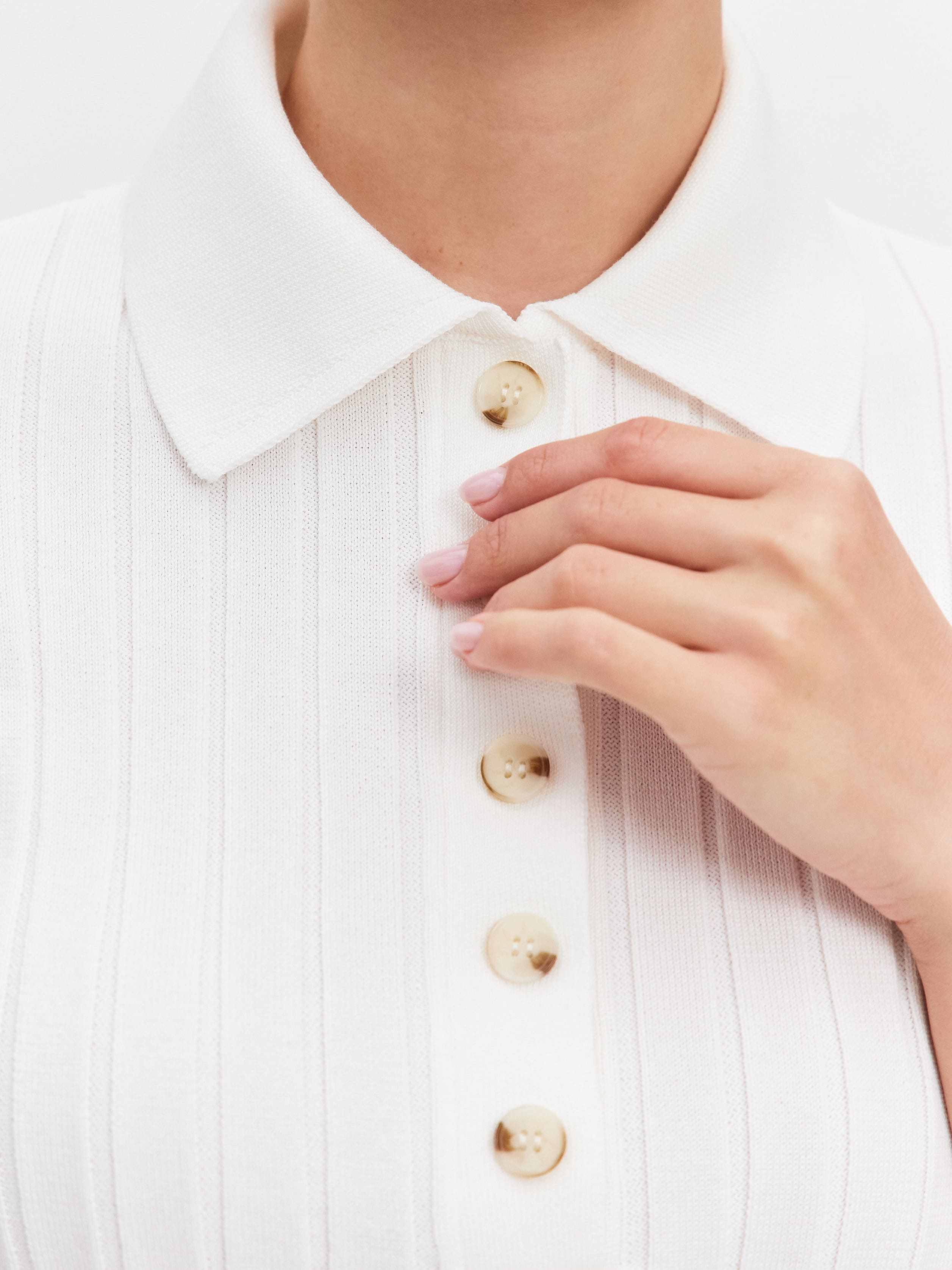 Силуэтное хлопковое поло с втачным рукавом. Добиться совершенного облегания по фигуре позволяет трикотаж лапша. Он сохраняет максимальную эластичность и повторяет контуры тела. 90% хлопка в составе вызывают ощущение тактильного релакса. Поло очень уютное, мягкое, бережно контактирующее даже с чувствительной кожей. Ряд градиентных пуговиц служит легким оттеняющим штрихом. За устойчивость изделия к деформациям отвечают 10% полиамида. Поло не дает усадку, сохраняет первоначальную форму, защищает линии швов от смещения при стирке.