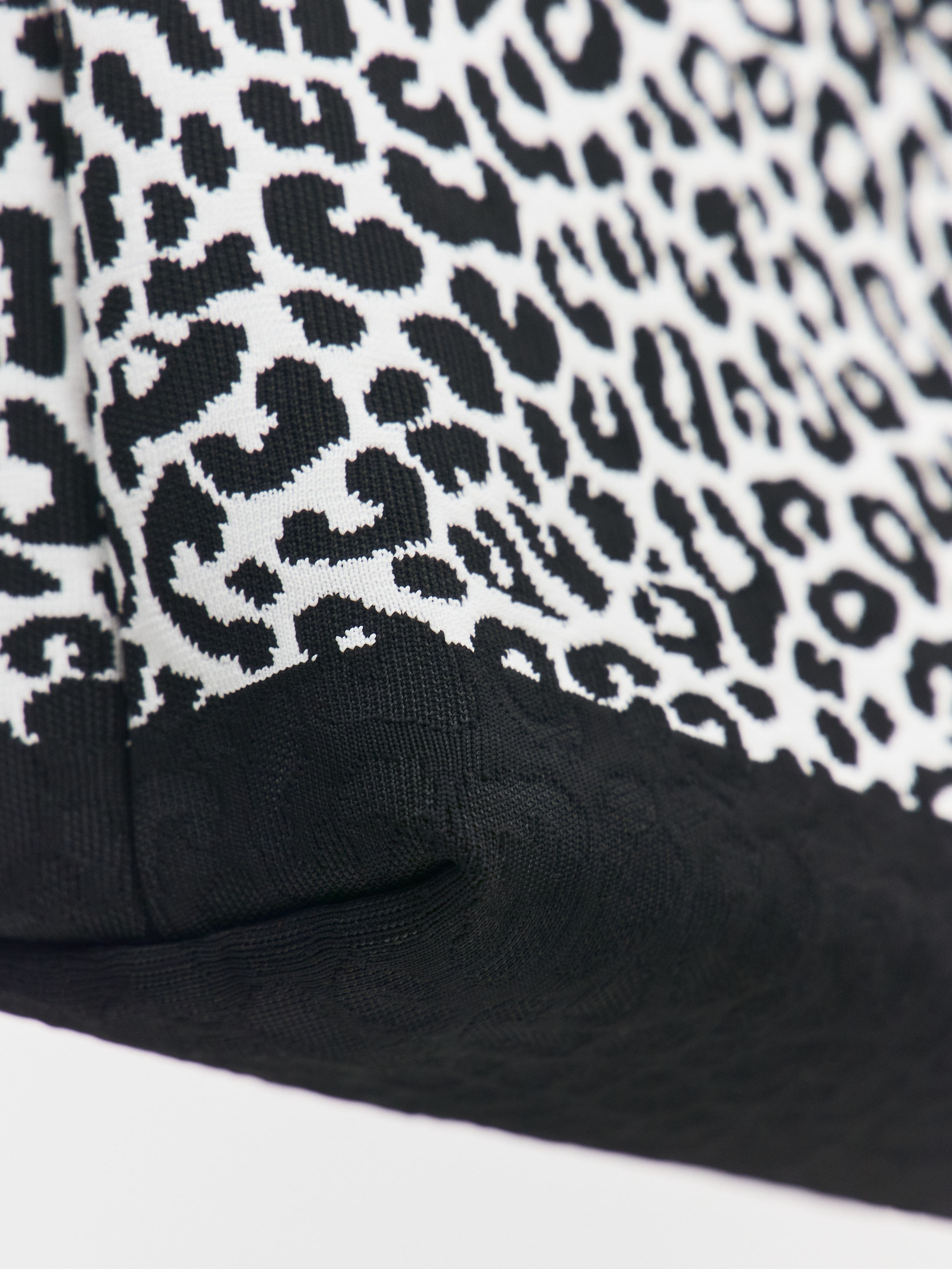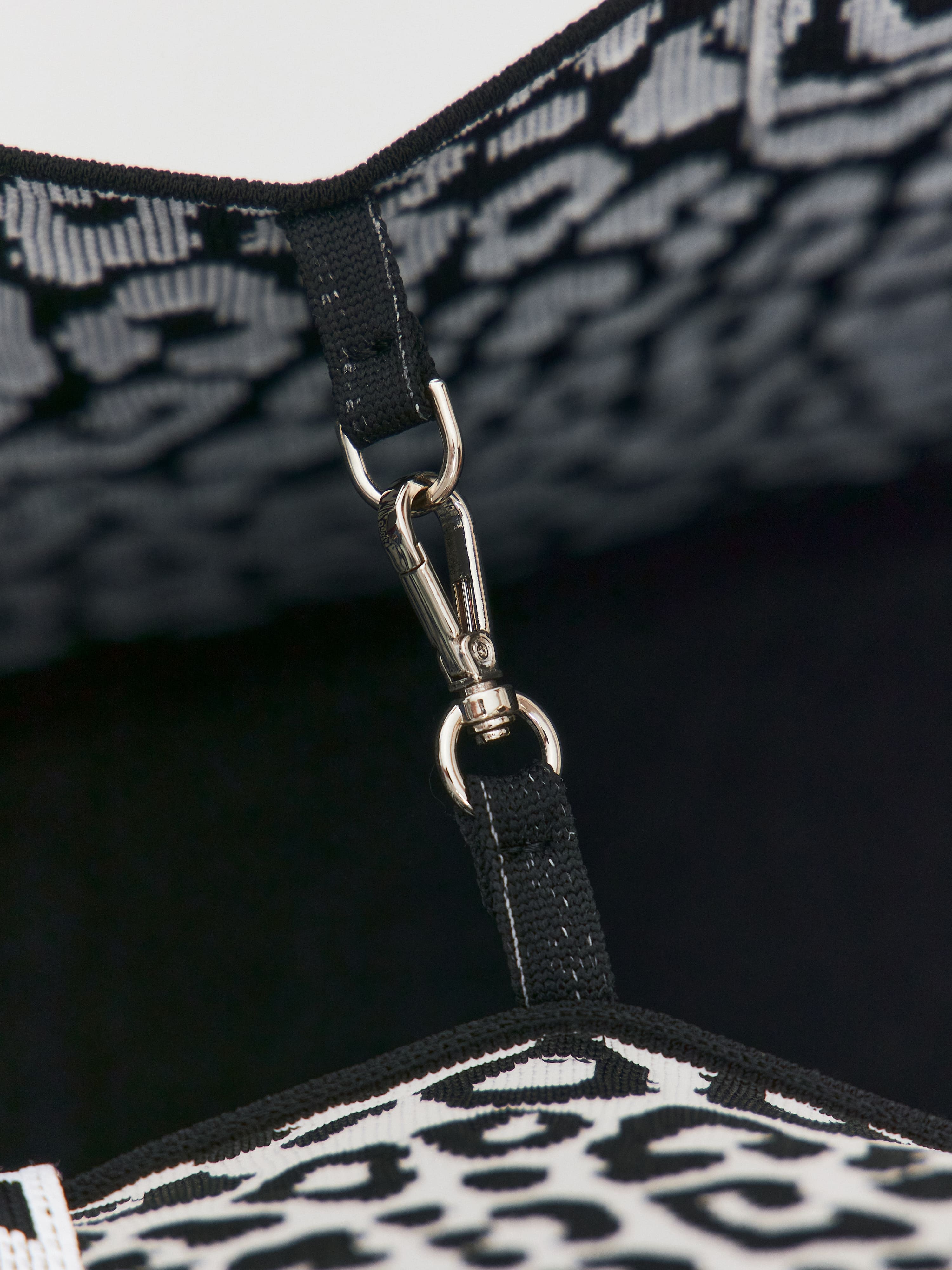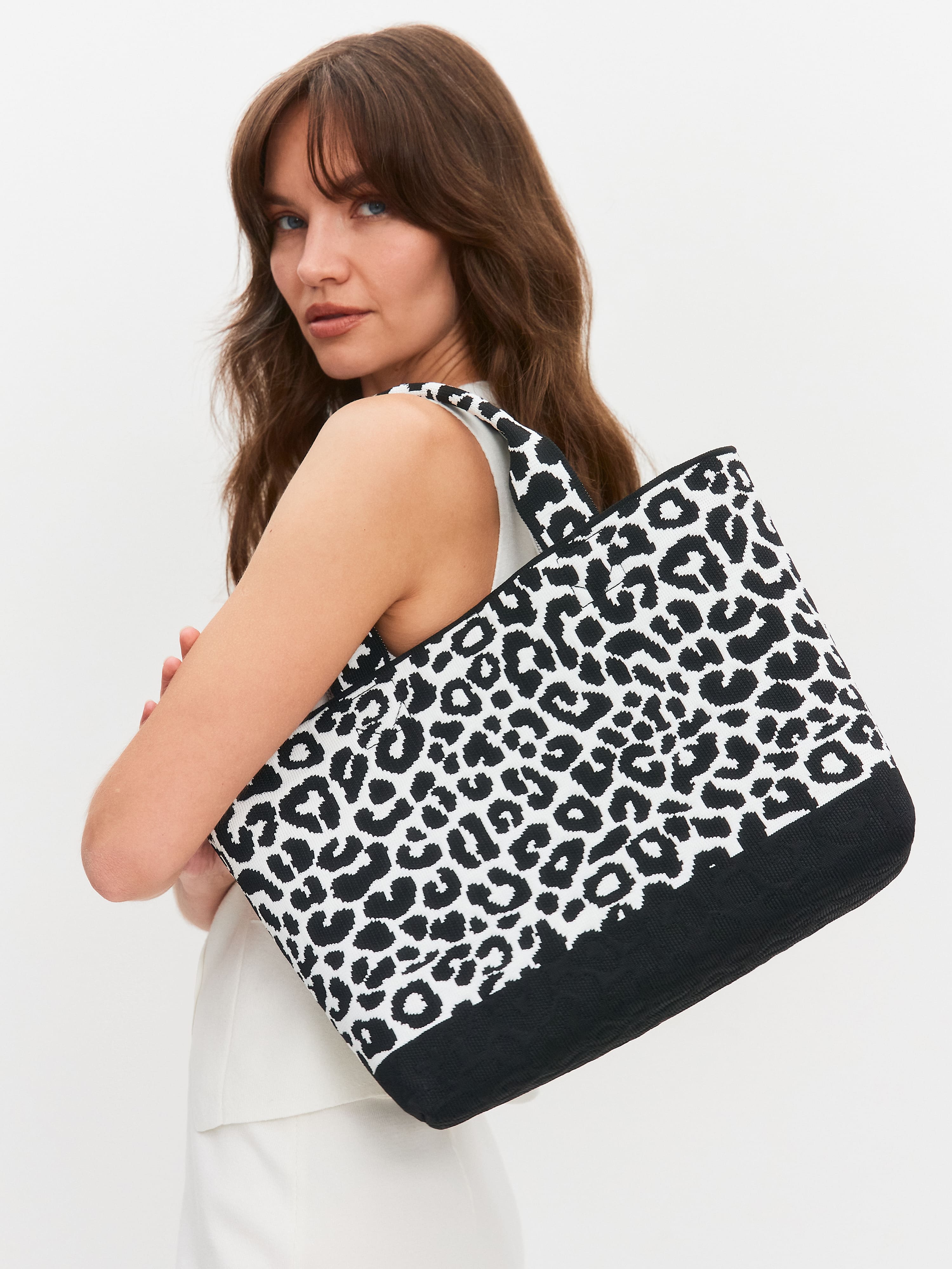 Акцентная сумка тоут, объединившая в себе лаконичный силуэт и анималистичный принт. Корпус изделия – это полиэстеровый трикотаж с высоким показателем плотности. Благодаря ему, тоут превосходно держит форму как при минимальной, так и максимальной заполненности. Внутреннюю застежку карабин можно использовать, чтобы стянуть края аксессуара, а также для пристегивания ключей, косметичек, органайзеров. Оригинальный дизайнерский штрих: фактурный леопардовый рисунок, который переходит на низ и дно сумки в виде потайного узора. Длина ручек предусматривает разные способы ношения тоута: в руках, на сгибе локтя, на плече.