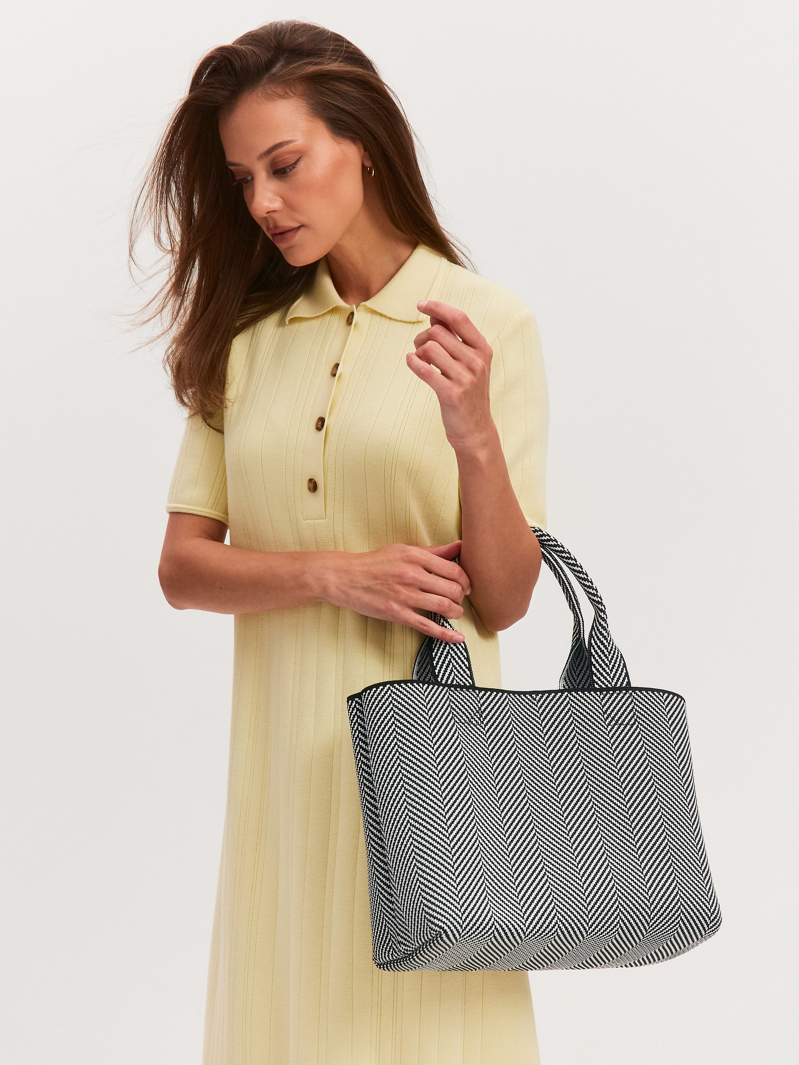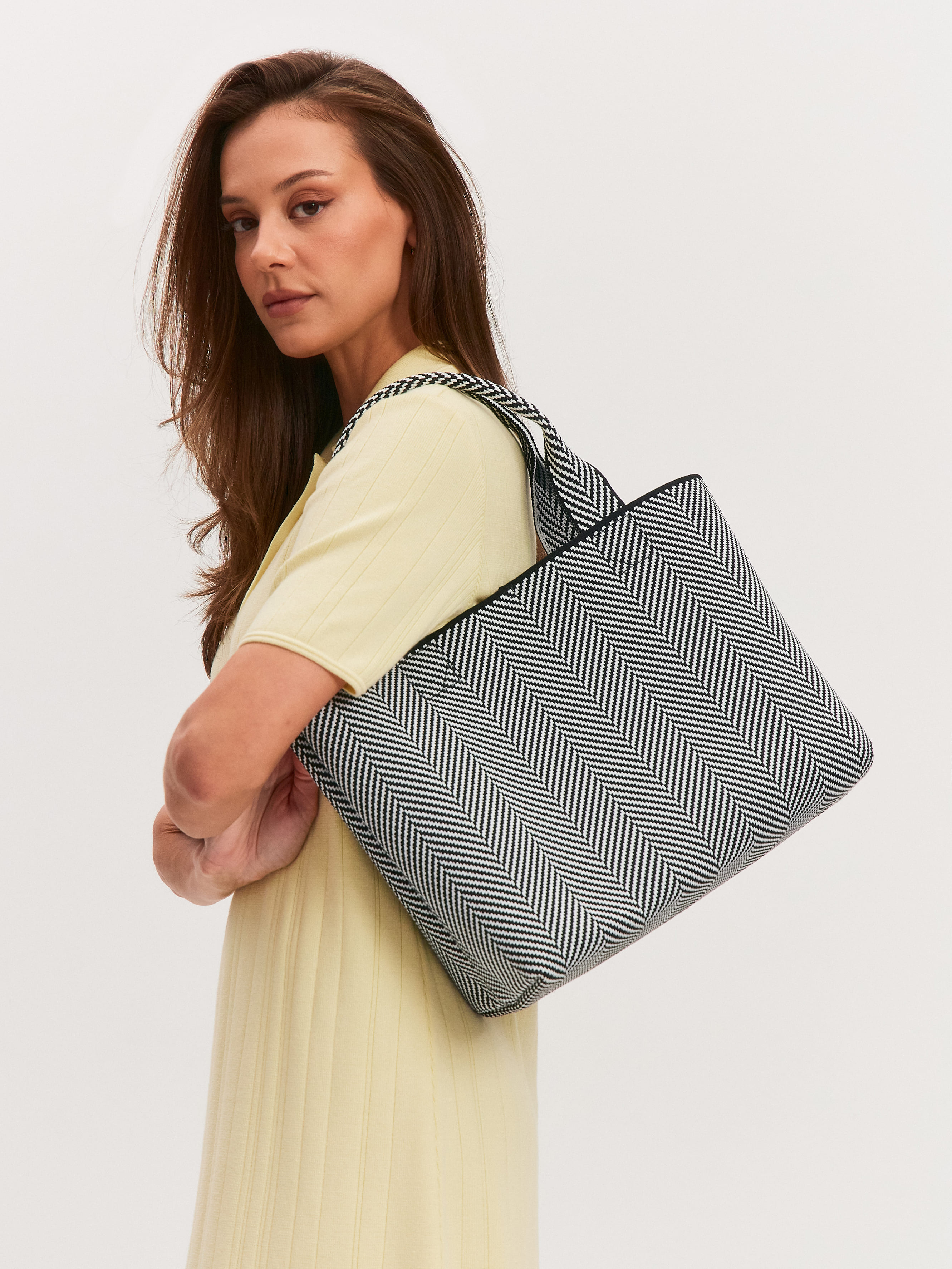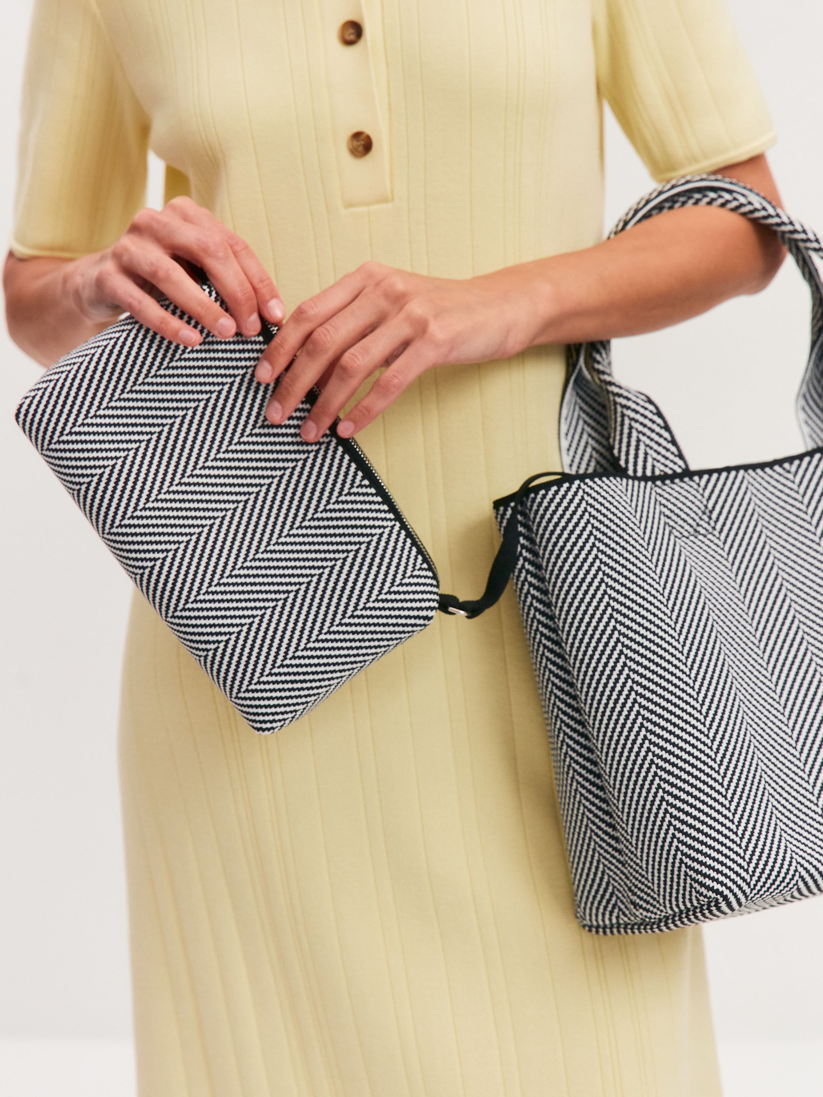 Комплект из объемной сумки тоут и косметички. Чтобы максимально сохранить полезное пространство, мы создали сумку без внутренних перегородок и подклада. Благодаря такой конструкции, внутрь помещается не только ежедневный косметический минимум, но и папка А4, зонт и планшет. Тоут застегивается на металлический карабин и дополнен двумя прочными прошитыми ручками. Жаккардовый принт на сумке вдохновлен эстетикой твида «хэррингбоун» и дублируется на косметичке.