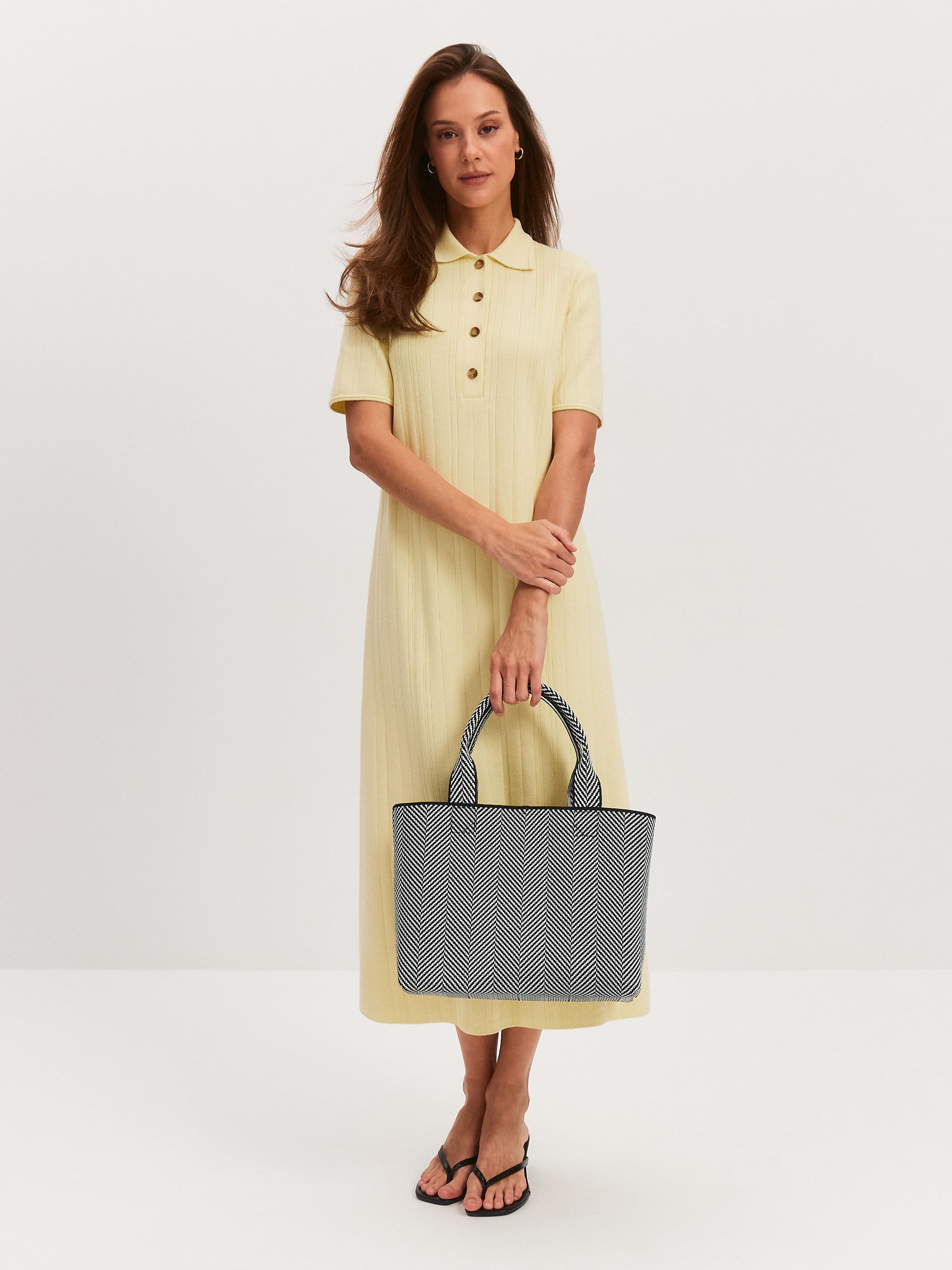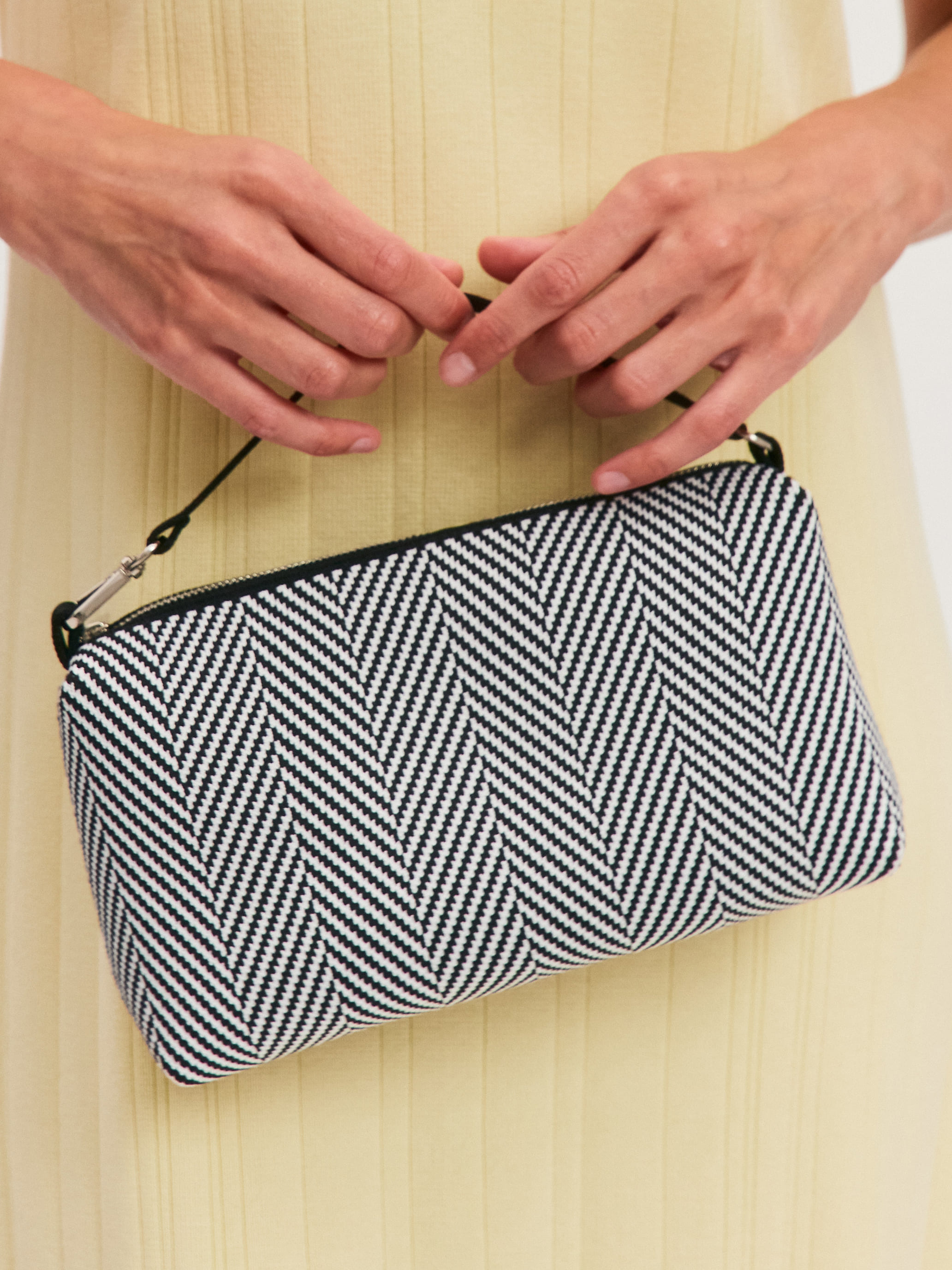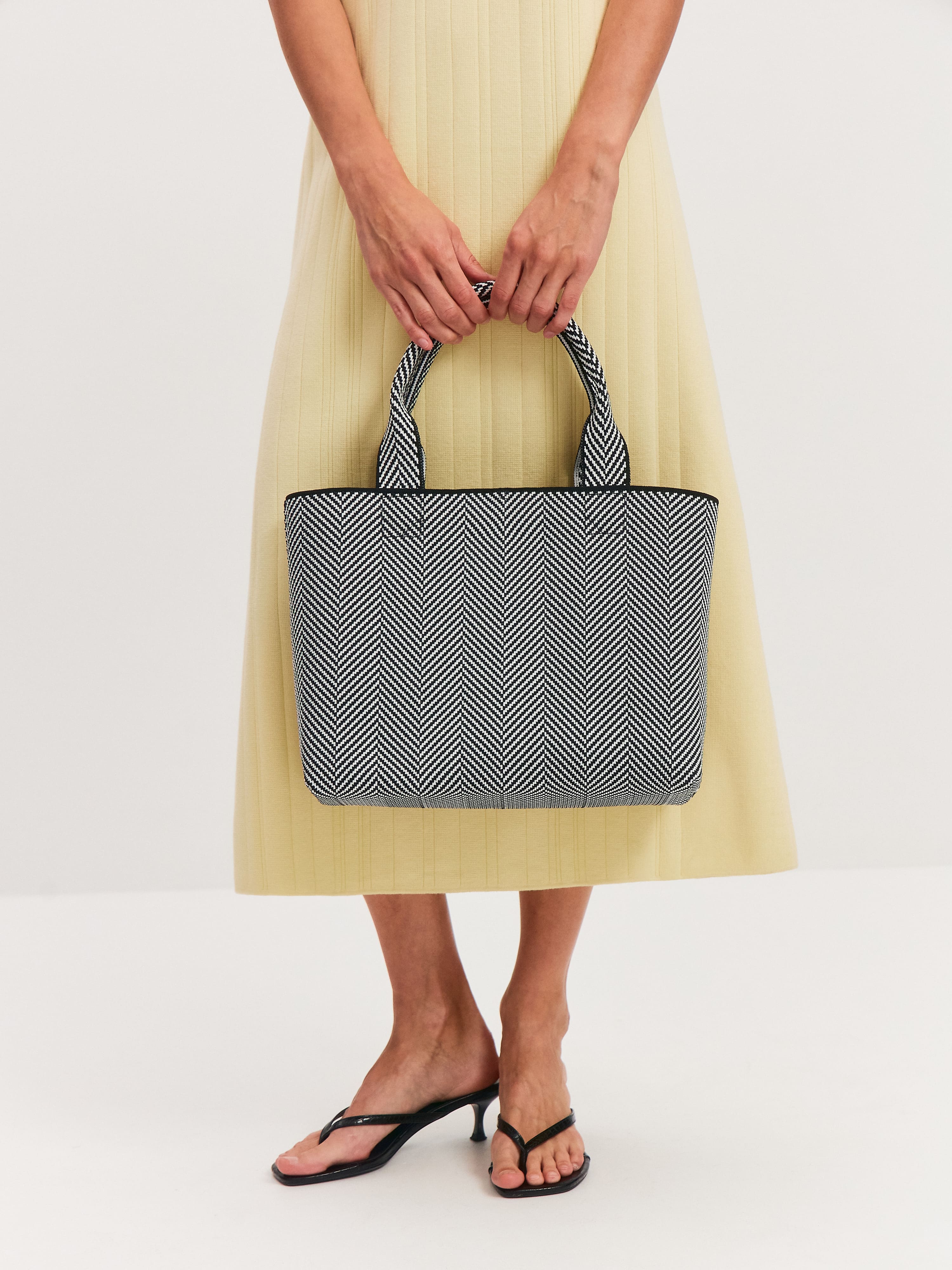 Комплект из объемной сумки тоут и косметички. Чтобы максимально сохранить полезное пространство, мы создали сумку без внутренних перегородок и подклада. Благодаря такой конструкции, внутрь помещается не только ежедневный косметический минимум, но и папка А4, зонт и планшет. Тоут застегивается на металлический карабин и дополнен двумя прочными прошитыми ручками. Жаккардовый принт на сумке вдохновлен эстетикой твида «хэррингбоун» и дублируется на косметичке.
