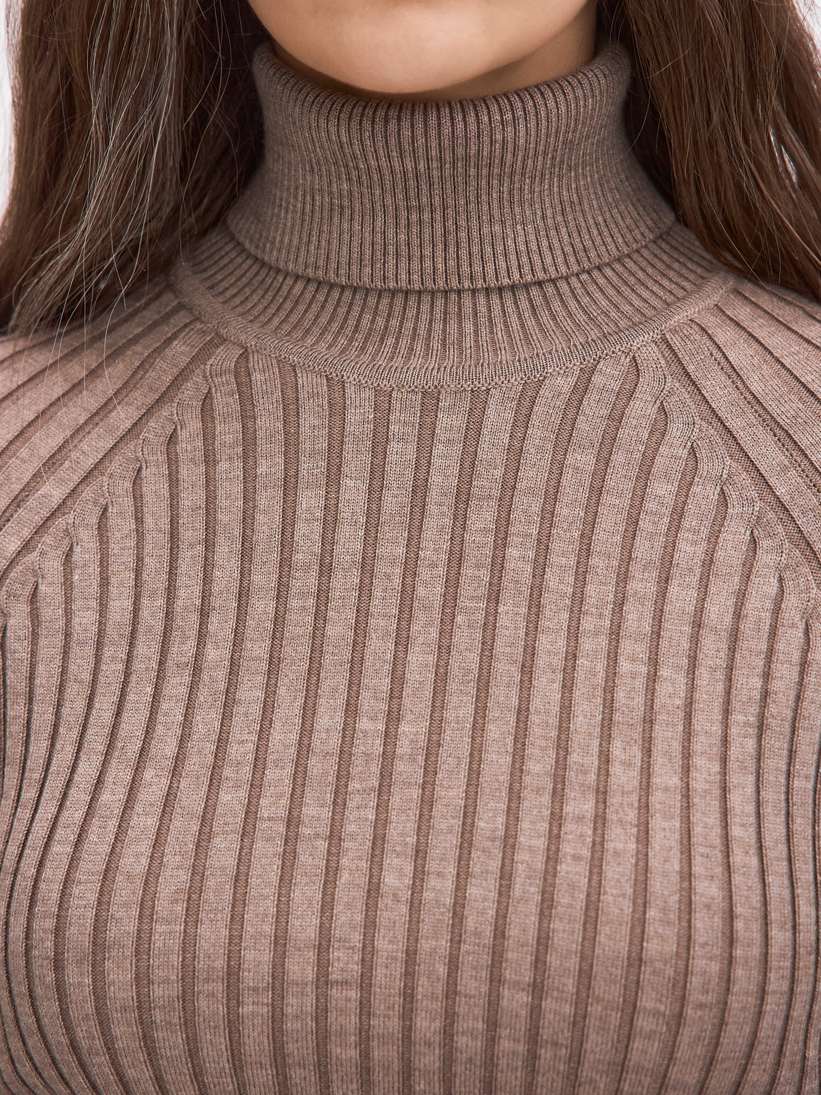 Утепленная водолазка лапша с высокой горловиной. При создании этой модели мы отказались от втачного рукава в пользу конструкции классический реглан. Так мы получили интересный визуальный эффект – рельефные полосы узора не просто сузили область талии, но и подчеркнули плавную линию плеч. Высокие тактильные свойства изделия обусловлены сбалансированной пряжей. Водолазка выполнена из тонкой шерсти мериноса, которую переплели с нитью искусственного шелка (вискозой). Такое сочетание сделало вещь гладкой, дышащей и долго удерживающей комфортную температуру