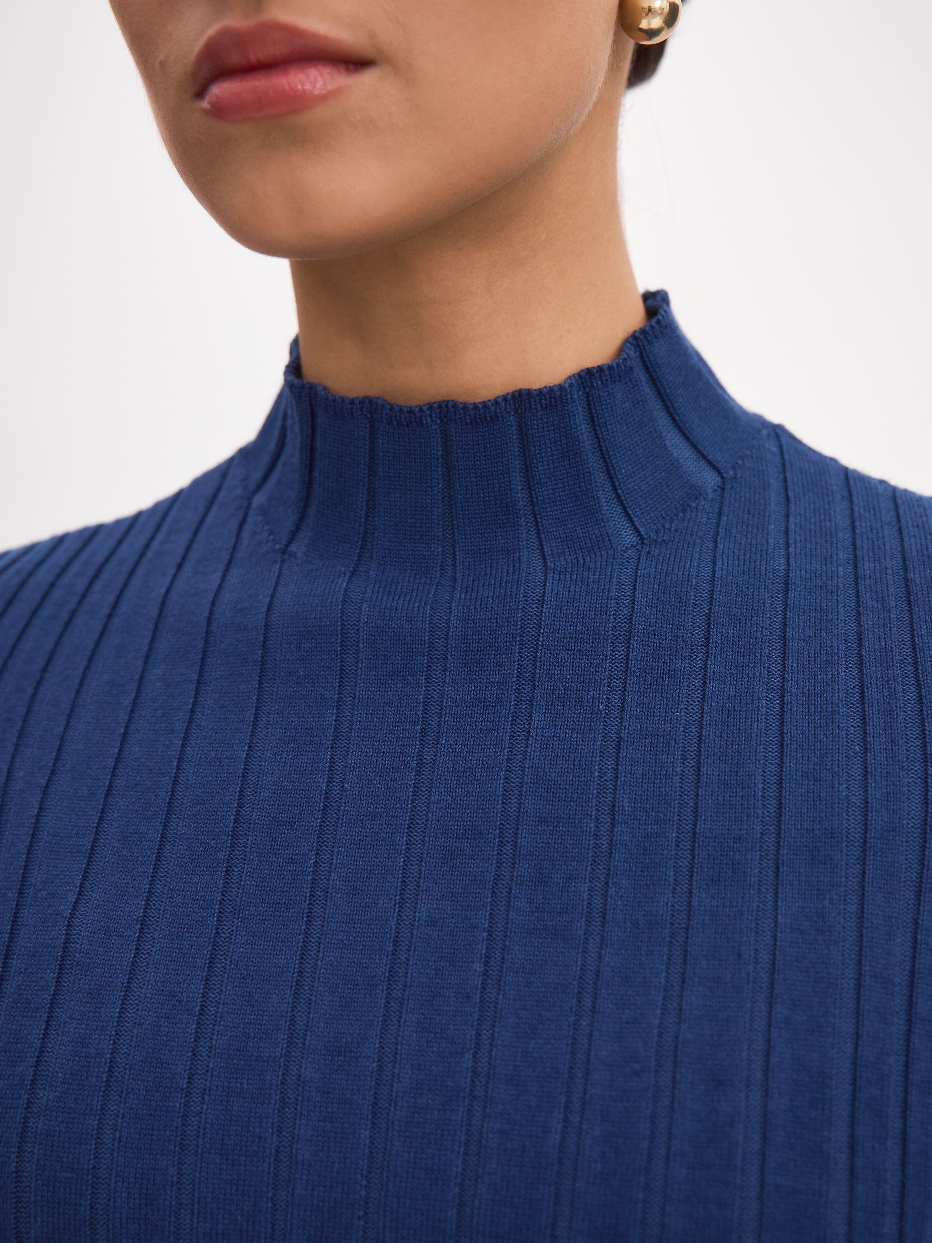 Основой для этой облегающей водолазки послужил особый сорт шерстяной пряжи. Натуральная шерсть в ней подчеркнуто шелковистая, поскольку переплетена с волокнами вискозы. Такой состав позволяет носить водолазку прямо на белье, не ощущая дискомфорта от контакта трикотажа с телом. Продольная полоса узора оптически вытягивает фигуру. Чтобы укороченный рукав и фигурный ворот максимально раскрыли свой потенциал, рекомендуем включить джемпер в сочетания с юбками.