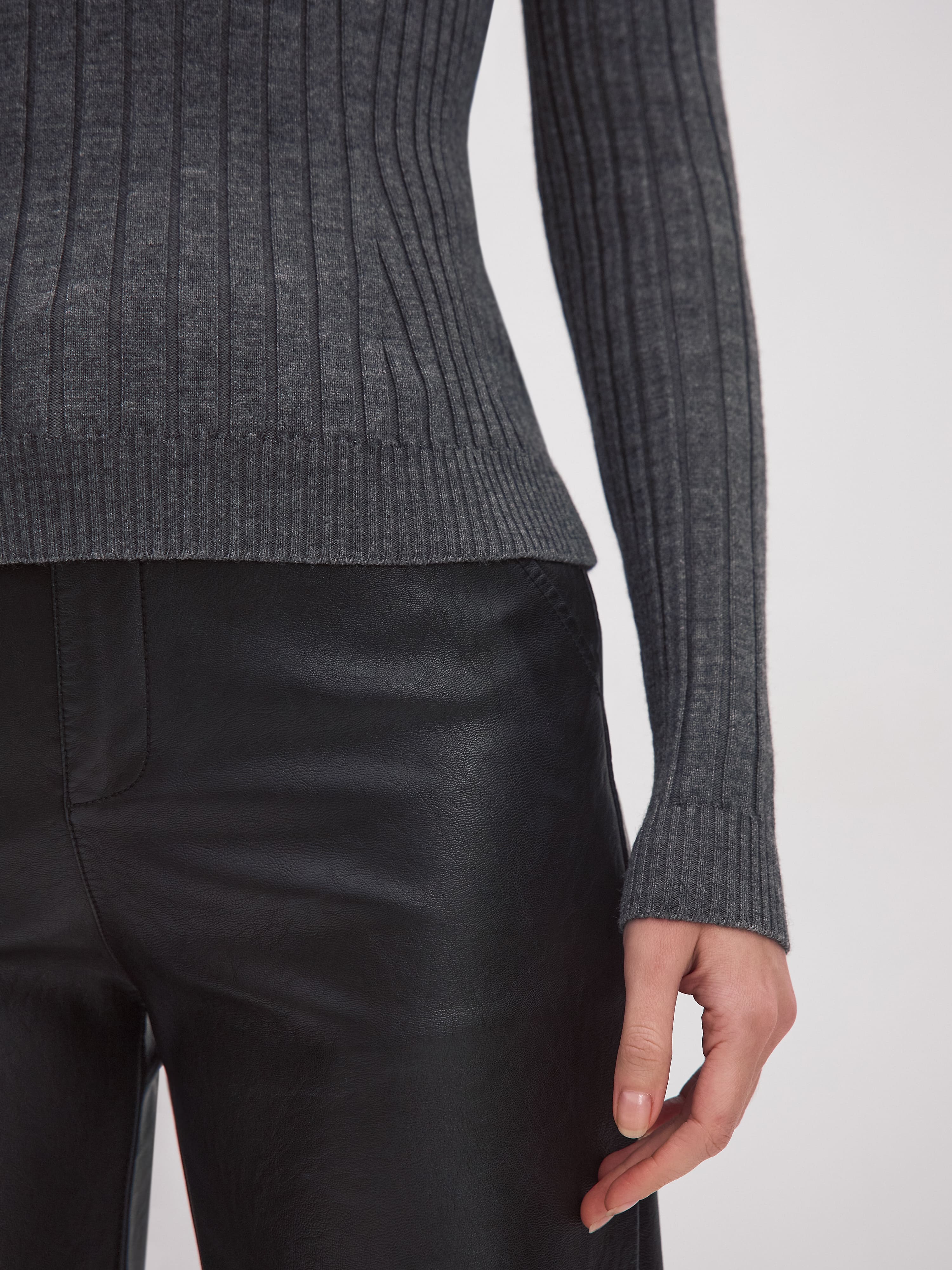 Водолазка-лапша из мериносовой полушерсти с высоким цельновязаным воротом. Прекрасно справляется с ролью тонкого осеннего свитера и замечательно ведет себя в качестве нижнего слоя под зимние жилеты и кардиганы. Конструкция рукава выполнена таким образом, чтобы сохранить свободу облегания у запястья. Это позволяет по-разному стилизовать водолазку – например, подтягивать рукав легкой «гармошкой» по линии предплечья. Волнистая кромка горловины – это легкий декор и удобное решение для всех, кто не любит плотно прилегающие края ворота.