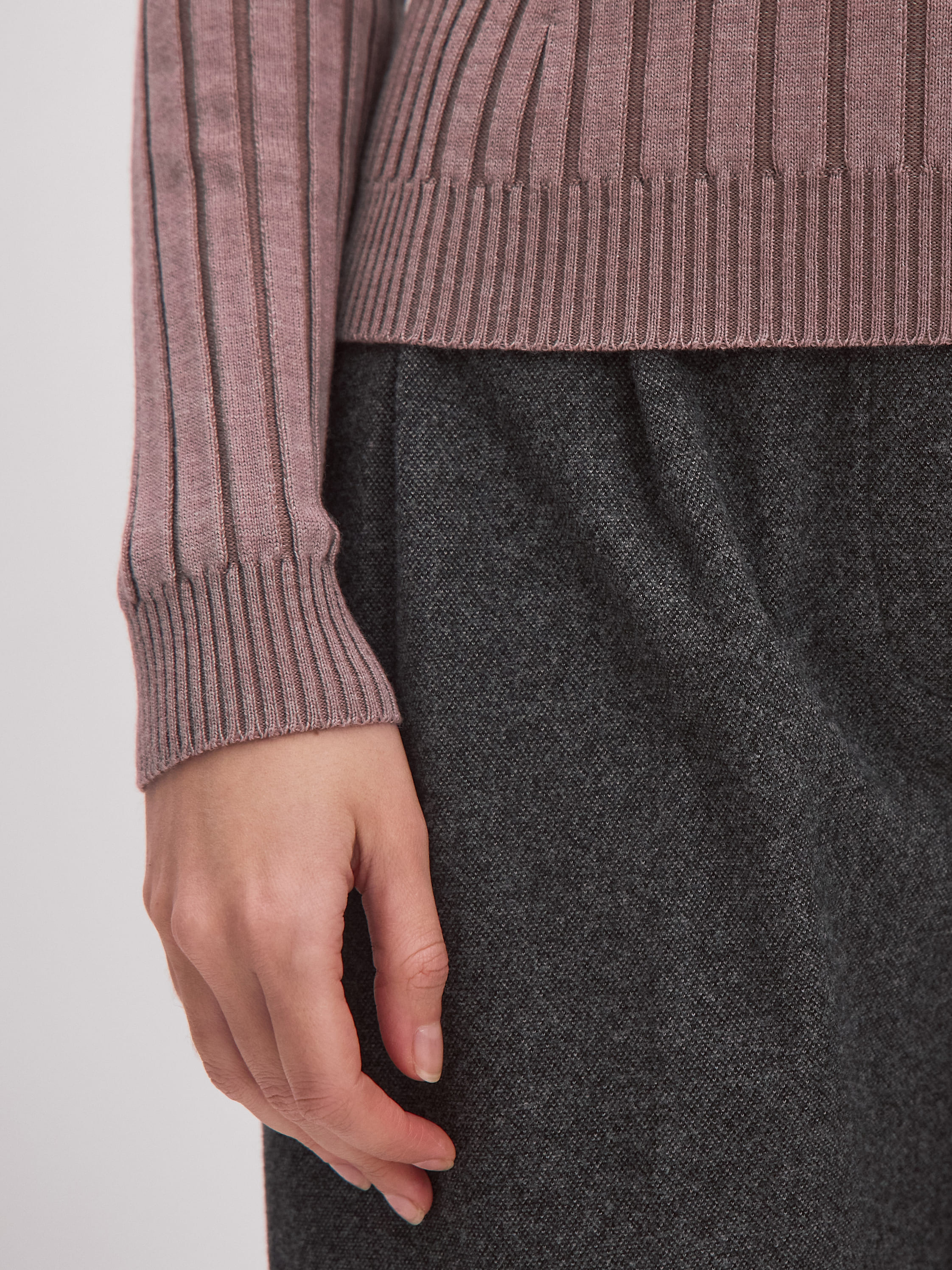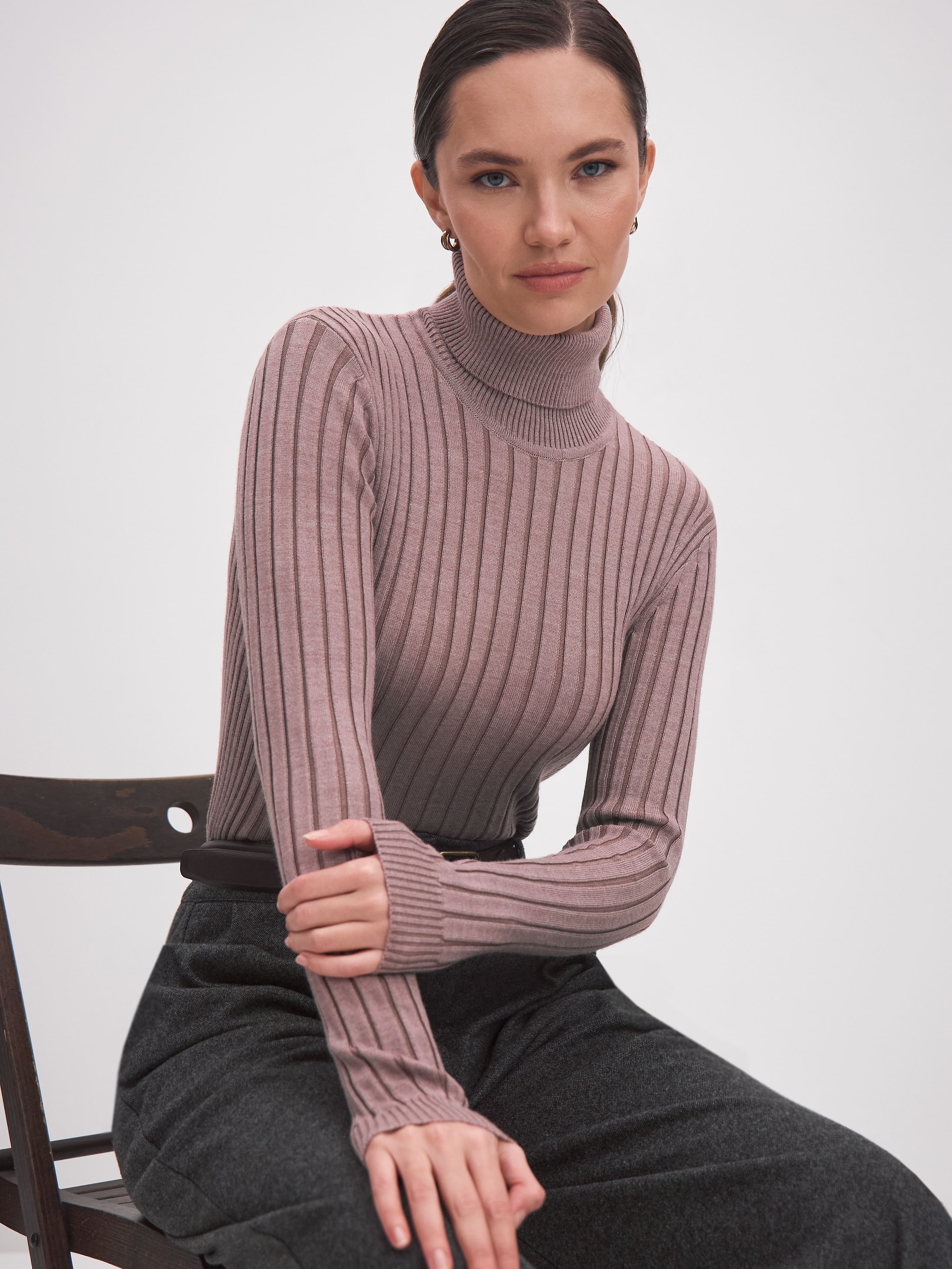 Водолазка-лапша из мериносовой полушерсти с высоким цельновязаным воротом. Прекрасно справляется с ролью тонкого осеннего свитера и замечательно ведет себя в качестве нижнего слоя под зимние жилеты и кардиганы. Конструкция рукава выполнена таким образом, чтобы сохранить свободу облегания у запястья. Это позволяет по-разному стилизовать водолазку – например, подтягивать рукав легкой «гармошкой» по линии предплечья. Волнистая кромка горловины – это легкий декор и удобное решение для всех, кто не любит плотно прилегающие края ворота.