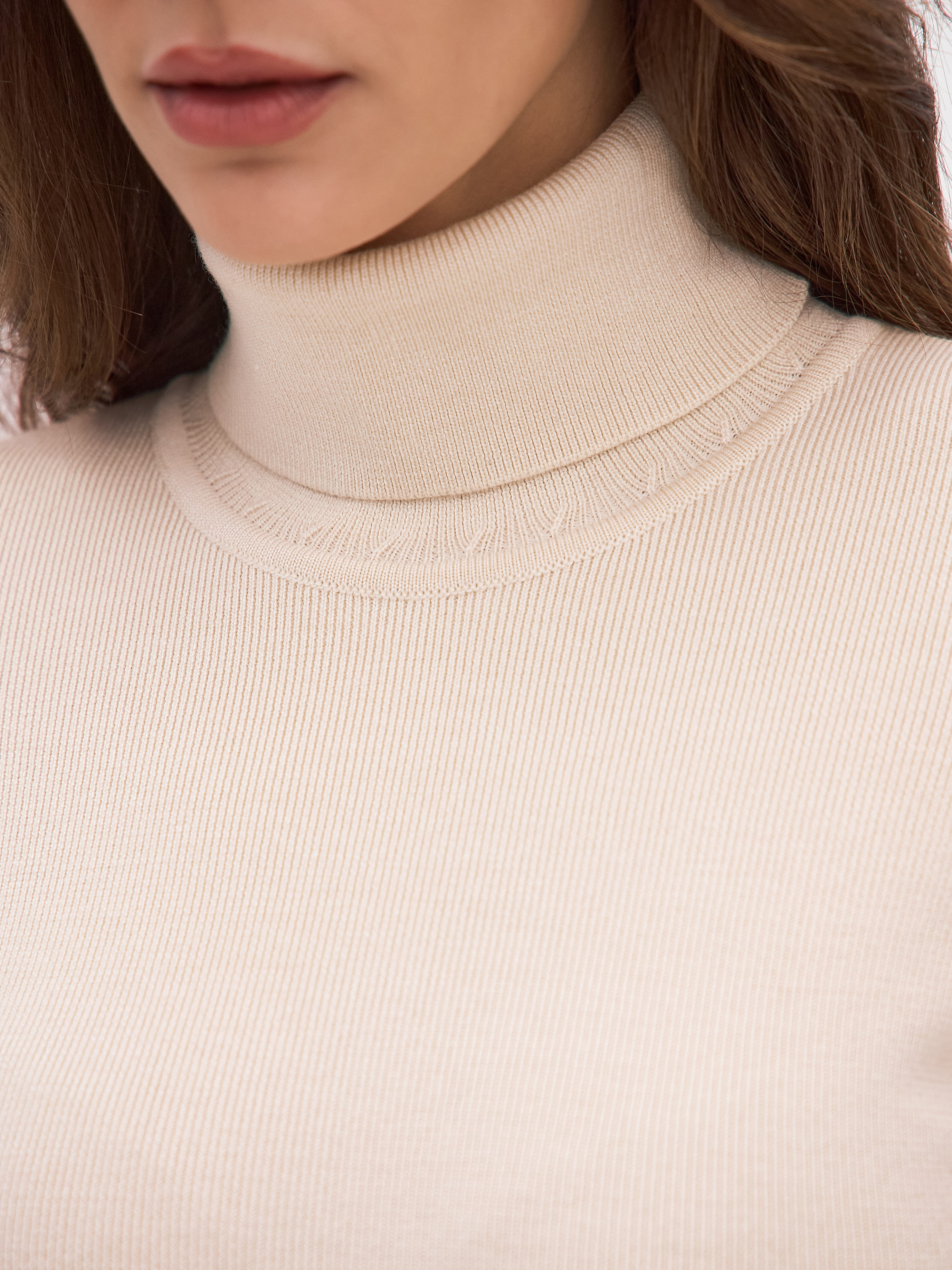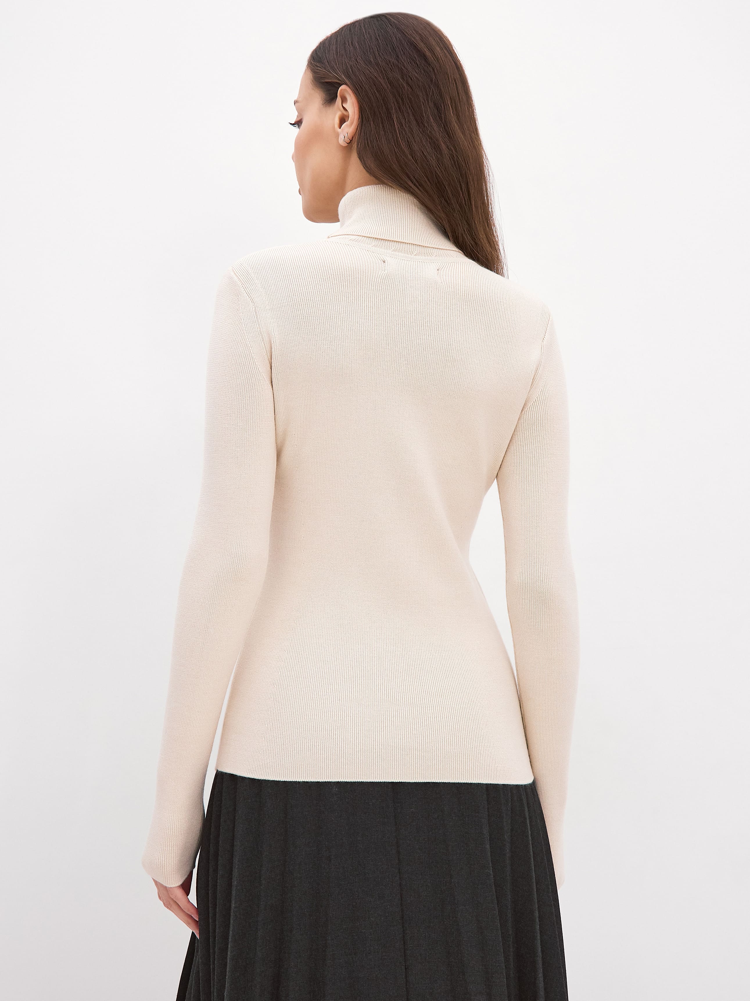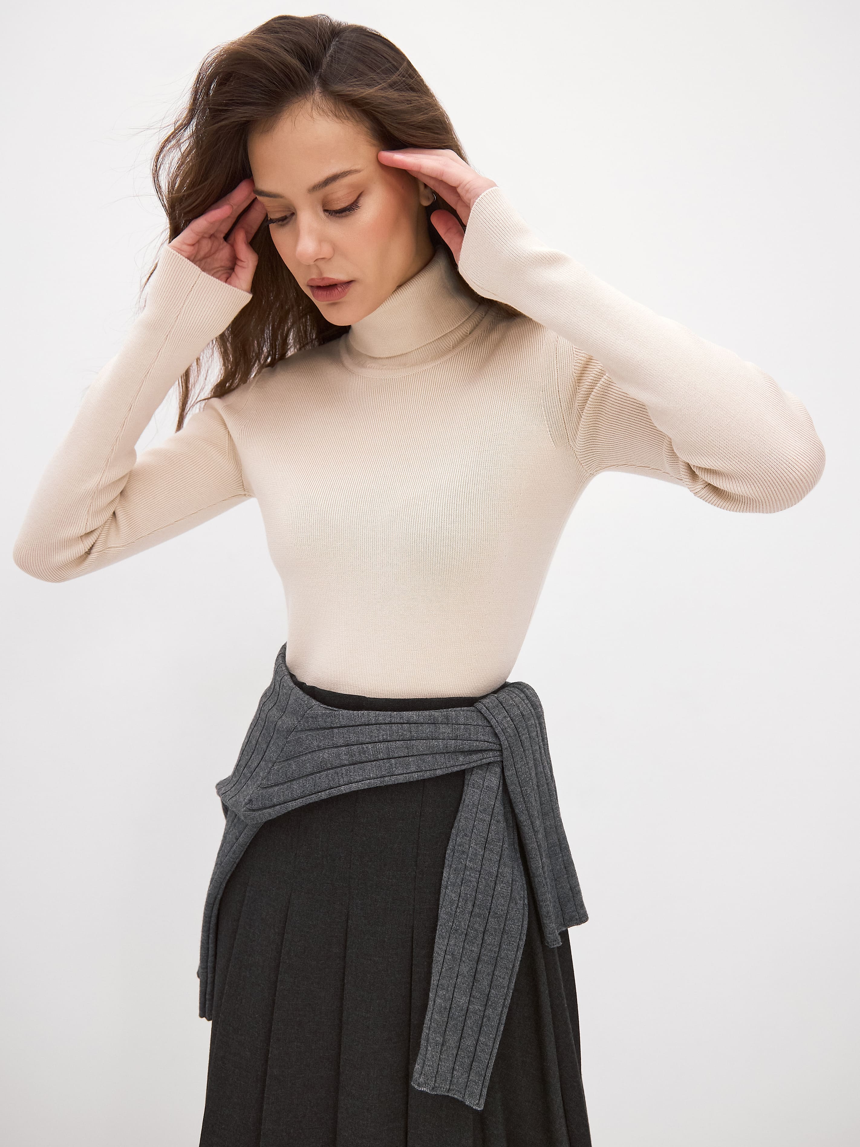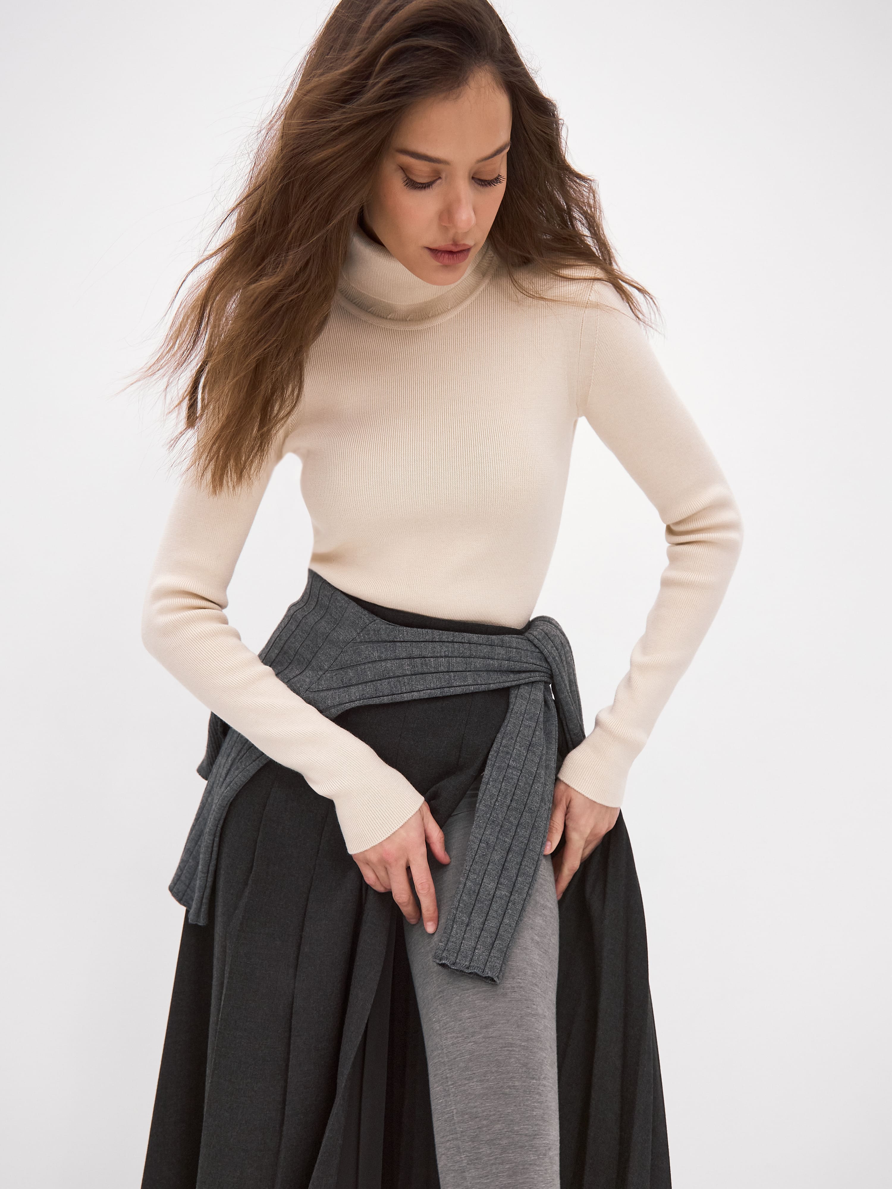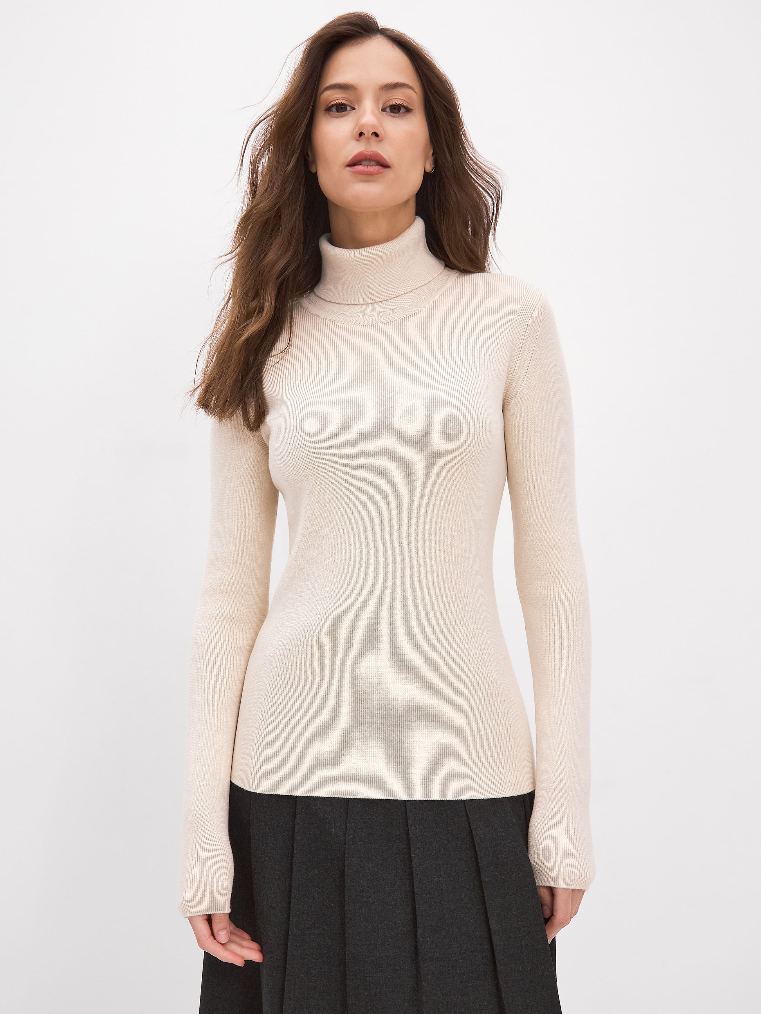 Плотный трикотаж этой базовой водолазки обладает предельной эластичностью и бережным воздействием на кожу. Модель предназначена для особой категории девушек и женщин – тех, кто нуждается в нежном согревании и у кого не выстраиваются отношения с обычной шерстью. Изделие выполнено из тонкой мериносовой пряжи с включением вискозы, которая не позволит телу перегреваться с приходом тепла. Плотно прилегающая к шее горловина подворачивается в два слоя. Чтобы добиться подчеркивания самых сильных сторон силуэта, рекомендуем носить водолазку поверх бесшовного и корректирующего белья.