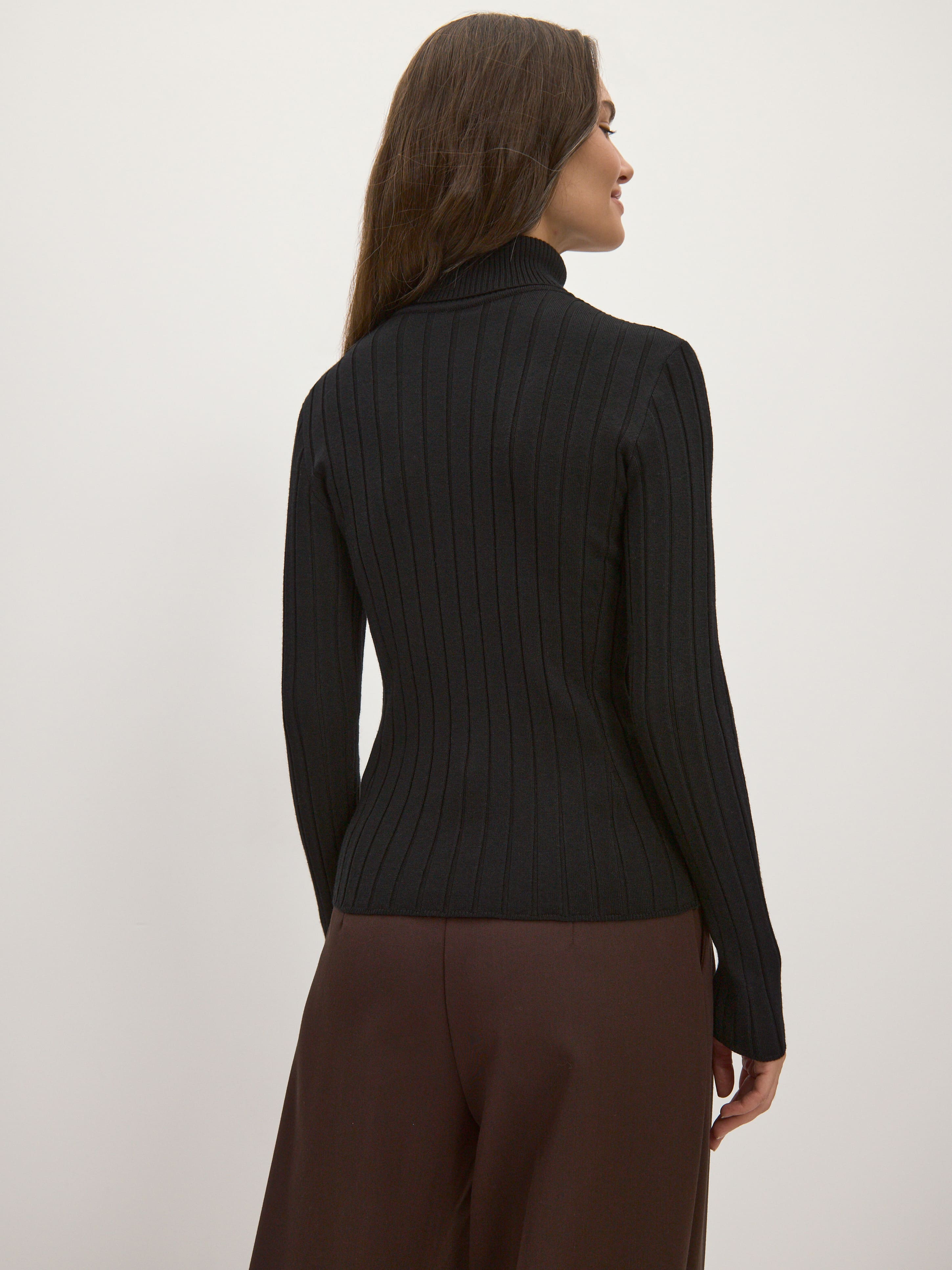 Облегающий джемпер-лапша, утепленный 50% мериносовой шерсти, – лучший друг на осеннюю непогоду и зимние холода. Станет достойной альтернативой любимой водолазке, так как качественно удерживает тепло под собой и слегка вытягивает фигуру за счет вертикального узора. Превосходно тянется, при этом не вытягиваясь по линии шва и не образуя асимметрии краев. Подворачивающаяся горловина плотно прилегает к шее. Это позволяет носить джемпер под тренч и пальто без шарфа.