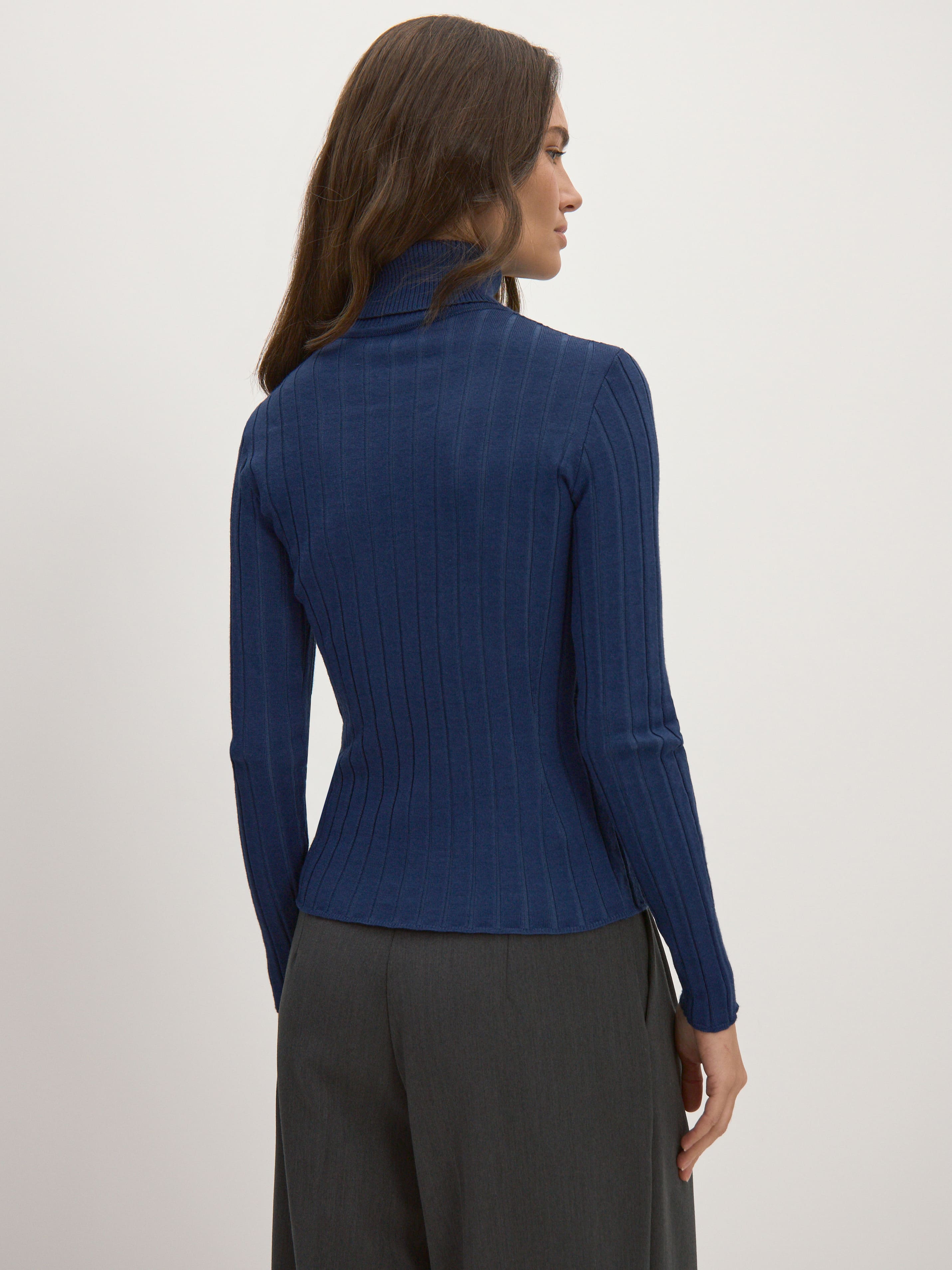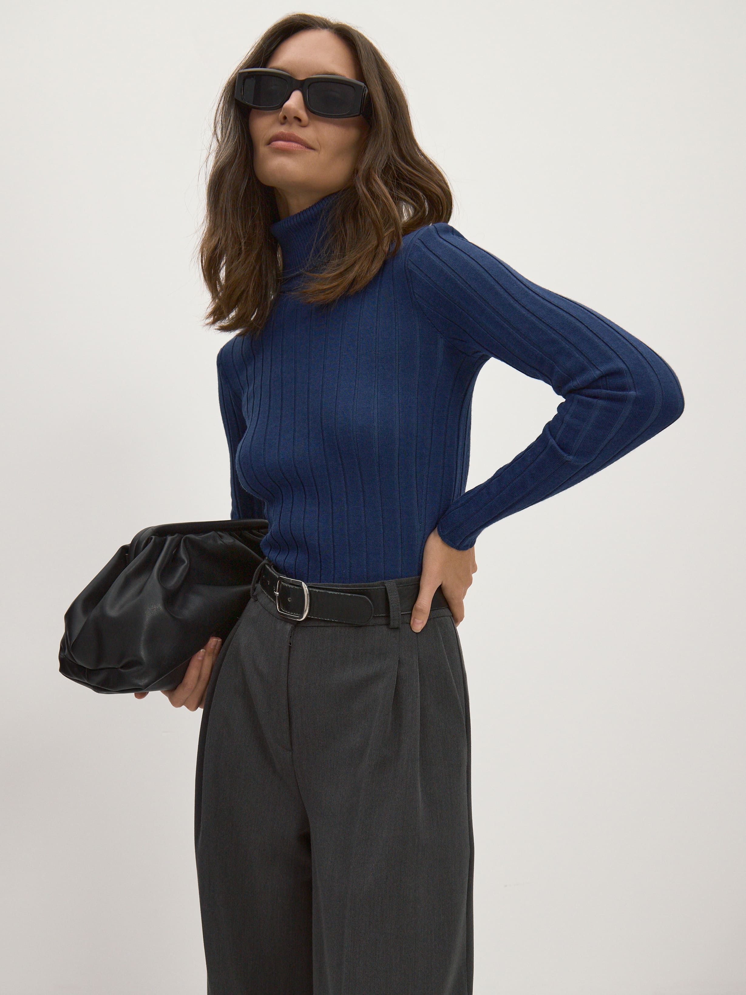 Облегающий джемпер-лапша, утепленный 50% мериносовой шерсти, – лучший друг на осеннюю непогоду и зимние холода. Станет достойной альтернативой любимой водолазке, так как качественно удерживает тепло под собой и слегка вытягивает фигуру за счет вертикального узора. Превосходно тянется, при этом не вытягиваясь по линии шва и не образуя асимметрии краев. Подворачивающаяся горловина плотно прилегает к шее. Это позволяет носить джемпер под тренч и пальто без шарфа.
