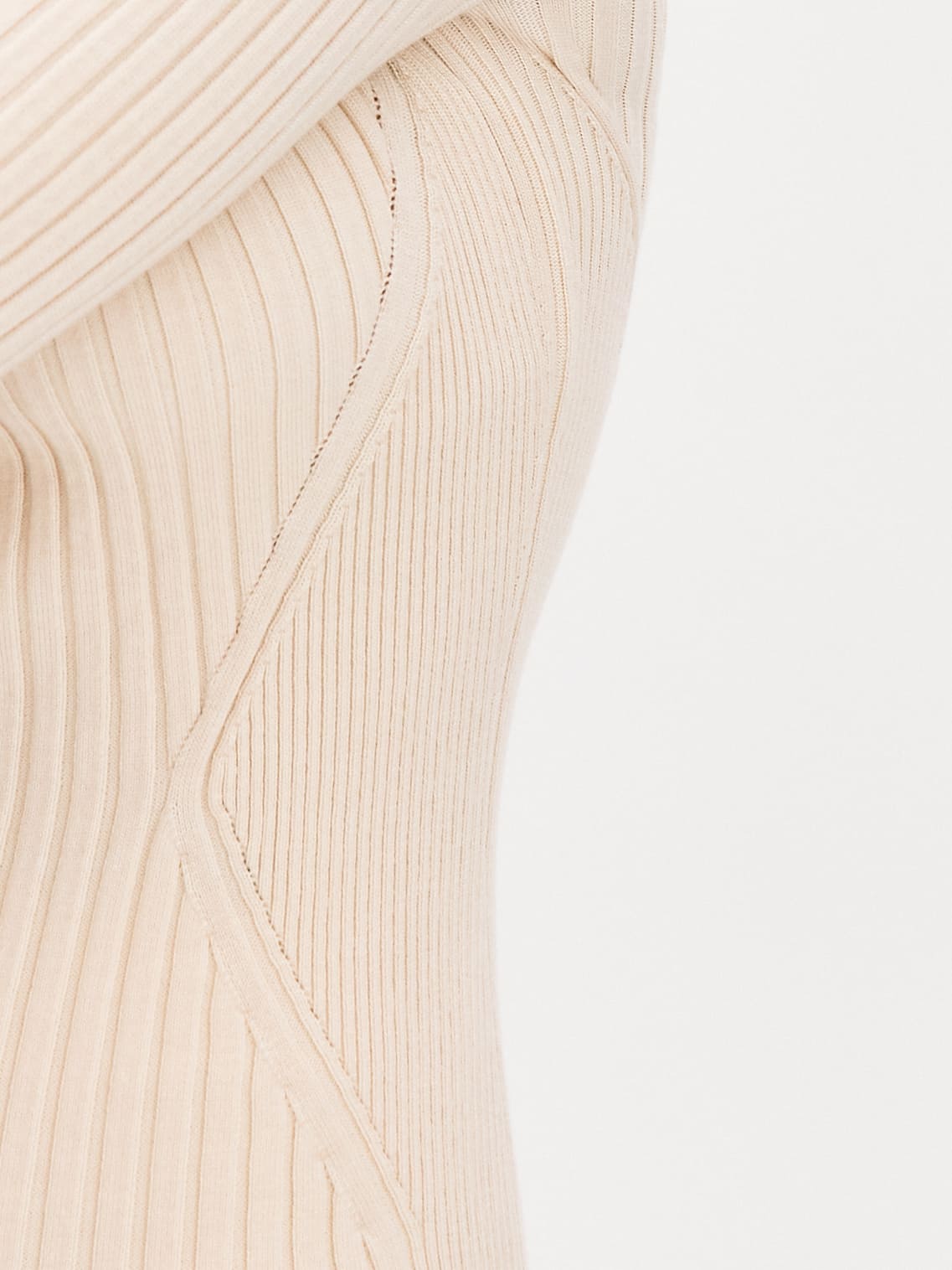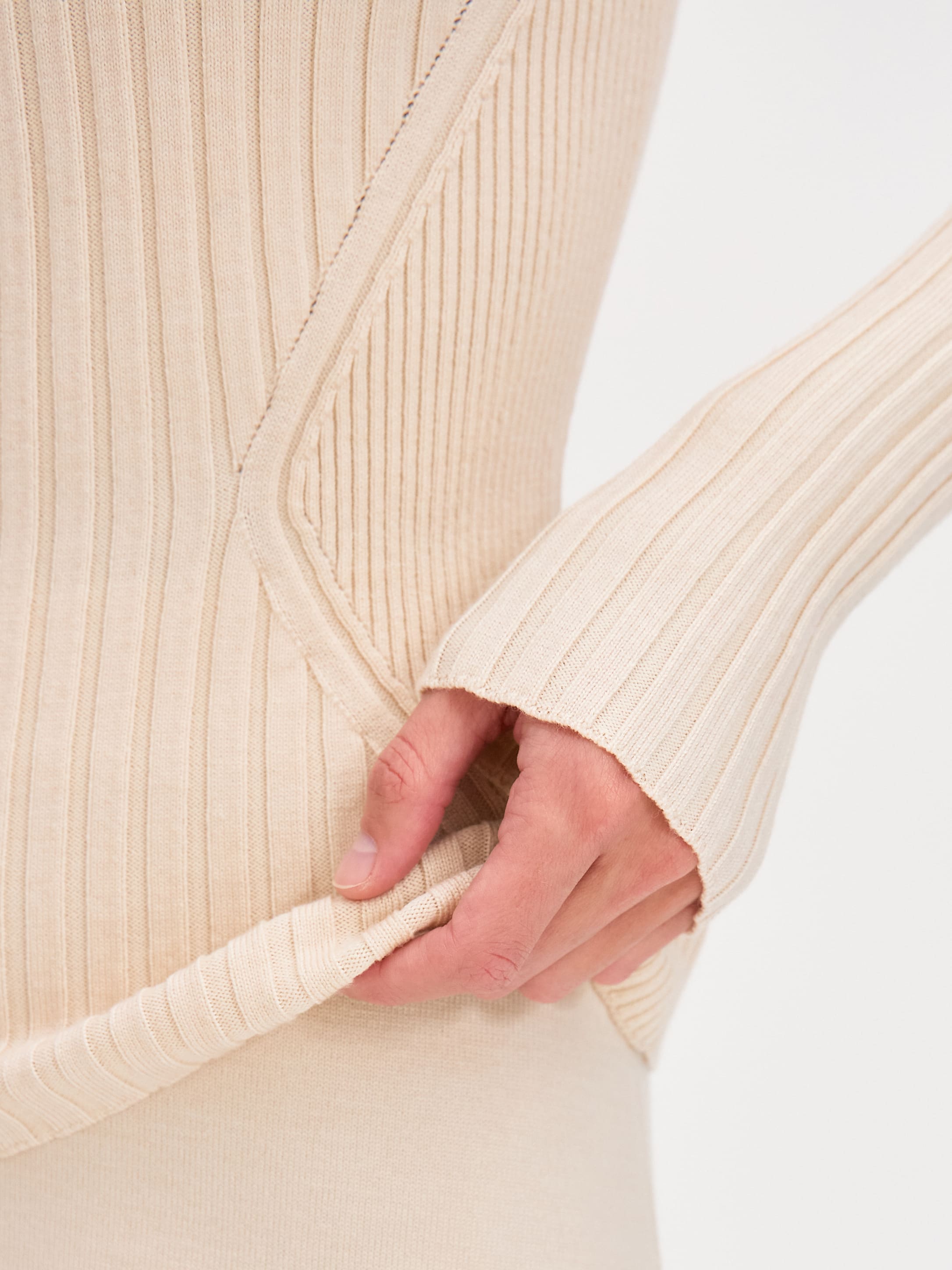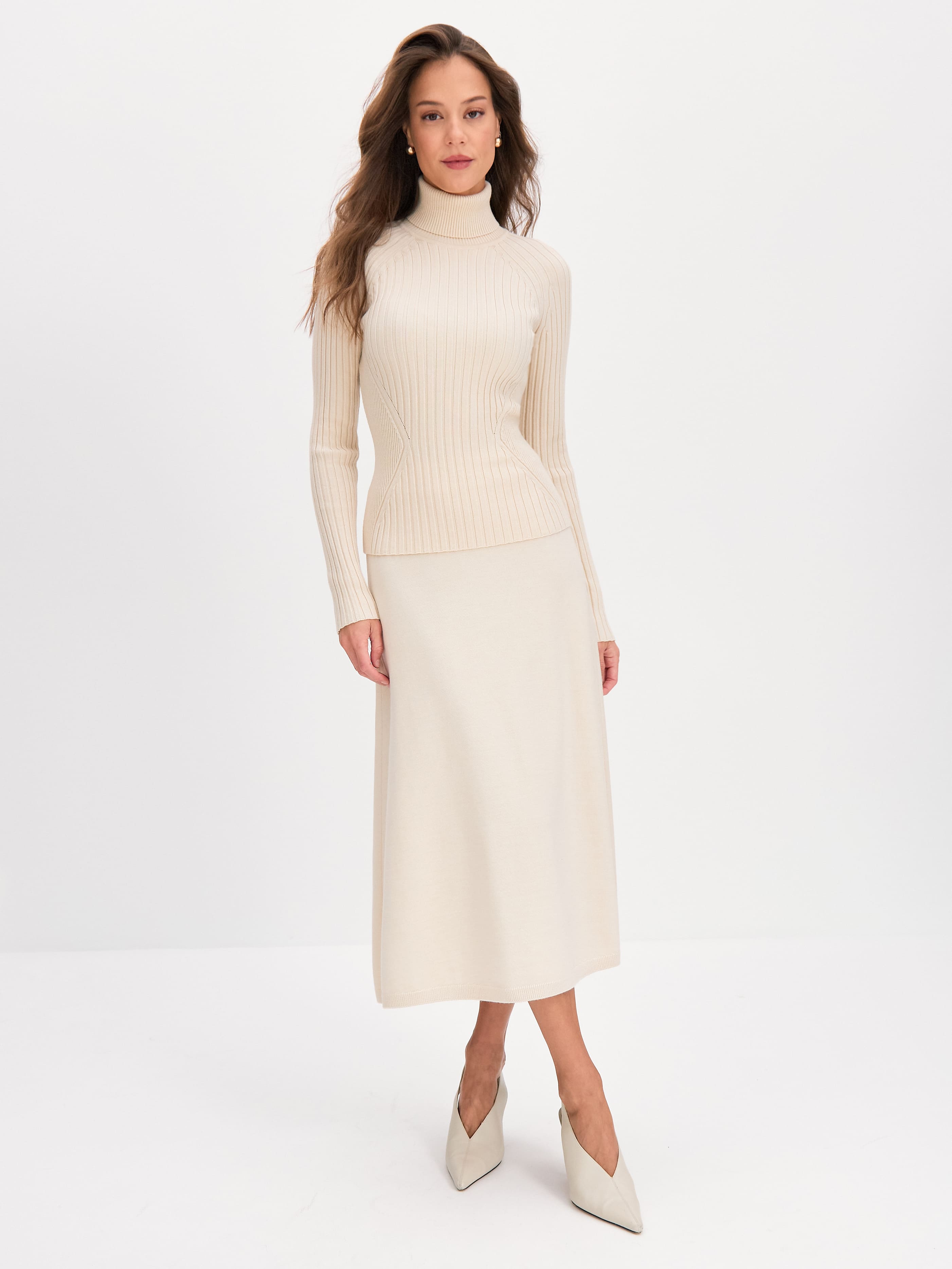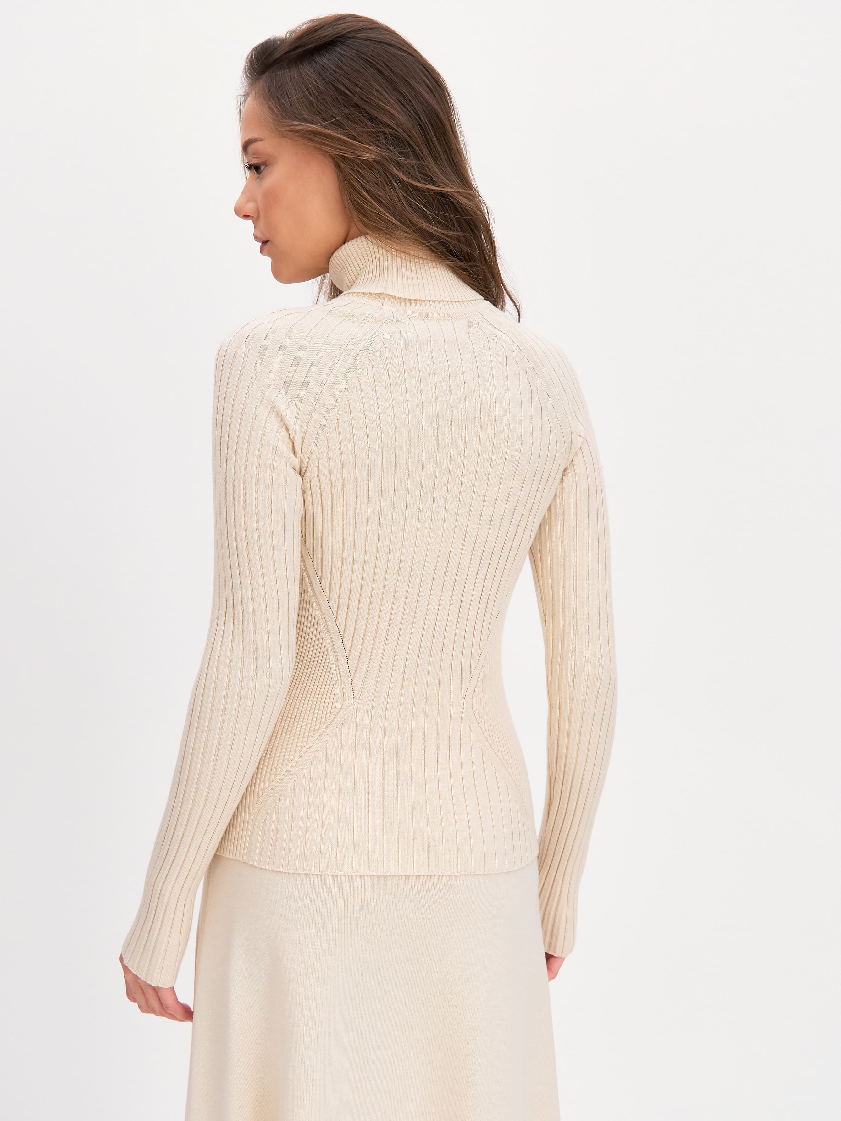 Сложный дизайн этой водолазки – результат комбинирования нескольких вязальных техник. Основная часть выполнена из плотной шерсти и состоит из двух видов трикотажа – фактурной лапши и гладких боковых вставок. Вместе они формируют красивую линию перехода от груди к талии. Горловина связана в мелкий рубчик для комфортного прилегания к шее. Высота ворота регулируется подворотом внутрь или наружу.