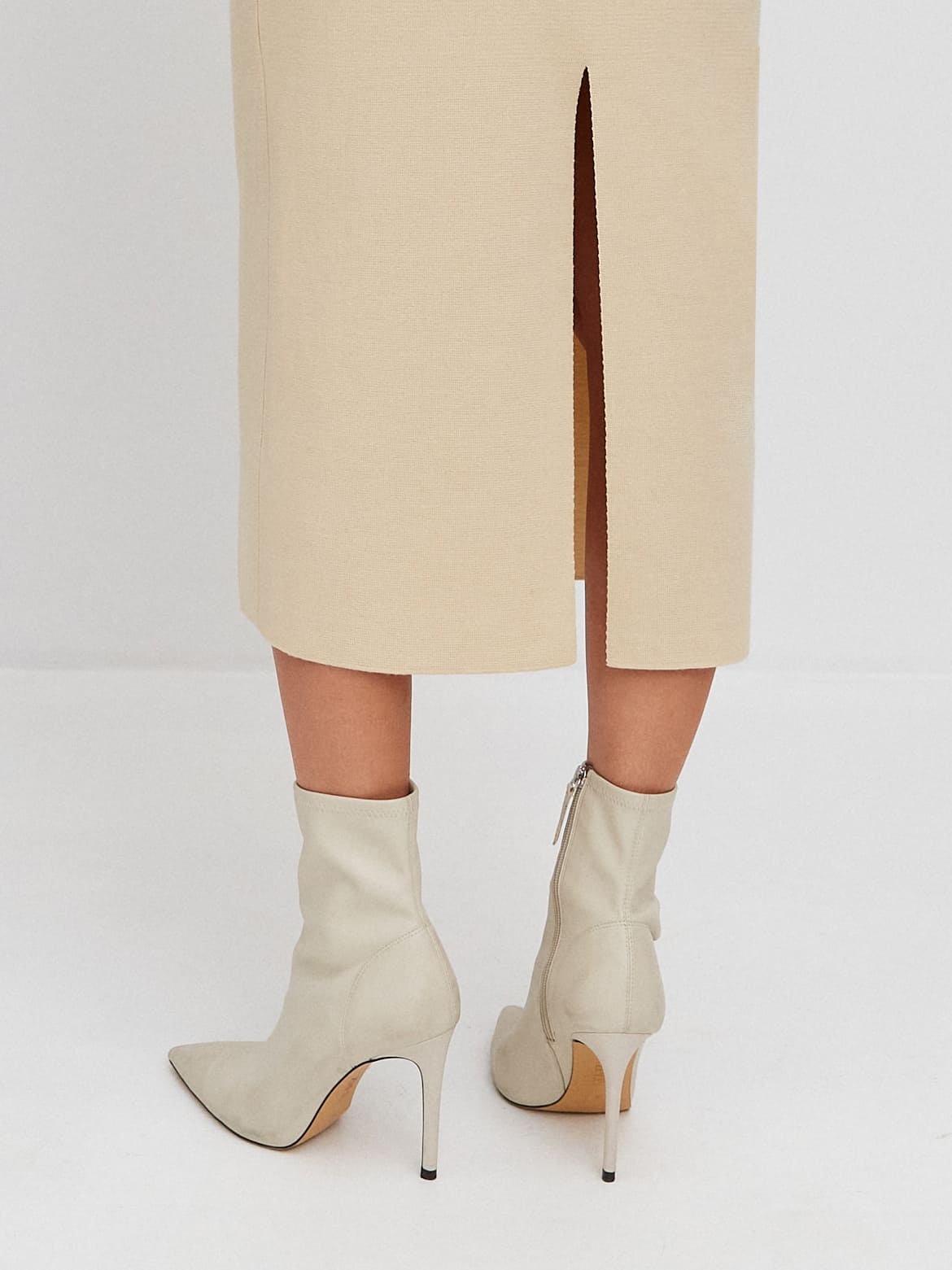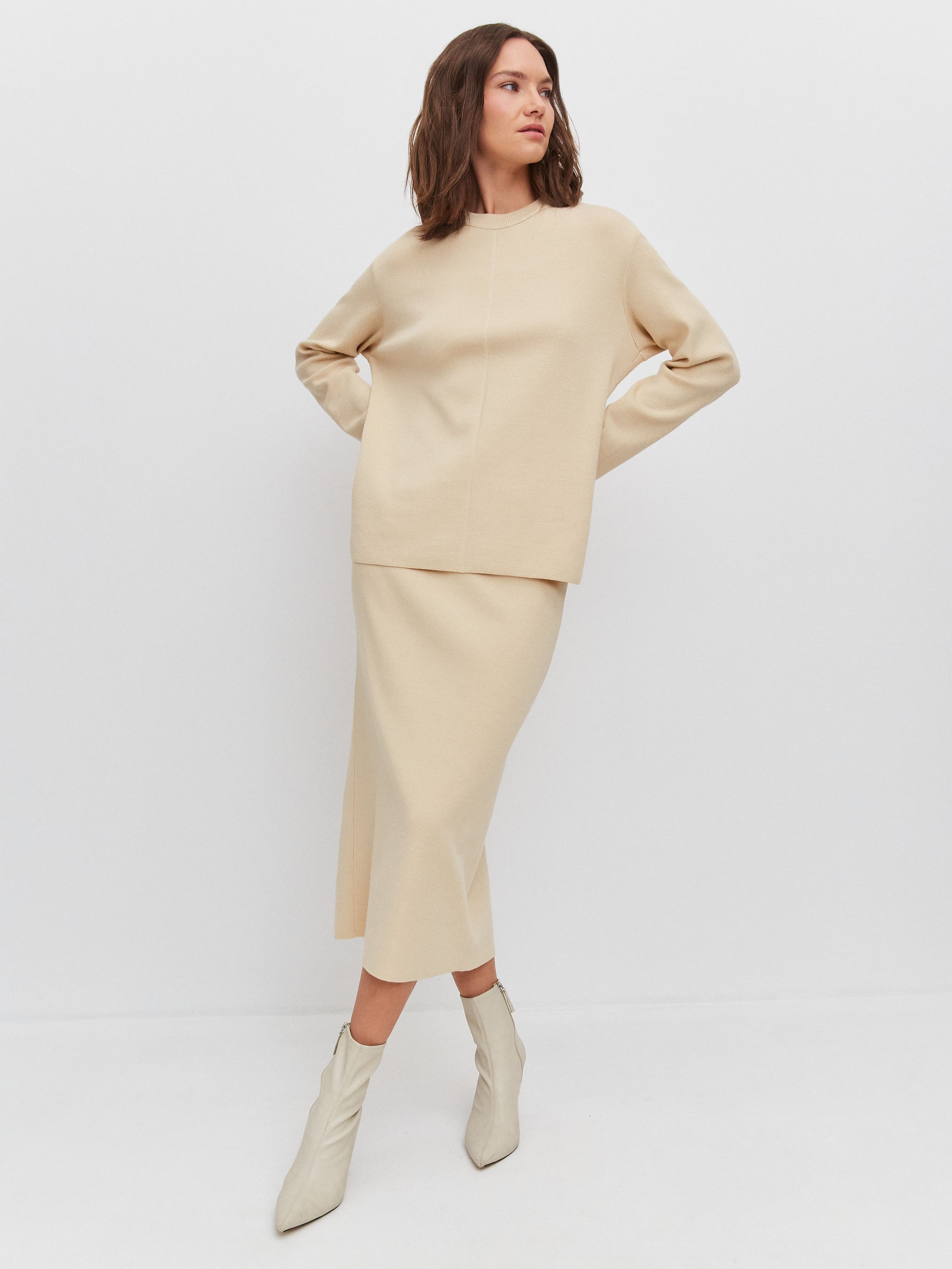 Лаконичная юбка-карандаш из премиального шерстяного трикотажа. Универсальная модель, уместный верх для которой легко найдется как в повседневном, так и вечернем гардеробе. В основе – один из самых мягких сортов шерстяной пряжи с вискозой, превращенный в плотное, шелковистое полотно с умеренными согревающими характеристиками. Акцентный вырез сзади – не только декоративный, но и функциональный элемент. Юбка позволяет свободно двигаться и не корректировать привычную ширину шага.