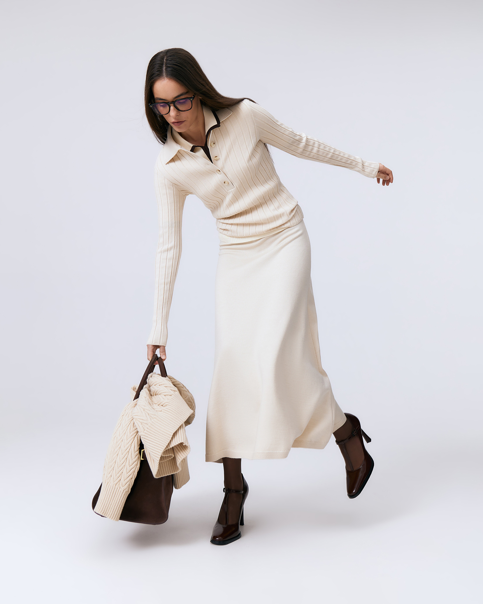Мягкий трикотаж этой юбки утеплен мериносовой шерстью, которая на порядок нежнее классической шерстяной пряжи. Необходимую плотность изделию придает нить искусственного шелка (вискозы). Укрепленный рубчиком край юбки призван выровнять линию низа и не дать ей потерять форму под тяжестью полотна. Модель классического А-силуэта, который превосходно «делает» талию. Рекомендуем в качестве базы для романтических осенних образов и теплых комплектов на зиму со свитерами MONONAME.
