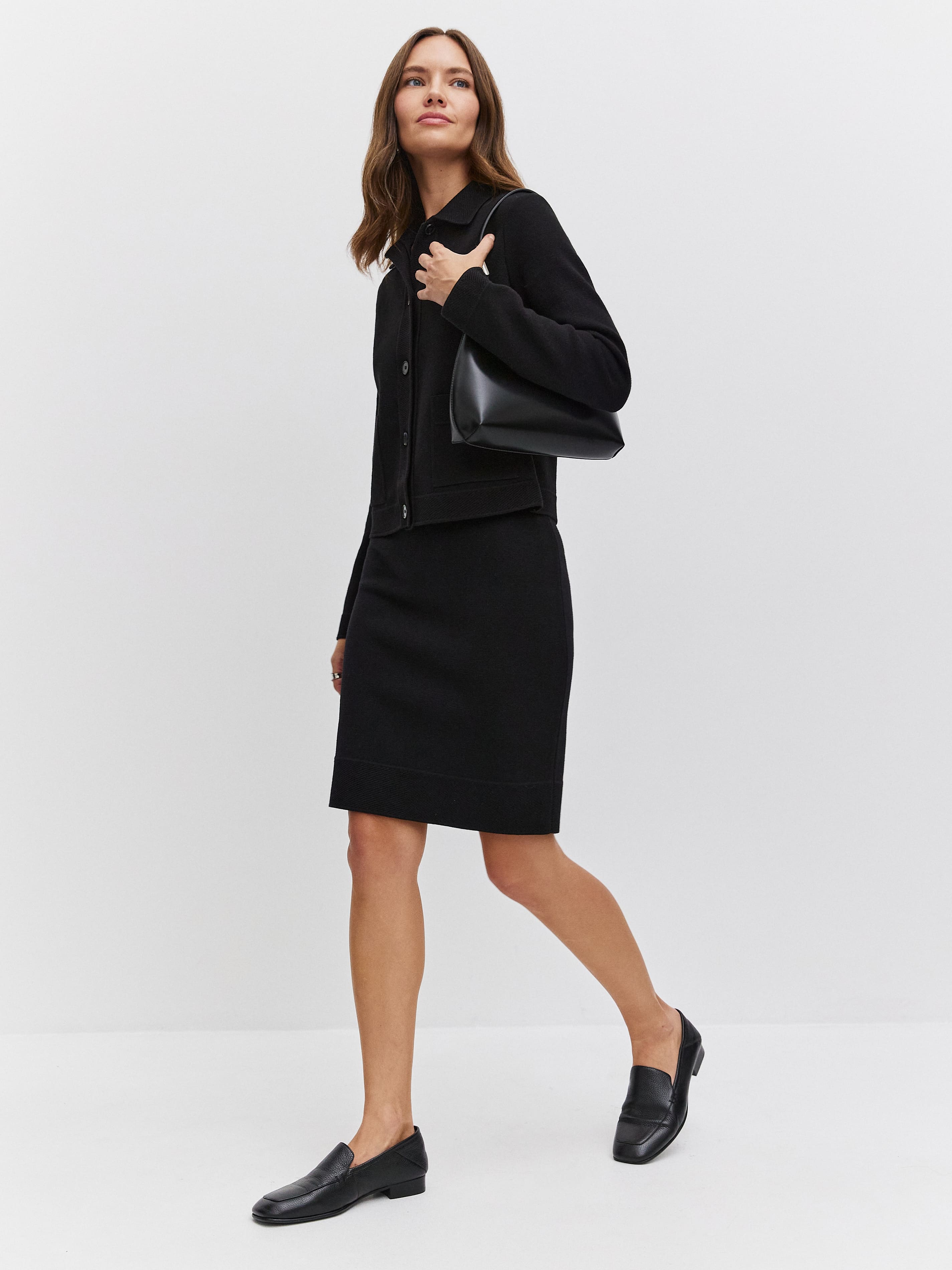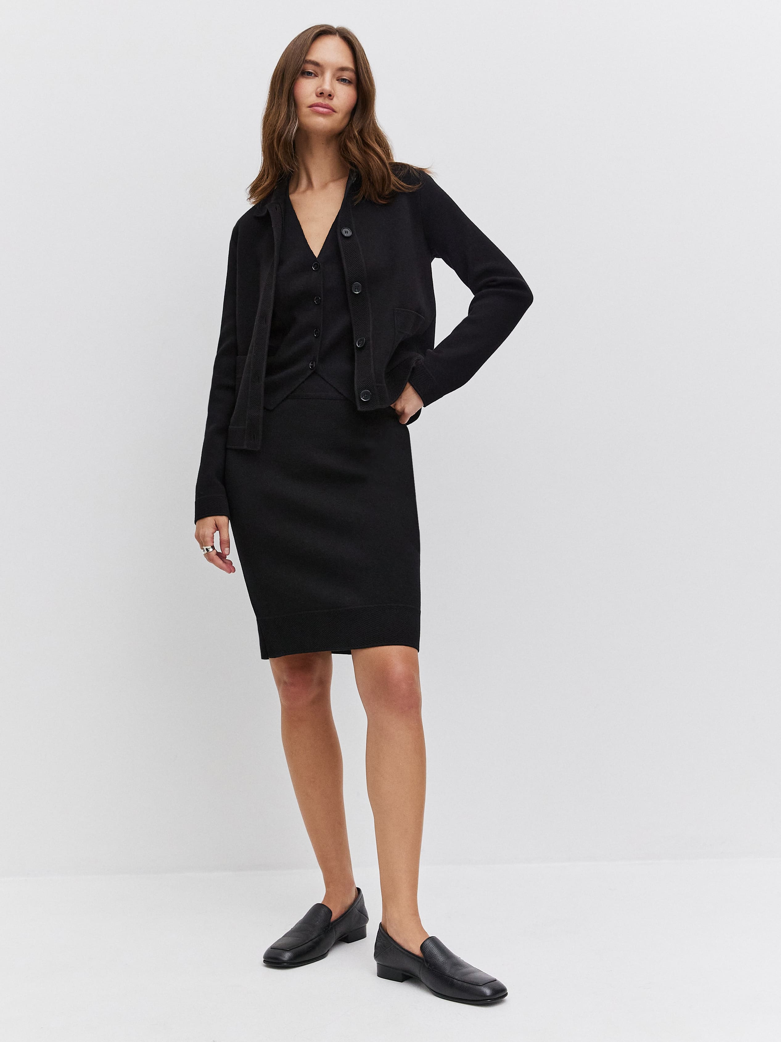 Прямой силуэт этой мини-юбки подчёркивает плавность изгиба бедра, не ограничивая ширину шага. Для данной модели мы предпочли базовую длину и использовали принцип разницы фактур. Основная часть подола связана в более гладкой технике, а низ декорирован широкой фактурной полосой. На каждый день сочетайте изделие с костюмными жилетами из хлопко-вискозы, а также легкими футболками из последней коллекции MONONAME.