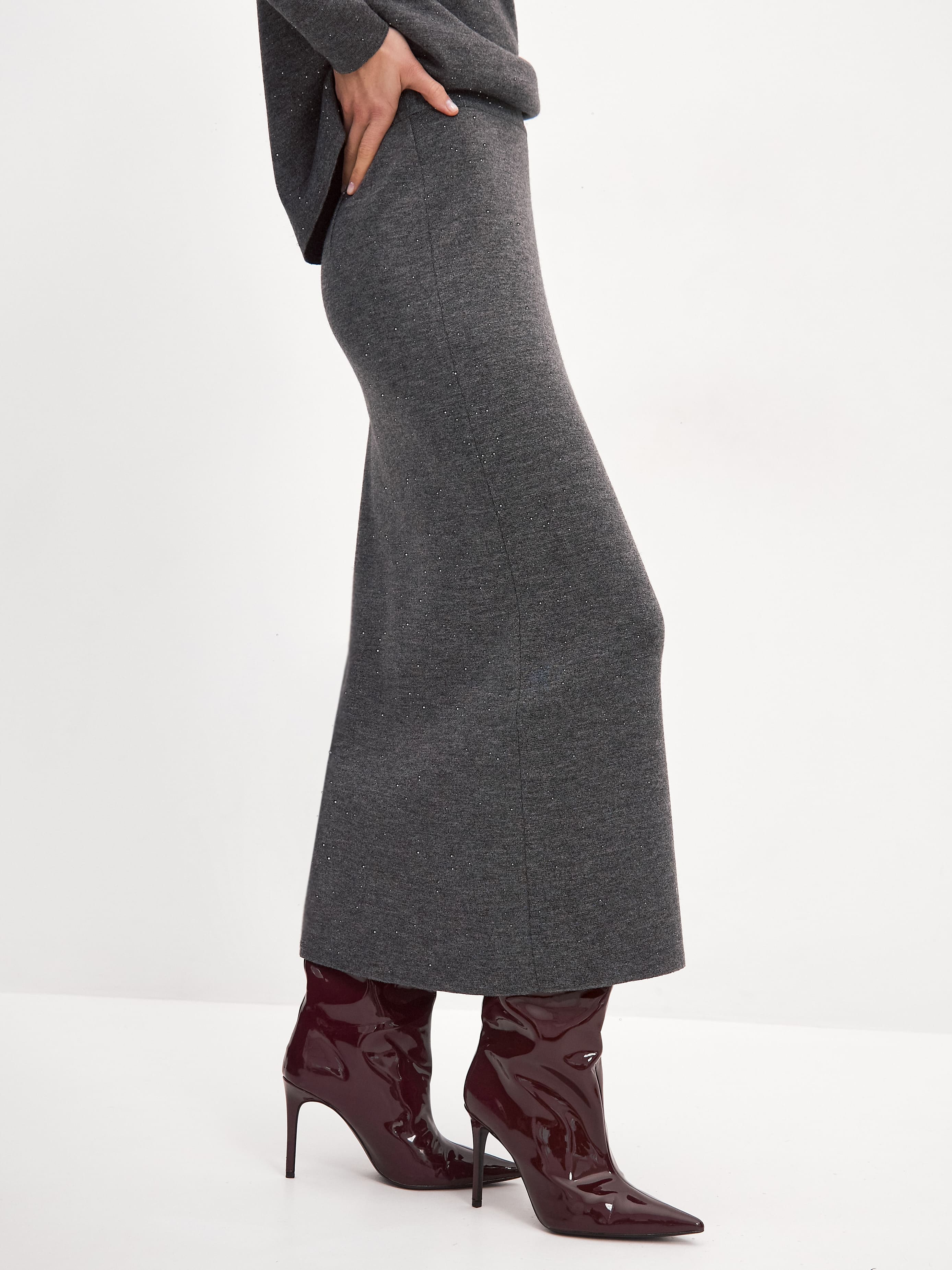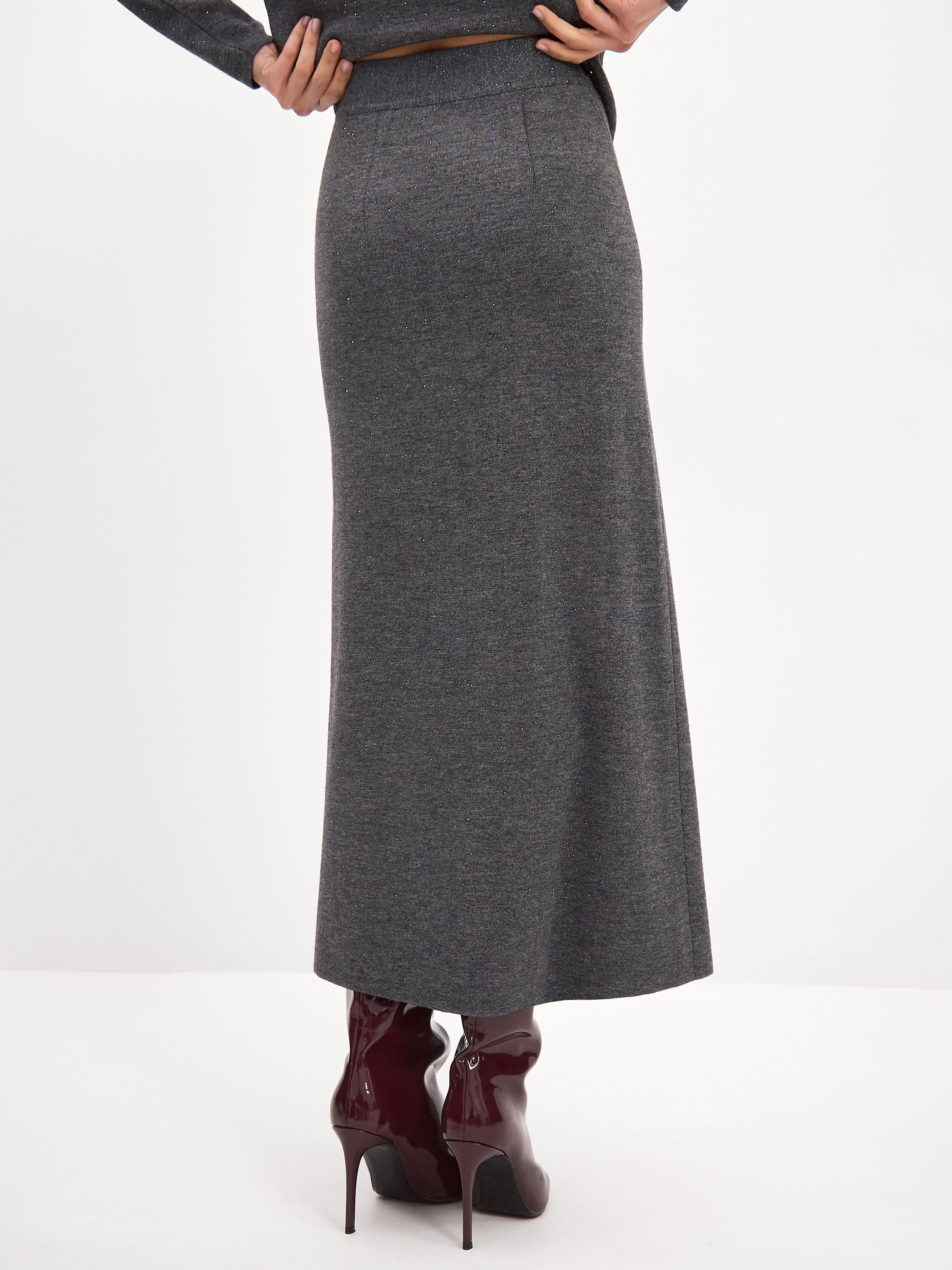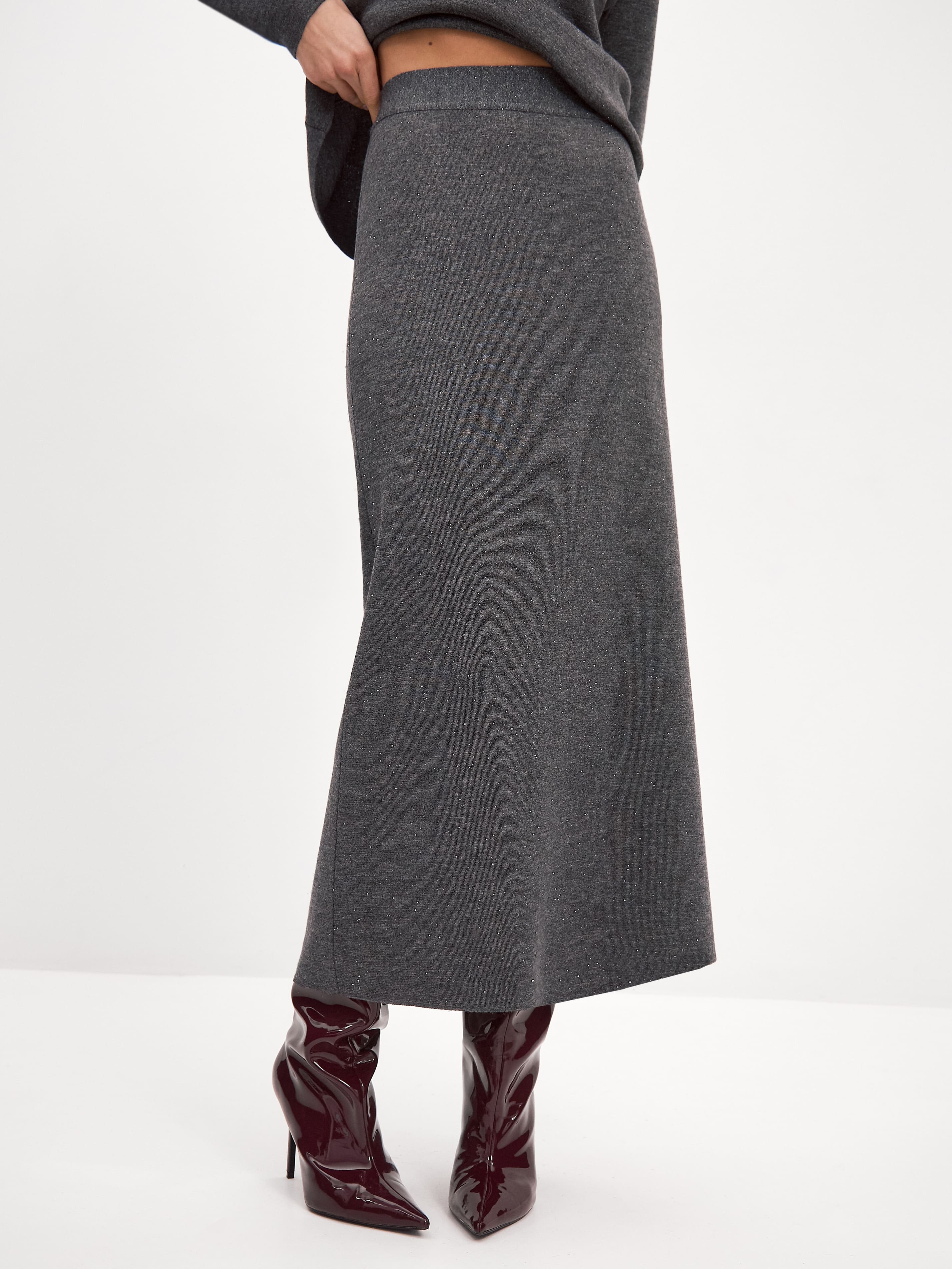 Теплая трикотажная юбка мидакси с мягким софт люрексом. Имеет слегка расширяющийся книзу силуэт и согревающую длину до щиколотки. Плотный шерстяной трикотаж юбки надежно защищает от низких температур и ветра, но при этом полноценно дышит в помещении. Интегрированный в вязаное полотно люрекс – отличный компаньон для запоминающихся вечерних образов. Его металлизированная нить очень пластичная и комфортная: не колется, не усиливает жесткость трикотажа, не теряет свое сияние после стирки изделия.