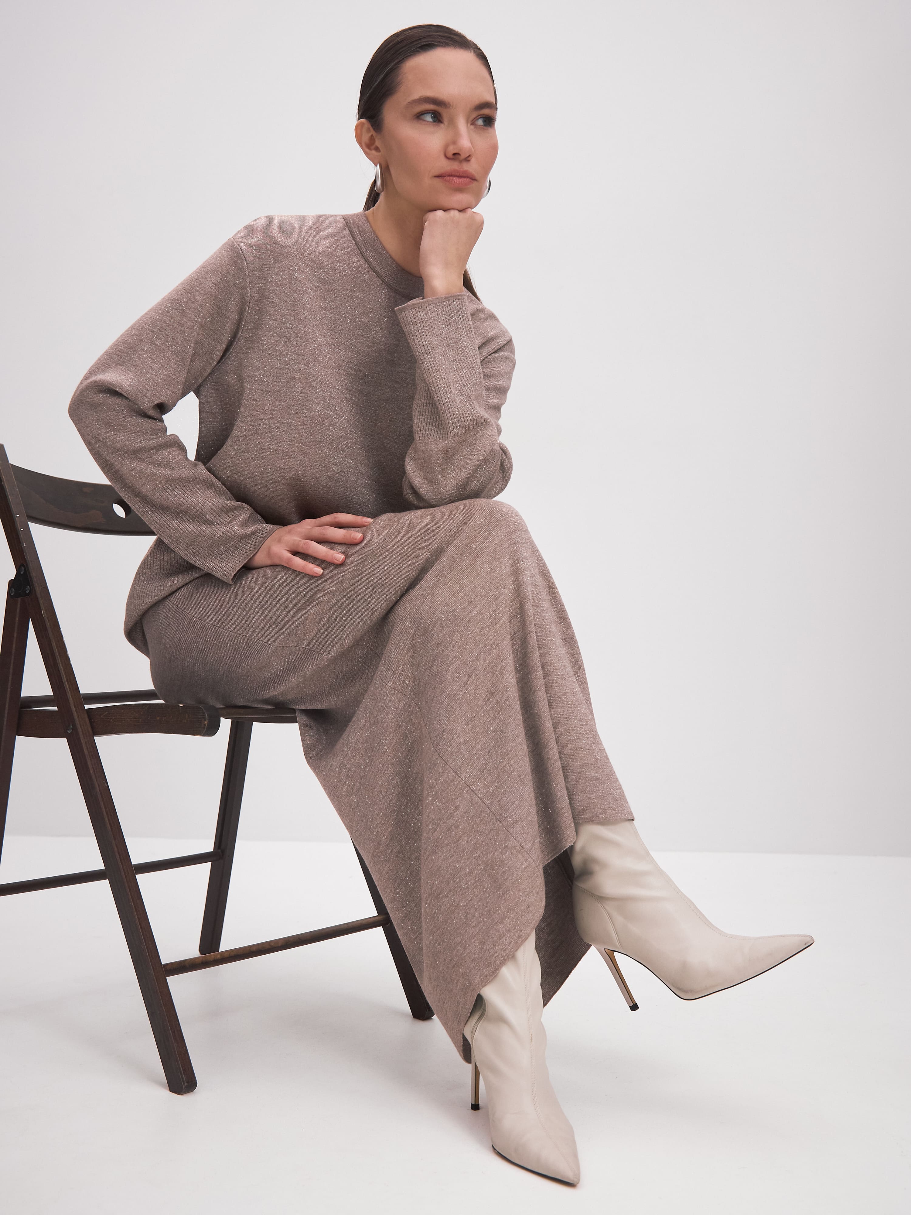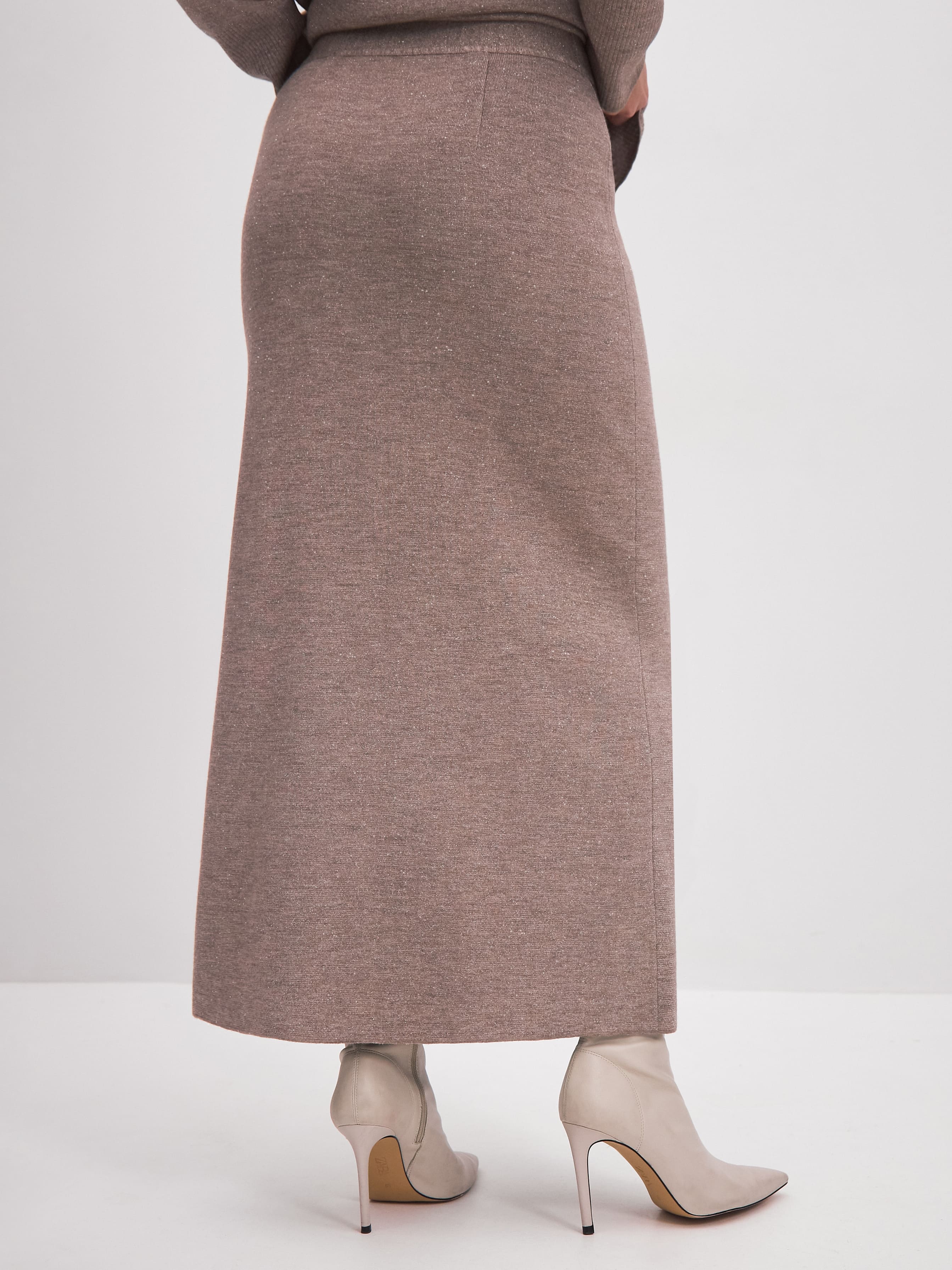 Теплая трикотажная юбка мидакси с мягким софт люрексом. Имеет слегка расширяющийся книзу силуэт и согревающую длину до щиколотки. Плотный шерстяной трикотаж юбки надежно защищает от низких температур и ветра, но при этом полноценно дышит в помещении. Интегрированный в вязаное полотно люрекс – отличный компаньон для запоминающихся вечерних образов. Его металлизированная нить очень пластичная и комфортная: не колется, не усиливает жесткость трикотажа, не теряет свое сияние после стирки изделия.