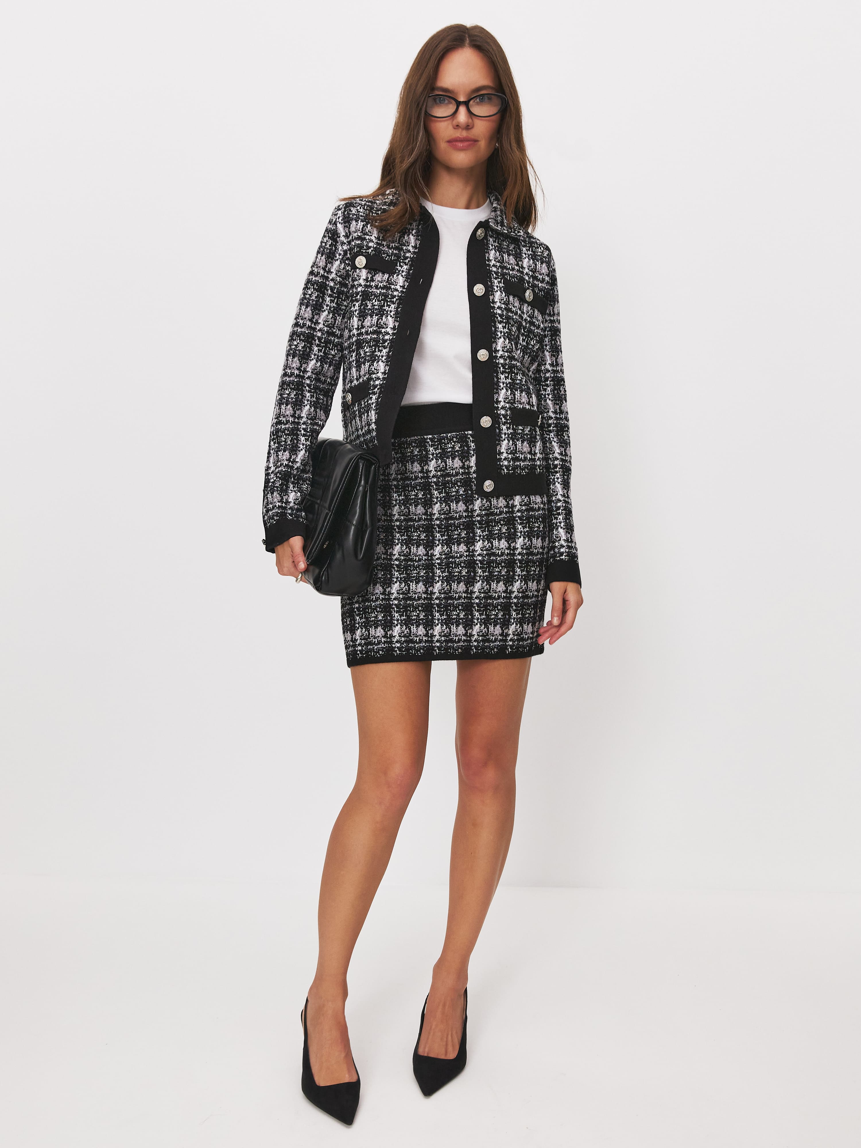 Мини из вязаного трикотажа по мотивам легендарных коллекций Шанель из букле. Однотонные пояс и отделка низа служат зонами контраста. Обратите внимание – расцветка вязаного полотна имитирует фактуру букле, при этом сам трикотаж остается гладким. Соблазнительная мини длина и облегающий крой снижают градус формальности изделия: в юбке в стиле Шанель по-прежнему можно в офис и на собеседование, но лучше – на свидание!