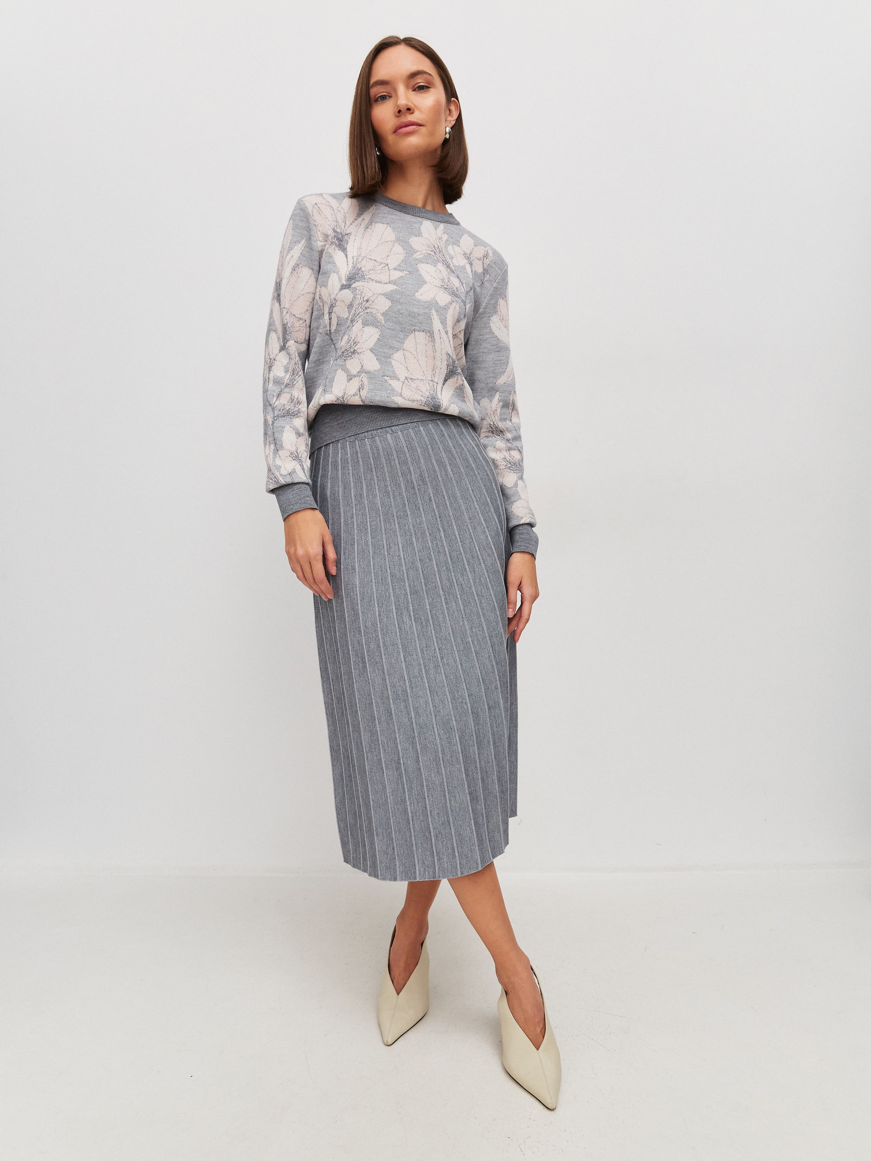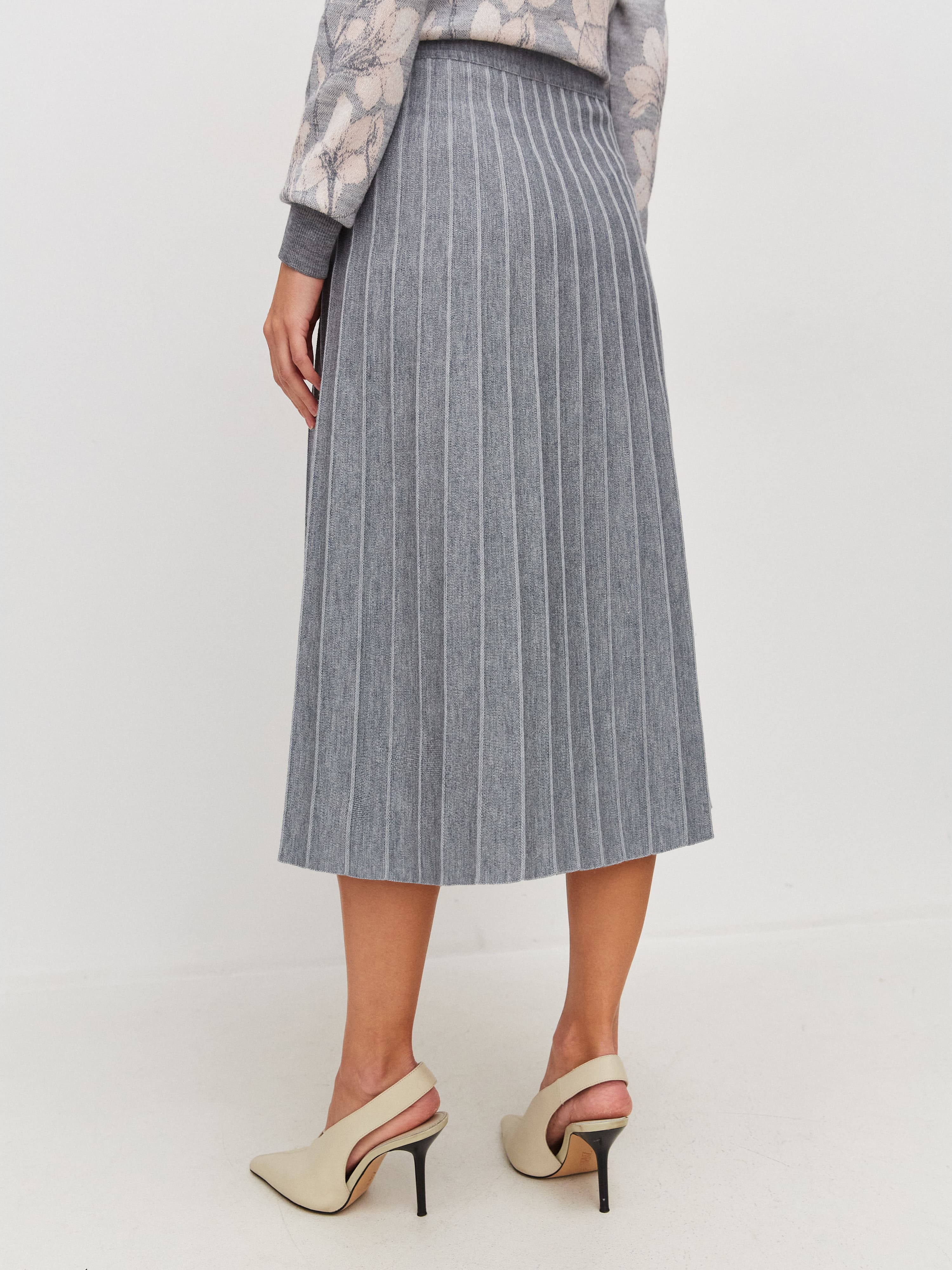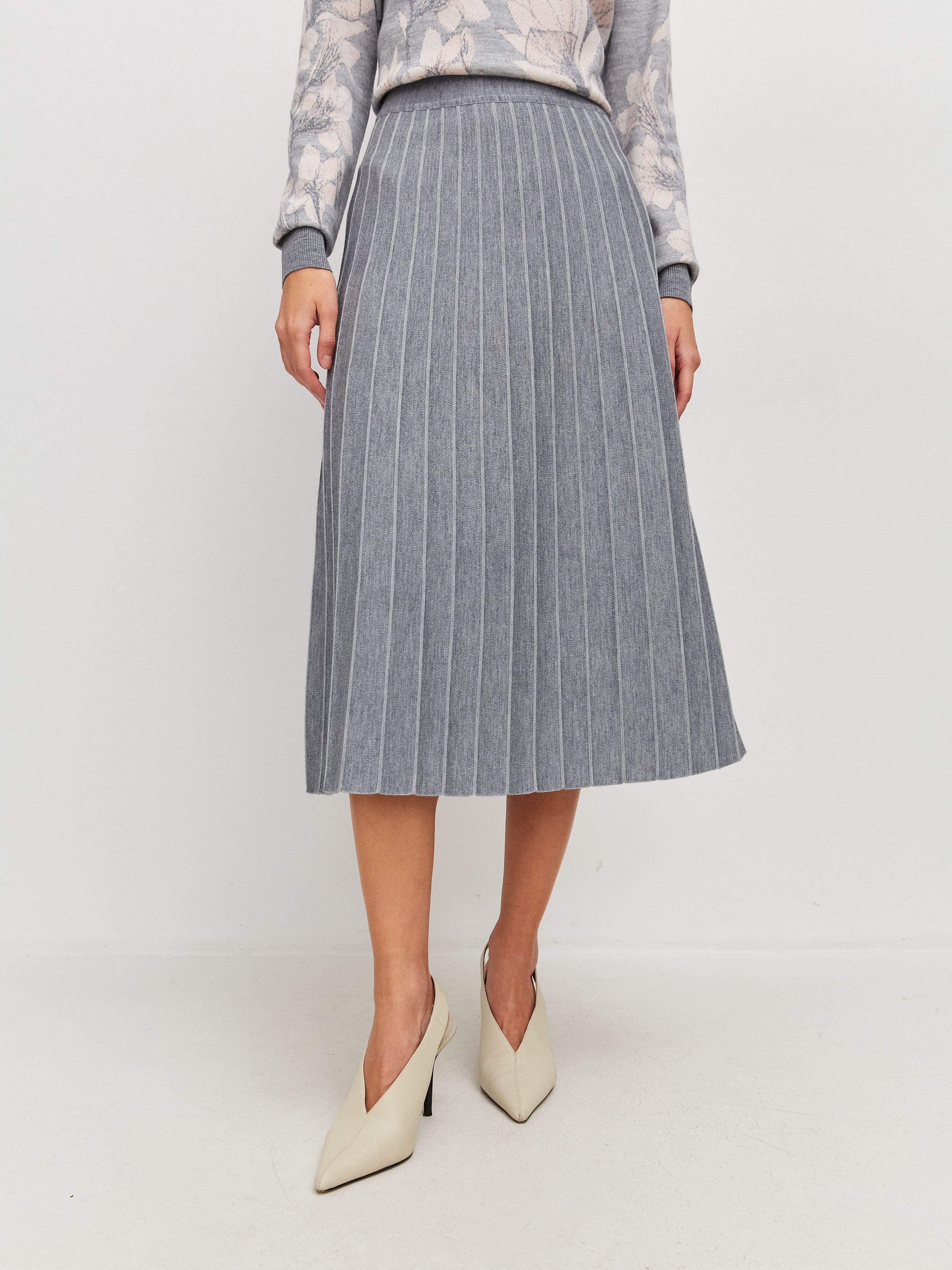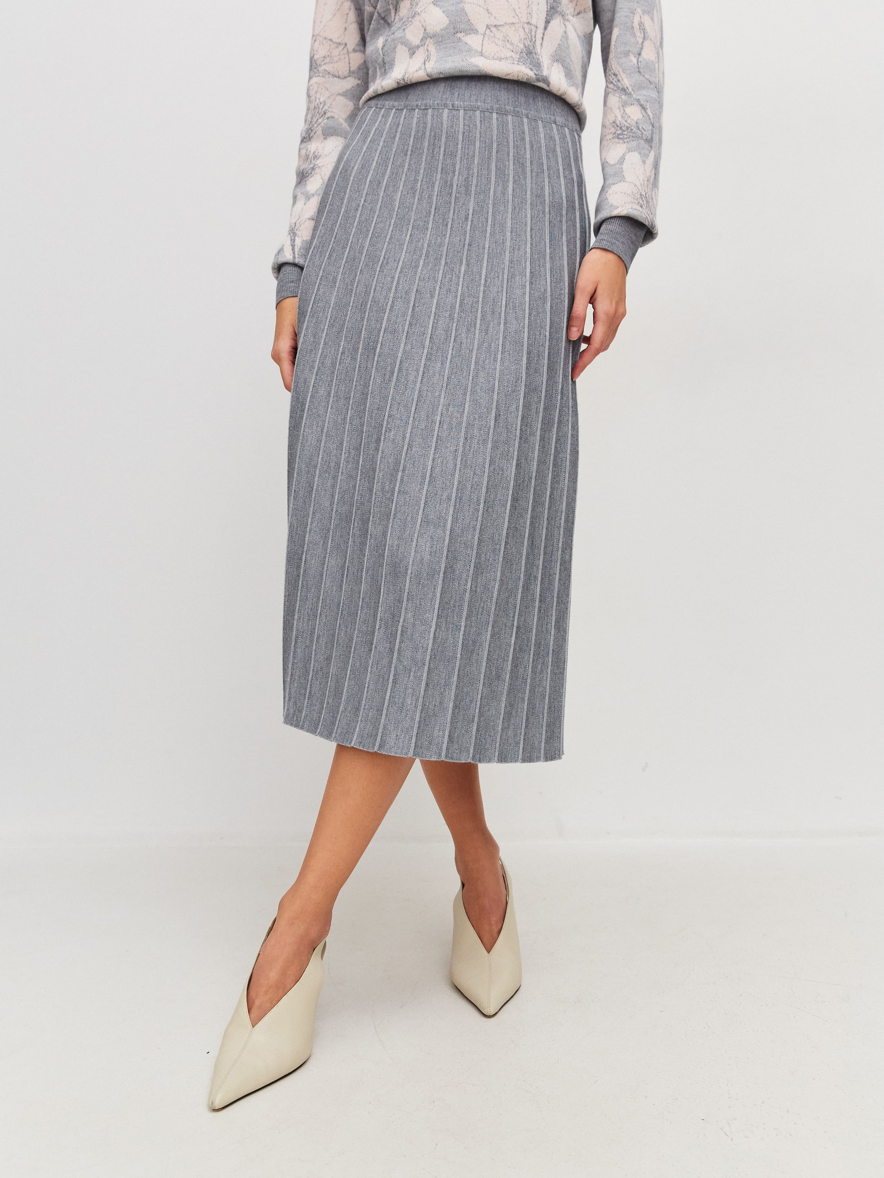 Аккуратный вязаный рисунок этой юбки является великолепно выполненной техникой вязания с имитацией плиссировки. Мы рекомендуем к ней в пару укороченные жакеты и кроп джемперы из осенне-зимней коллекции бренда. Они удачно уравновесят лук за счет контраста длины. Уютная мериносовая шерсть в составе хорошо хранит и долго не отдает тепло, что превращает юбку в достойную альтернативу зимним брюкам.
