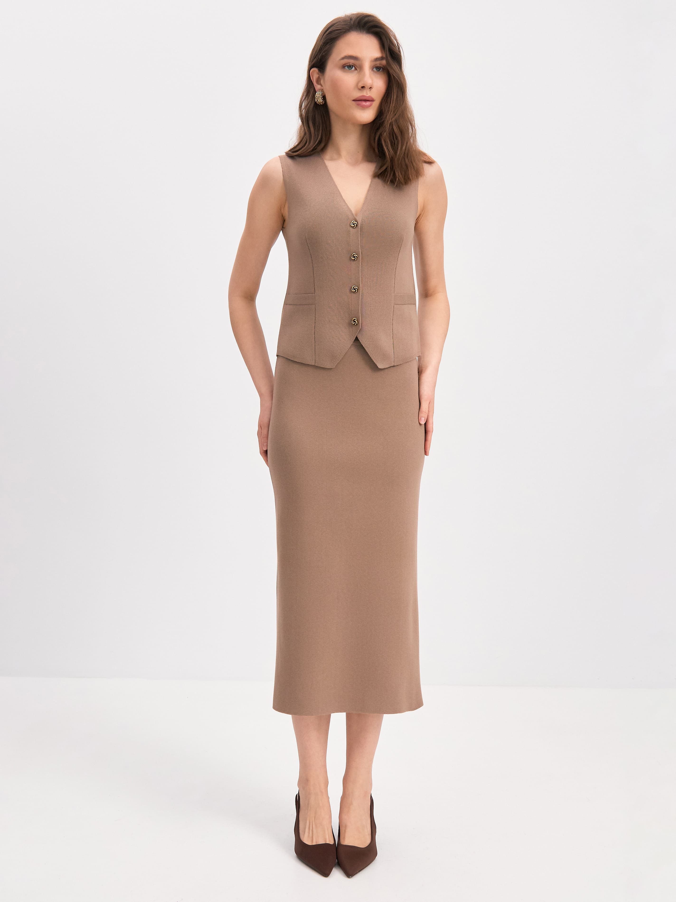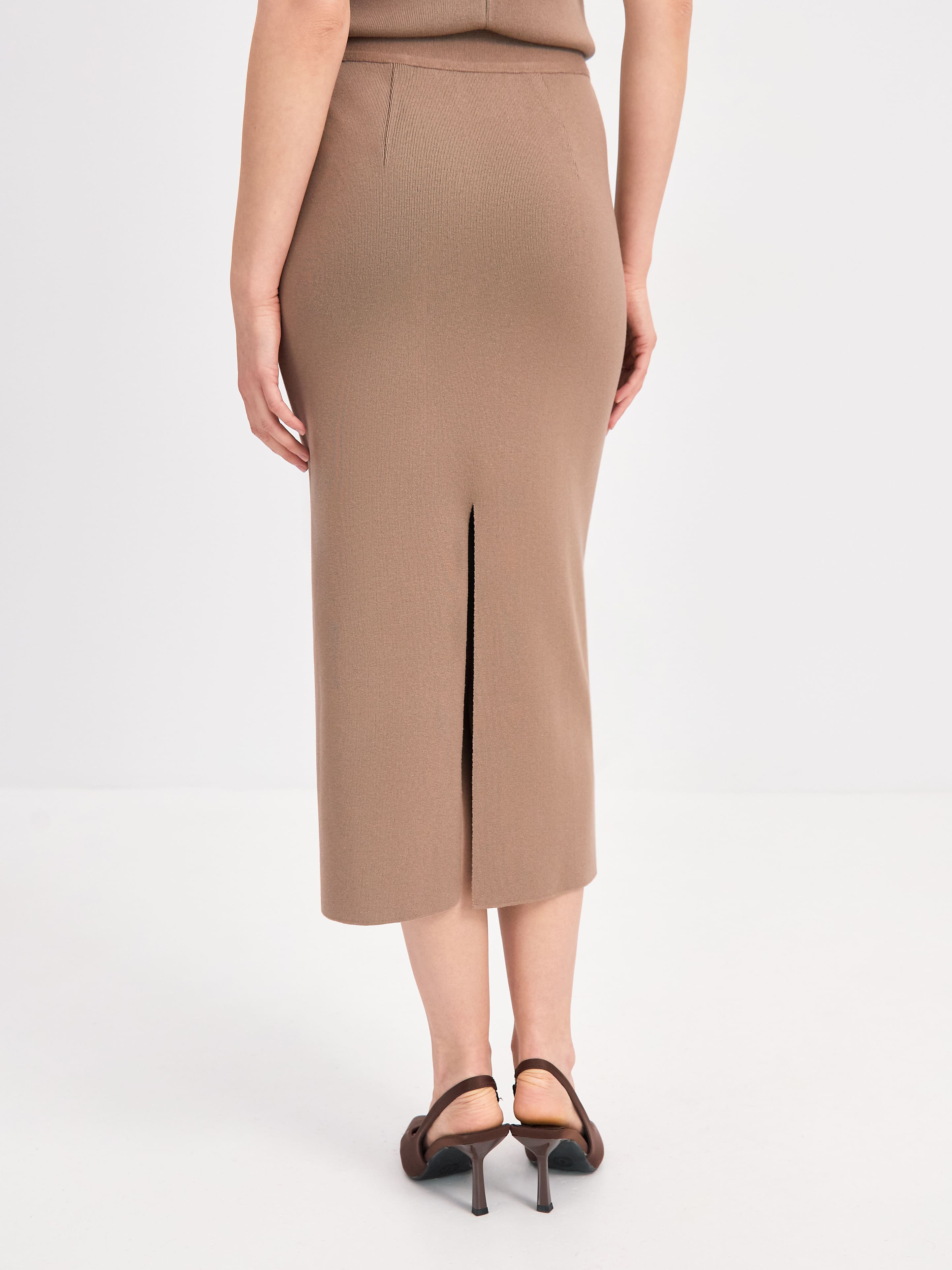 Лаконичное прямое миди с акцентным вырезом сзади – настоящая история соблазнения, воссозданная в премиум-трикотаже. Обладает уникальной способностью «собирать» силуэт – правильно очерчивает контуры, но не облегает больше, чем это необходимо. Глубина выреза и слегка зауженный крой мотивируют на «подиумную походку» и эксперименты с вечерними тотал луками. Трикотаж плотный, с 50% хлопка, сбалансированного вискозой для улучшения воздухопроницаемости полотна.