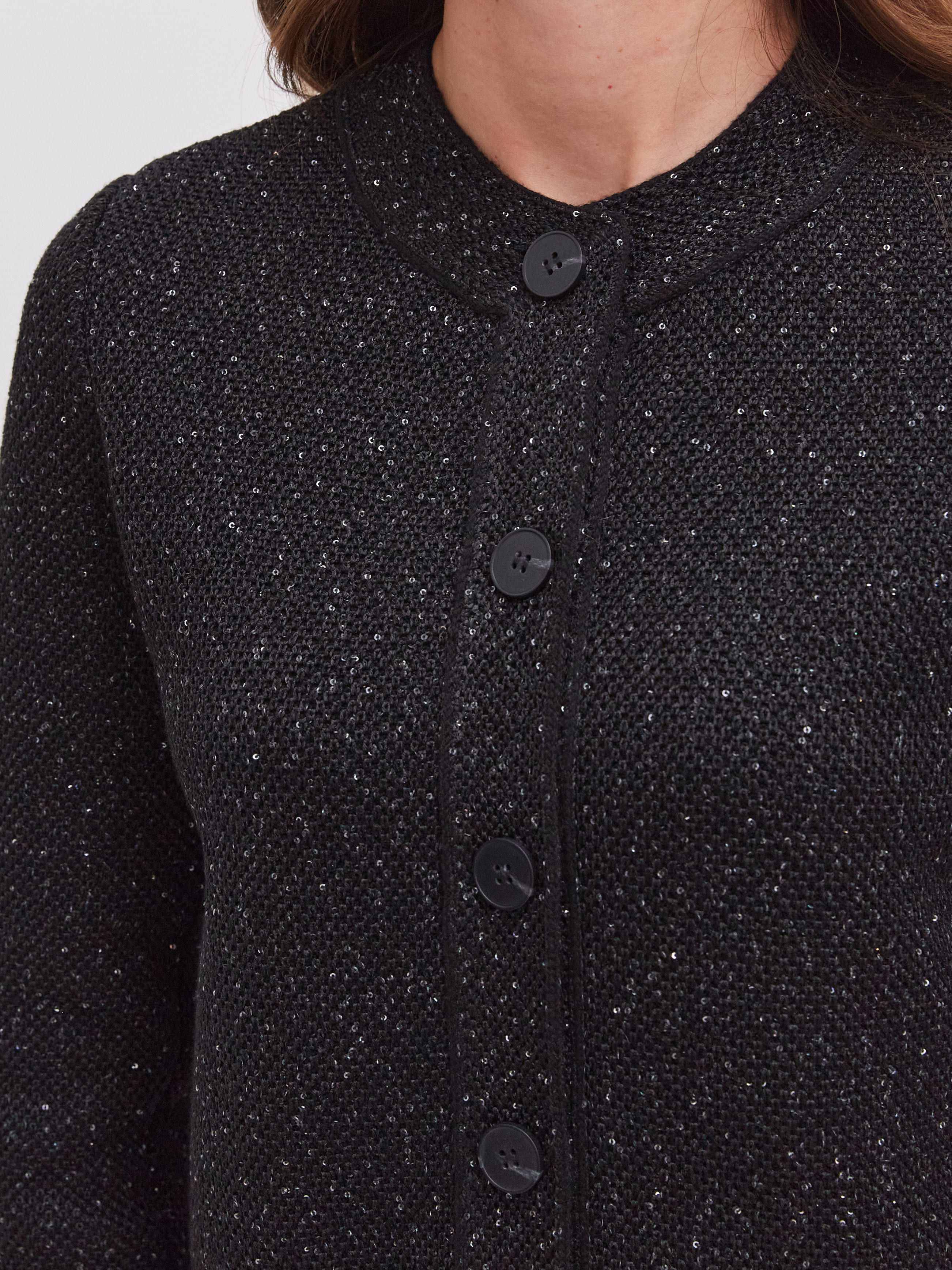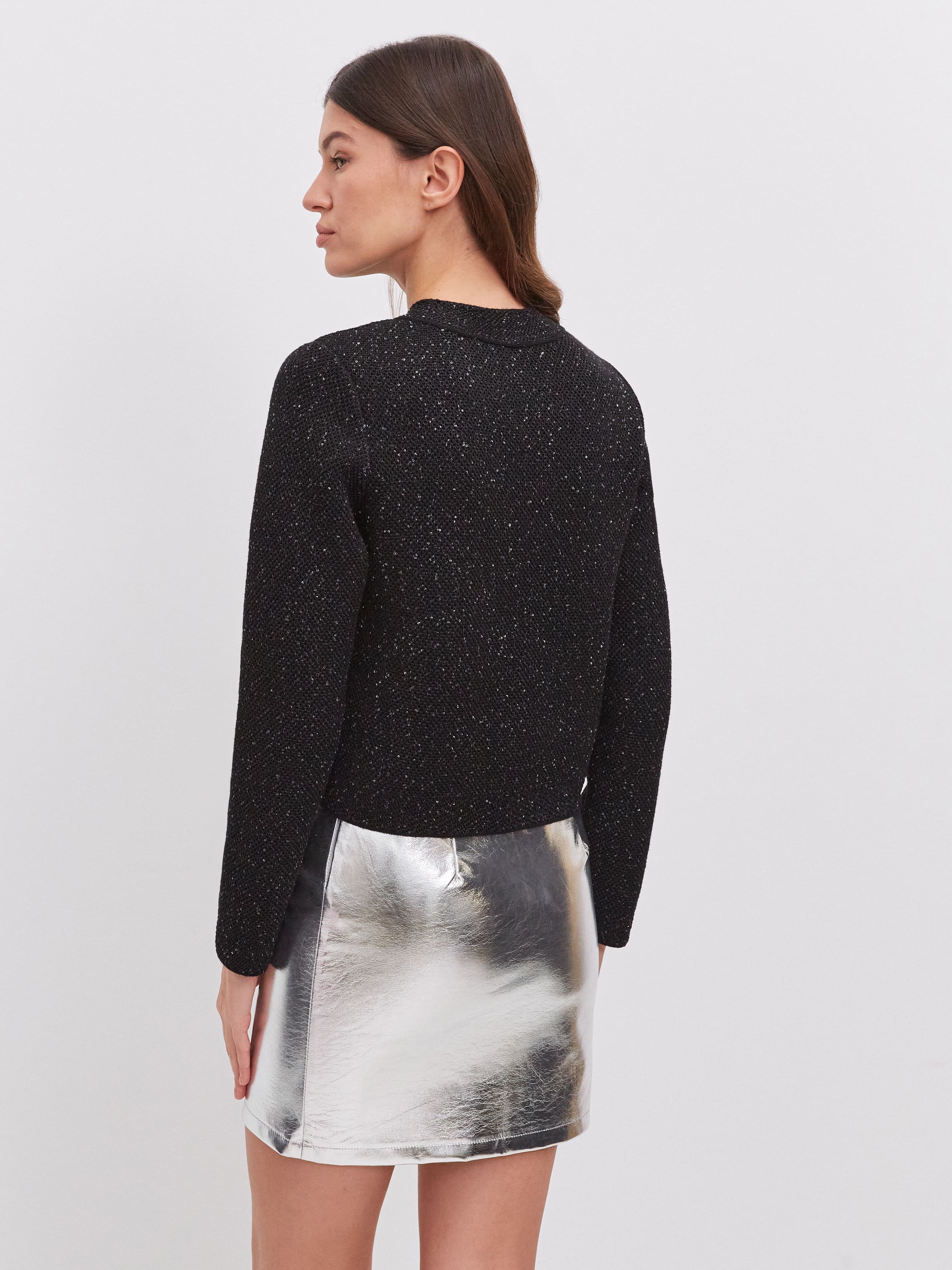 Укороченная длина, гламурный блеск пайеток и необычная «кольчужная» текстура превращают этот кроп жакет в ключевой акцент гардероба. Модель одинаково уместна и в качестве дополнения к вечернему платью, и как самостоятельная единица образа. Комбинирование мягкого хлопка и вискозы сделало жакет еще более тактильным.