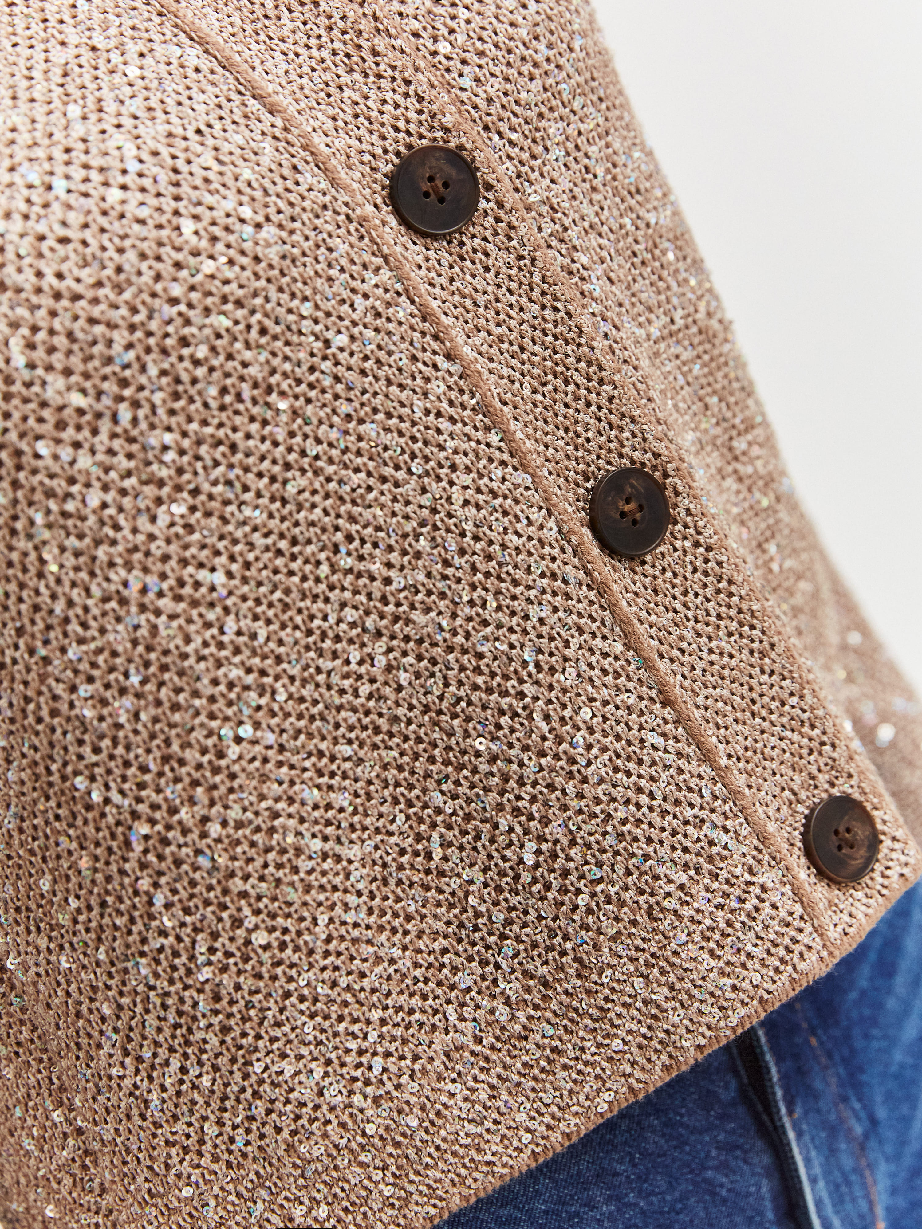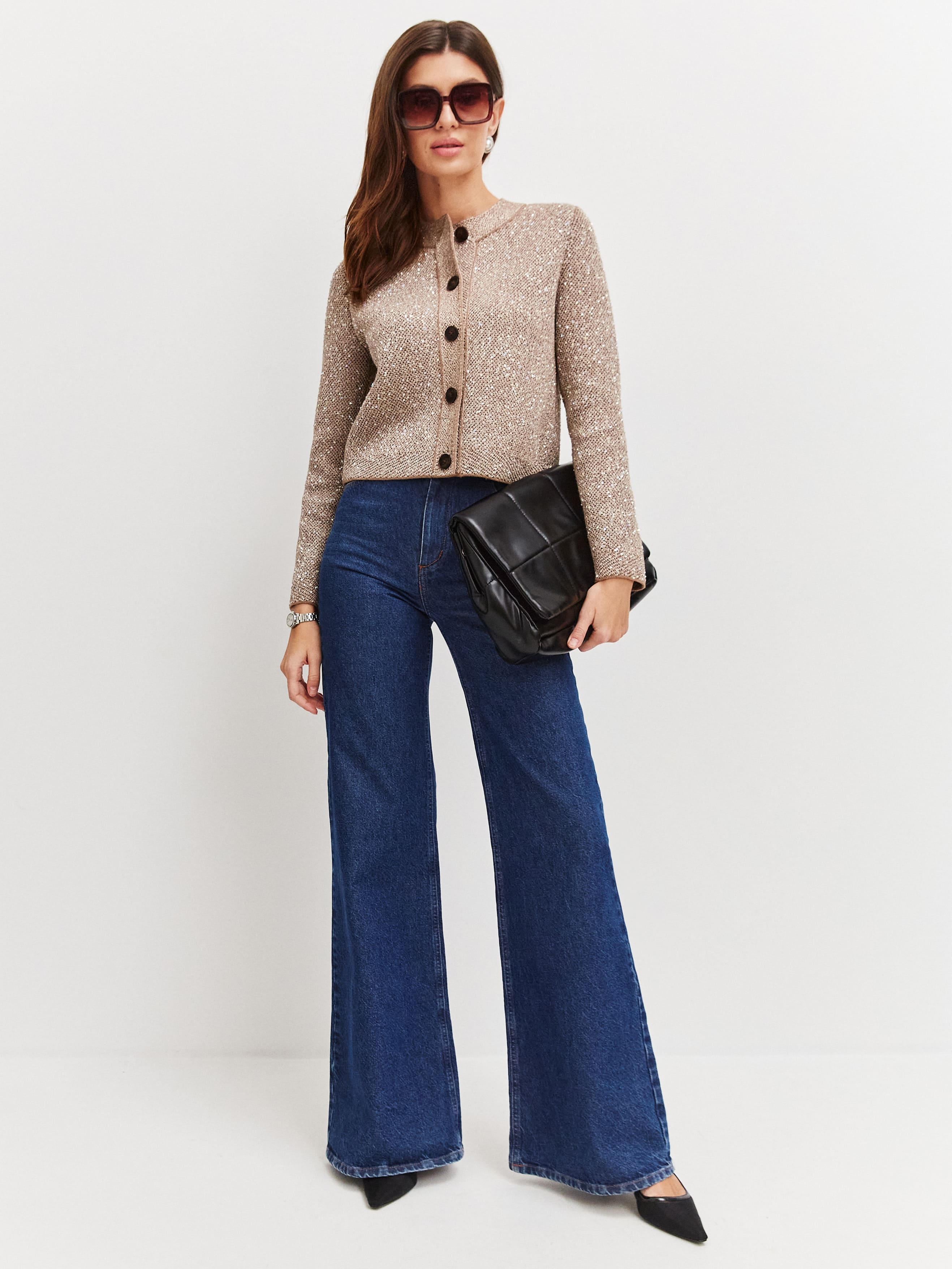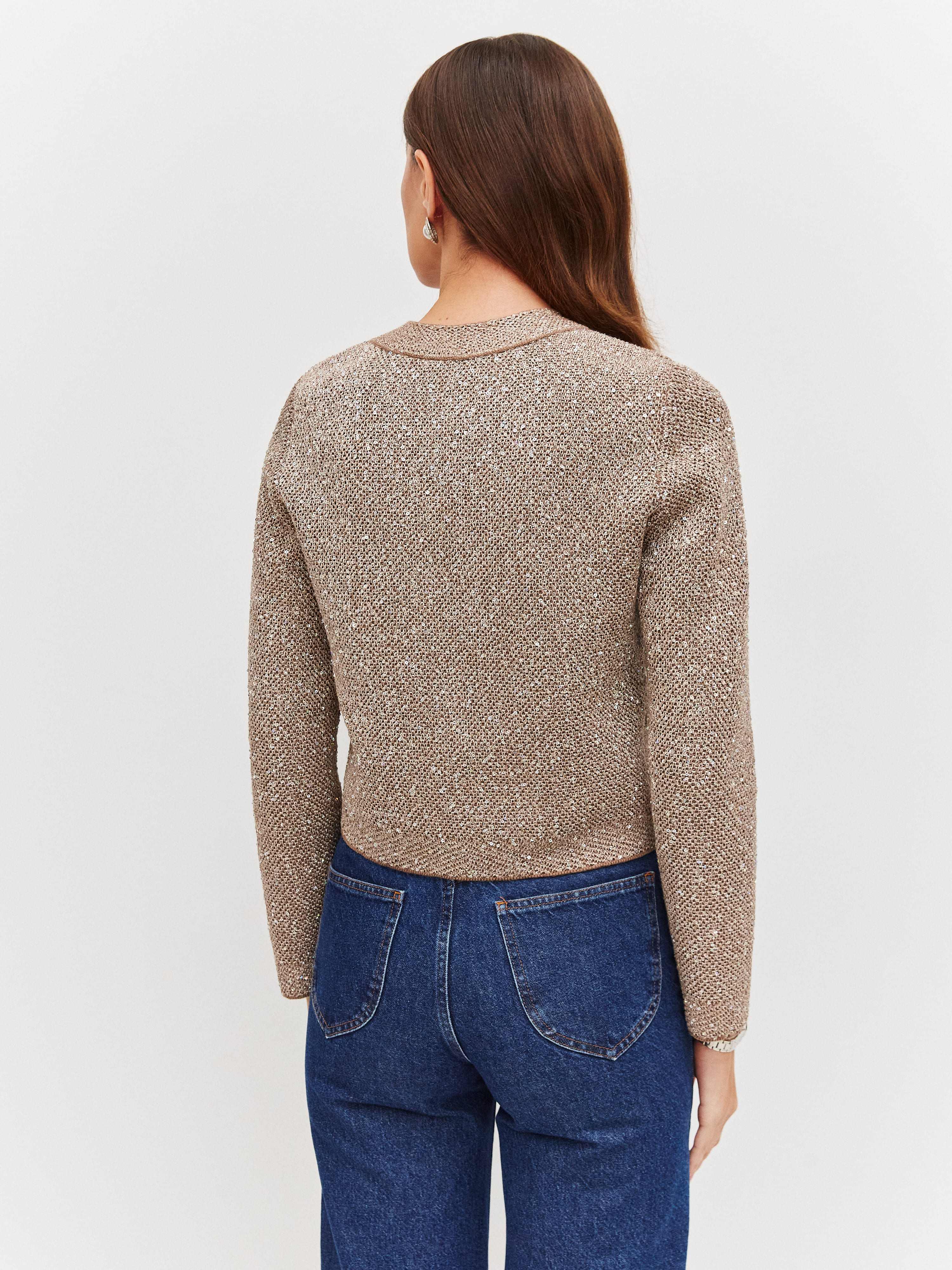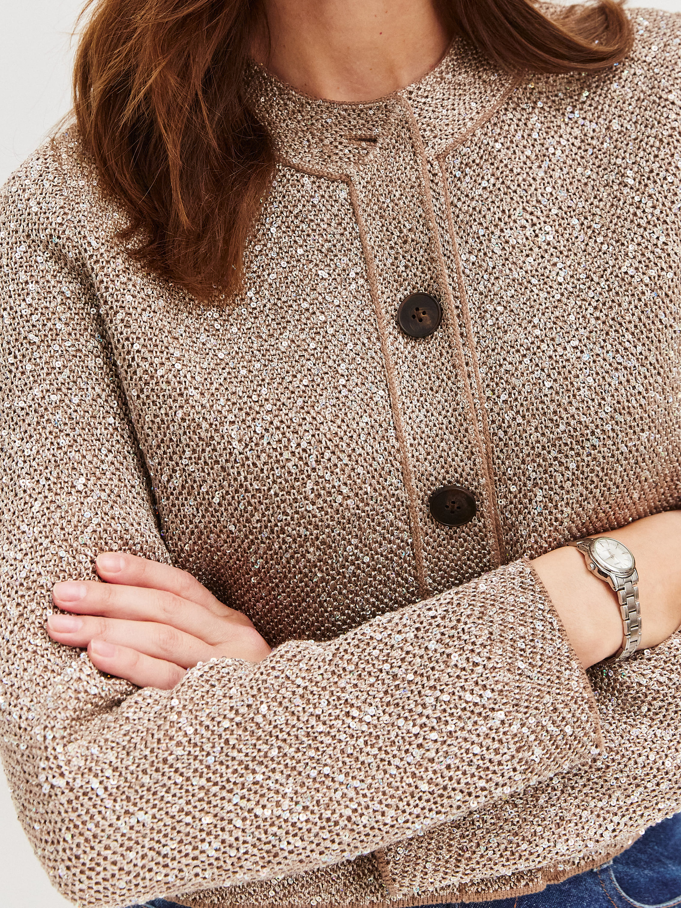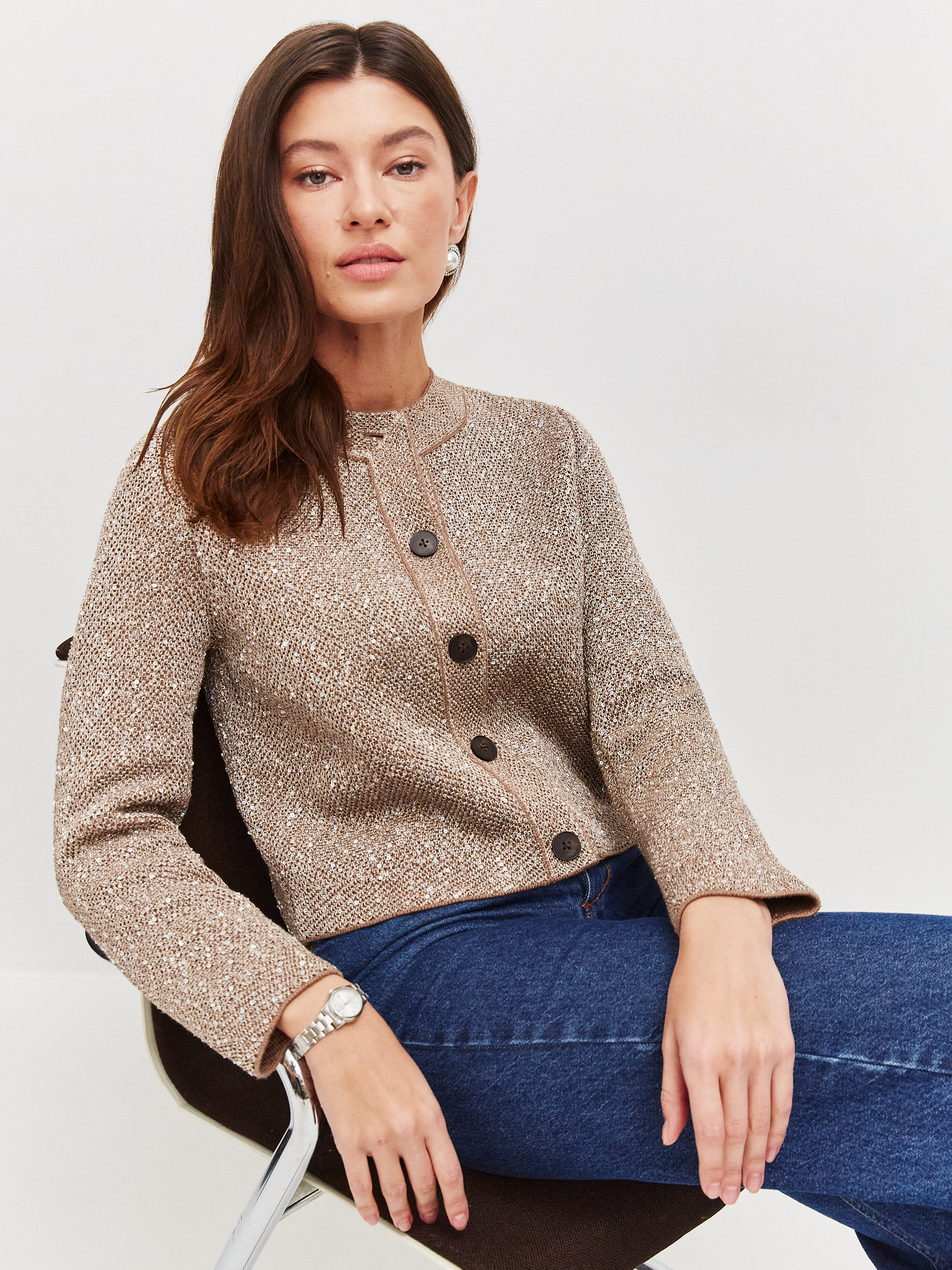 Укороченная длина, гламурный блеск пайеток и необычная «кольчужная» текстура превращают этот кроп жакет в ключевой акцент гардероба. Модель одинаково уместна и в качестве дополнения к вечернему платью, и как самостоятельная единица образа. Комбинирование мягкого хлопка и вискозы сделало жакет еще более тактильным.