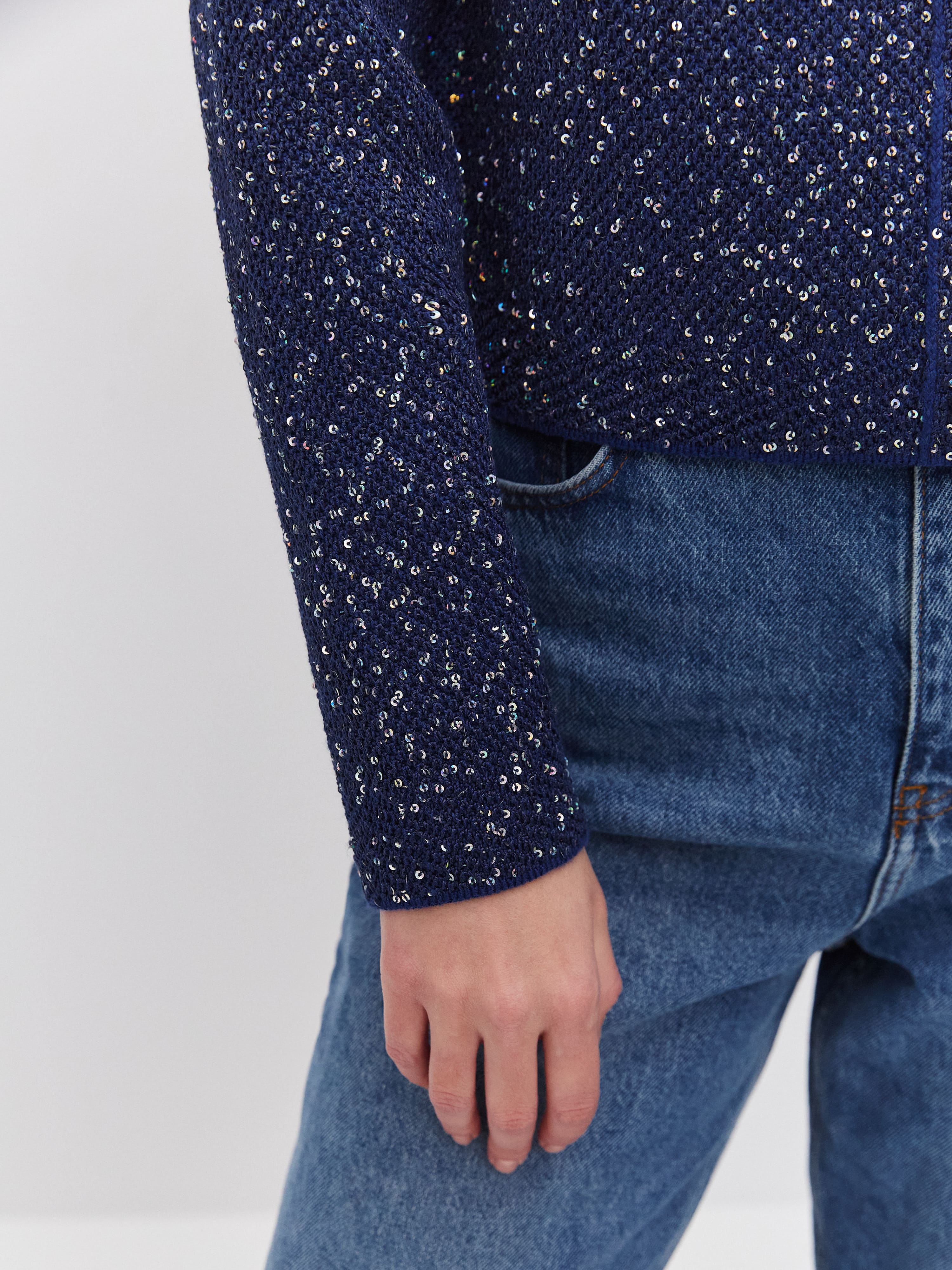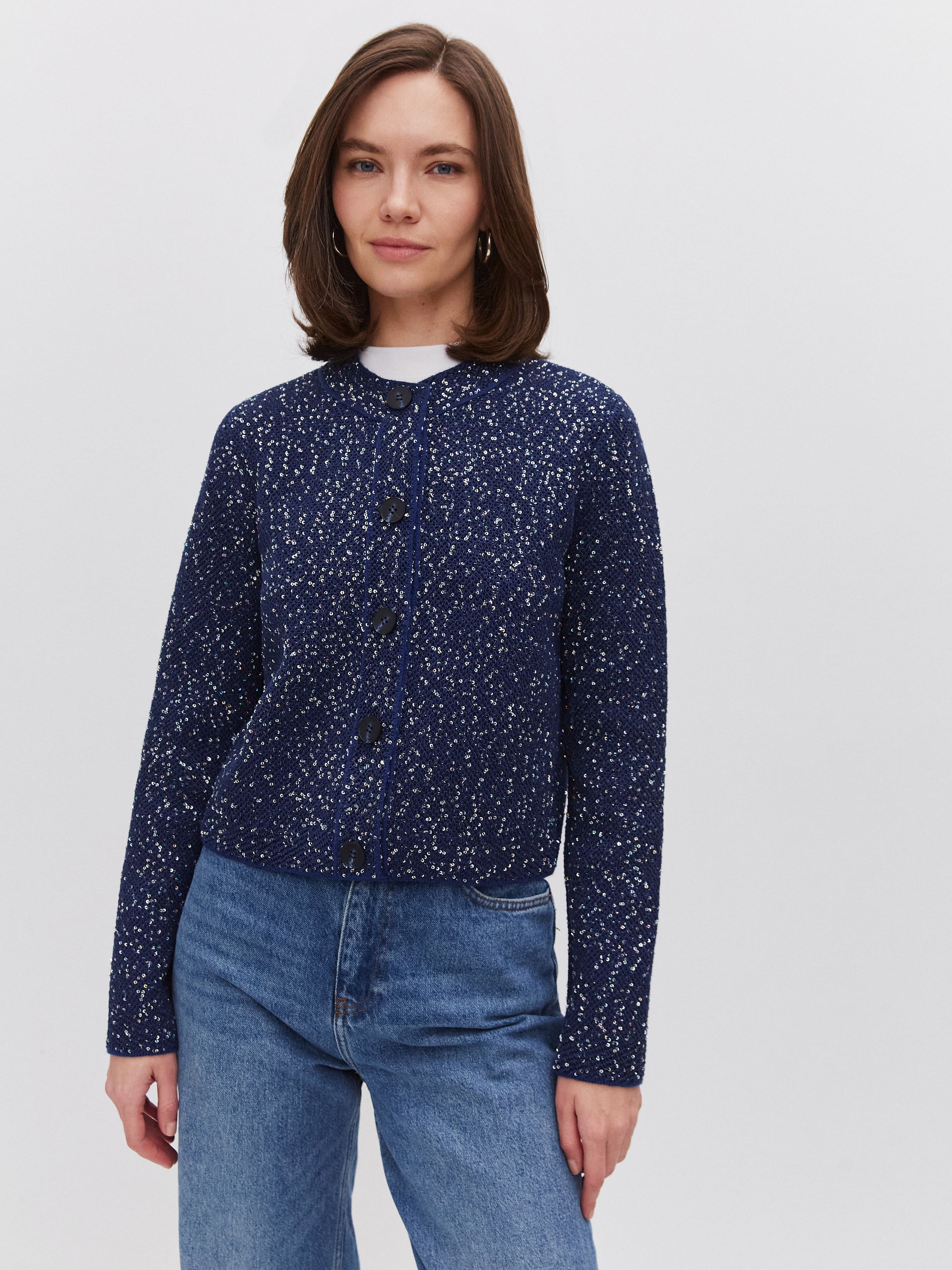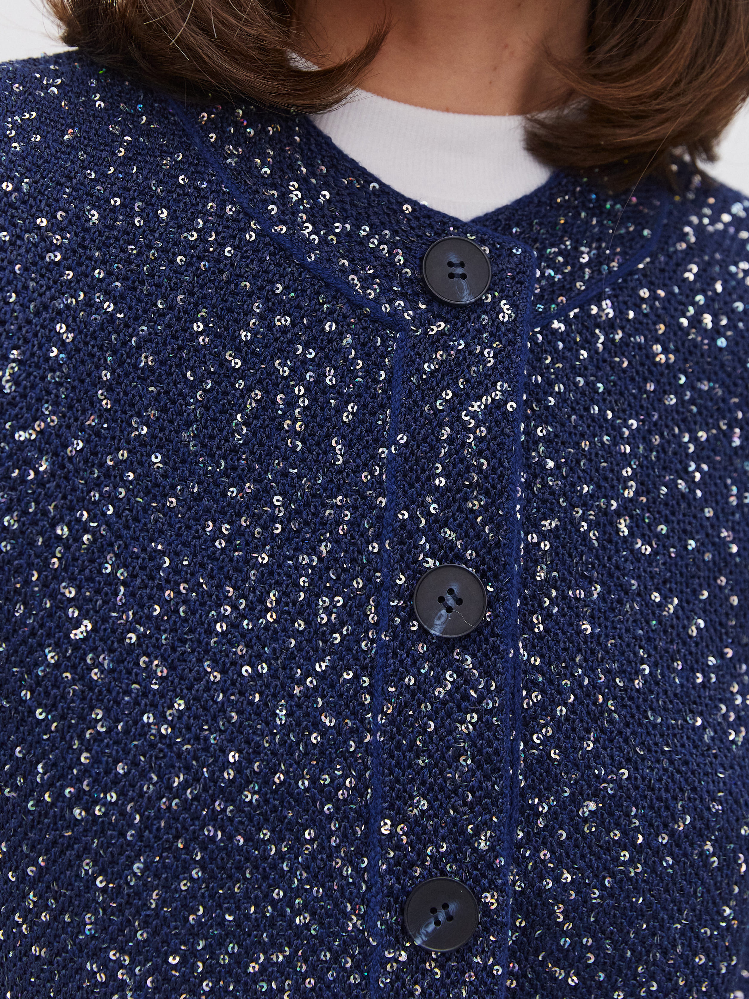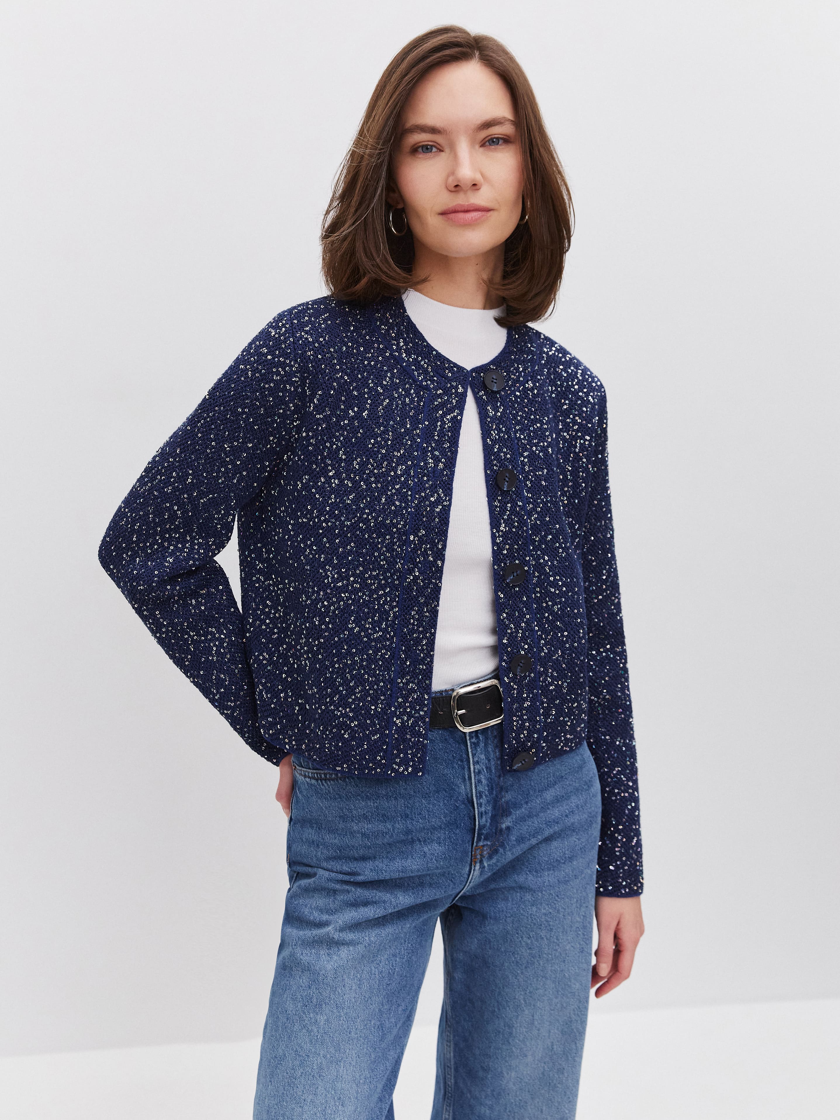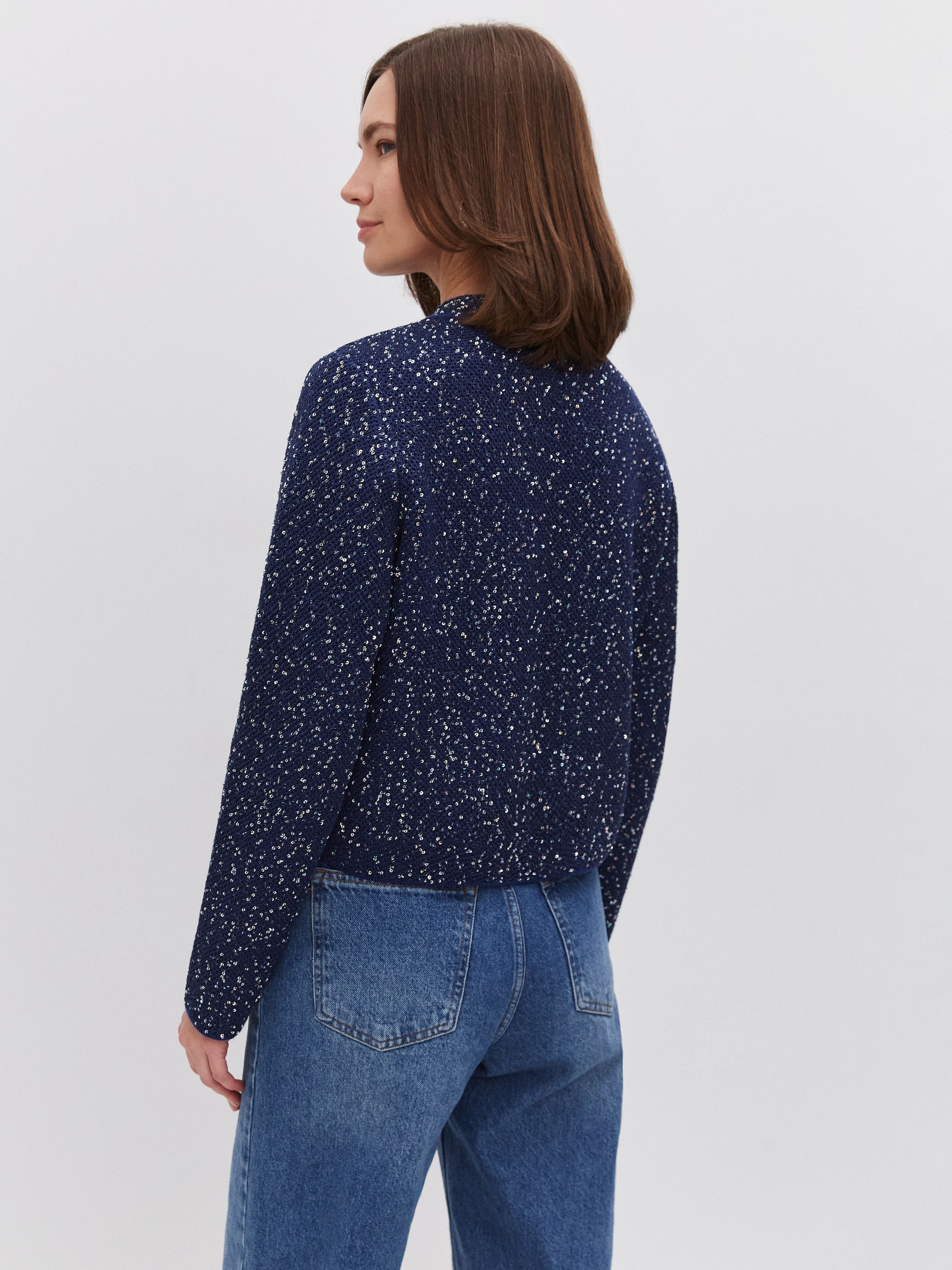 Укороченная длина, гламурный блеск пайеток и необычная «кольчужная» текстура превращают этот кроп жакет в ключевой акцент гардероба. Модель одинаково уместна и в качестве дополнения к вечернему платью, и как самостоятельная единица образа. Комбинирование мягкого хлопка и вискозы сделало жакет еще более тактильным.