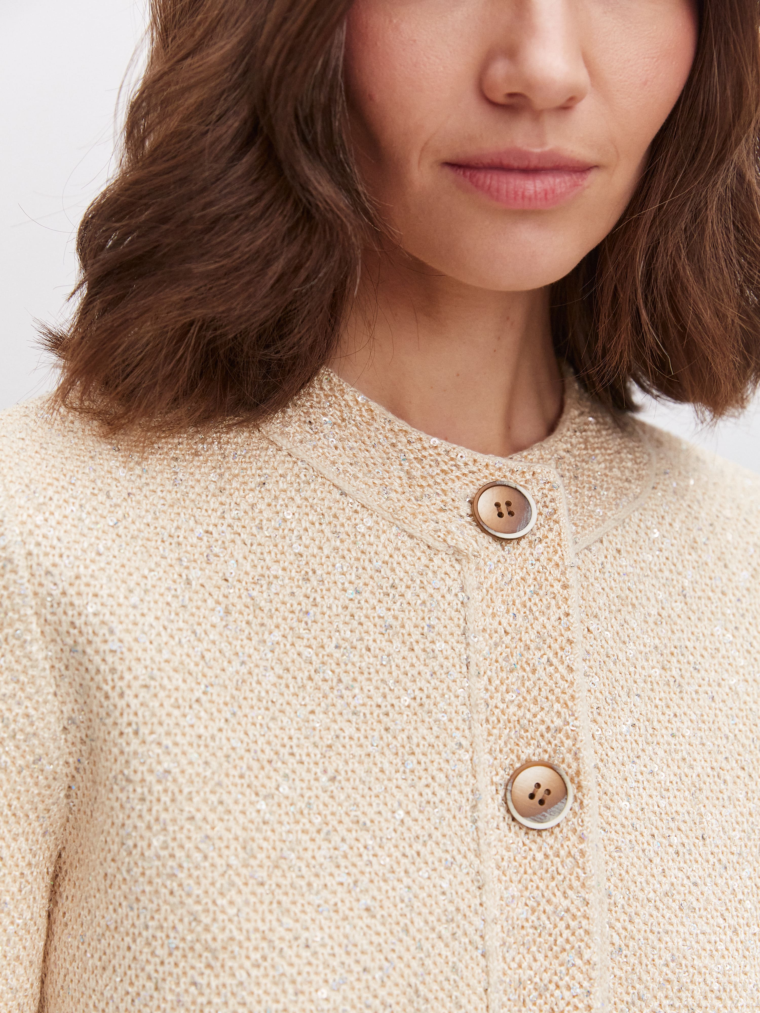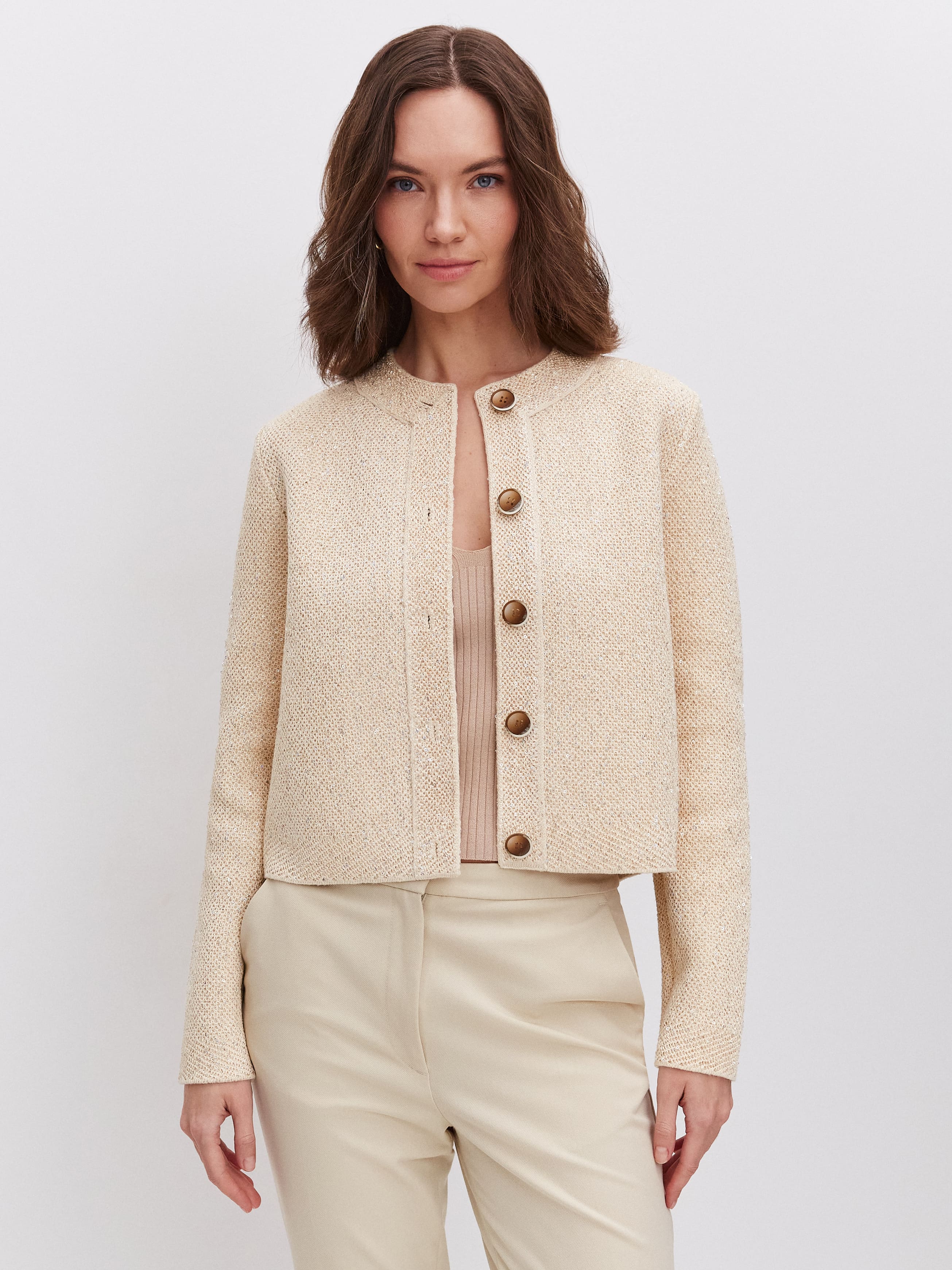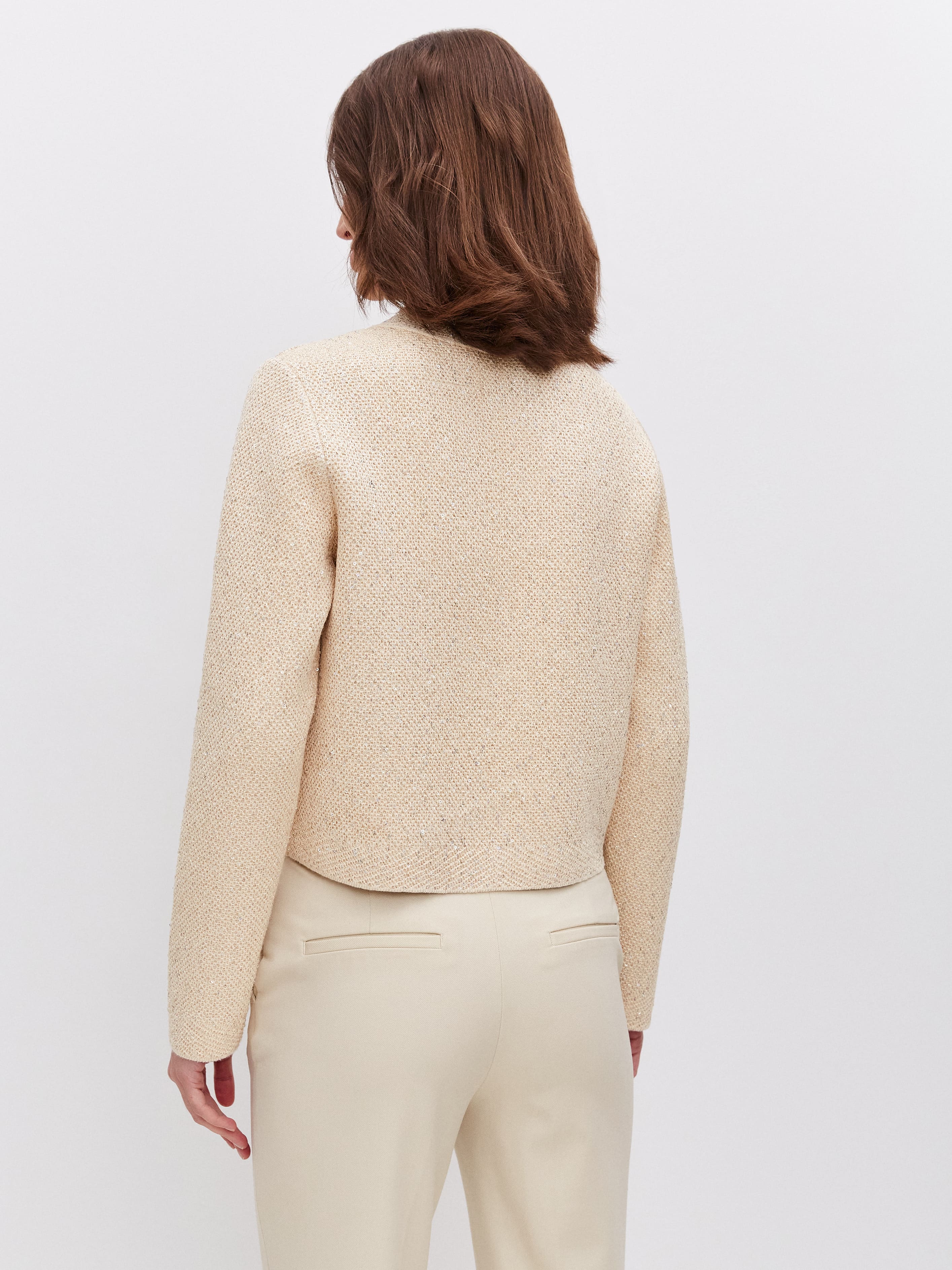 Укороченная длина, гламурный блеск пайеток и необычная «кольчужная» текстура превращают этот кроп жакет в ключевой акцент гардероба. Модель одинаково уместна и в качестве дополнения к вечернему платью, и как самостоятельная единица образа. Комбинирование мягкого хлопка и вискозы сделало жакет еще более тактильным.