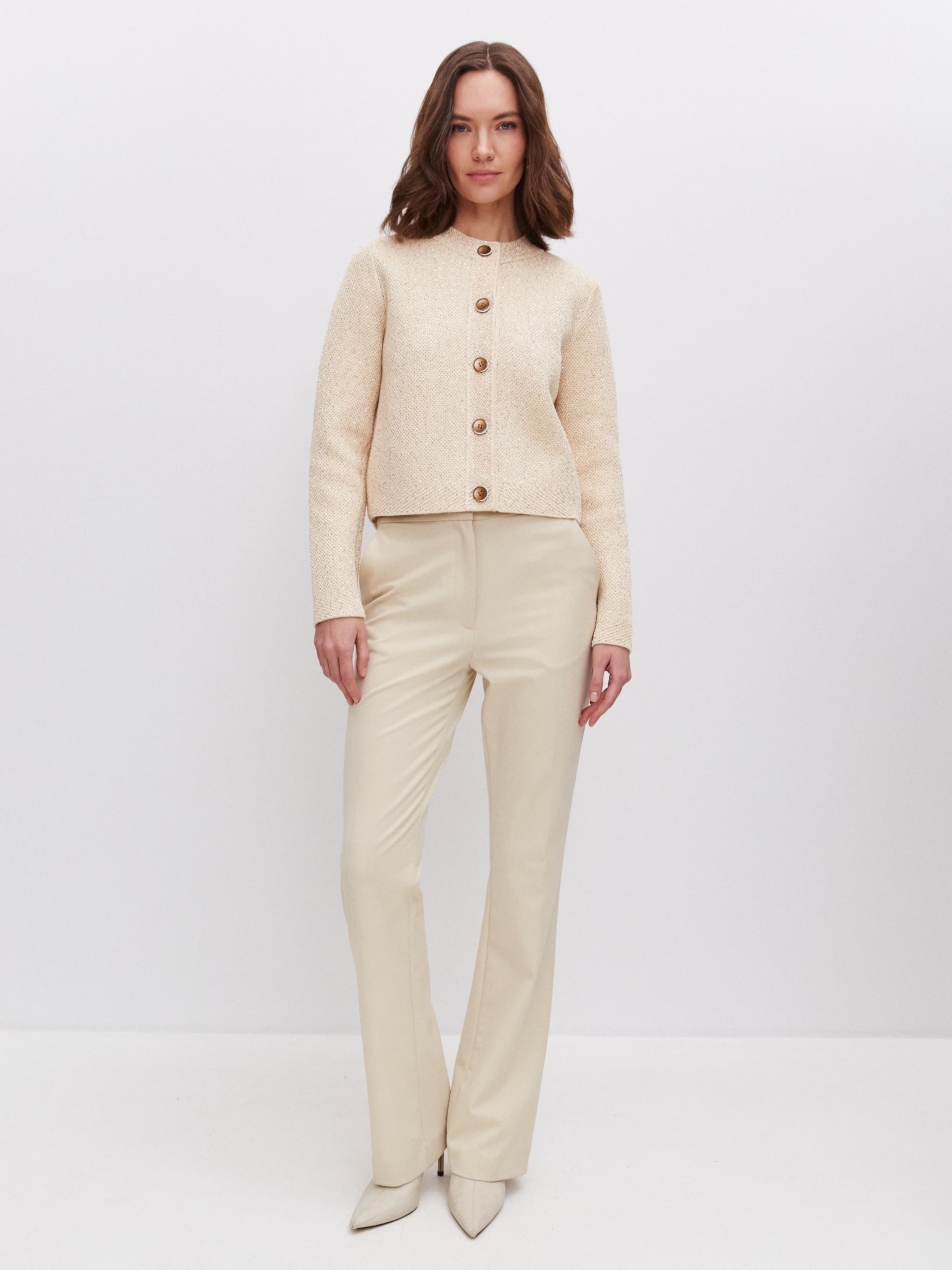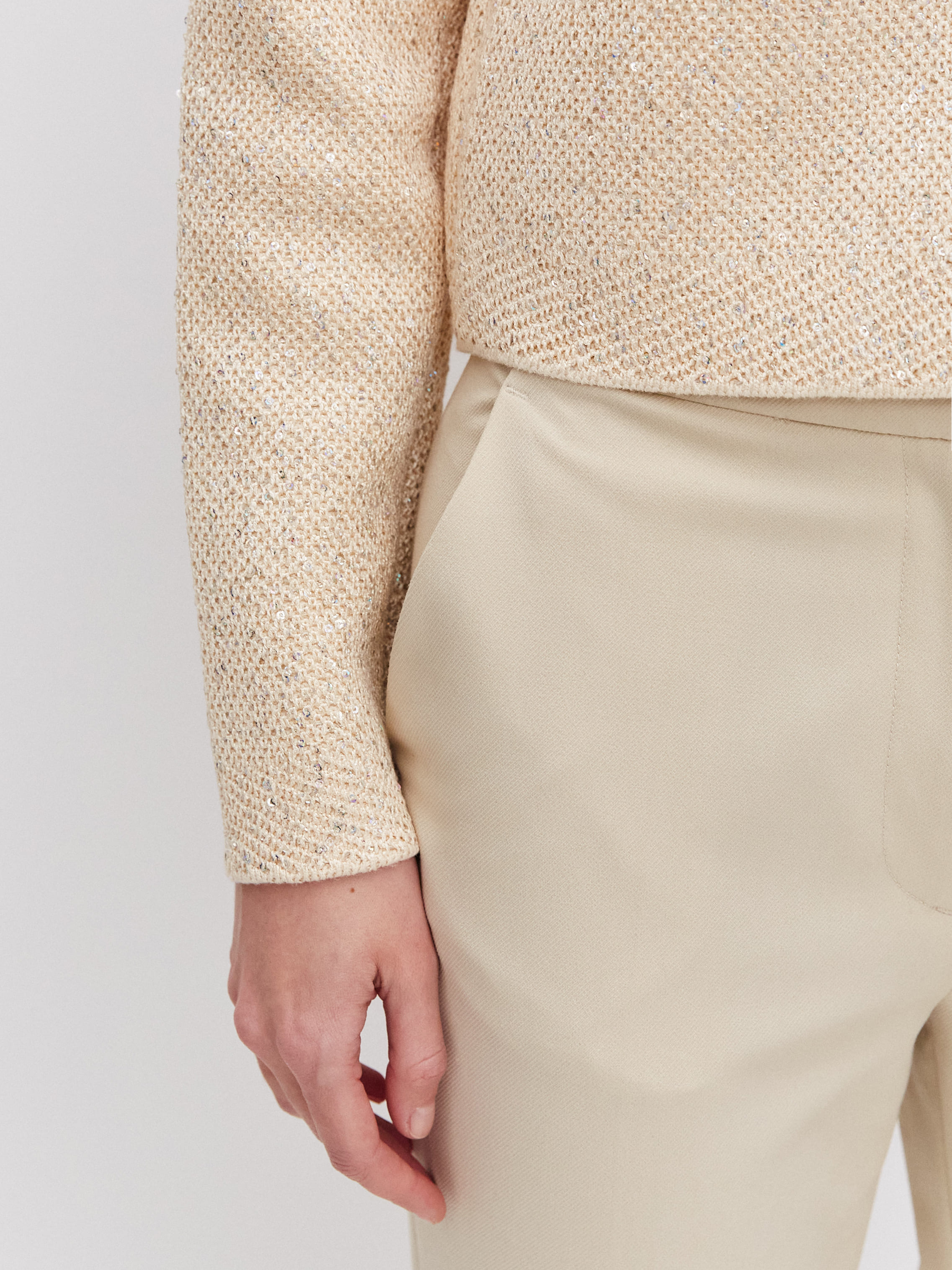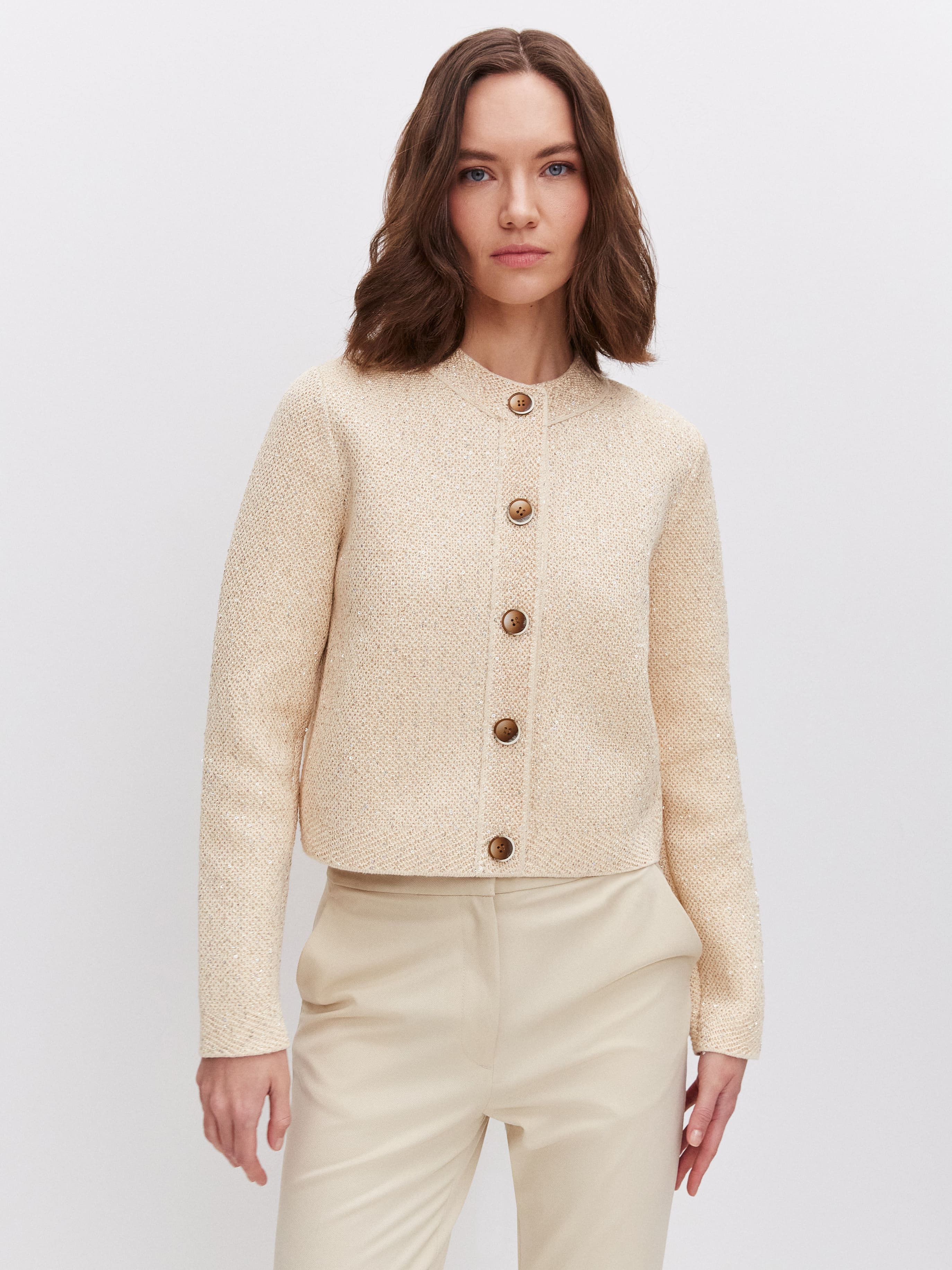 Укороченная длина, гламурный блеск пайеток и необычная «кольчужная» текстура превращают этот кроп жакет в ключевой акцент гардероба. Модель одинаково уместна и в качестве дополнения к вечернему платью, и как самостоятельная единица образа. Комбинирование мягкого хлопка и вискозы сделало жакет еще более тактильным.