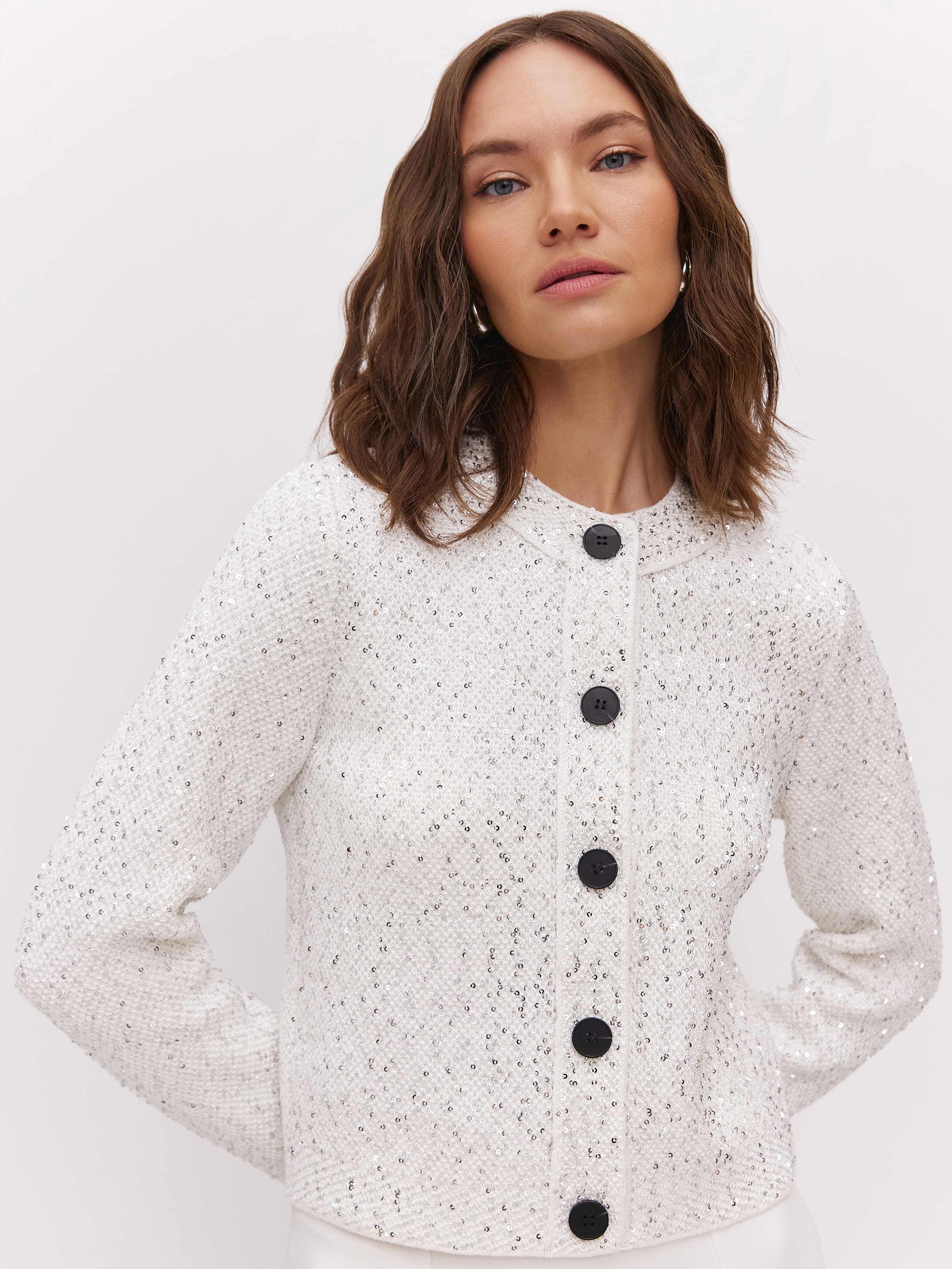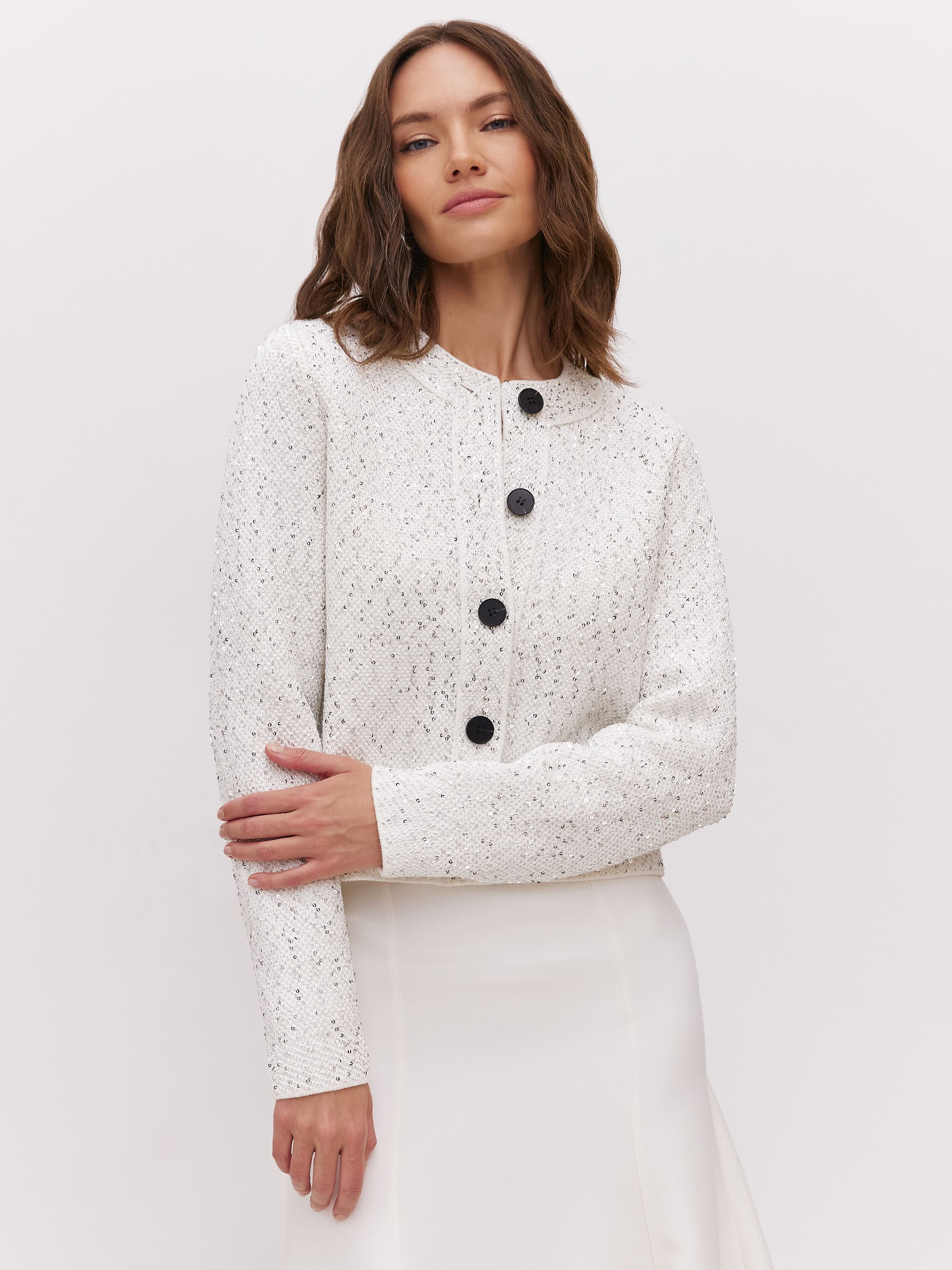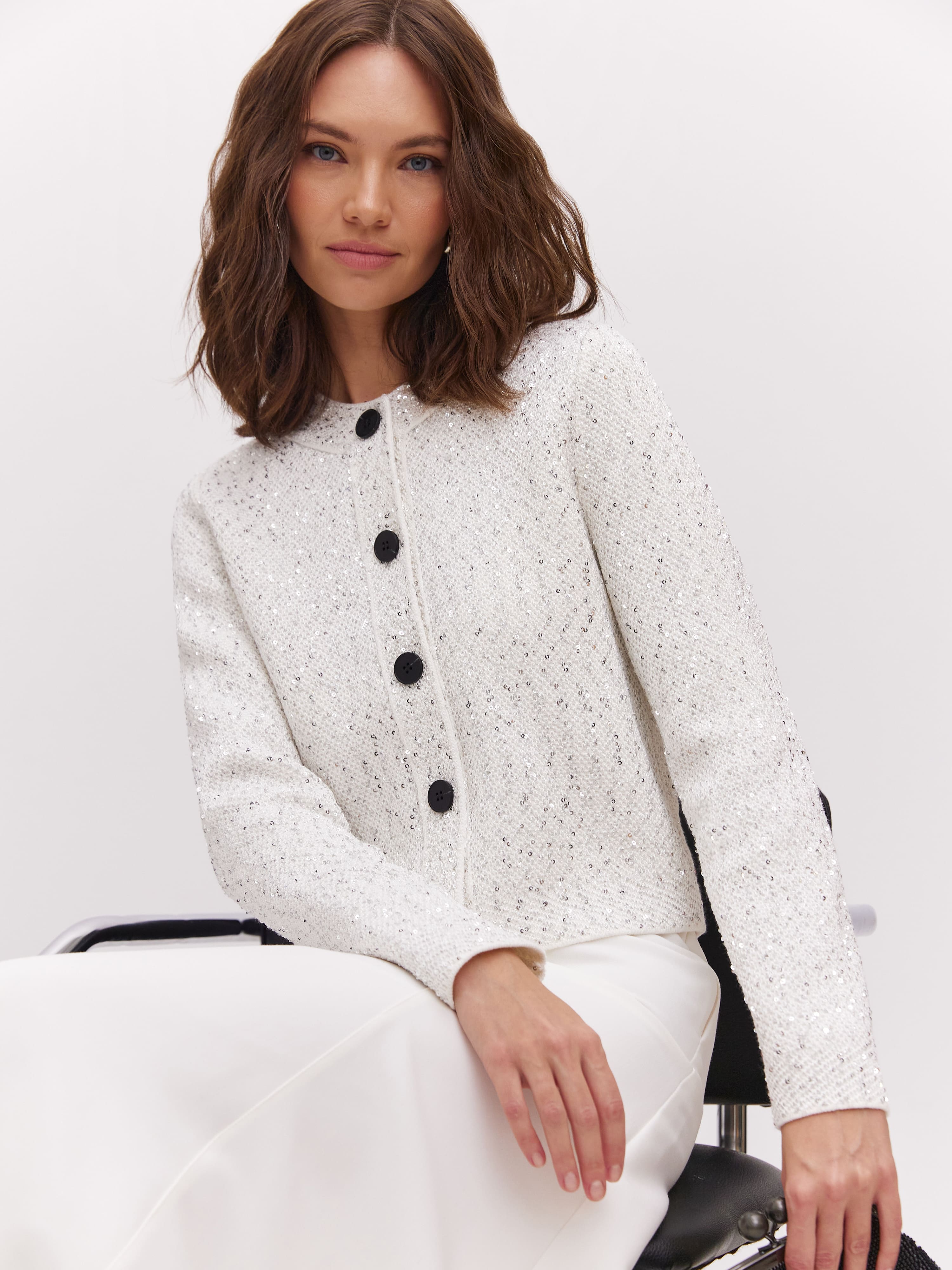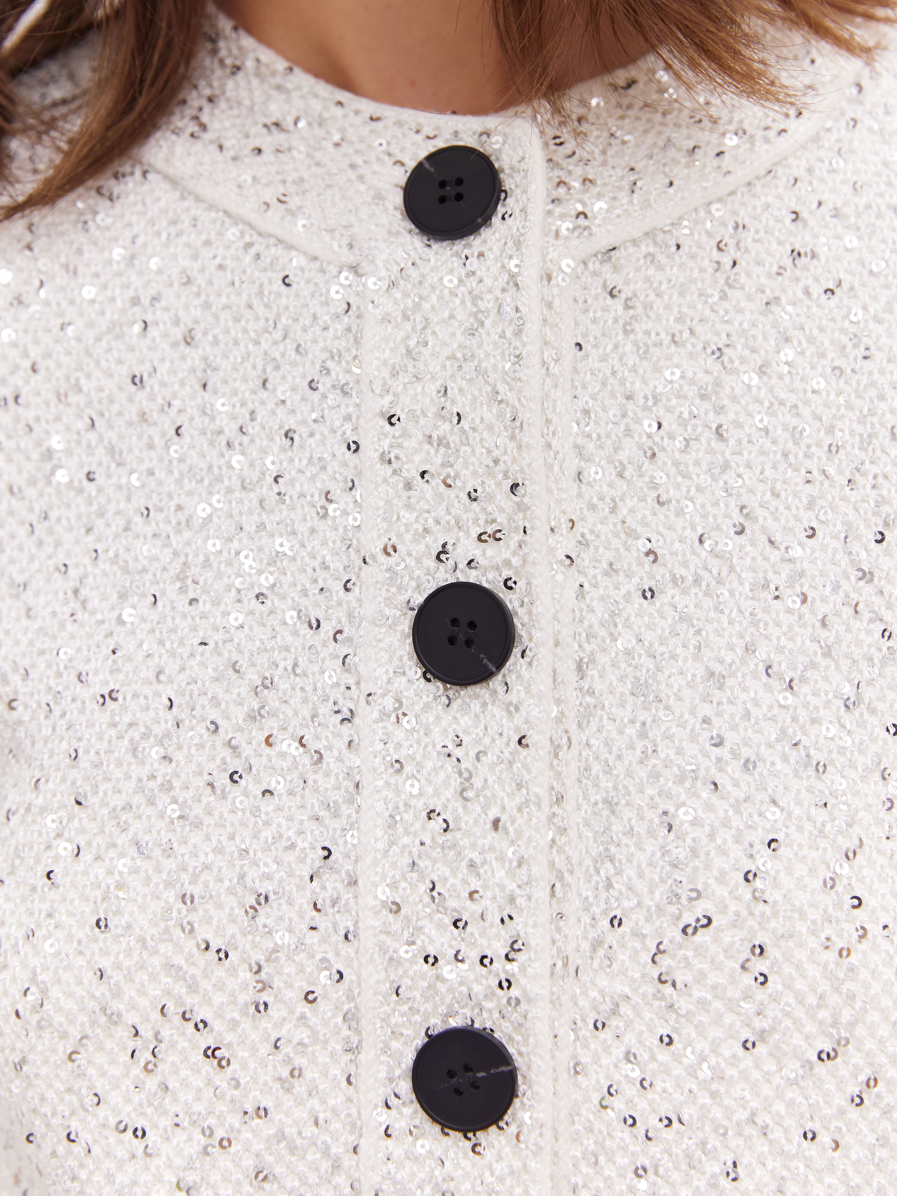 Укороченная длина, гламурный блеск пайеток и необычная «кольчужная» текстура превращают этот кроп жакет в ключевой акцент гардероба. Модель одинаково уместна и в качестве дополнения к вечернему платью, и как самостоятельная единица образа. Комбинирование мягкого хлопка и вискозы сделало жакет еще более тактильным.