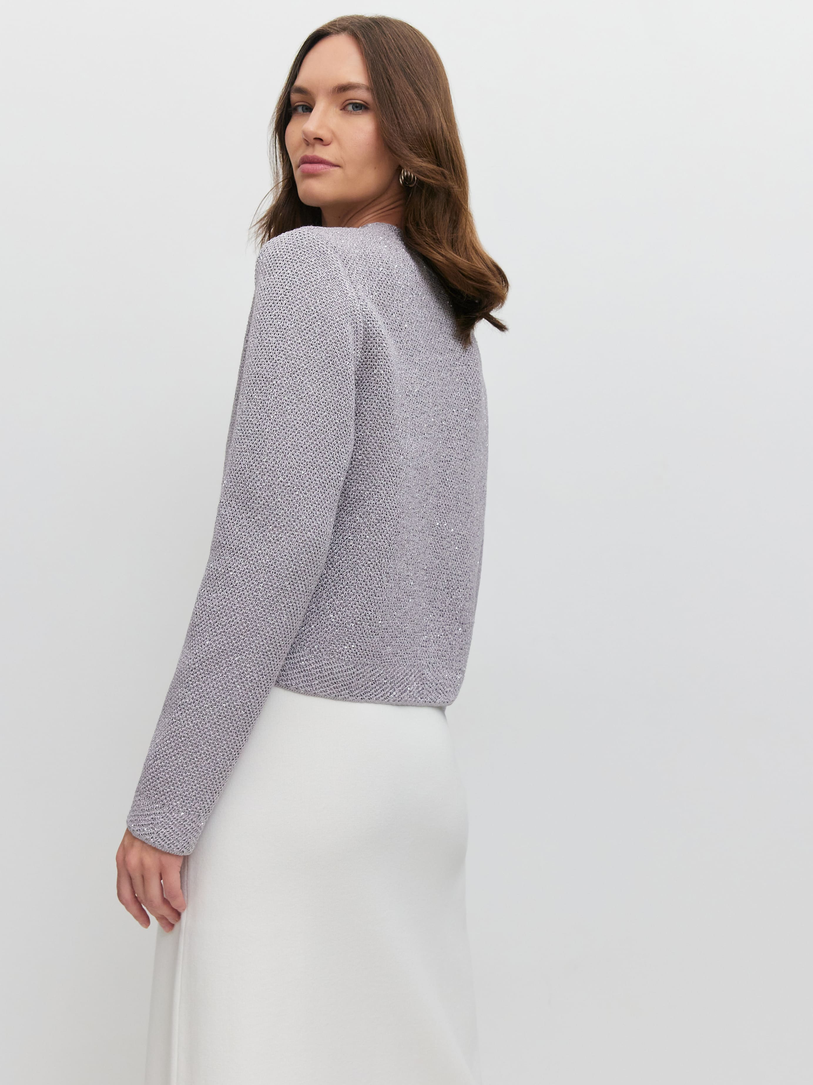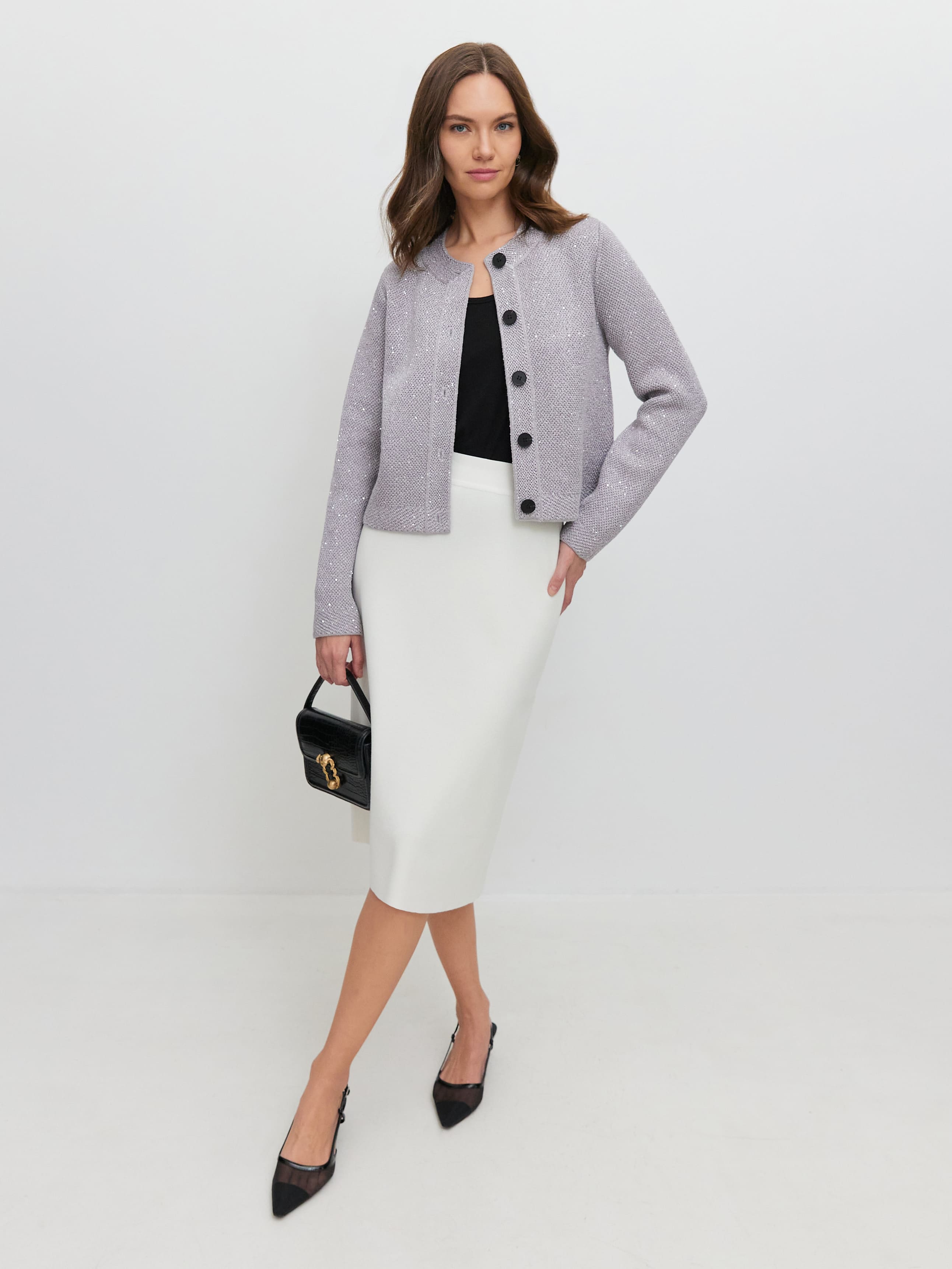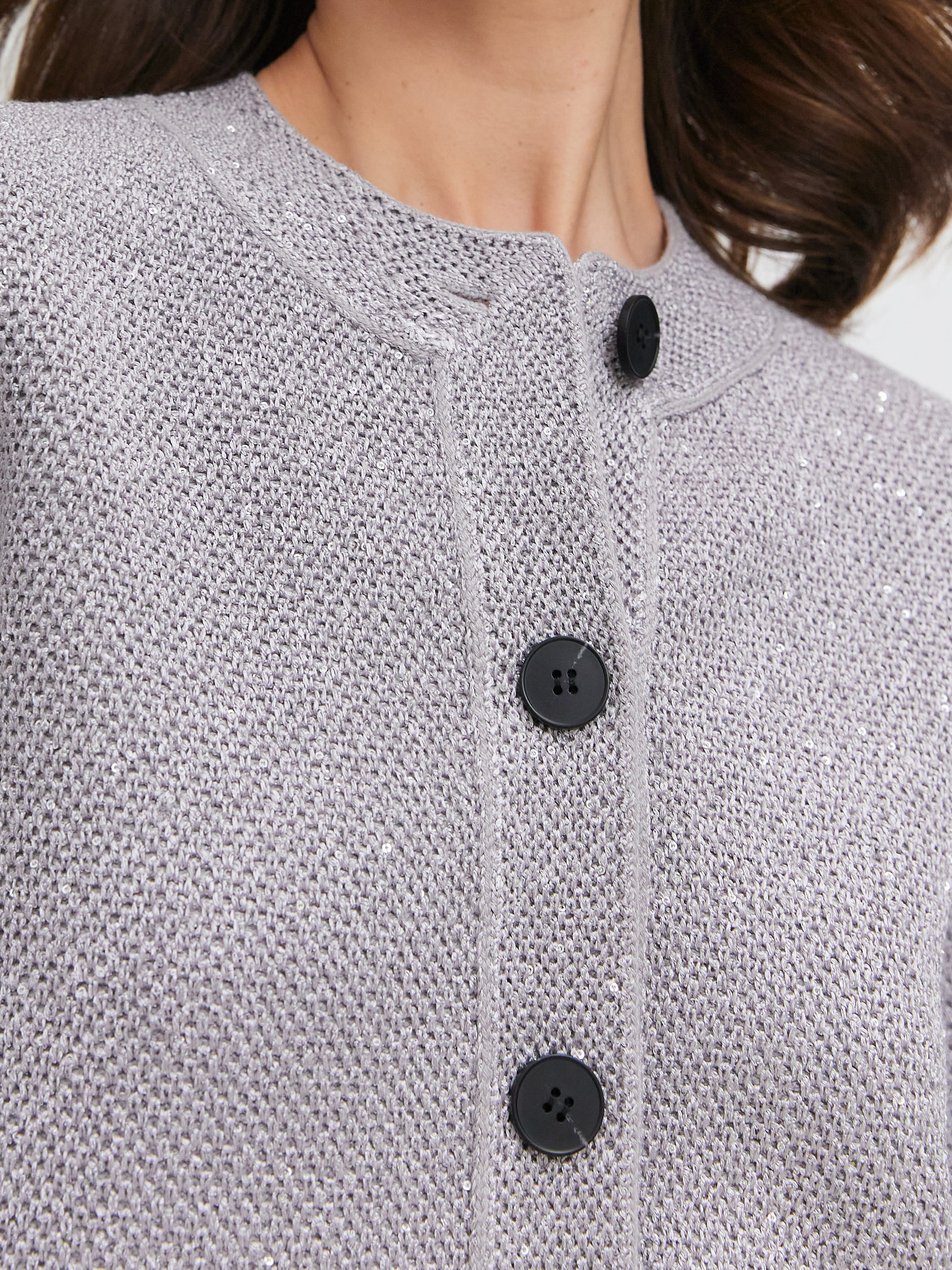 Укороченная длина, гламурный блеск пайеток и необычная «кольчужная» текстура превращают этот кроп жакет в ключевой акцент гардероба. Модель одинаково уместна и в качестве дополнения к вечернему платью, и как самостоятельная единица образа. Комбинирование мягкого хлопка и вискозы сделало жакет еще более тактильным.