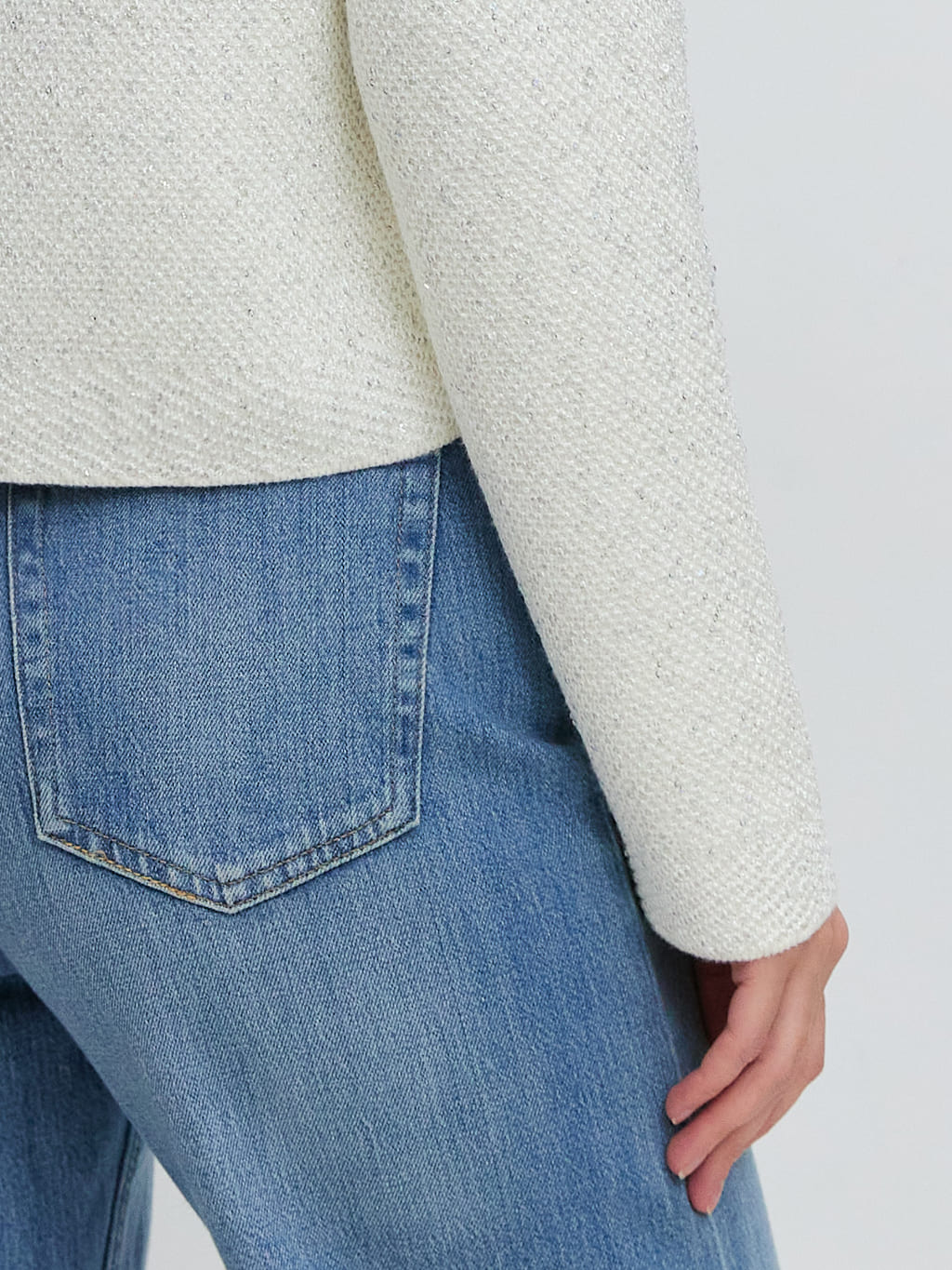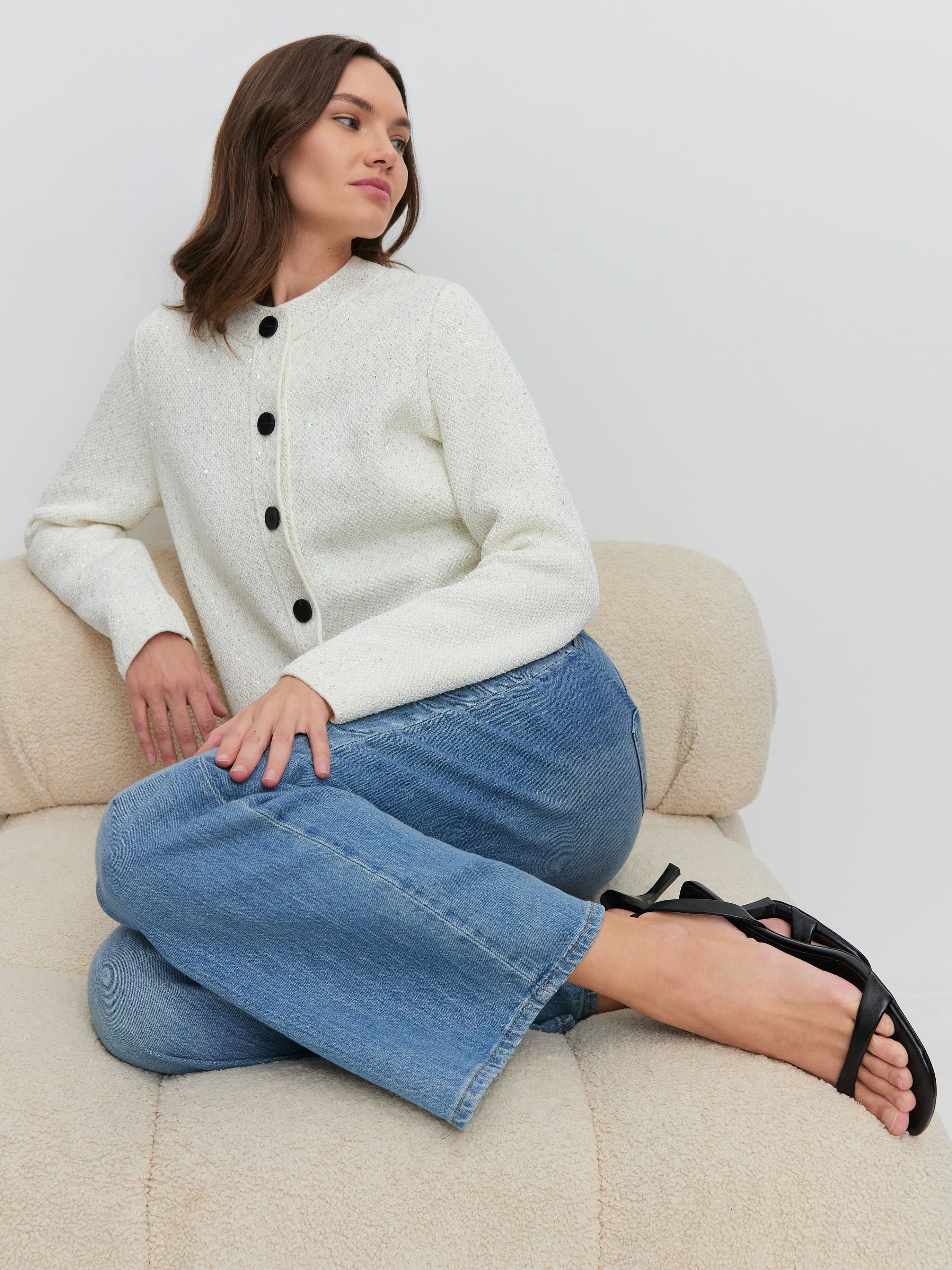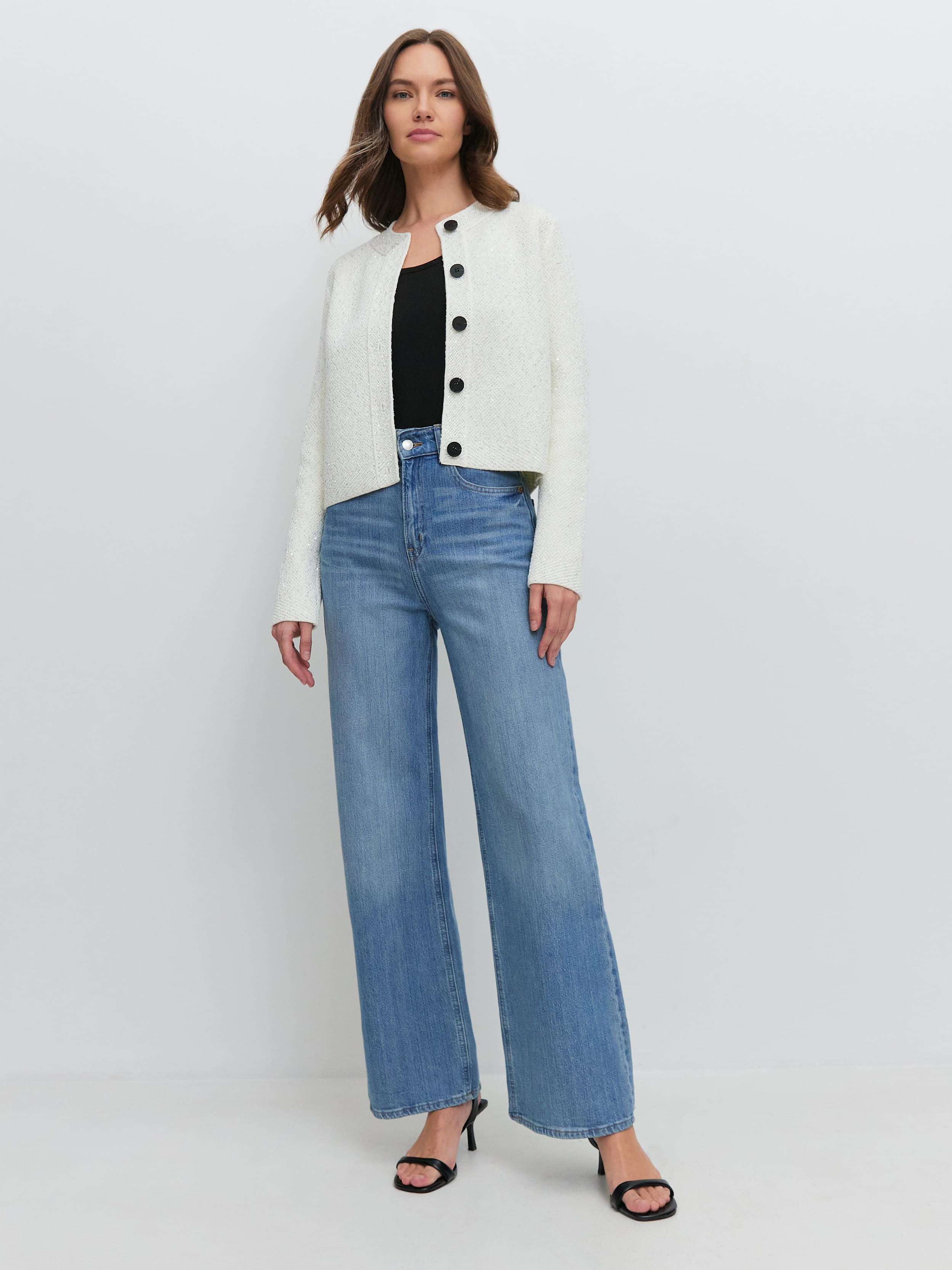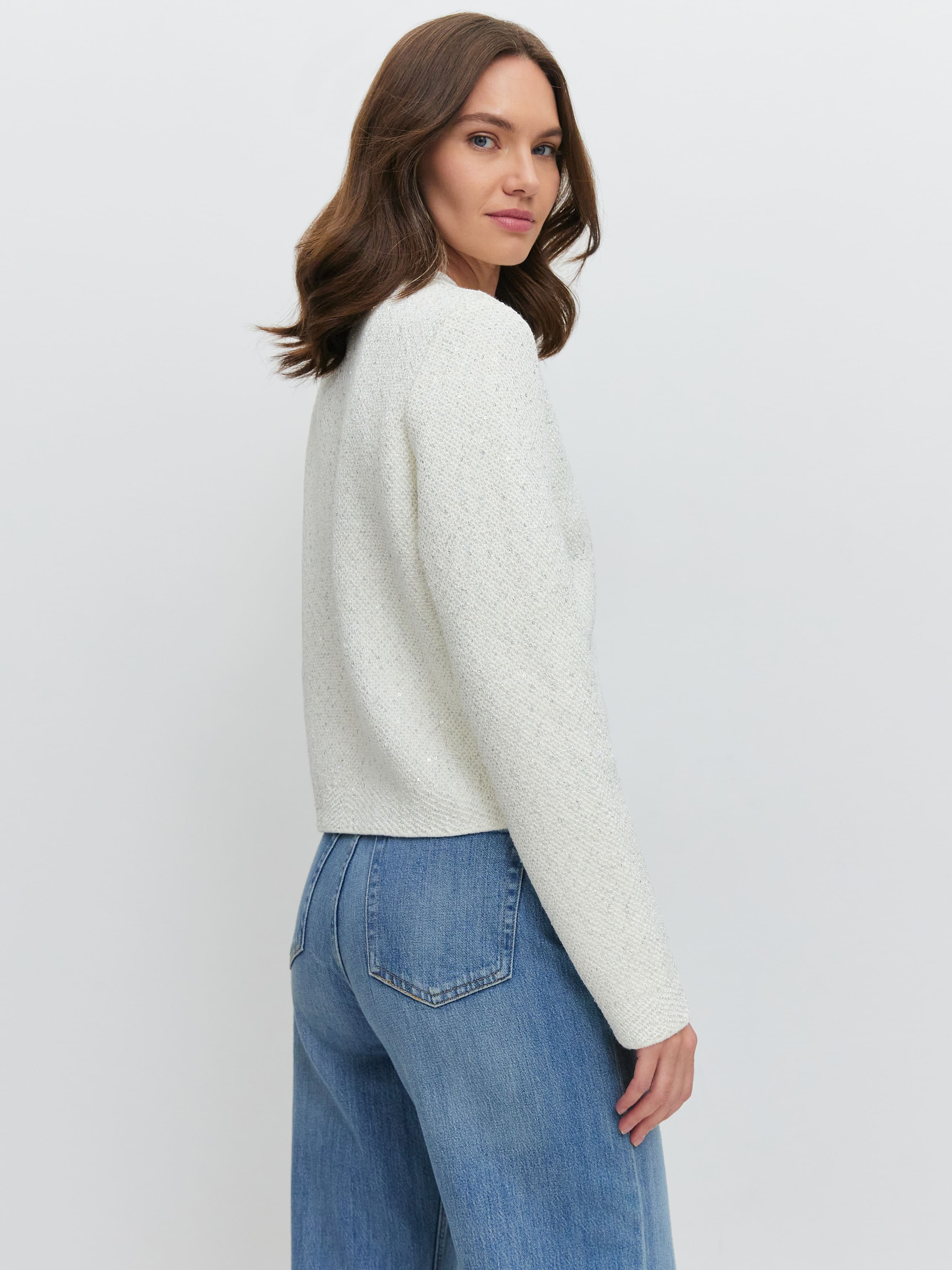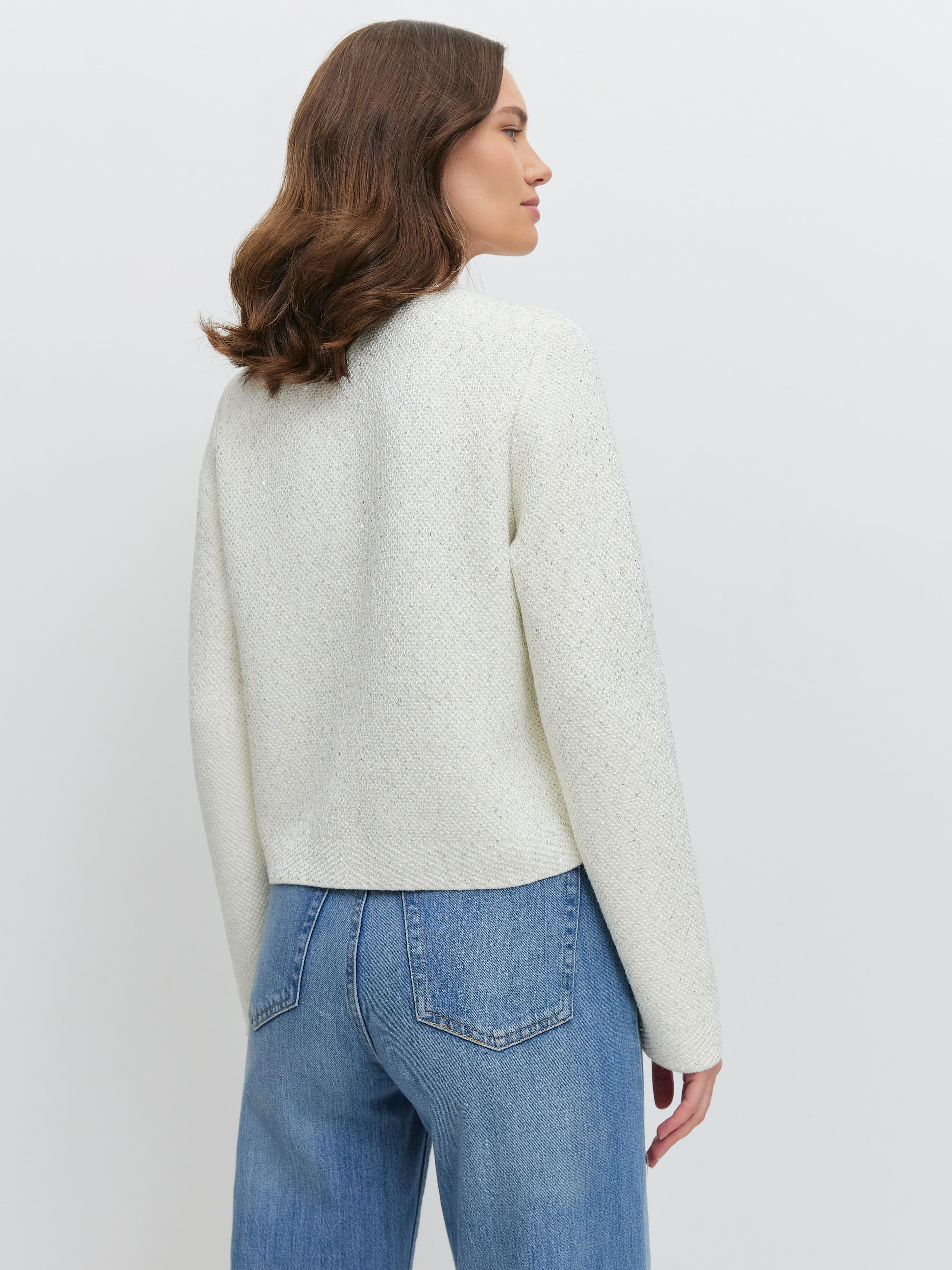 Укороченная длина, гламурный блеск пайеток и необычная «кольчужная» текстура превращают этот кроп жакет в ключевой акцент гардероба. Модель одинаково уместна и в качестве дополнения к вечернему платью, и как самостоятельная единица образа. Комбинирование мягкого хлопка и вискозы сделало жакет еще более тактильным.