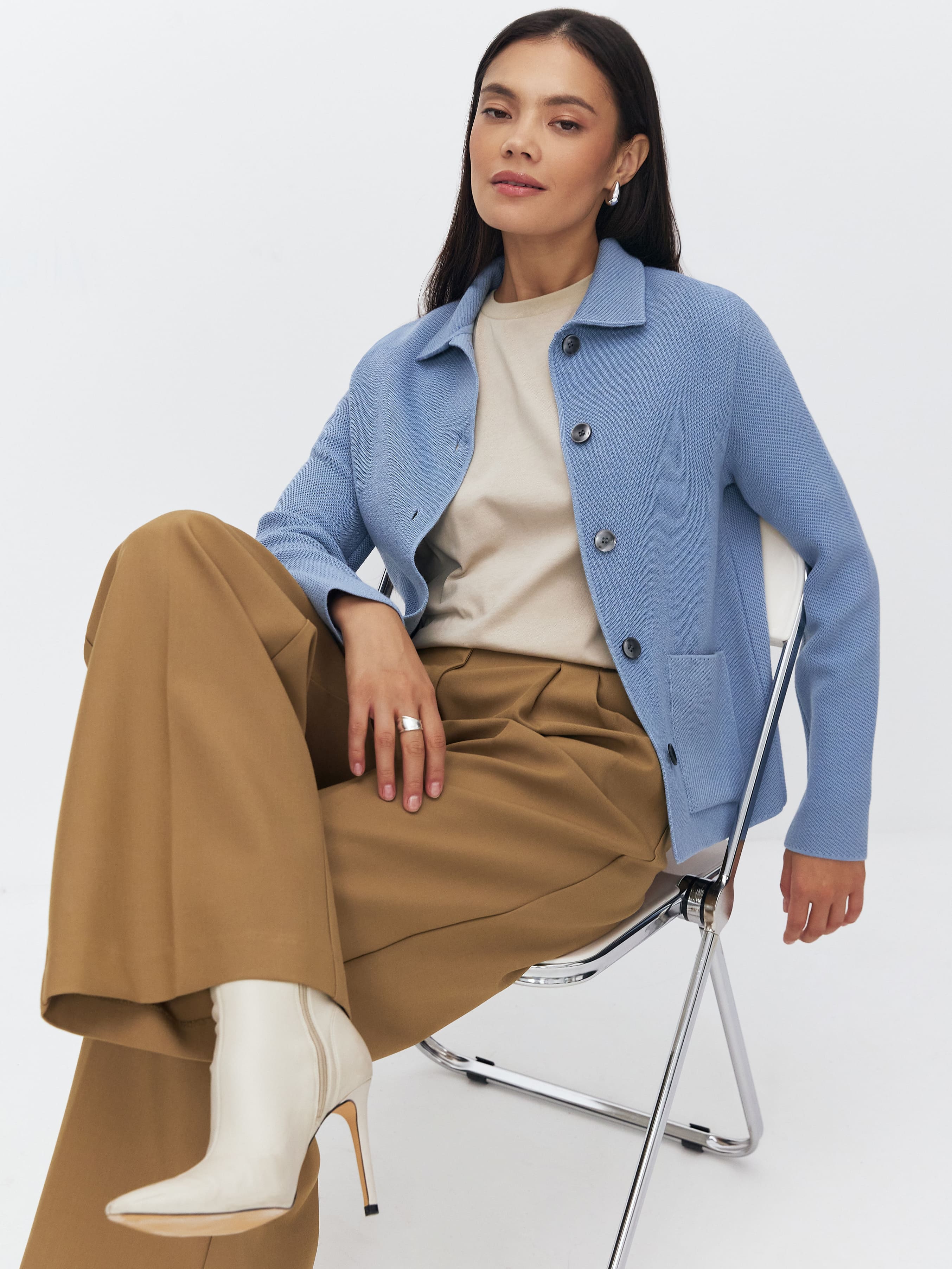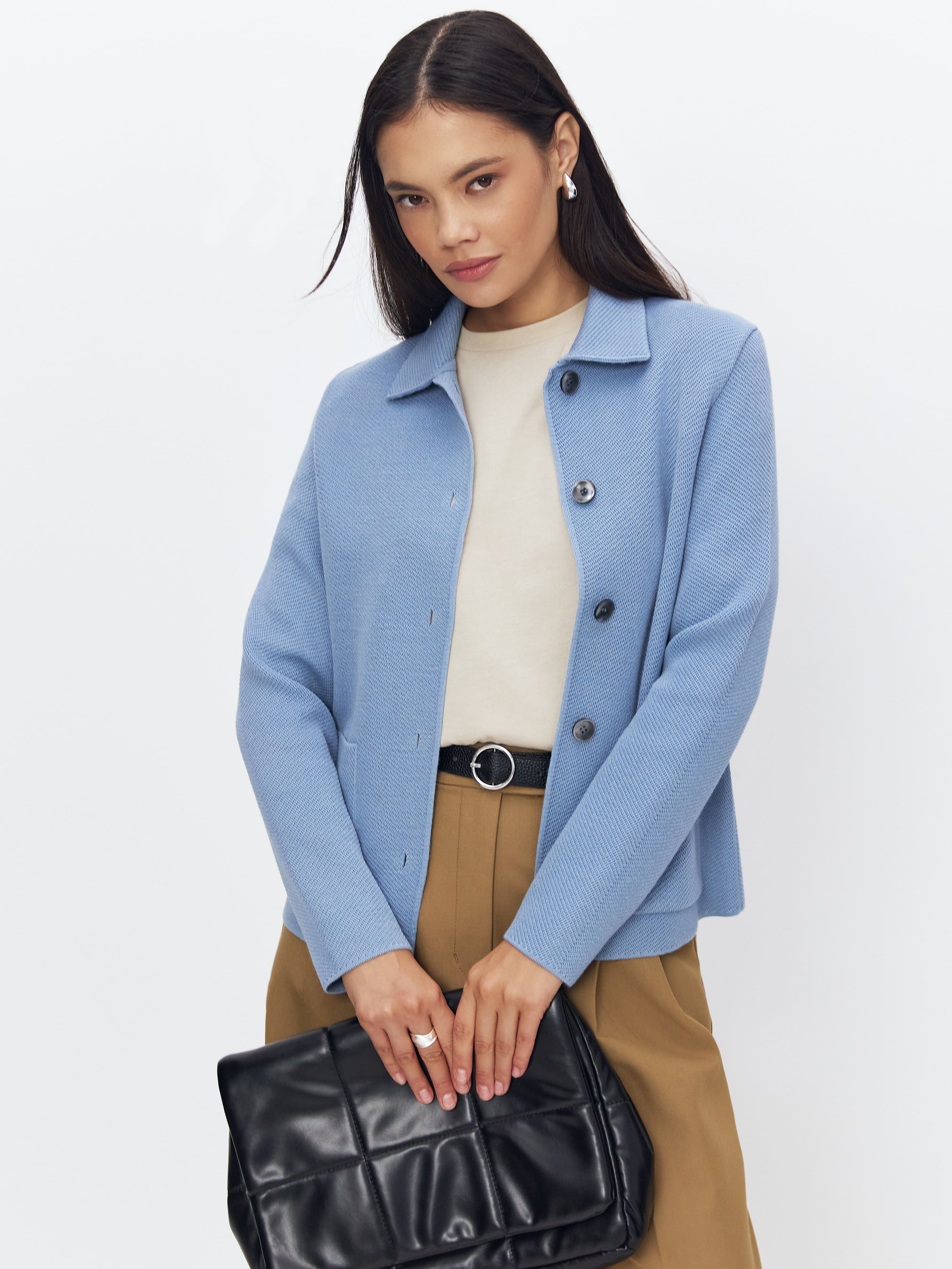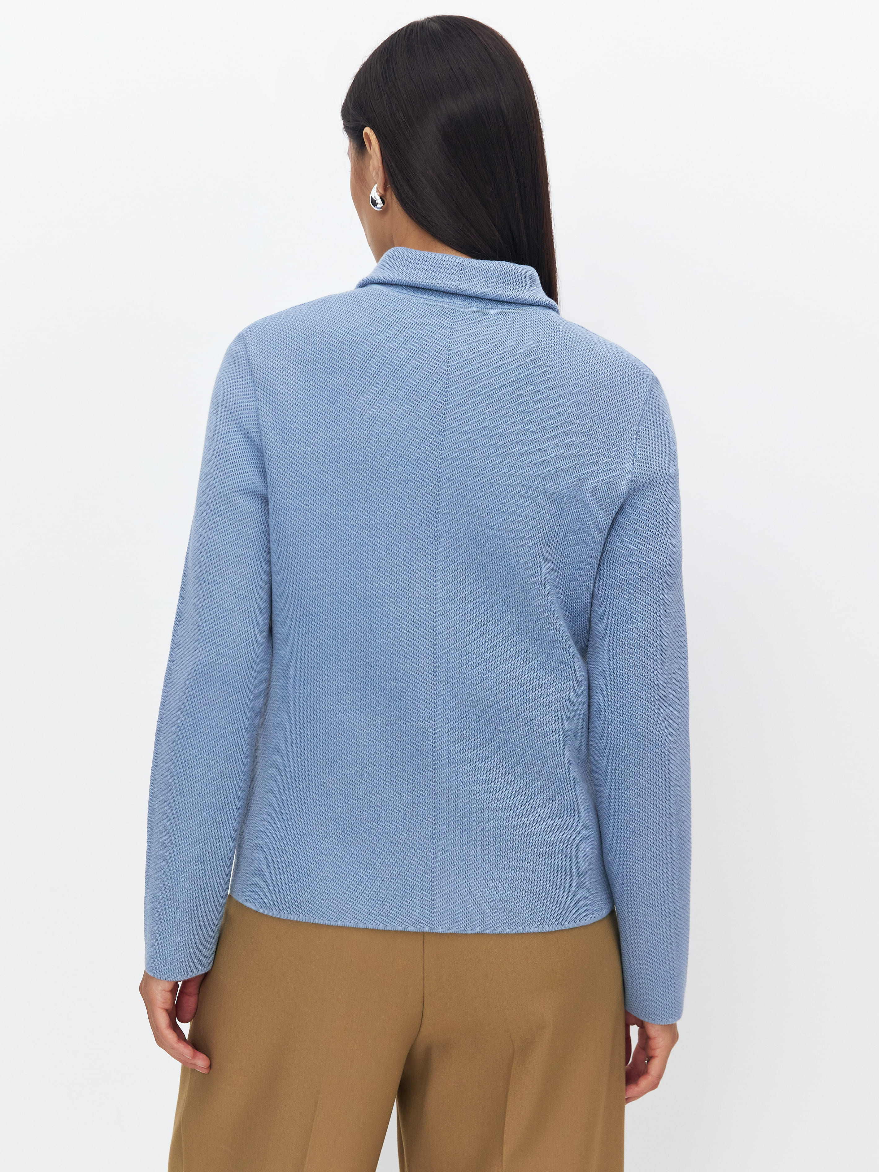 Миссия этого минималистичного жакета из мягкой мериносовой шерсти – сделать офисные образы еще теплее и уютнее. Но это совершенно не мешает комбинировать его с вещами любой формальности – от строгой юбки до трендовых моделей джинсов. Плотный, качественный трикотаж создан с учетом сезонных нюансов. Натуральная шерсть прекрасно вентилируется, но при этом хорошо удерживает тепло.
