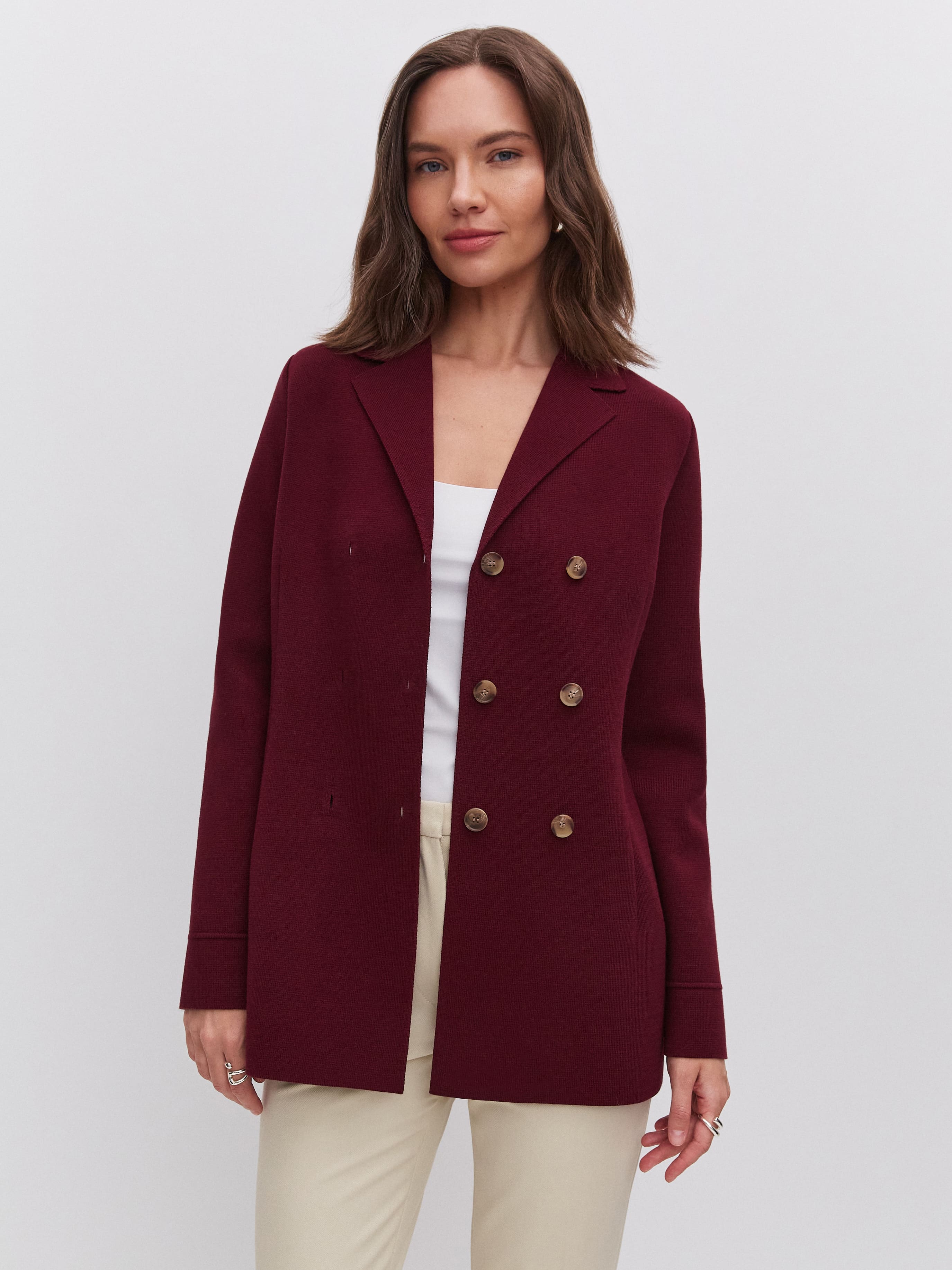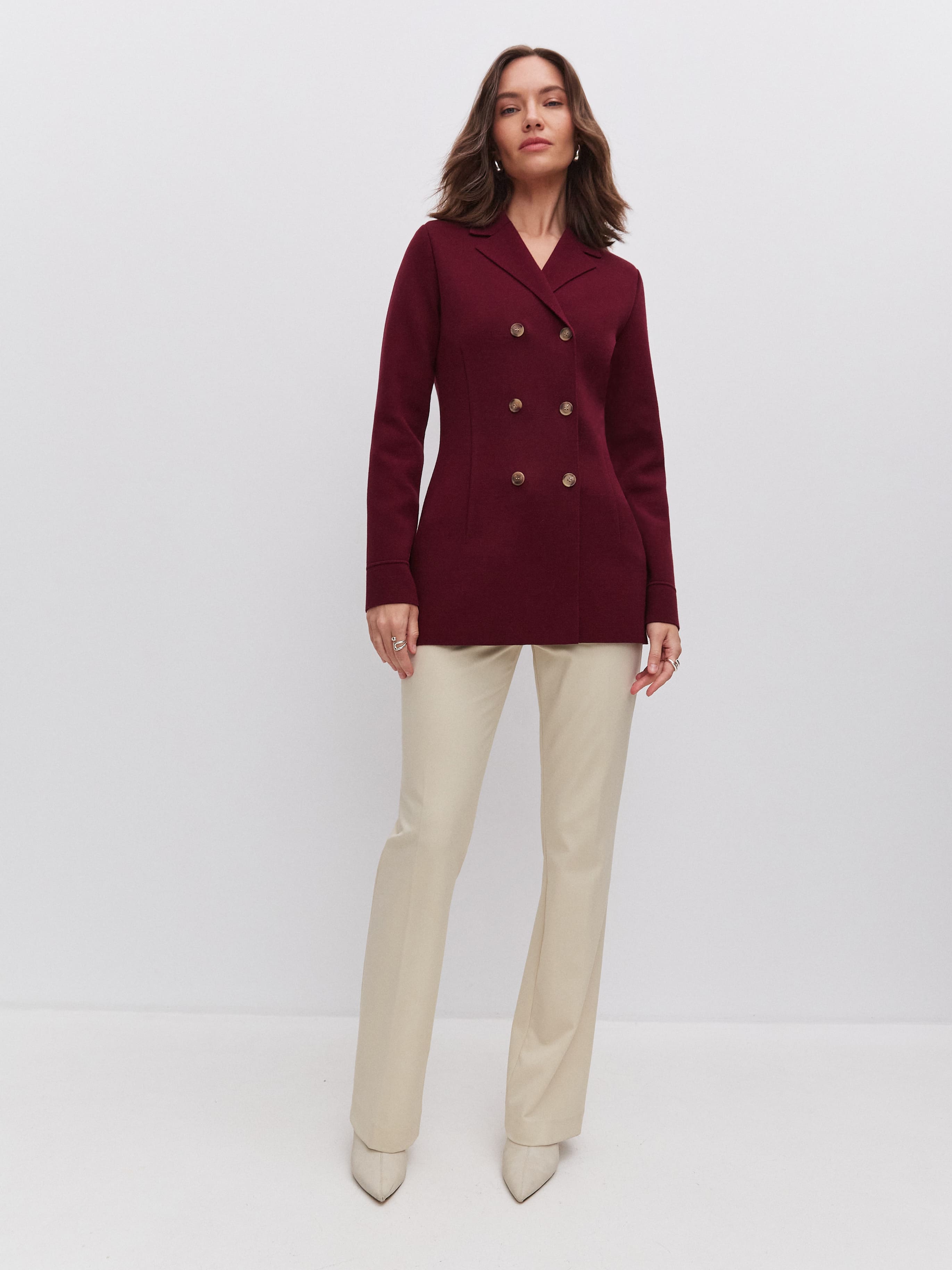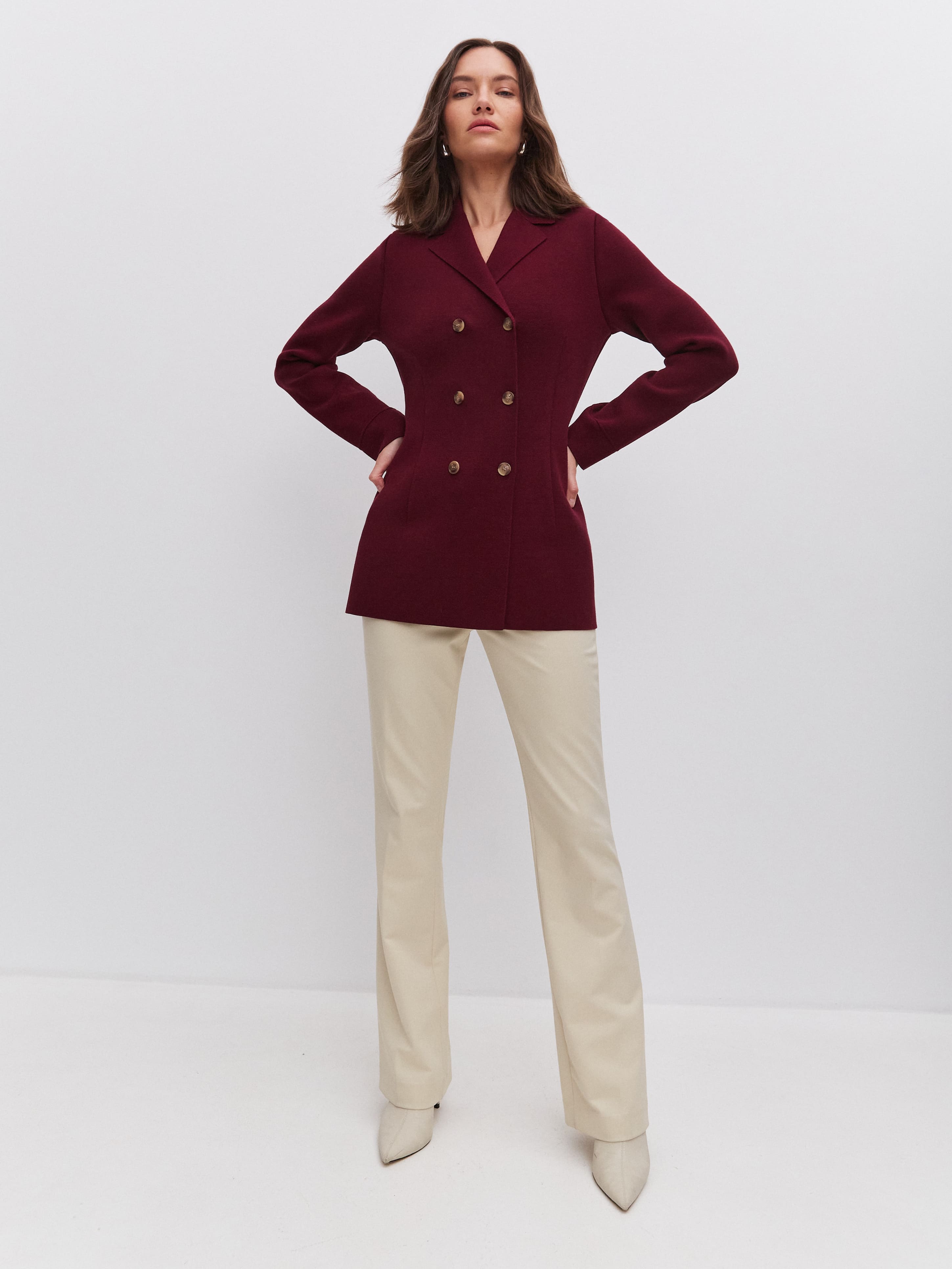 Силуэтный удлиненный жакет из хлопка, который знает все о совершенной талии. Главный секрет изделия – в аккуратных вытачках. Это они моделируют плавные переходы между участками фигуры и задают правильные изгибы. Два ряда роговых пуговиц служат мягким акцентом. Идеальное дополнение к образам в стиле нью лук, которые уже готовы ворваться в тренды этого сезона.