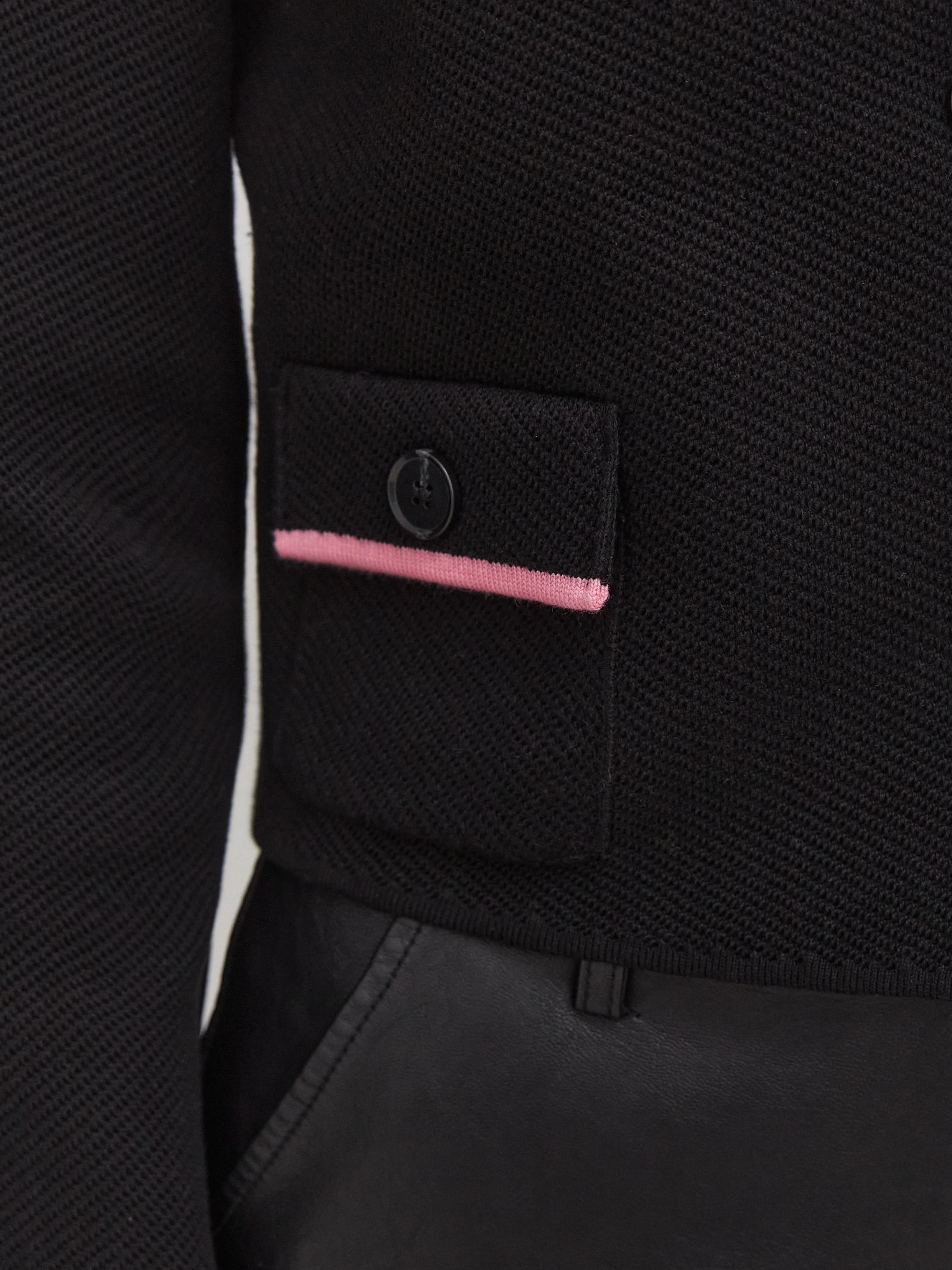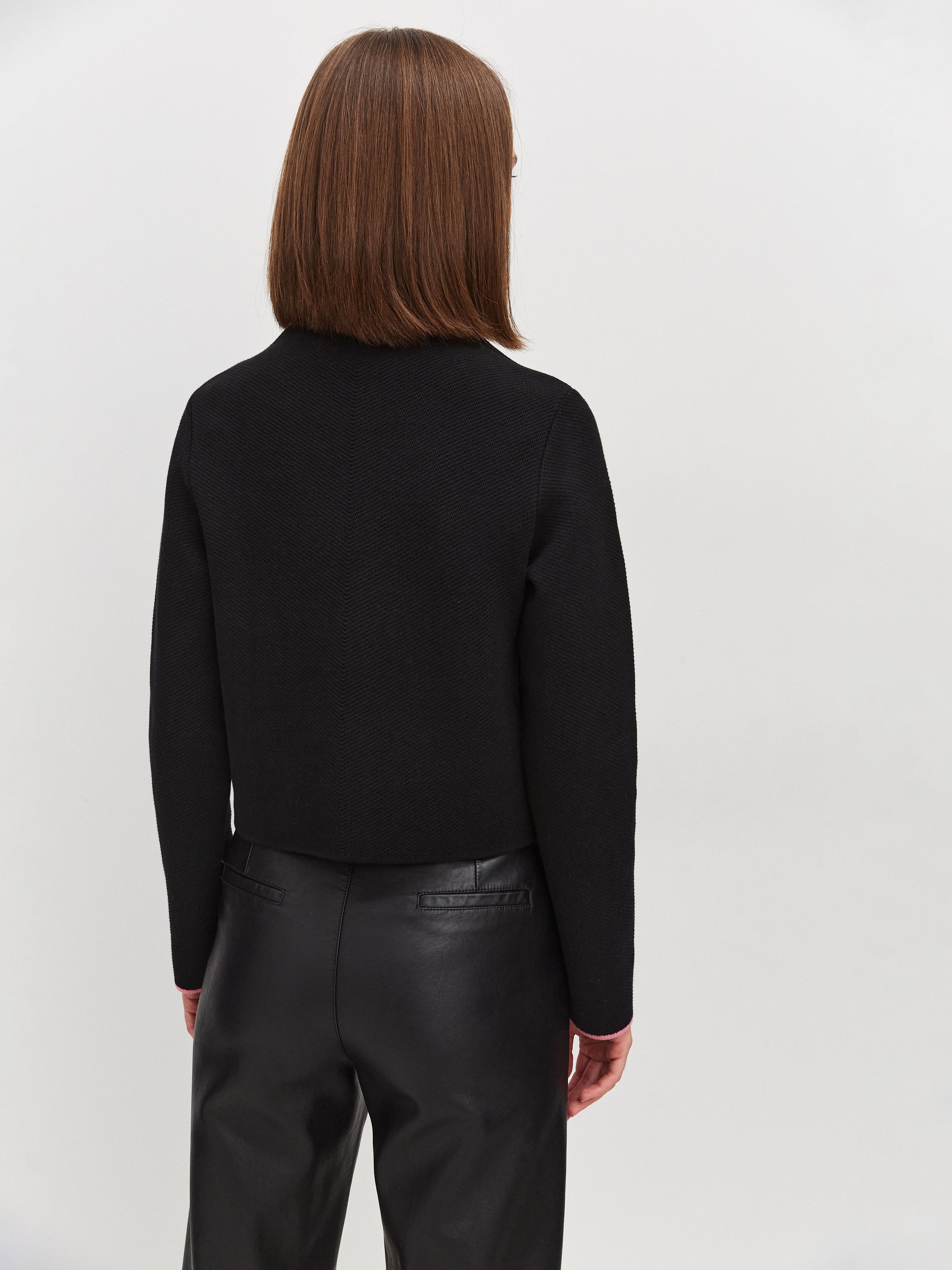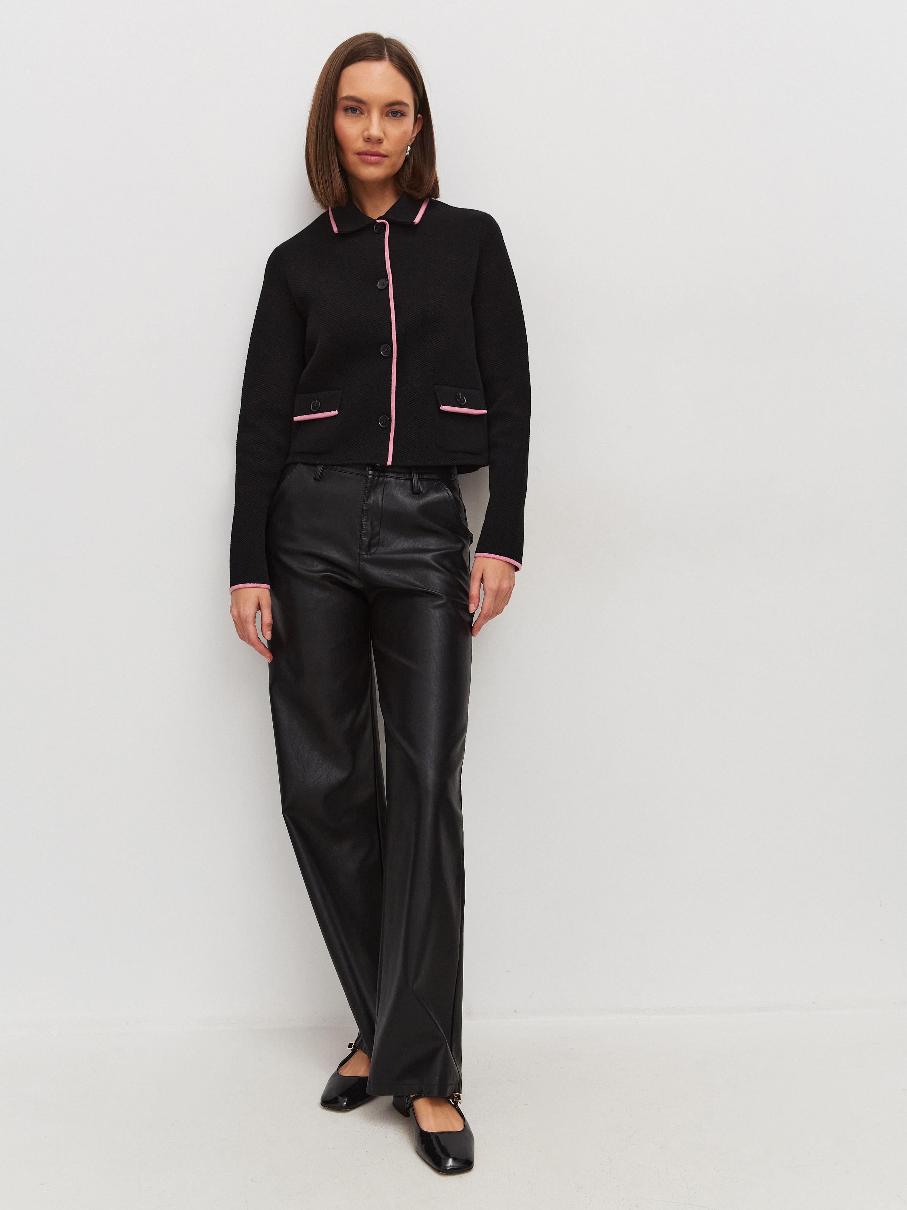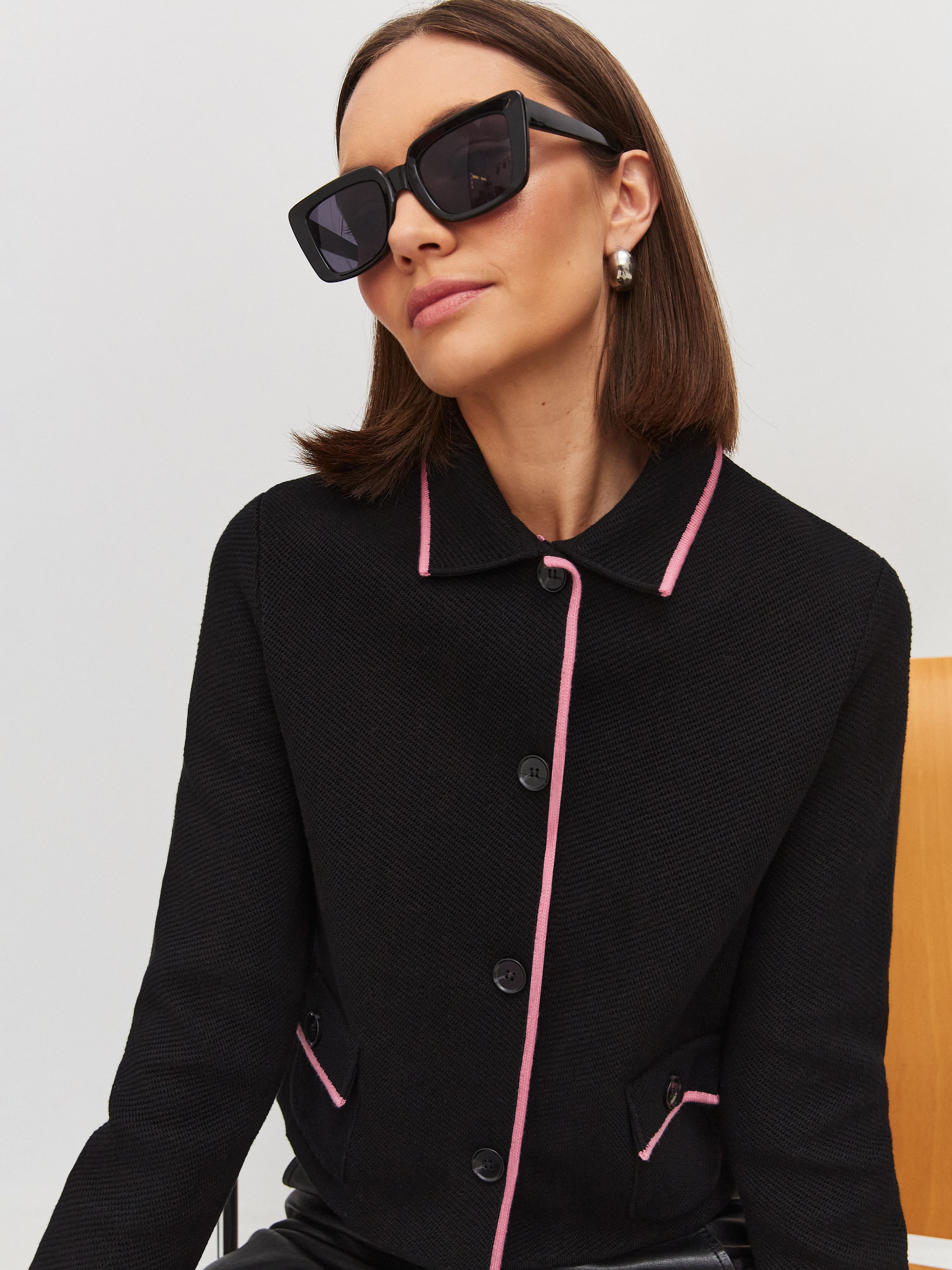 Ключевой нюанс вязаного жакета с хлопком – необычная «зернистая» текстура трикотажа. Рисунок располагается по диагонали, что формирует интересный визуальный эффект – силуэт как бы автоматически подтягивается. Графичность классического кроя пиджака превосходно уравновесят пластичные брюки-палаццо из нашей круизной линейки.
