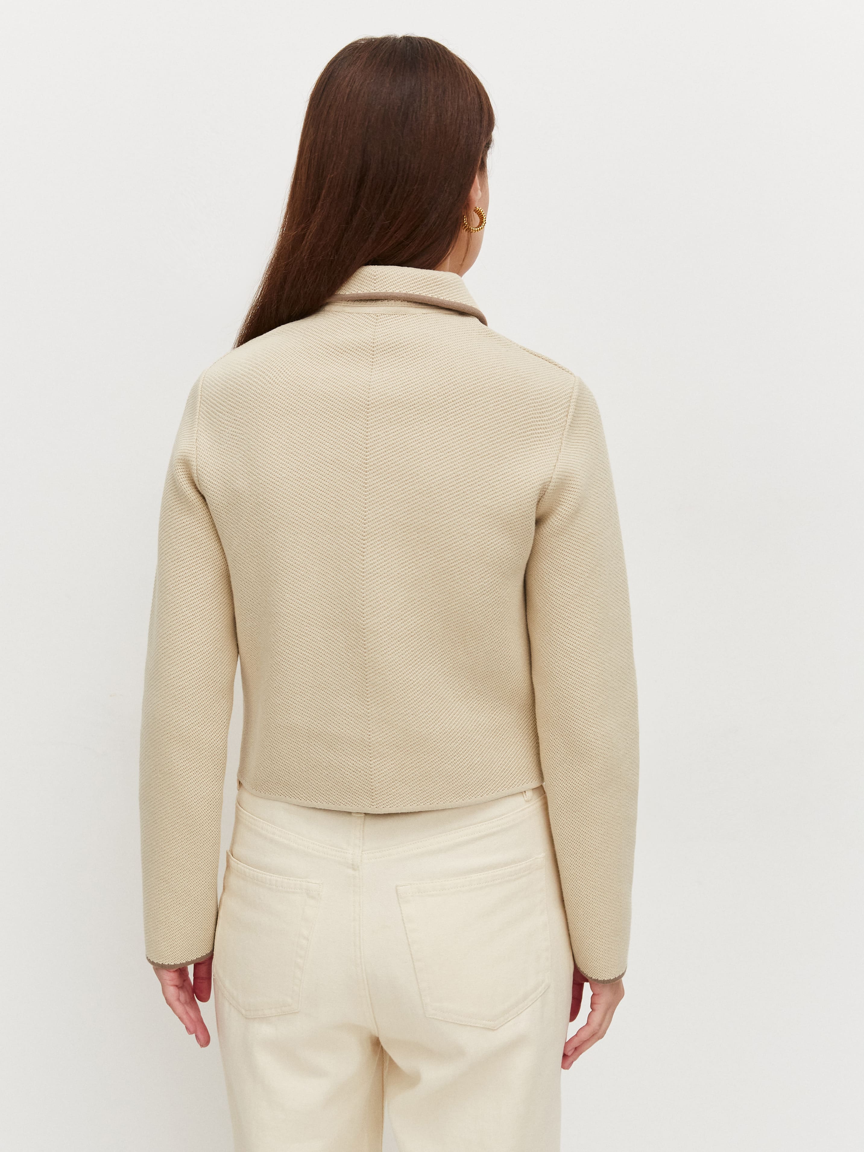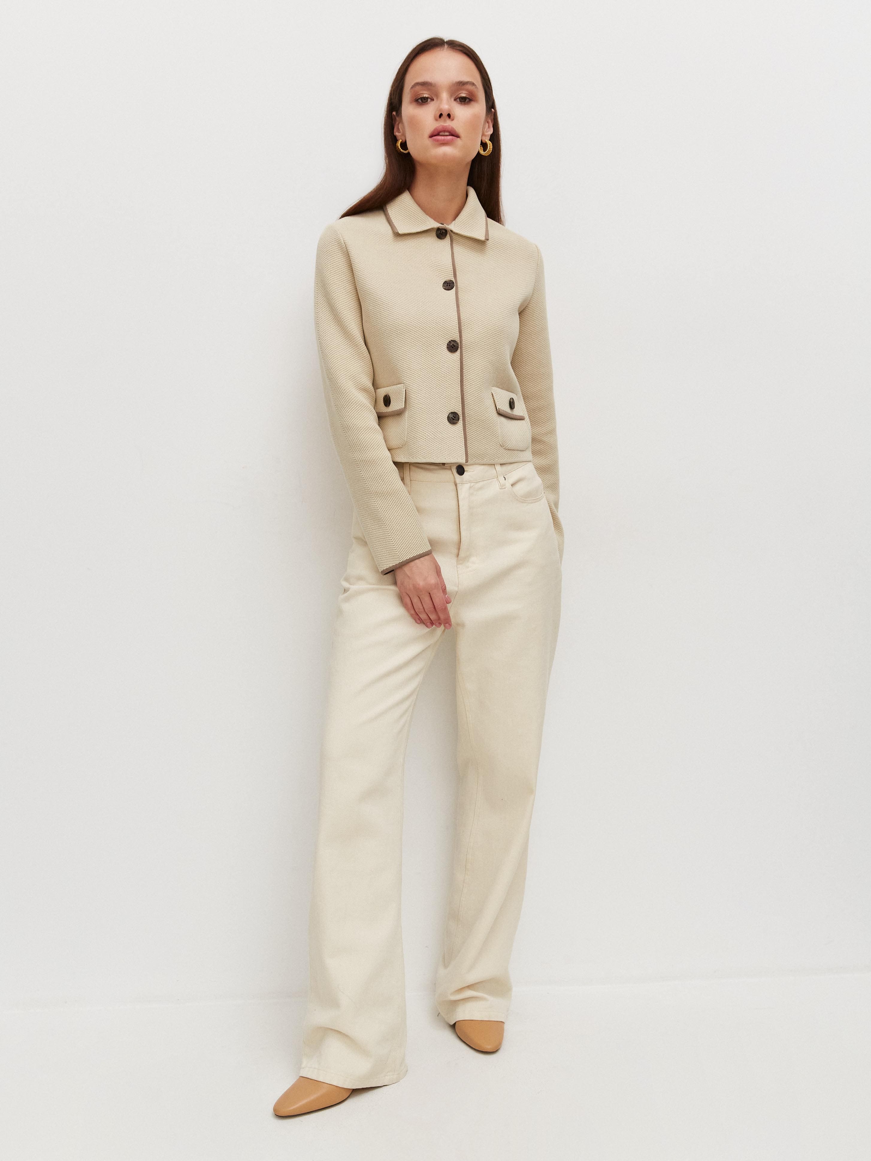 Ключевой нюанс вязаного жакета с хлопком – необычная «зернистая» текстура трикотажа. Рисунок располагается по диагонали, что формирует интересный визуальный эффект – силуэт как бы автоматически подтягивается. Графичность классического кроя пиджака превосходно уравновесят пластичные брюки-палаццо из нашей круизной линейки.