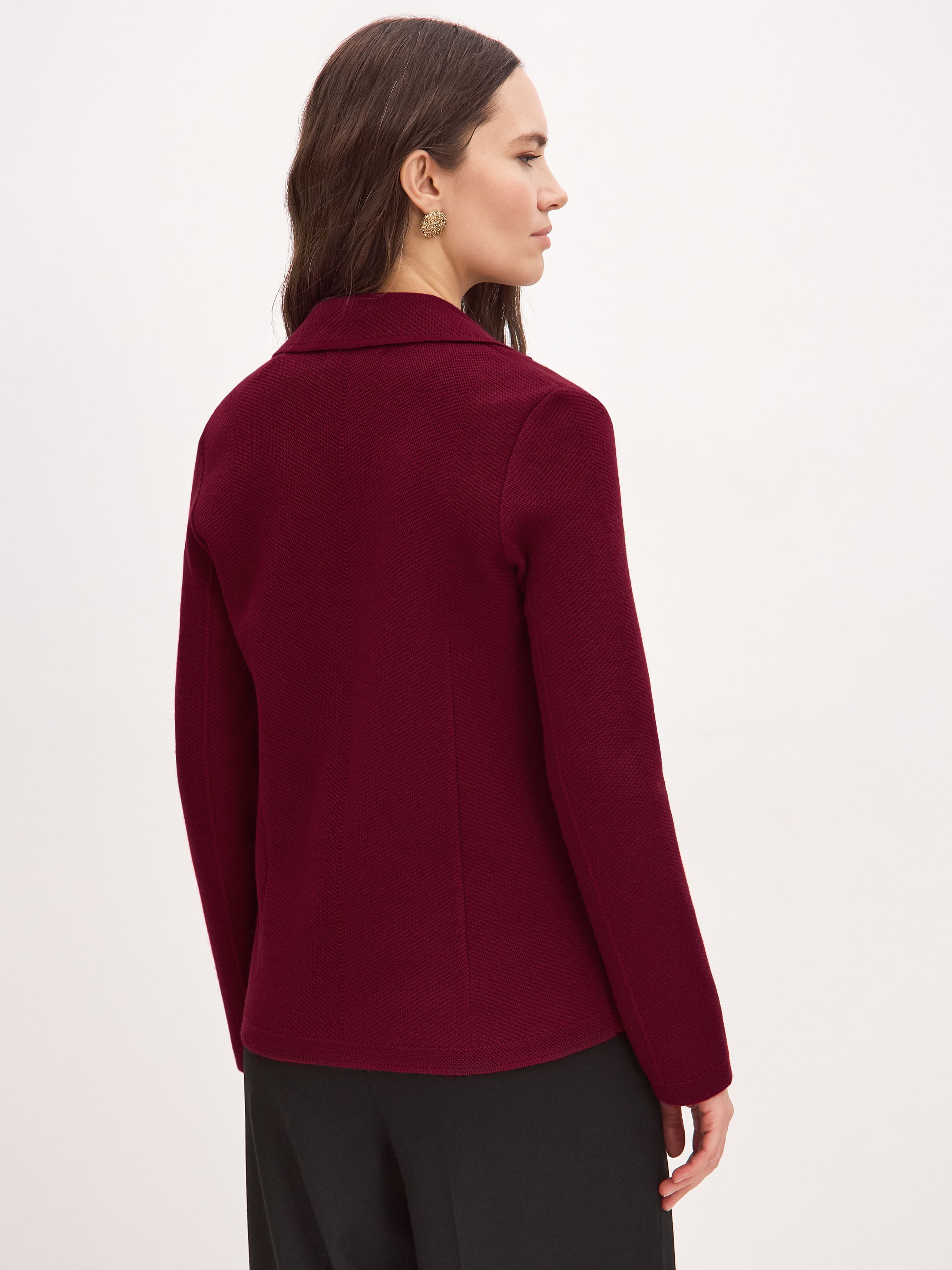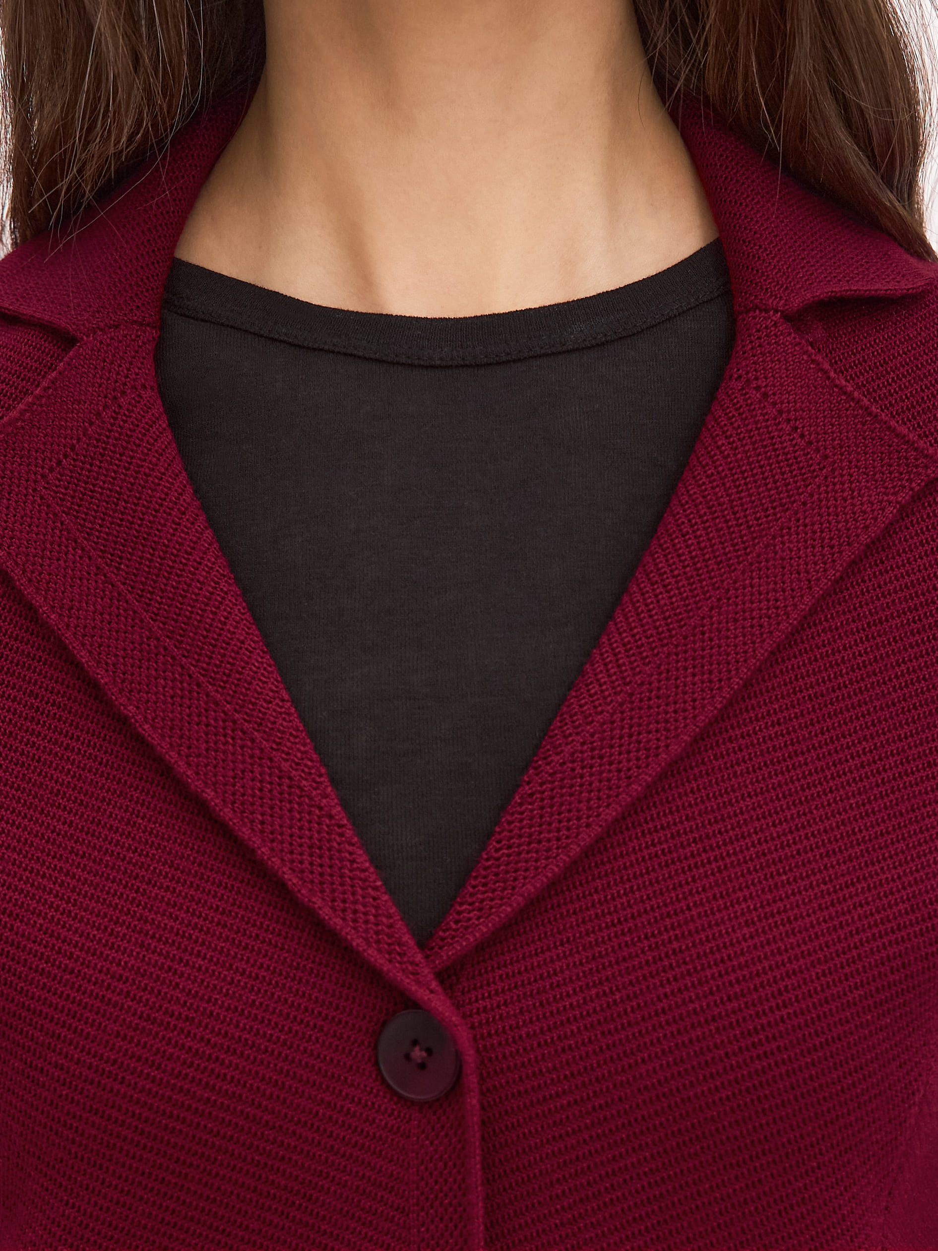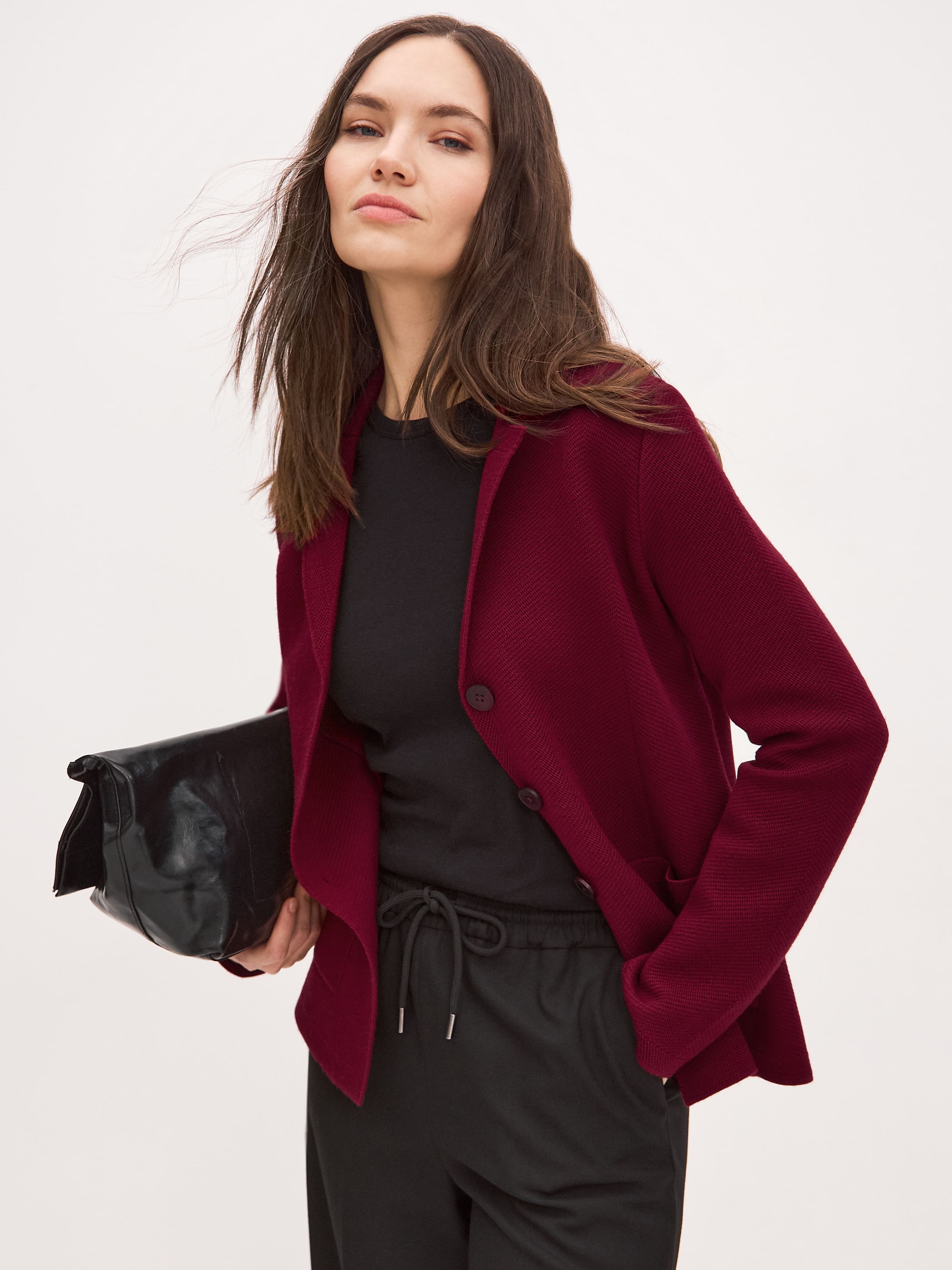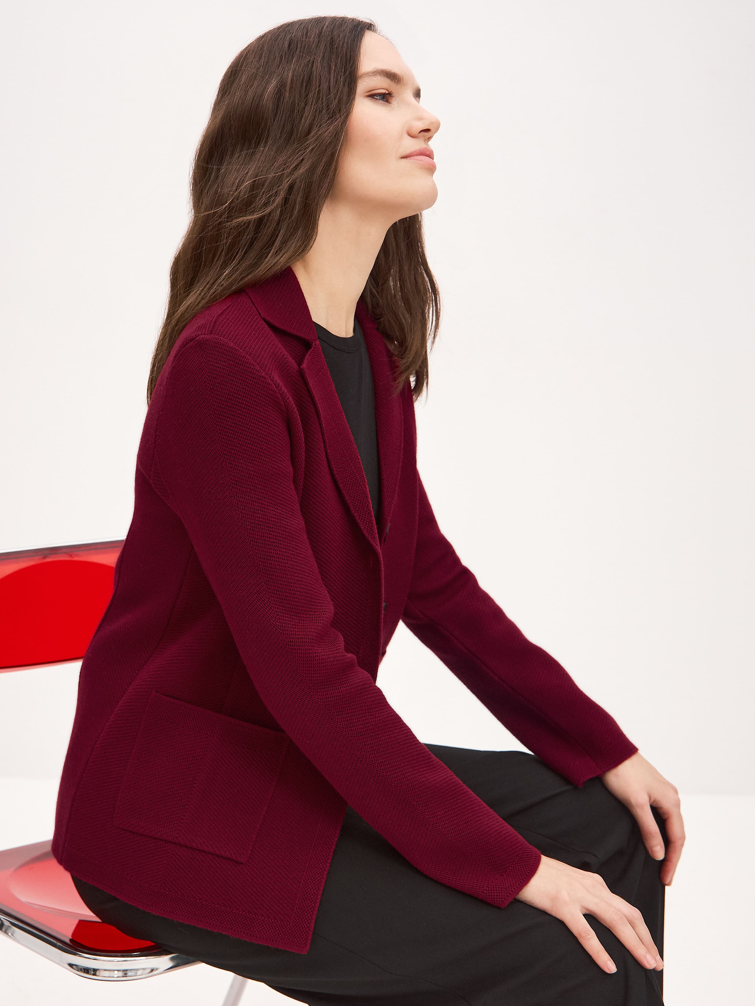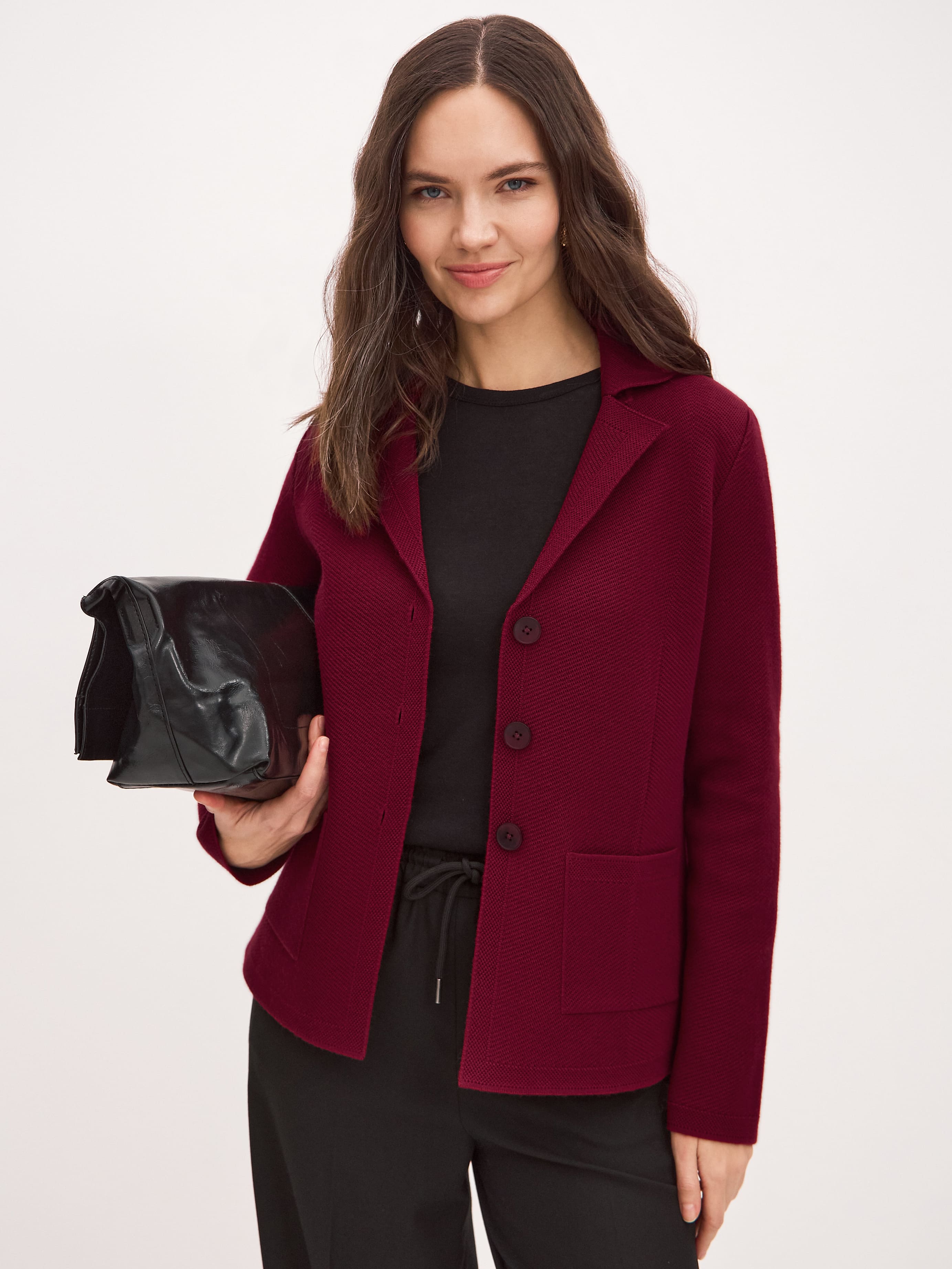 Не сдающая позиций классика, позволяющая сменить неудобный офисный пиджак на более комфортный вариант. Полуприталенный жакет из теплой шерсти имеет все атрибуты официального стиля – от английского воротника до глубоких накладных карманов. Мы дополнительно скорректировали состав трикотажа мягким акрилом. С ним натуральные шерстинки теряют природную жесткость, становясь нежнее и тактильно приятнее.