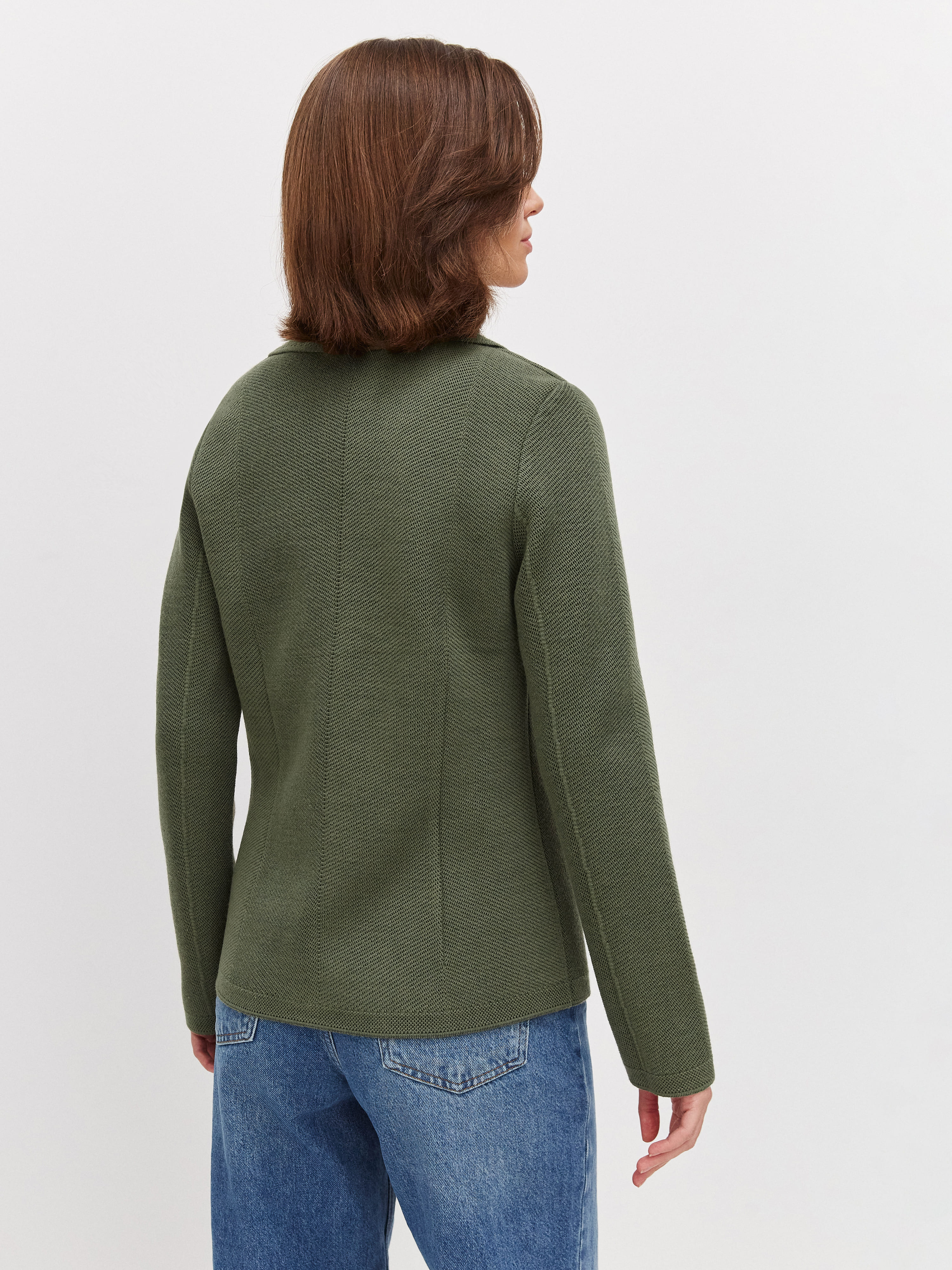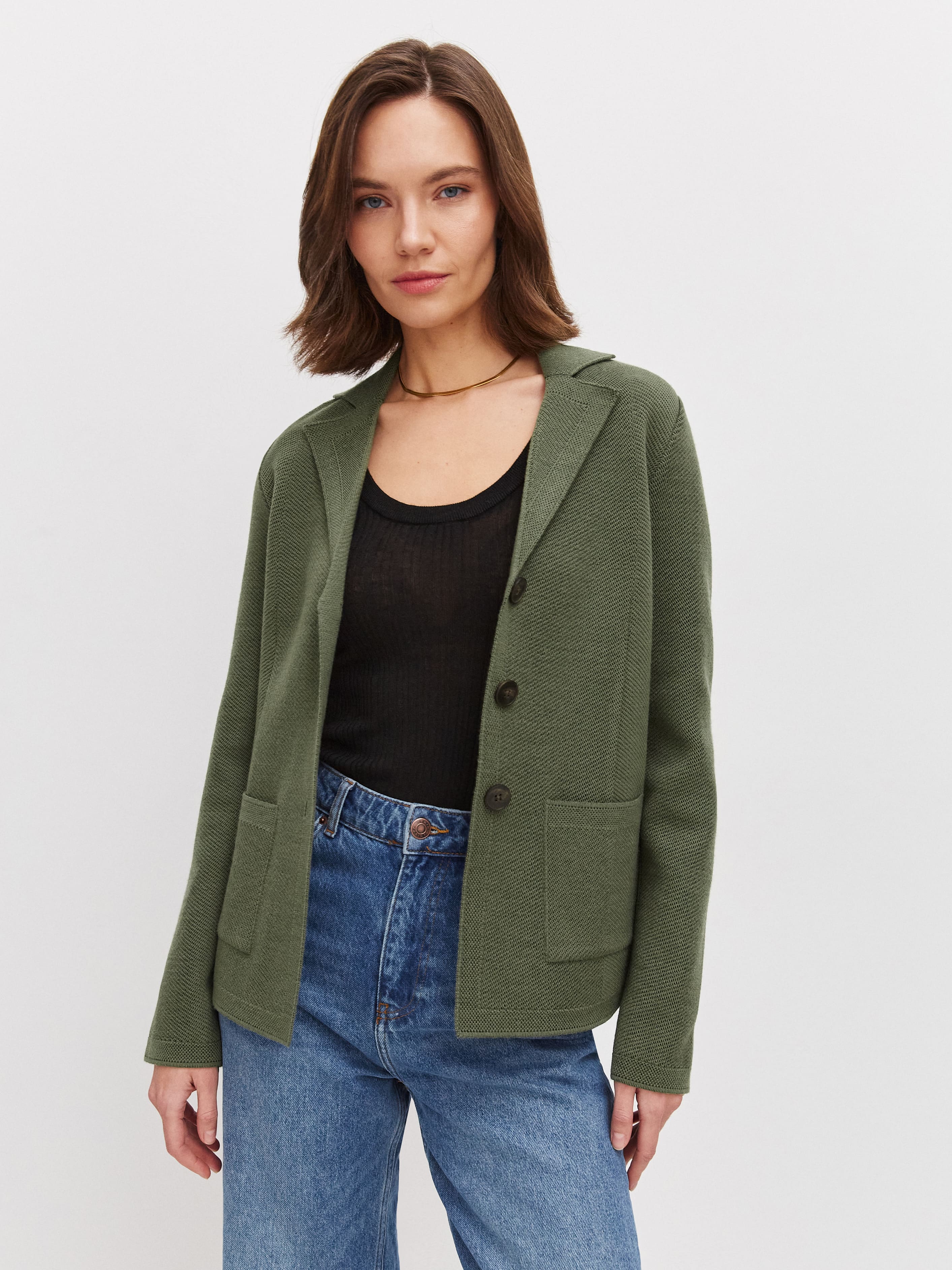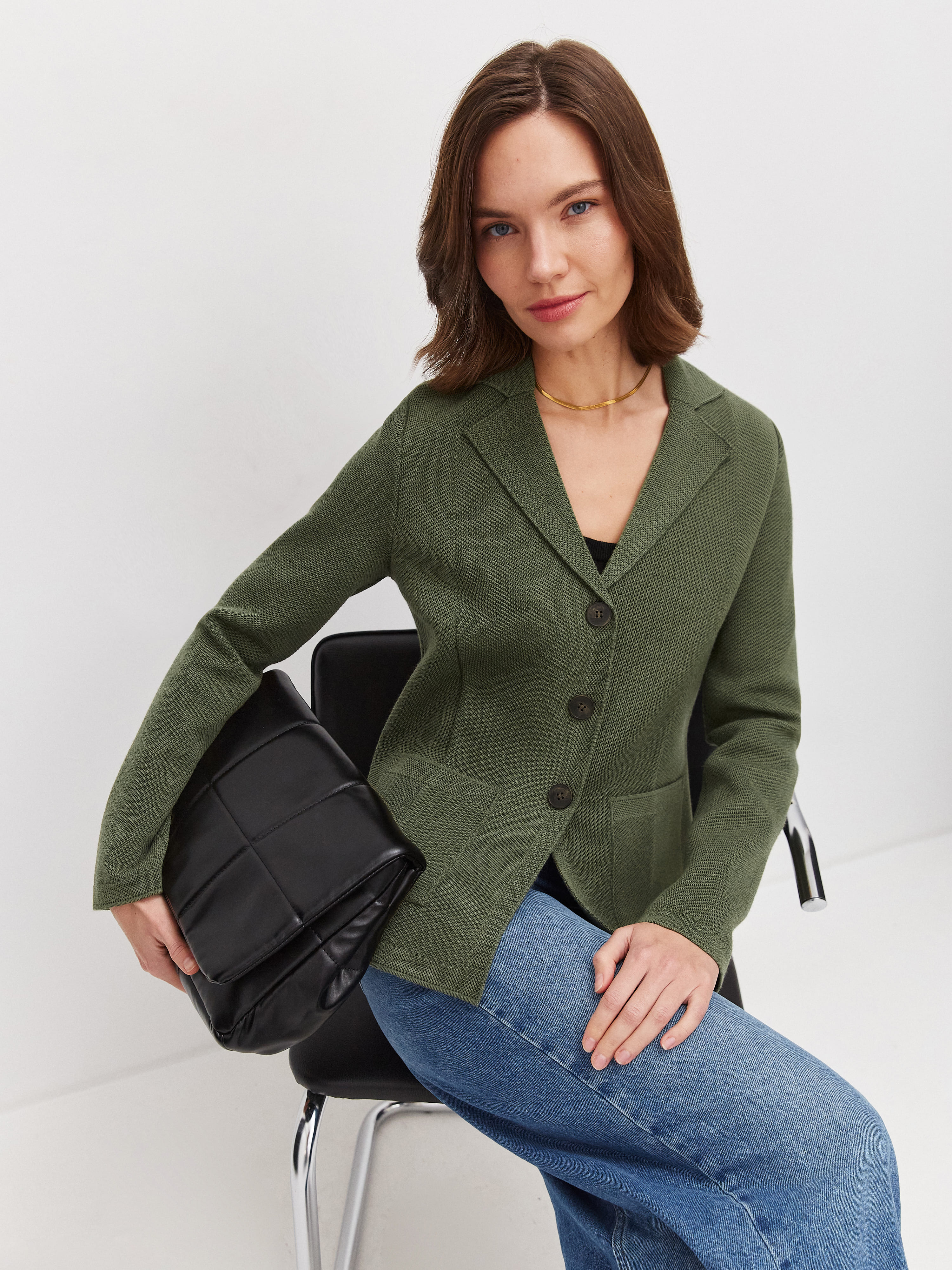 Не сдающая позиций классика, позволяющая сменить неудобный офисный пиджак на более комфортный вариант. Полуприталенный жакет из теплой шерсти имеет все атрибуты официального стиля – от английского воротника до глубоких накладных карманов. Мы дополнительно скорректировали состав трикотажа мягким акрилом. С ним натуральные шерстинки теряют природную жесткость, становясь нежнее и тактильно приятнее.