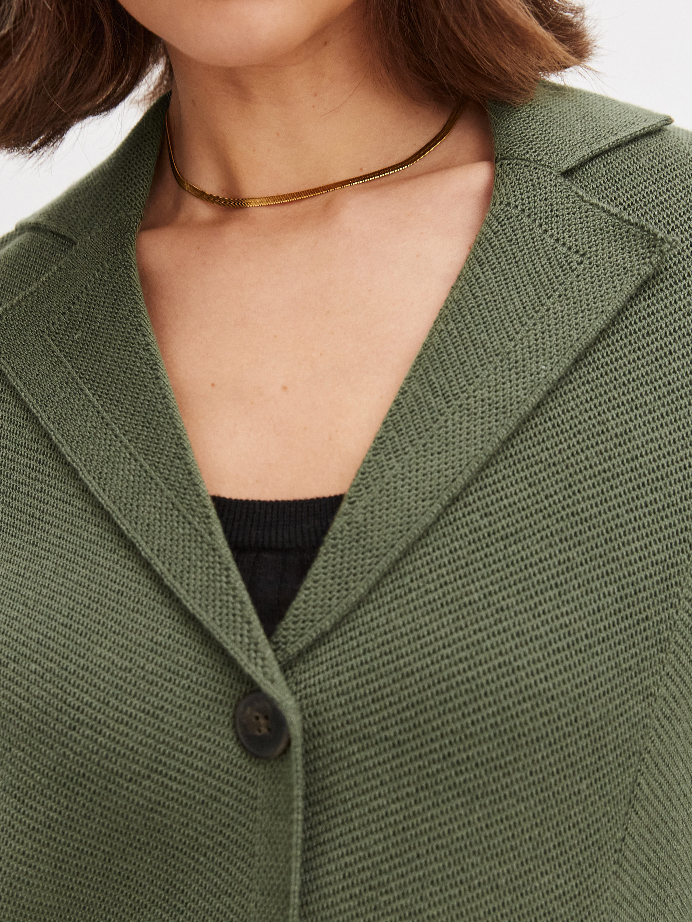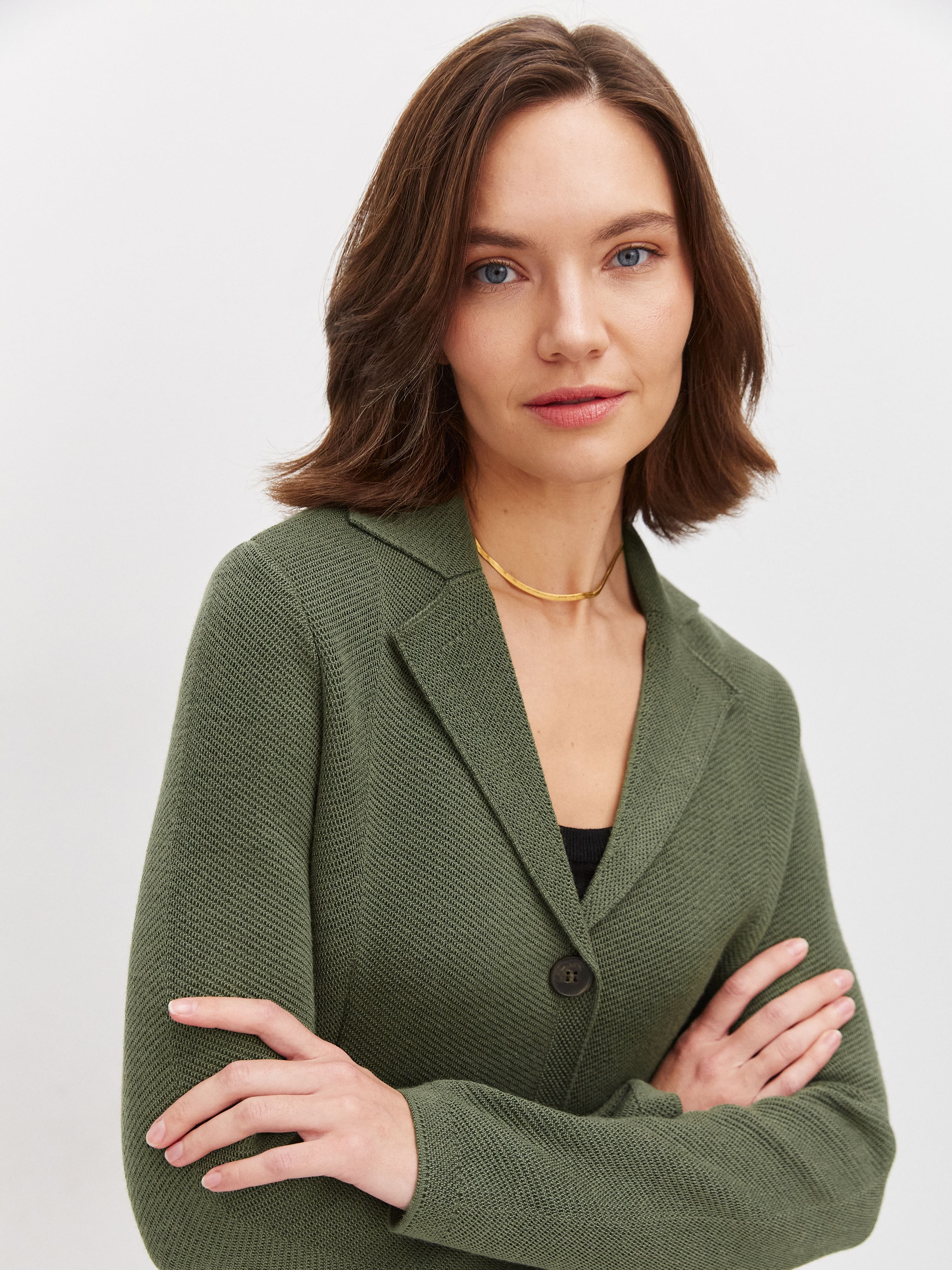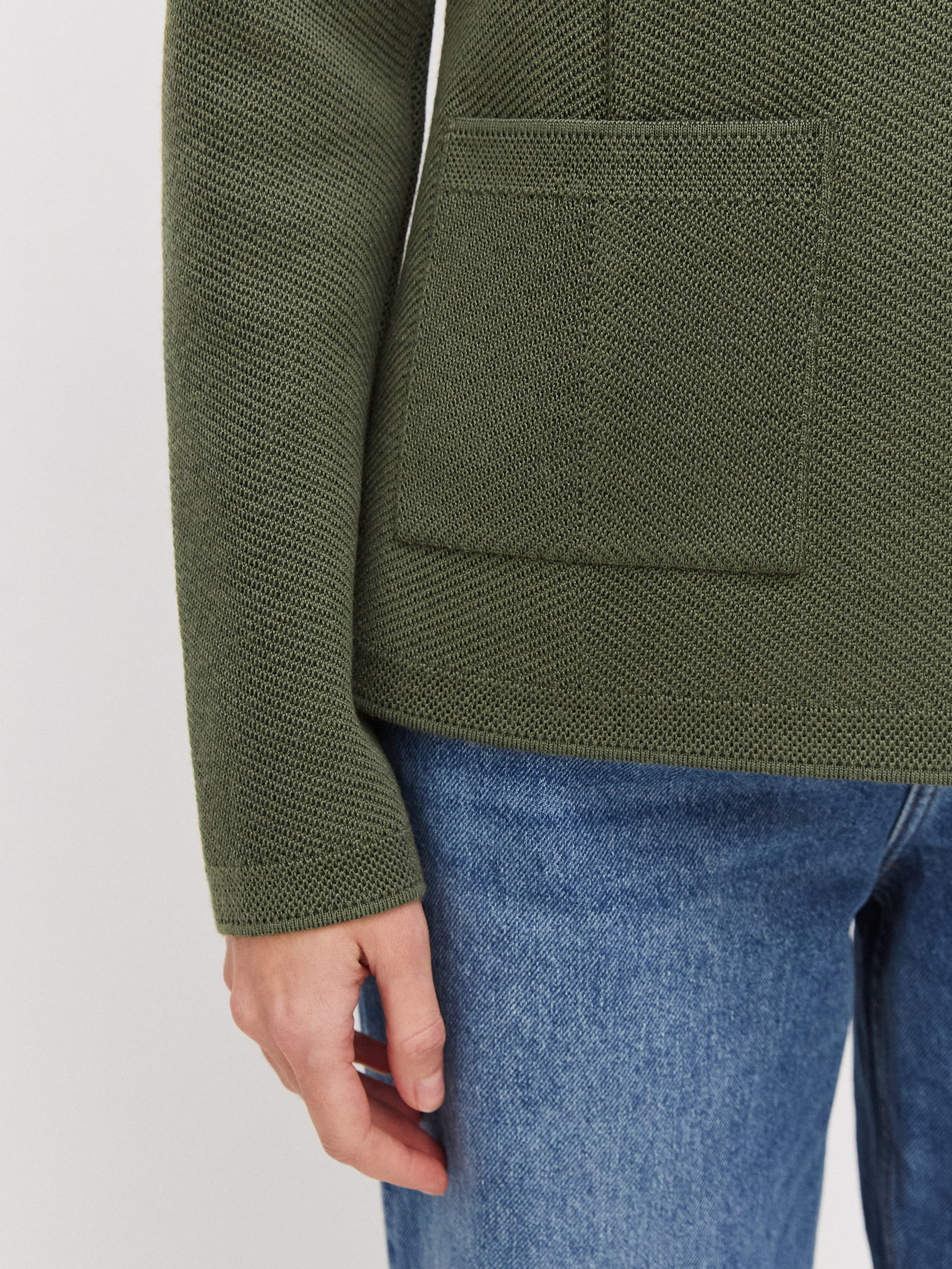 Не сдающая позиций классика, позволяющая сменить неудобный офисный пиджак на более комфортный вариант. Полуприталенный жакет из теплой шерсти имеет все атрибуты официального стиля – от английского воротника до глубоких накладных карманов. Мы дополнительно скорректировали состав трикотажа мягким акрилом. С ним натуральные шерстинки теряют природную жесткость, становясь нежнее и тактильно приятнее.