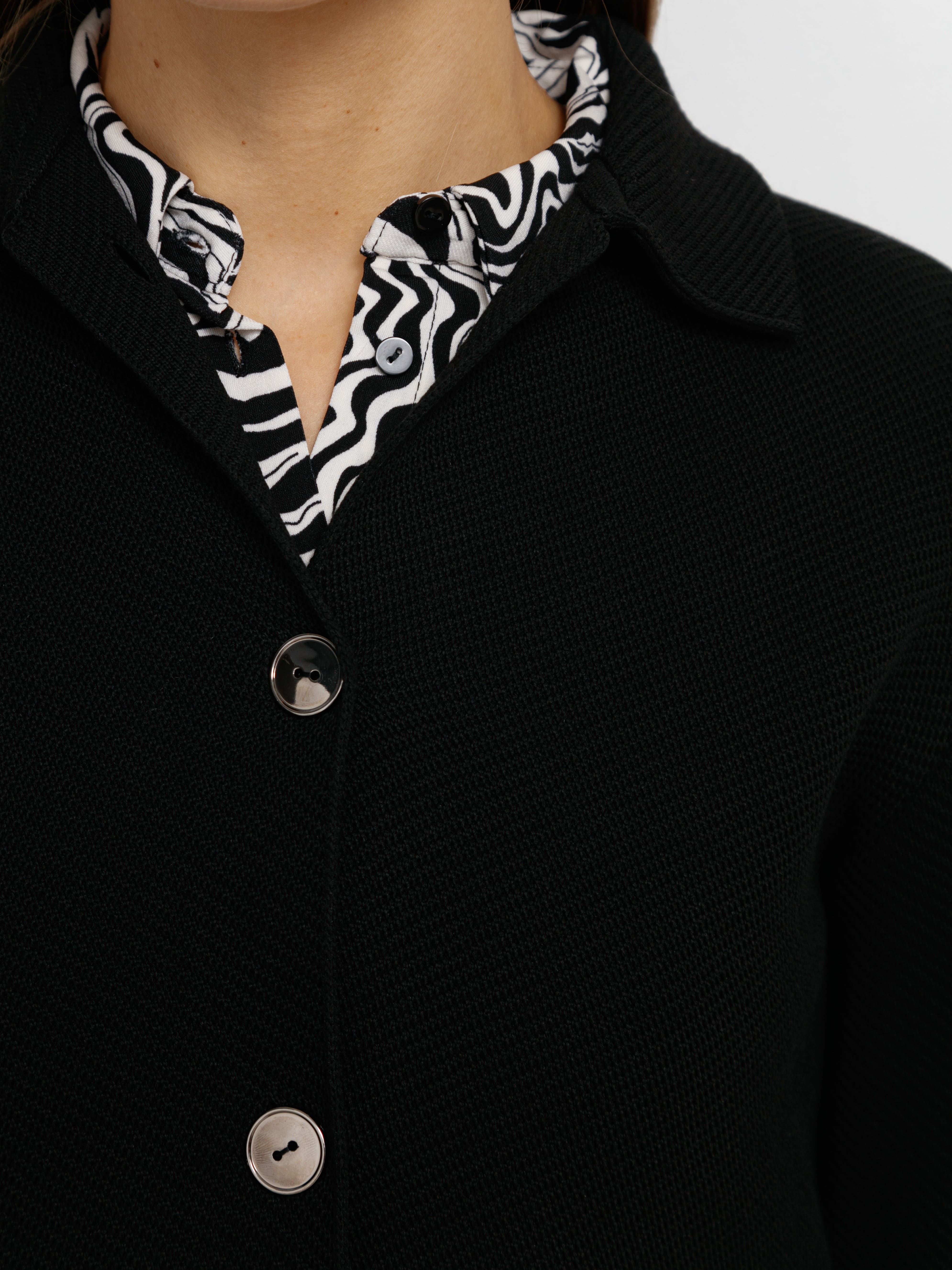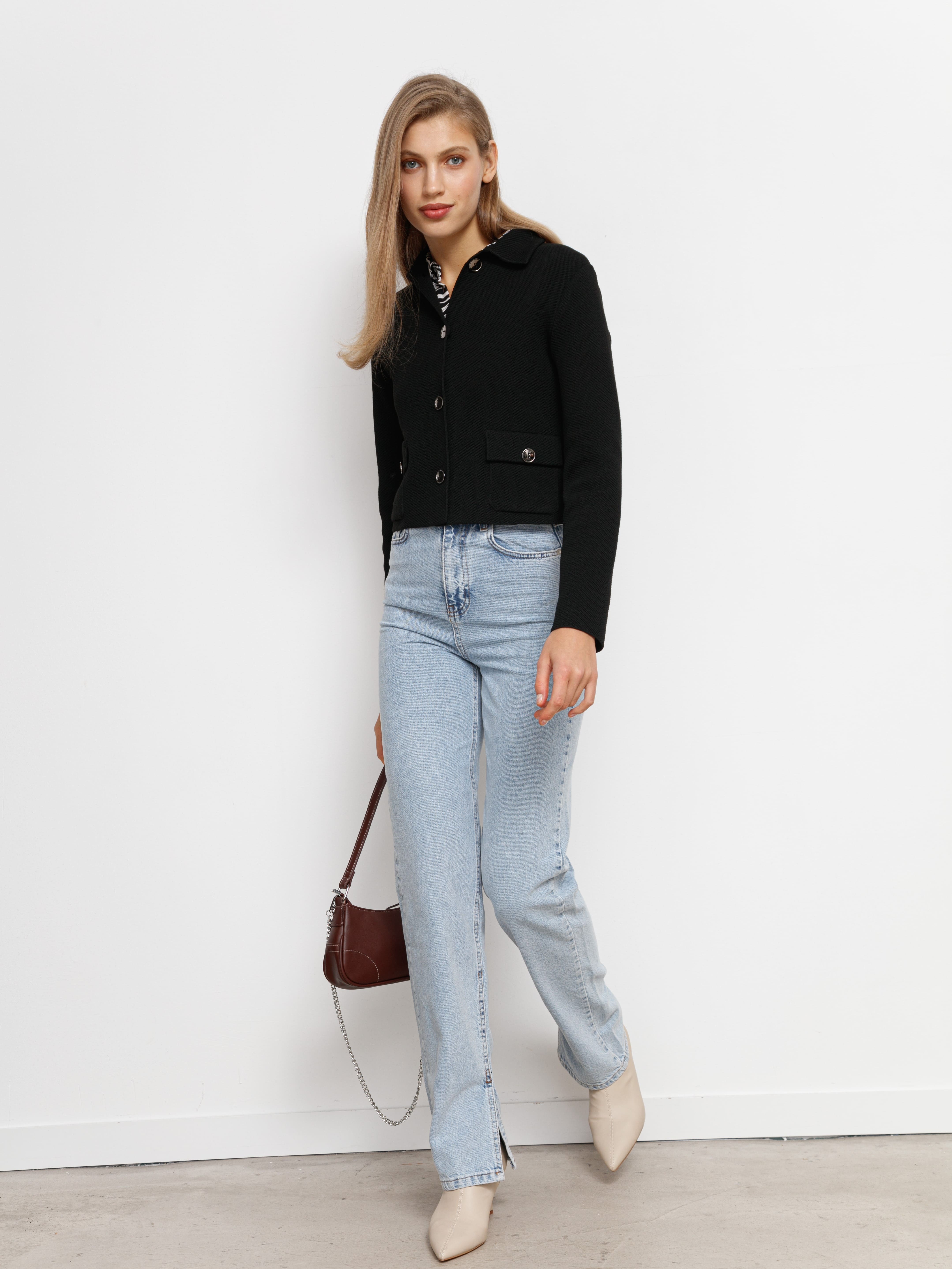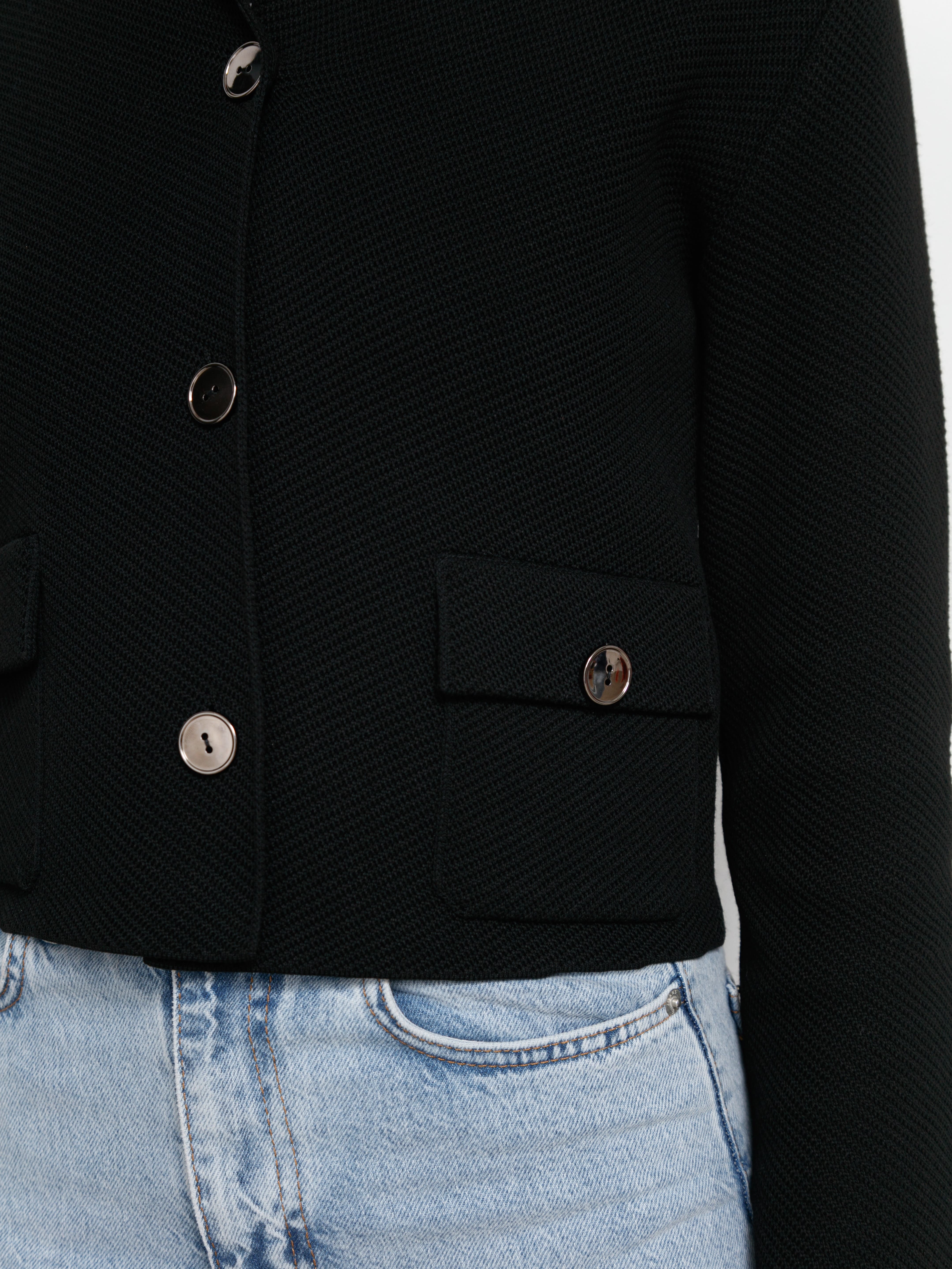 Неоклассика с отсылкой к легендарным пиджакам Шанель. Плотный фактурный трикотаж с хлопком сохраняет четкость линий и полноценно дышит. Отложной воротник, круглые пуговицы и накладные карманы гармонично расставляют акценты. Идеальный жакет, чтобы собрать офисную капсулу во французском стиле или дорогой вечерний дресс-ап