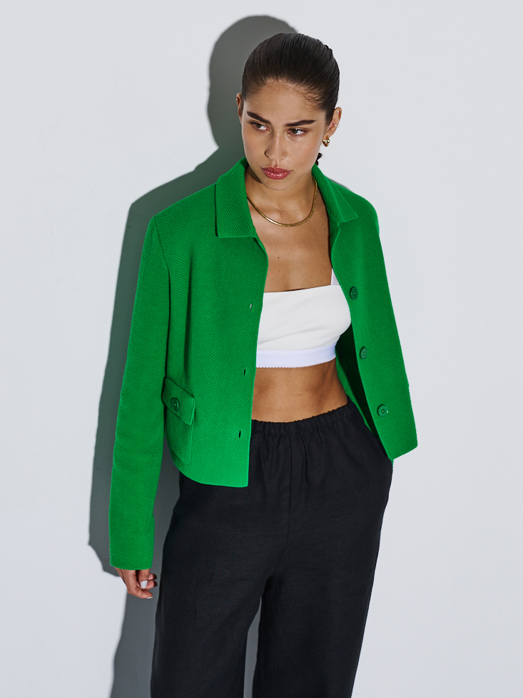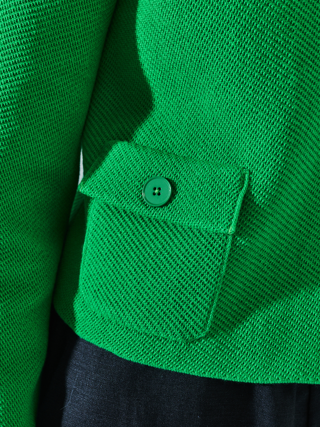 Неоклассика с отсылкой к легендарным пиджакам Шанель. Плотный фактурный трикотаж с хлопком сохраняет четкость линий и полноценно дышит. Отложной воротник, круглые пуговицы и накладные карманы гармонично расставляют акценты. Идеальный жакет, чтобы собрать офисную капсулу во французском стиле или дорогой вечерний дресс-ап