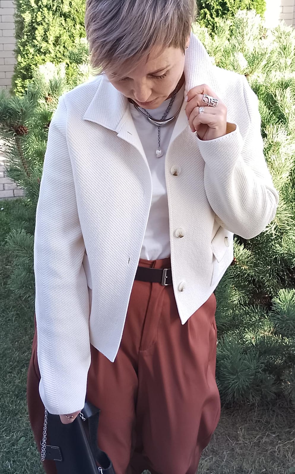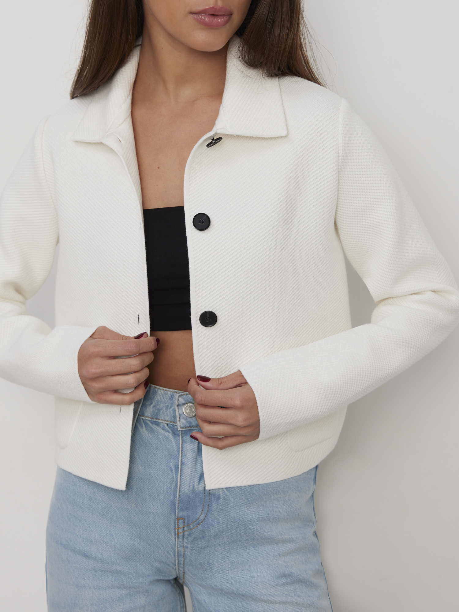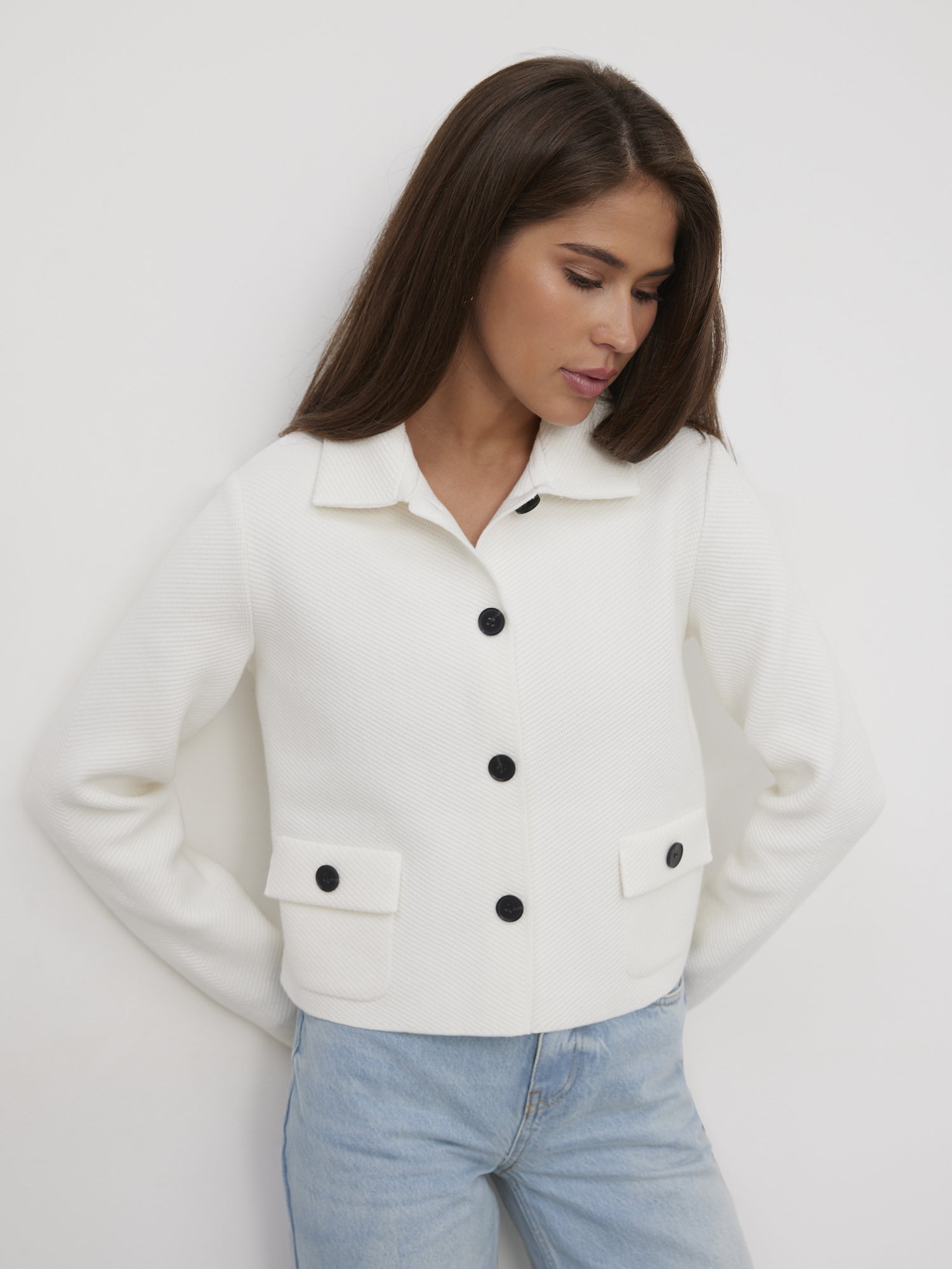 Неоклассика с отсылкой к легендарным пиджакам Шанель. Плотный фактурный трикотаж с хлопком сохраняет четкость линий и полноценно дышит. Отложной воротник, круглые пуговицы и накладные карманы гармонично расставляют акценты. Идеальный жакет, чтобы собрать офисную капсулу во французском стиле или дорогой вечерний дресс-ап