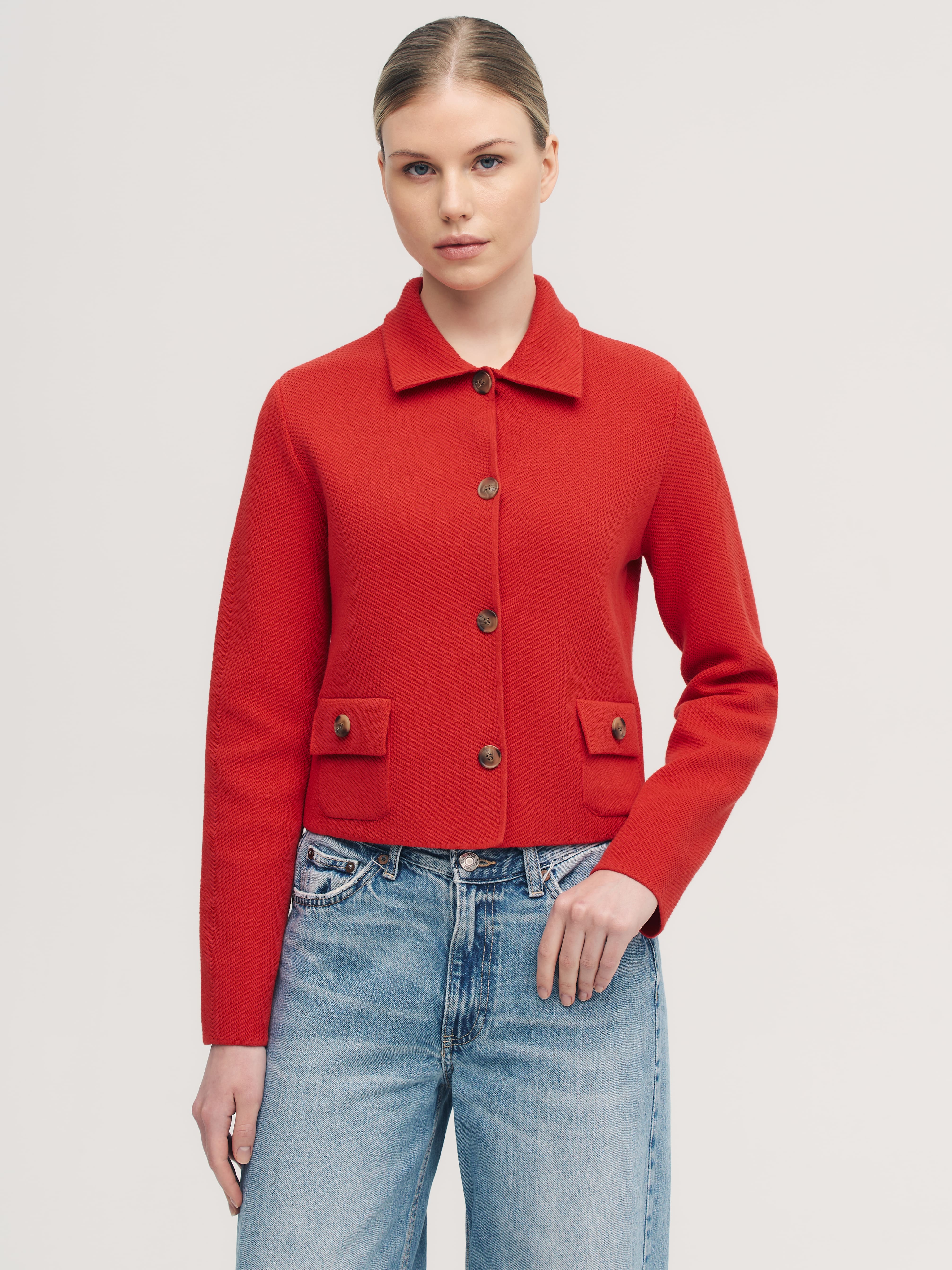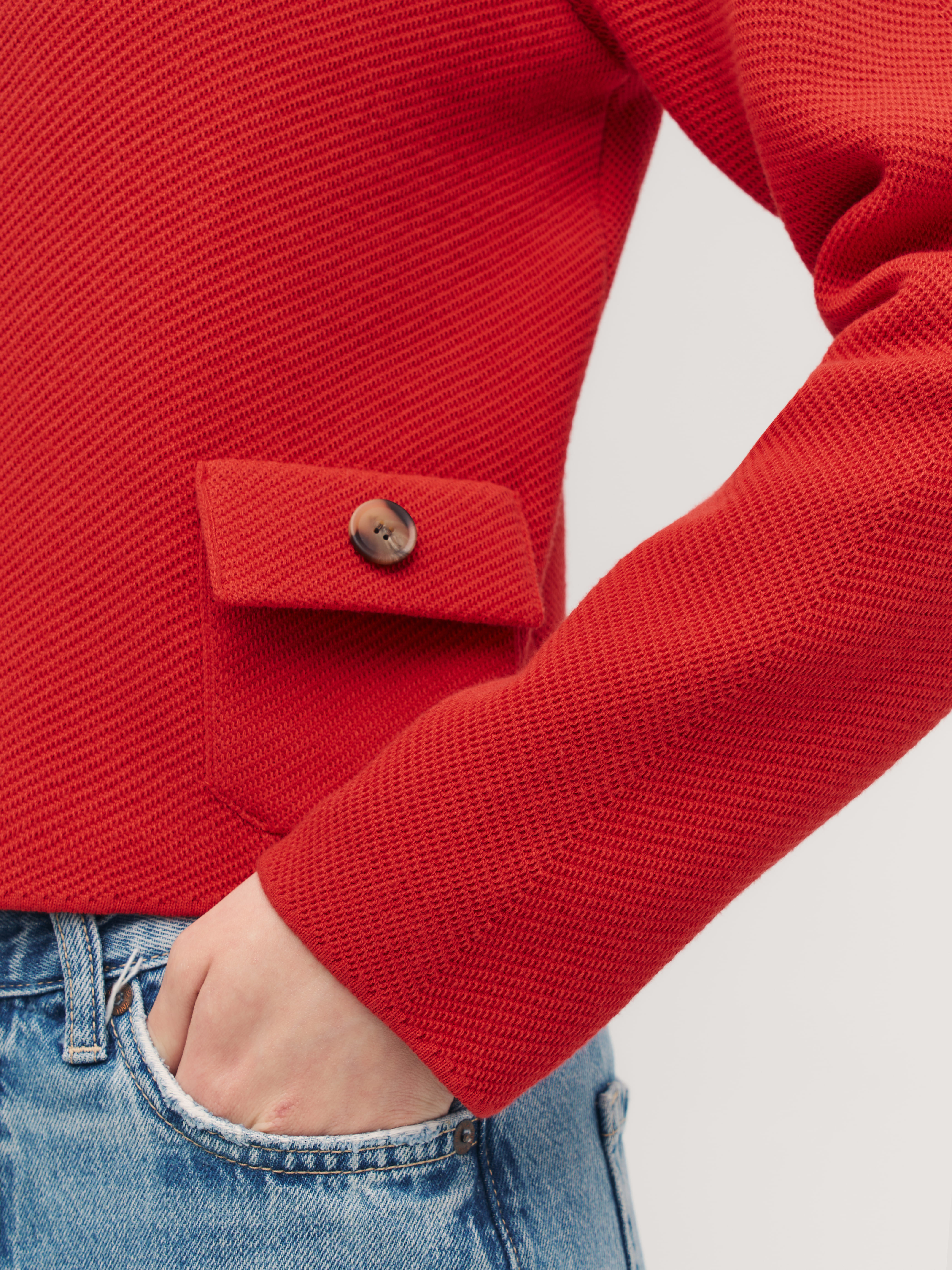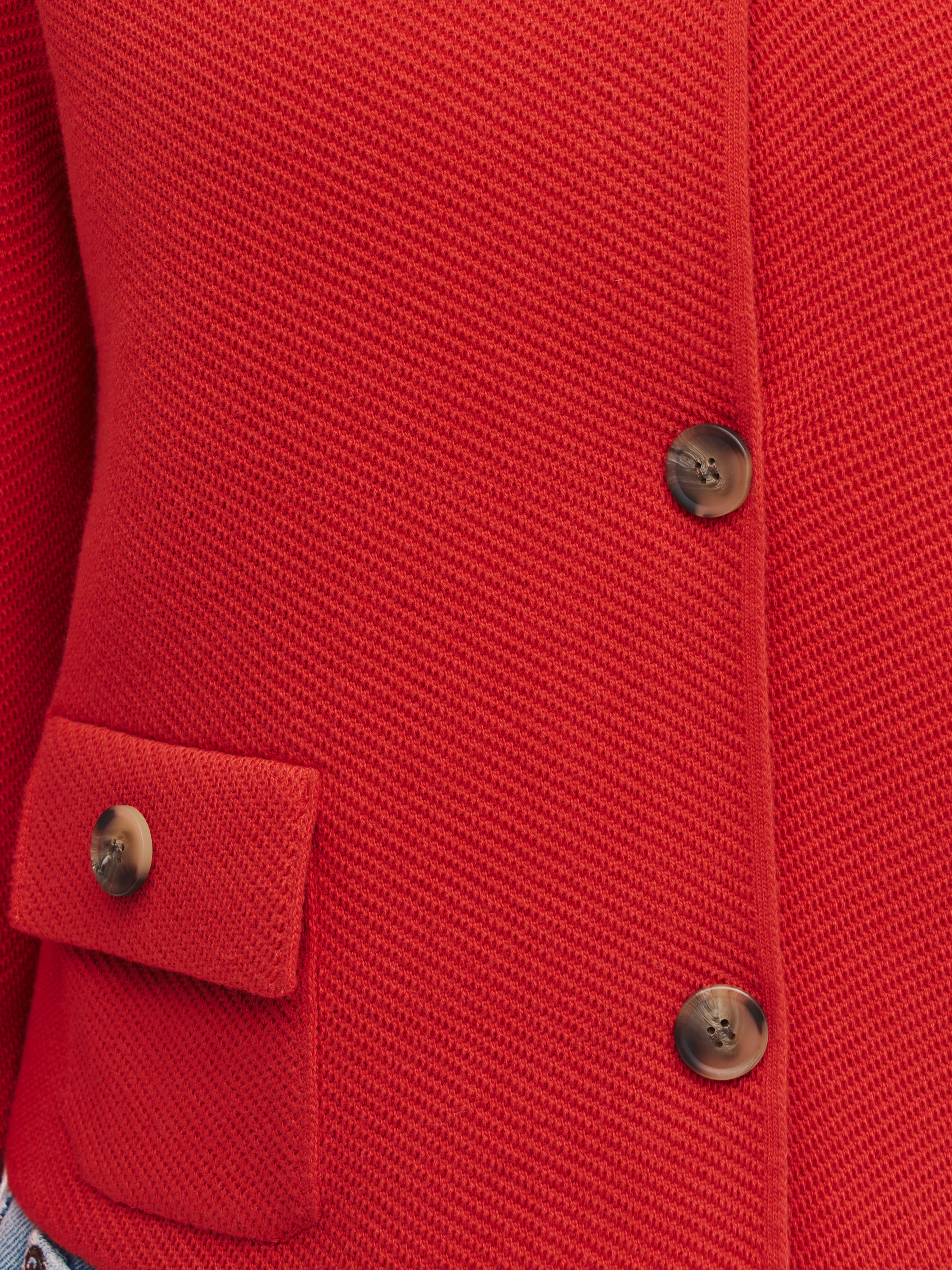 Неоклассика с отсылкой к легендарным пиджакам Шанель. Плотный фактурный трикотаж с хлопком сохраняет четкость линий и полноценно дышит. Отложной воротник, круглые пуговицы и накладные карманы гармонично расставляют акценты. Идеальный жакет, чтобы собрать офисную капсулу во французском стиле или дорогой вечерний дресс-ап
