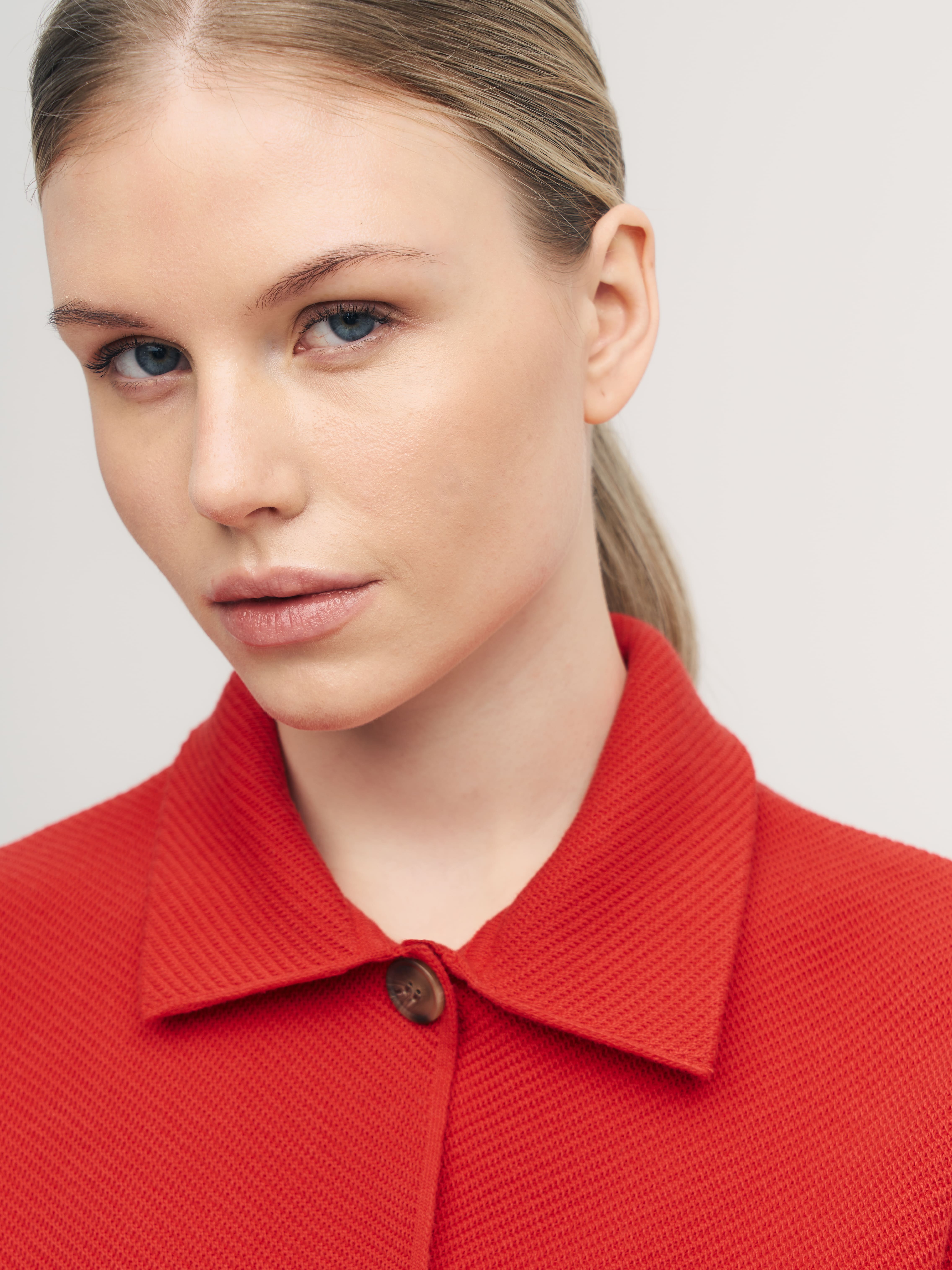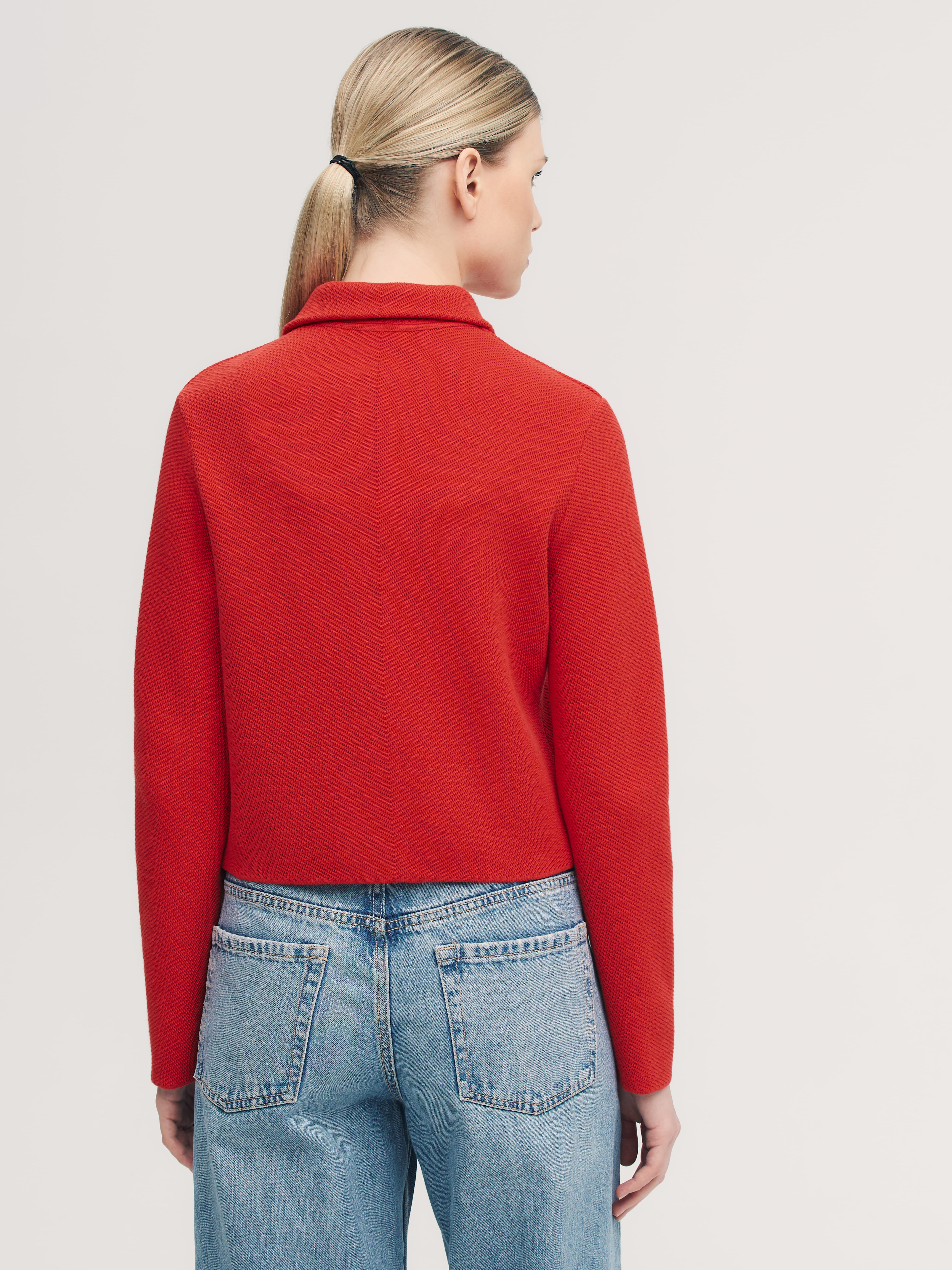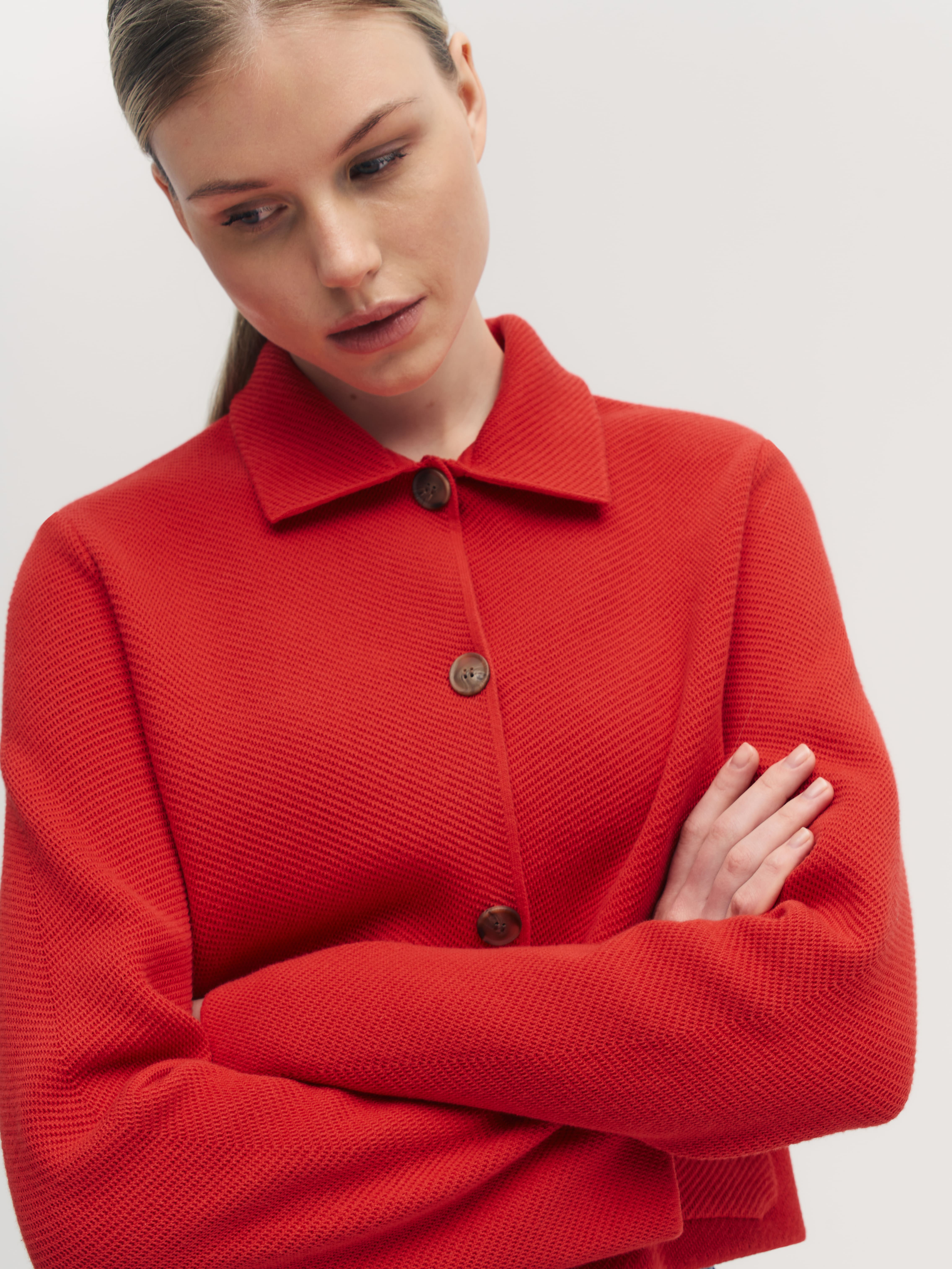 Неоклассика с отсылкой к легендарным пиджакам Шанель. Плотный фактурный трикотаж с хлопком сохраняет четкость линий и полноценно дышит. Отложной воротник, круглые пуговицы и накладные карманы гармонично расставляют акценты. Идеальный жакет, чтобы собрать офисную капсулу во французском стиле или дорогой вечерний дресс-ап