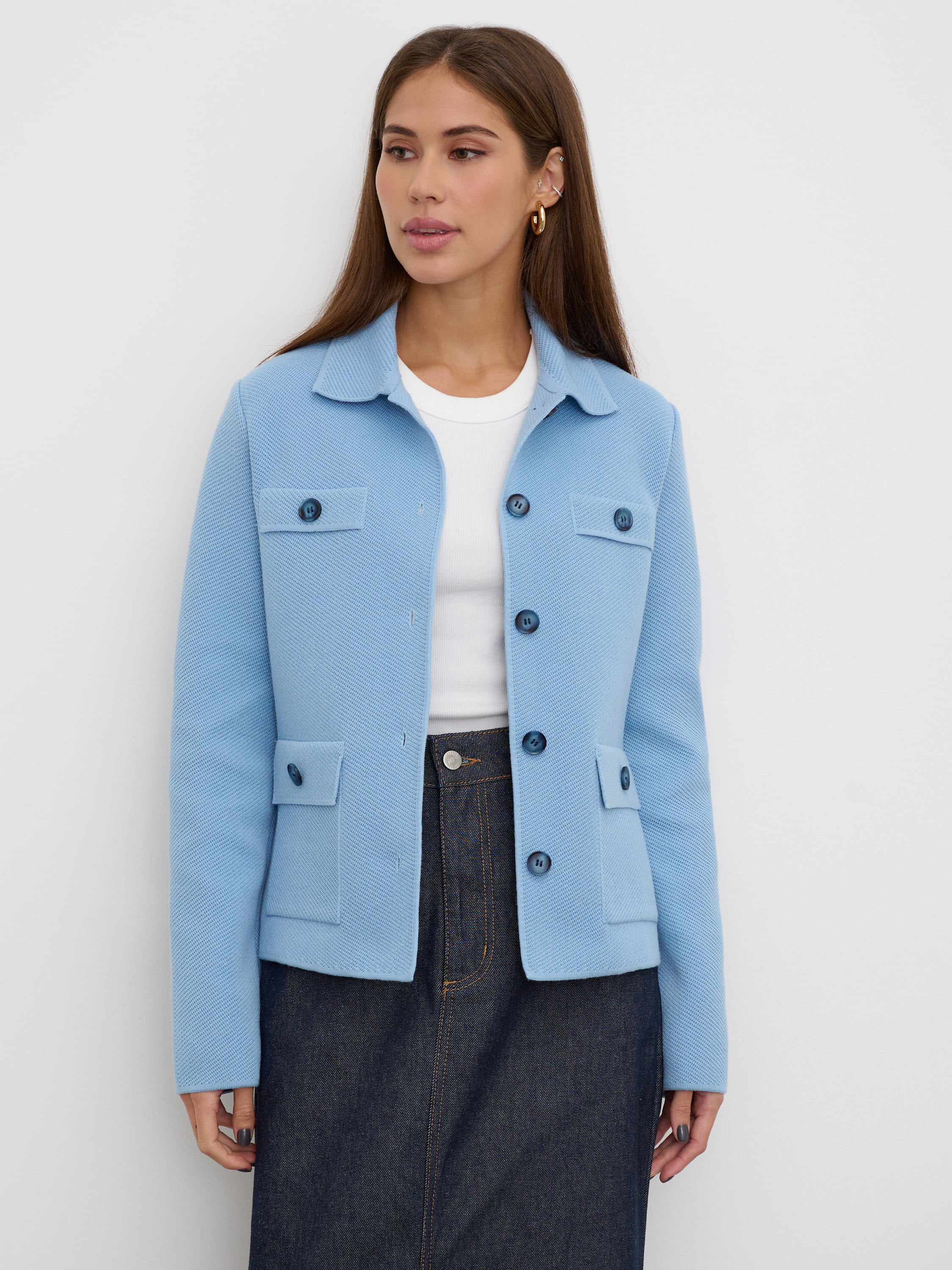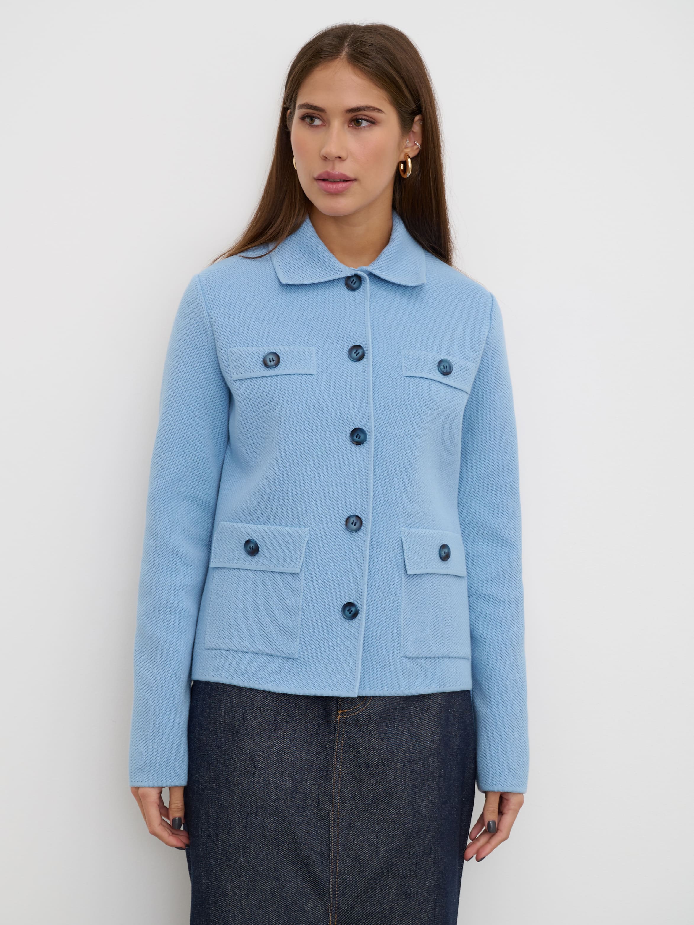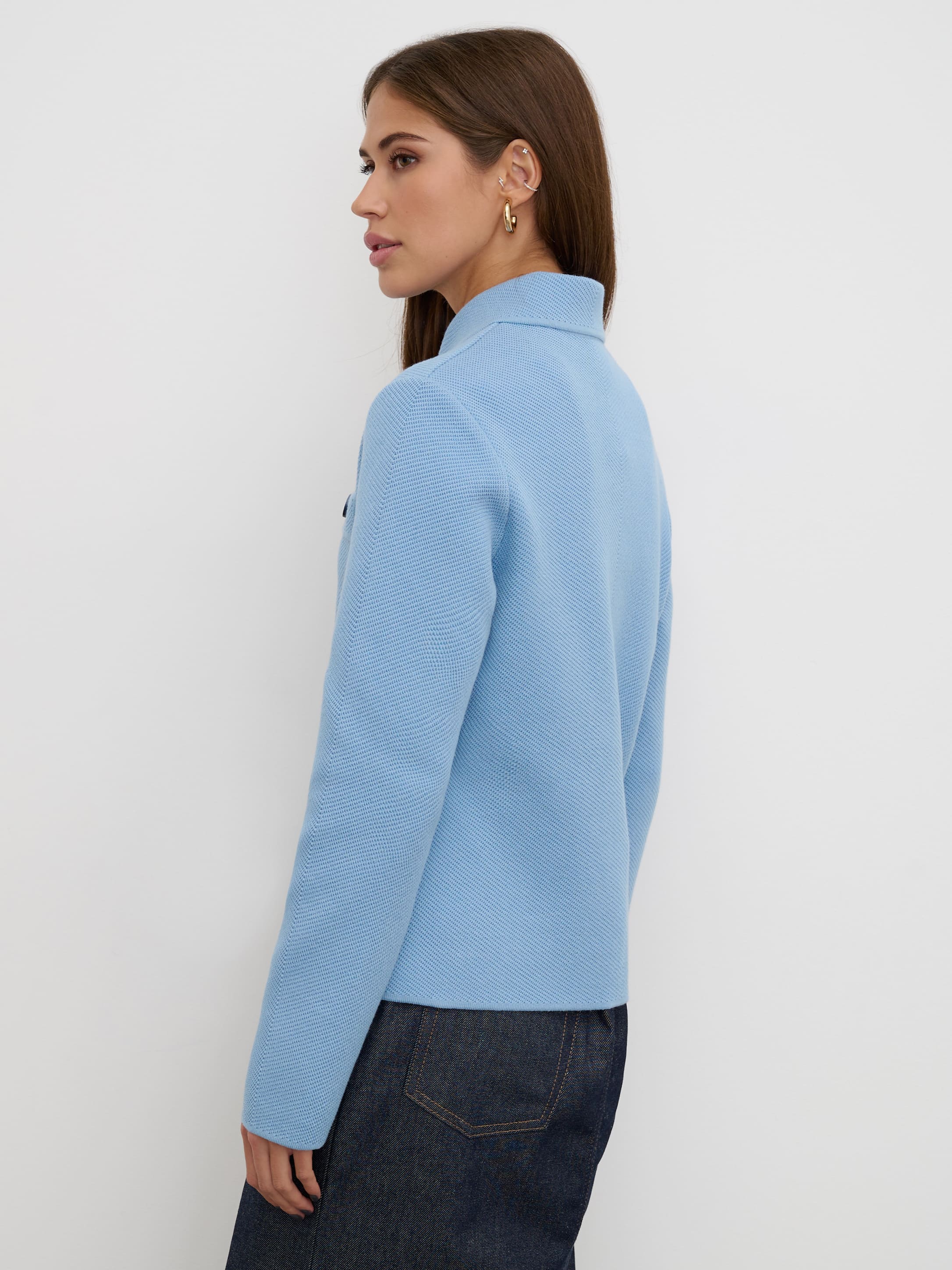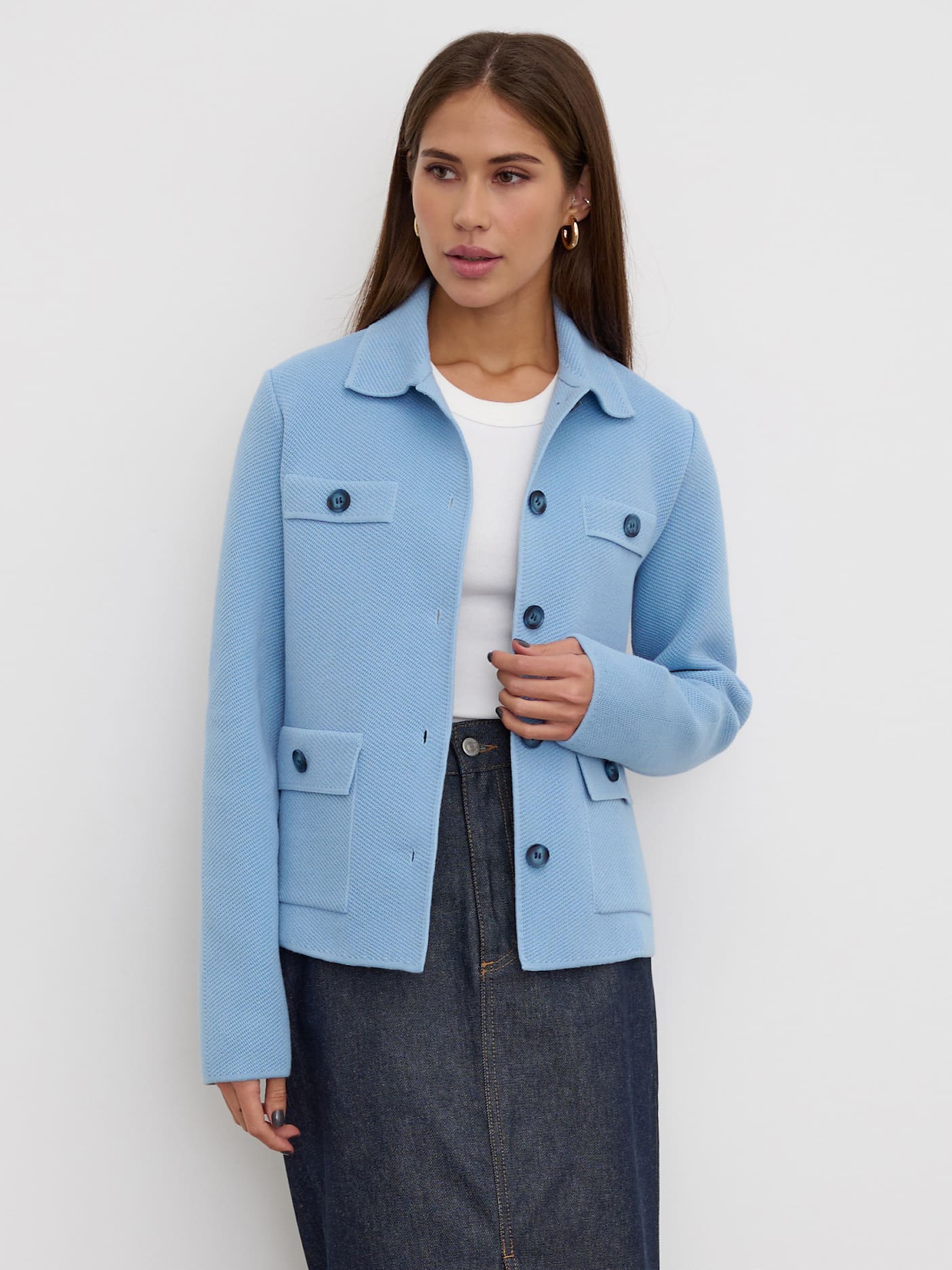 Дышащий хлопковый жакет с интересной фактурой рисунка станет приятной альтернативой коктейльным пиджакам. Сдержанные линии и классические детали отделки предусматривают возможность сочетания с нестрогим дресс-кодом. Но на пятничном на бранче с подружками модель тоже будет смотреться вполне органично.